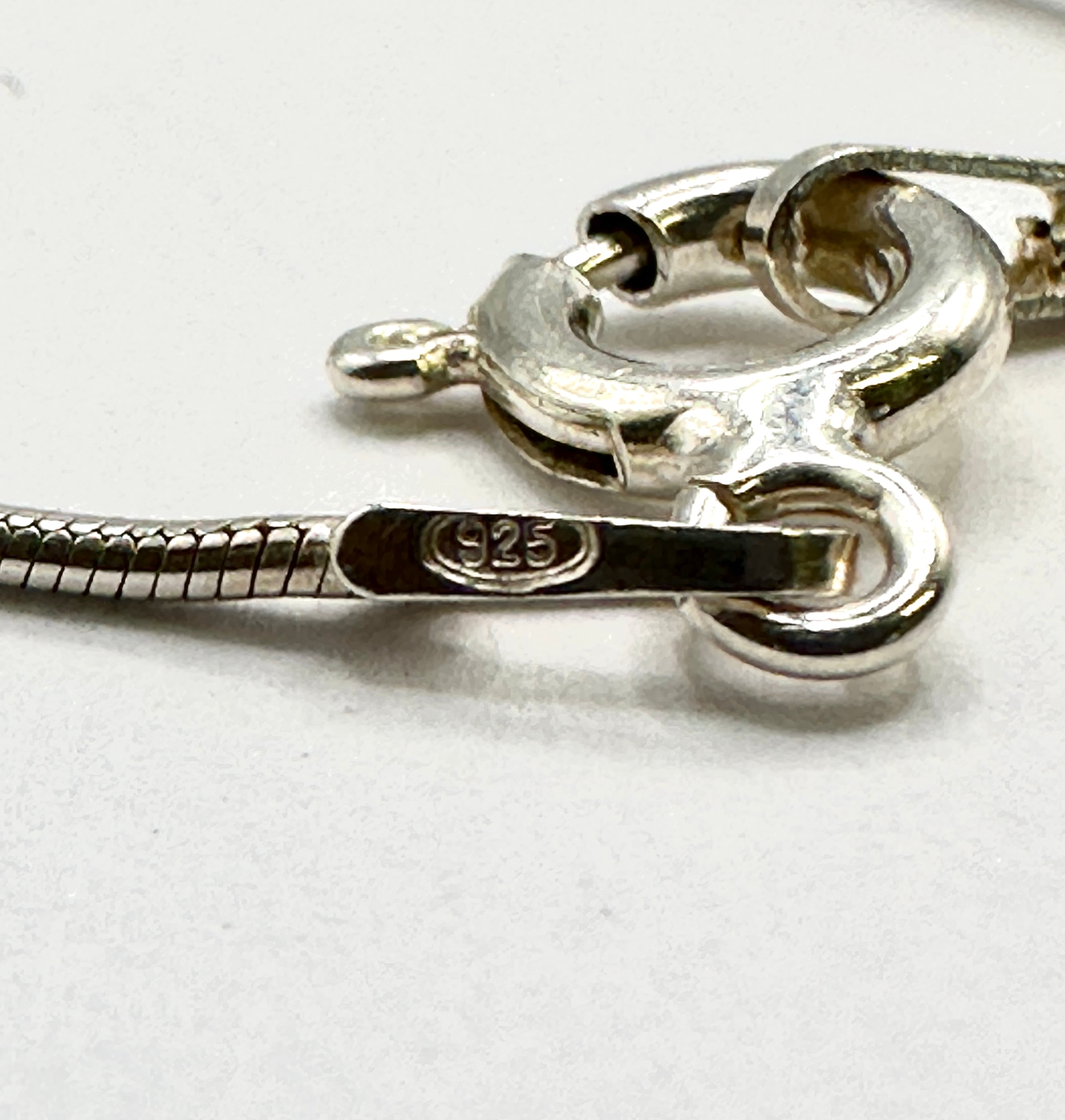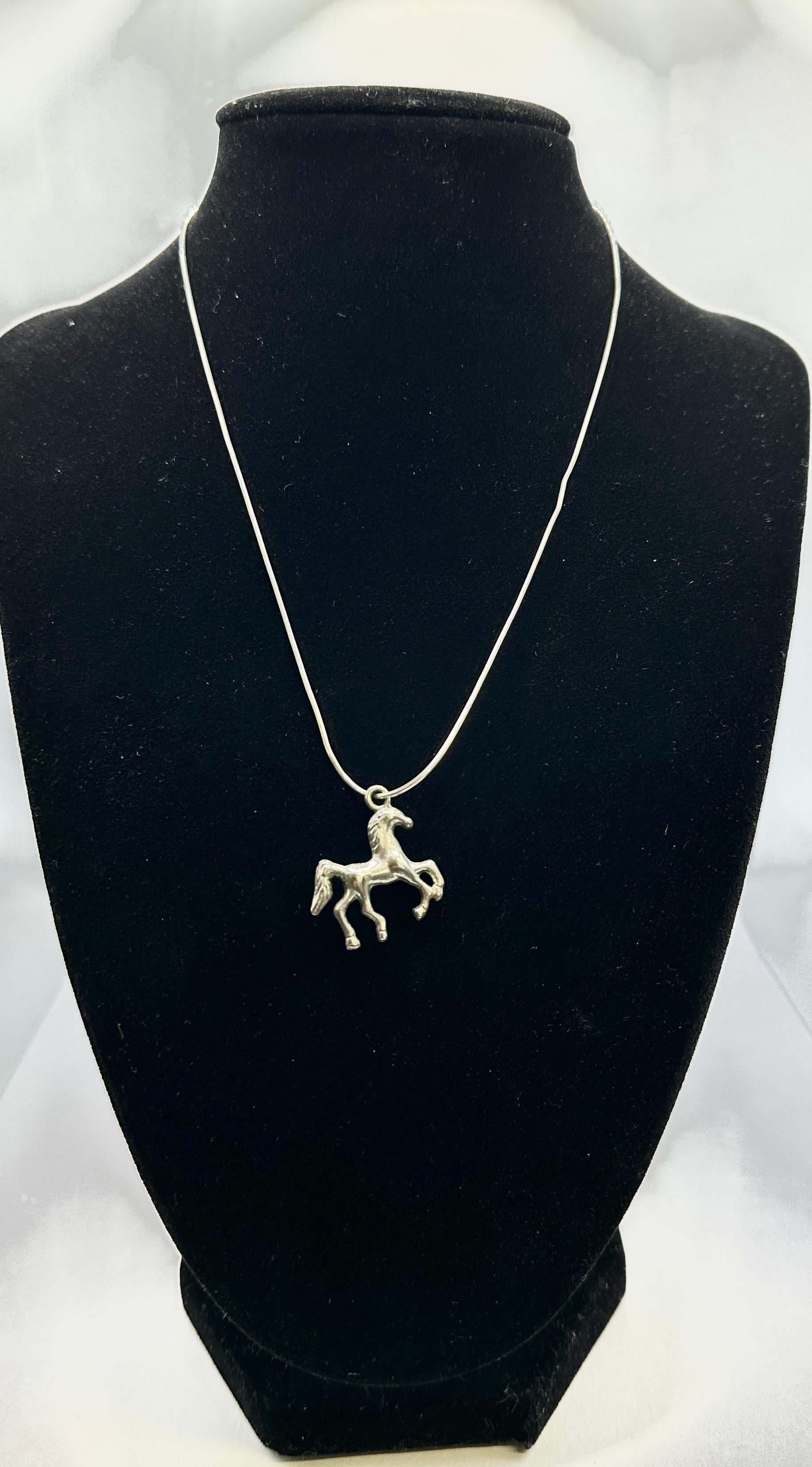 A 925 silver necklace featuring a figural horse pendant, suspended from a snake chain. The necklace is secured by a spring-ring clasp, with a clear ‘(925)’ hallmark visible on a flat tab near the clasp, confirming the material as 925 silver.