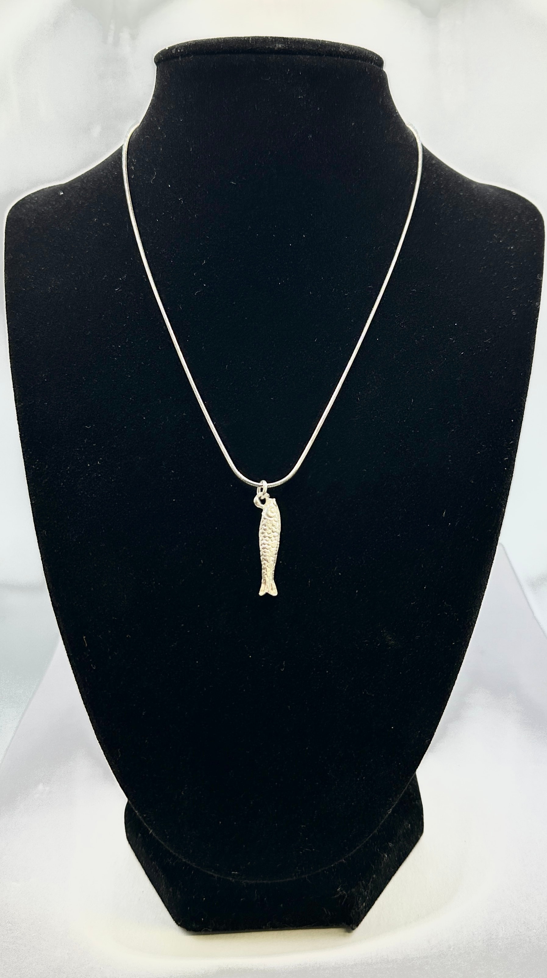 A sterling silver sardine pendant necklace. This item features a snake chain and a textured, fish-shaped pendant. The clasp is a lobster claw style and is visibly stamped with ‘925’.