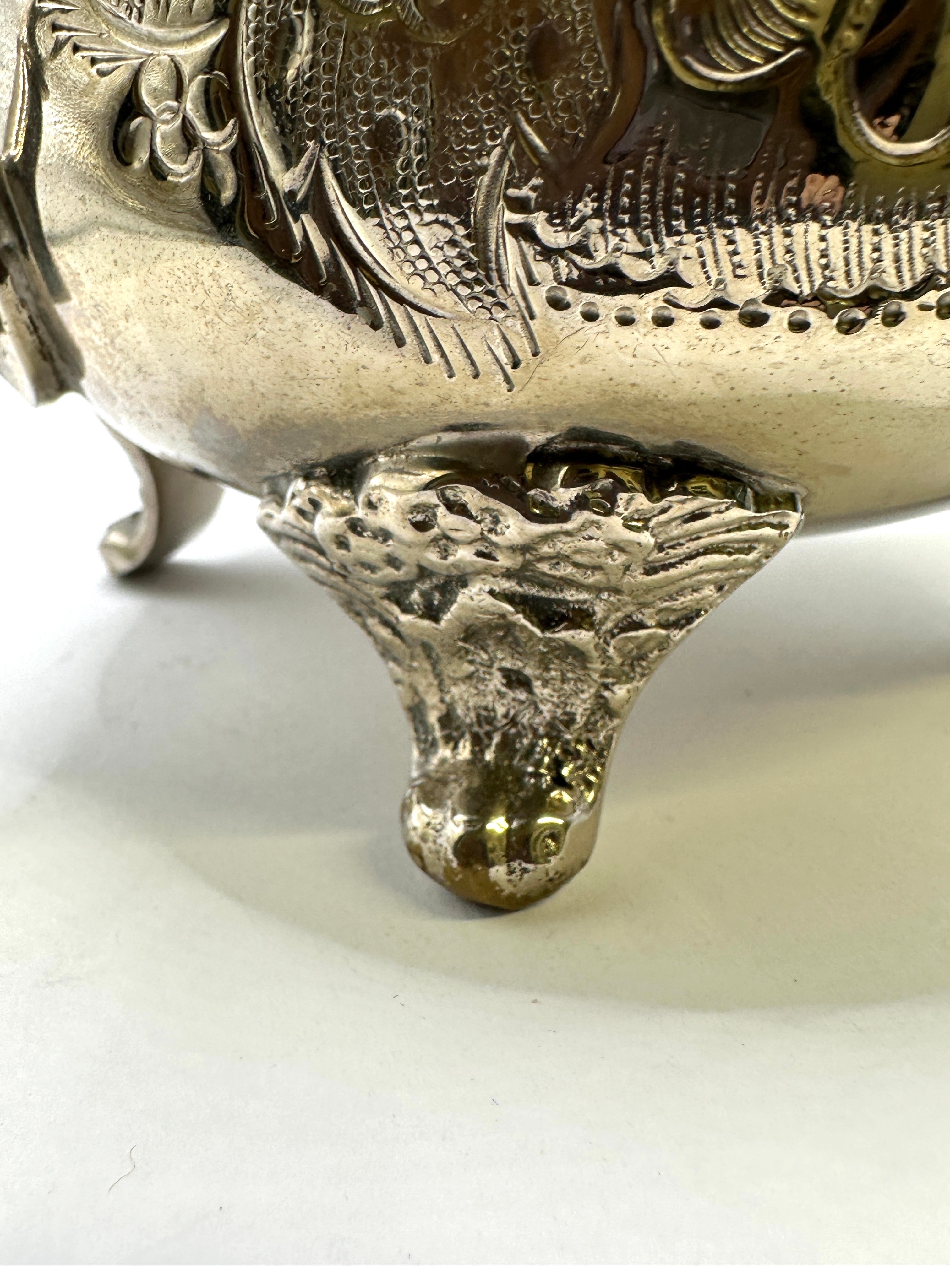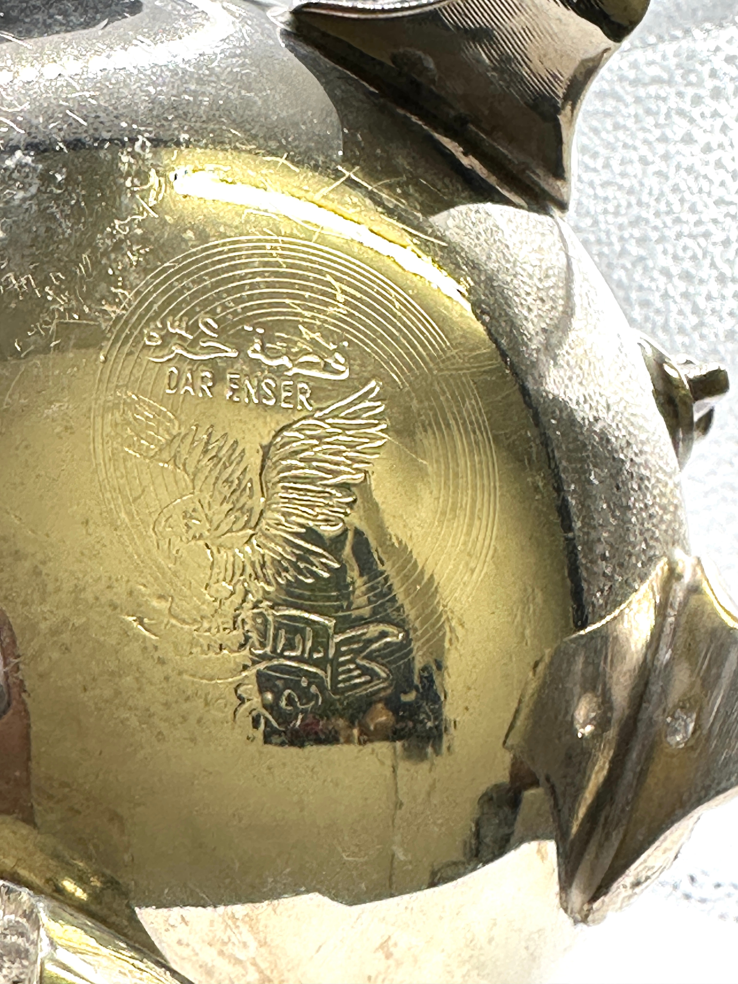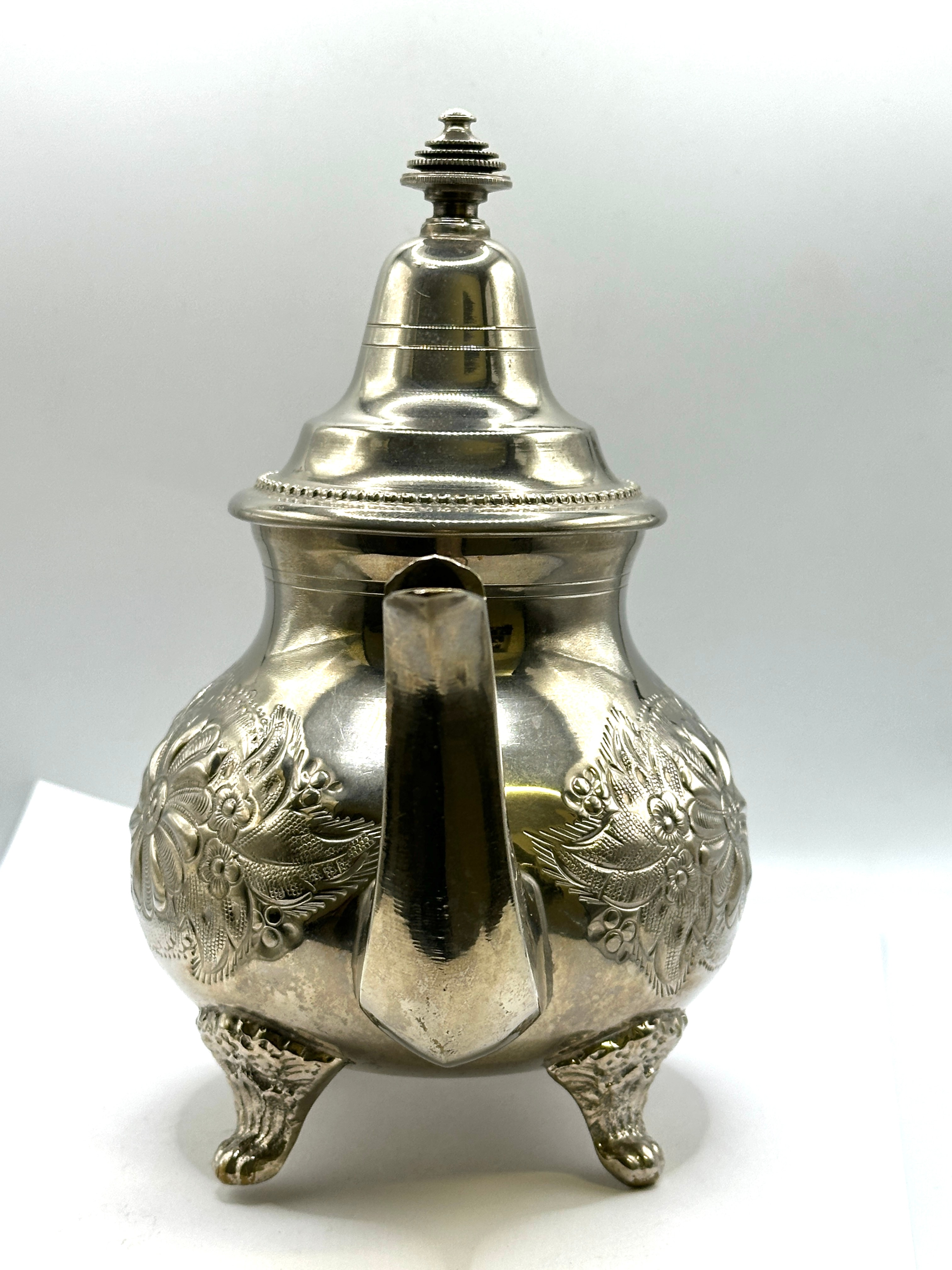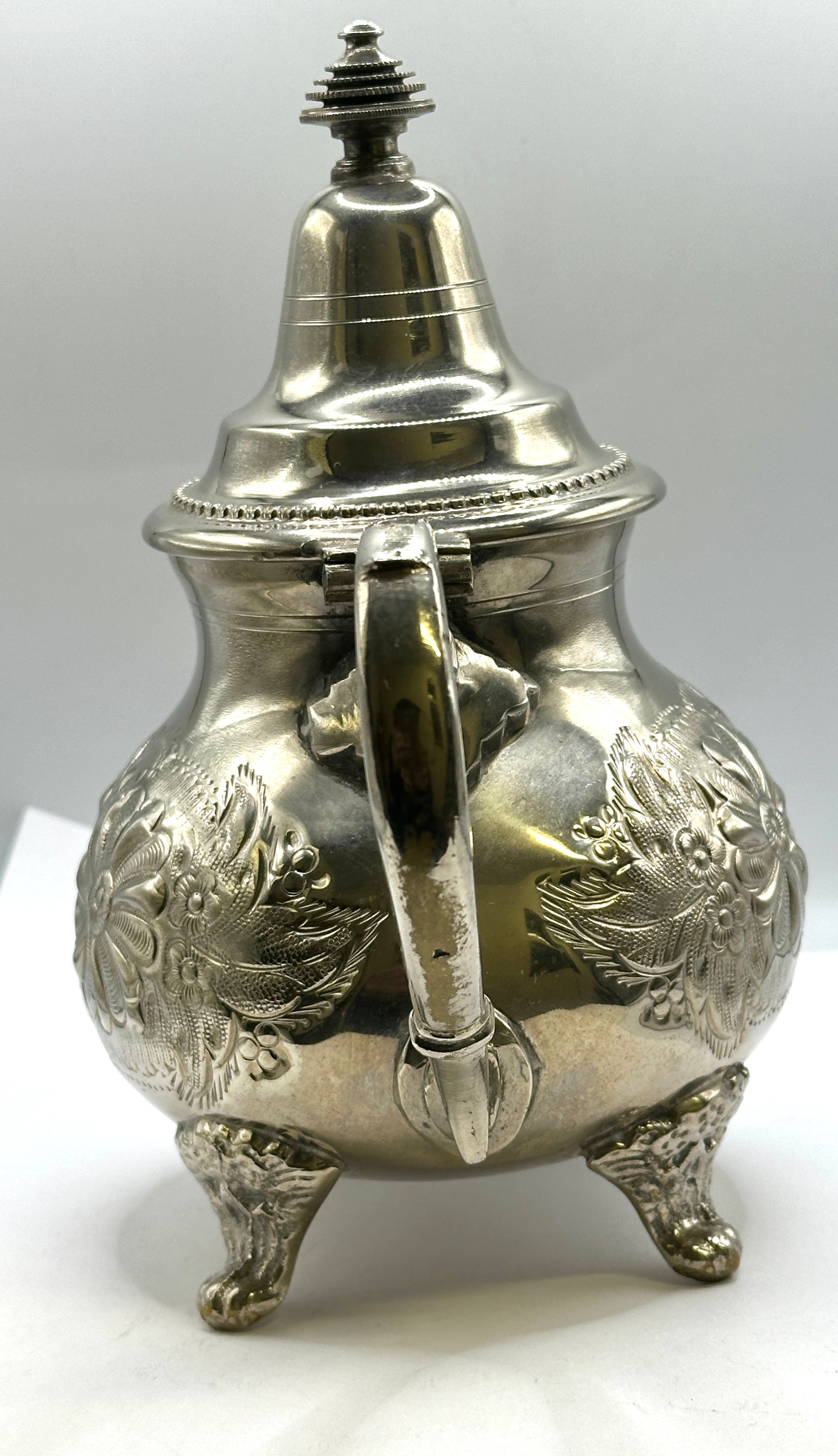 A Moroccan silver-plated teapot by DAR ENSER. Crafted in a traditional North African or Moroccan style, it features a bulbous body, a tall domed lid with a finial, a C-scroll handle, a long curved spout, and stands on three ornate zoomorphic feet. The surface is extensively decorated with deeply embossed floral and scrolling patterns. The underside bears an impressed circular mark with “DAR ENSER” in Latin script, flanked by “دار أنصر” in Arabic, which translates to “House of Victory,” alongside an emblem depicting an eagle above a building. Likely silver-plated brass or another base metal.