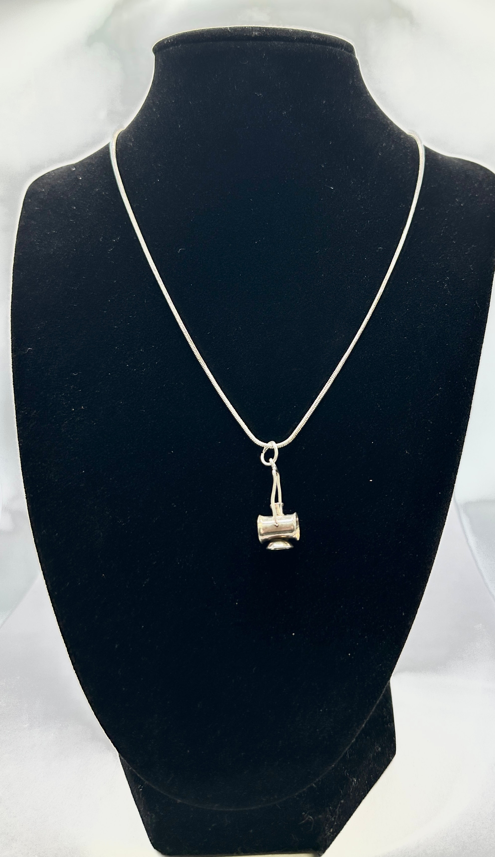 A 925 silver necklace featuring a Thor’s Hammer pendant. The snake-style chain is crafted from 925 silver and secures with a lobster clasp. Attached to the chain is a small, three-dimensional pendant shaped like a stylized hammer. A small circular tag located near the clasp is stamped with the numerals ‘925’, confirming the material as 925 silver.