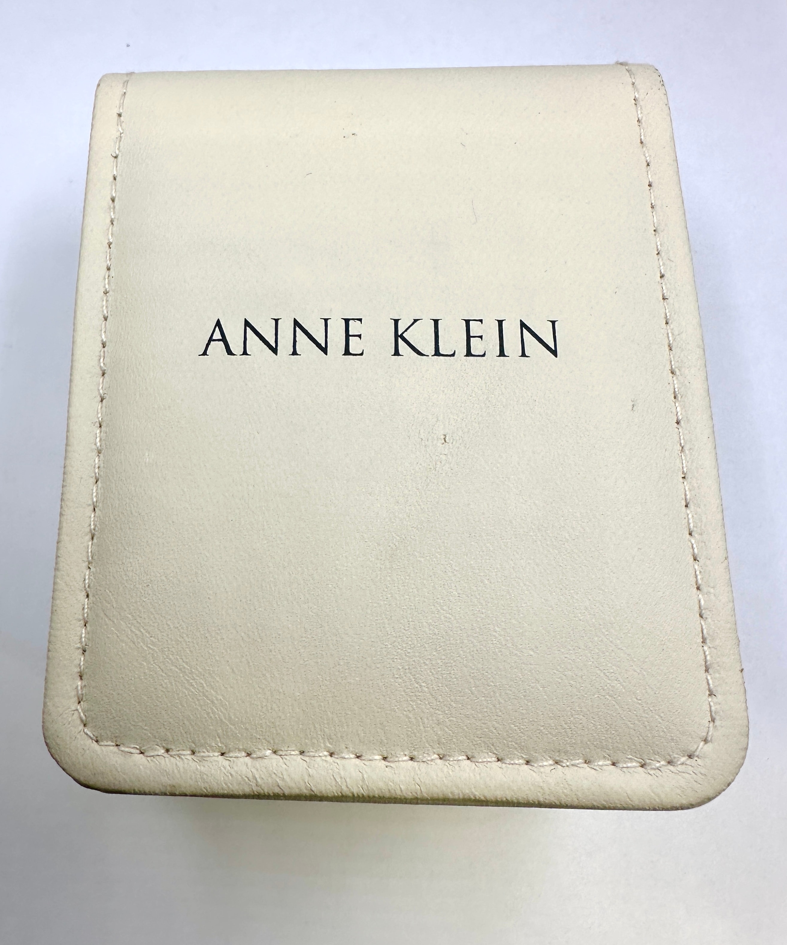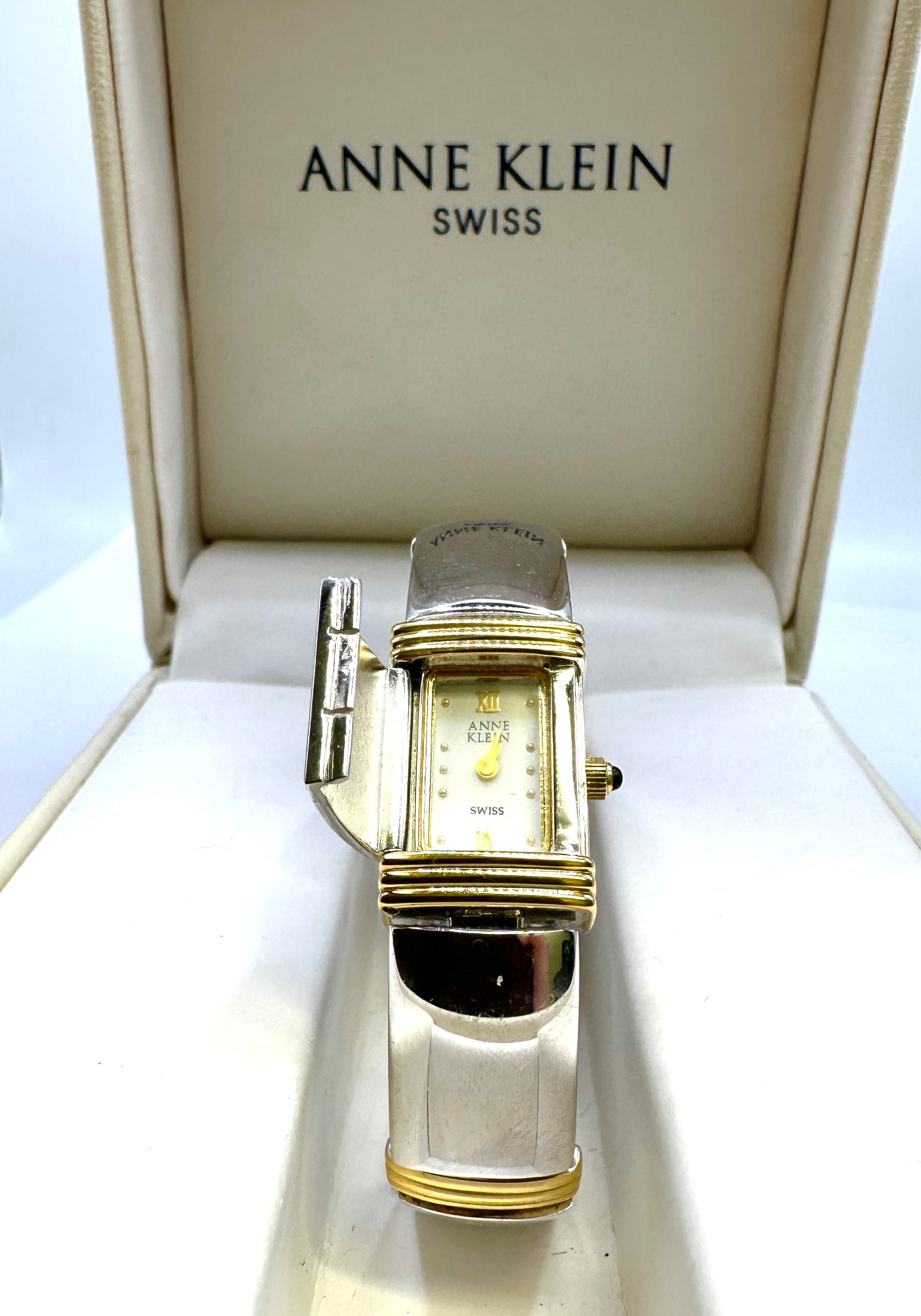 An Anne Klein Swiss Hidden Two-Tone Bangle Watch, model 12/6548-9-51. This modern ladies’ watch features a rectangular case that conceals a cream/champagne-colored dial with gold-tone Roman numeral XII, dot hour markers, and hands. It is constructed with a stainless steel back and base metal bezel. The watch is powered by a Swiss movement and includes a gold-tone crown with a black cabochon accent. Visible markings include “ANNE KLEIN” and “SWISS” on the dial. The case back further specifies “SWISS MOVT”, “STAINLESS STEEL BACK”, “BASE METAL BEZEL”, the “AK” logo, and the model number “12/6548-9-51 732S/2”. The watch is housed in its original cream-colored faux leather Anne Klein presentation case, which also bears “ANNE KLEIN” and “SWISS” markings.