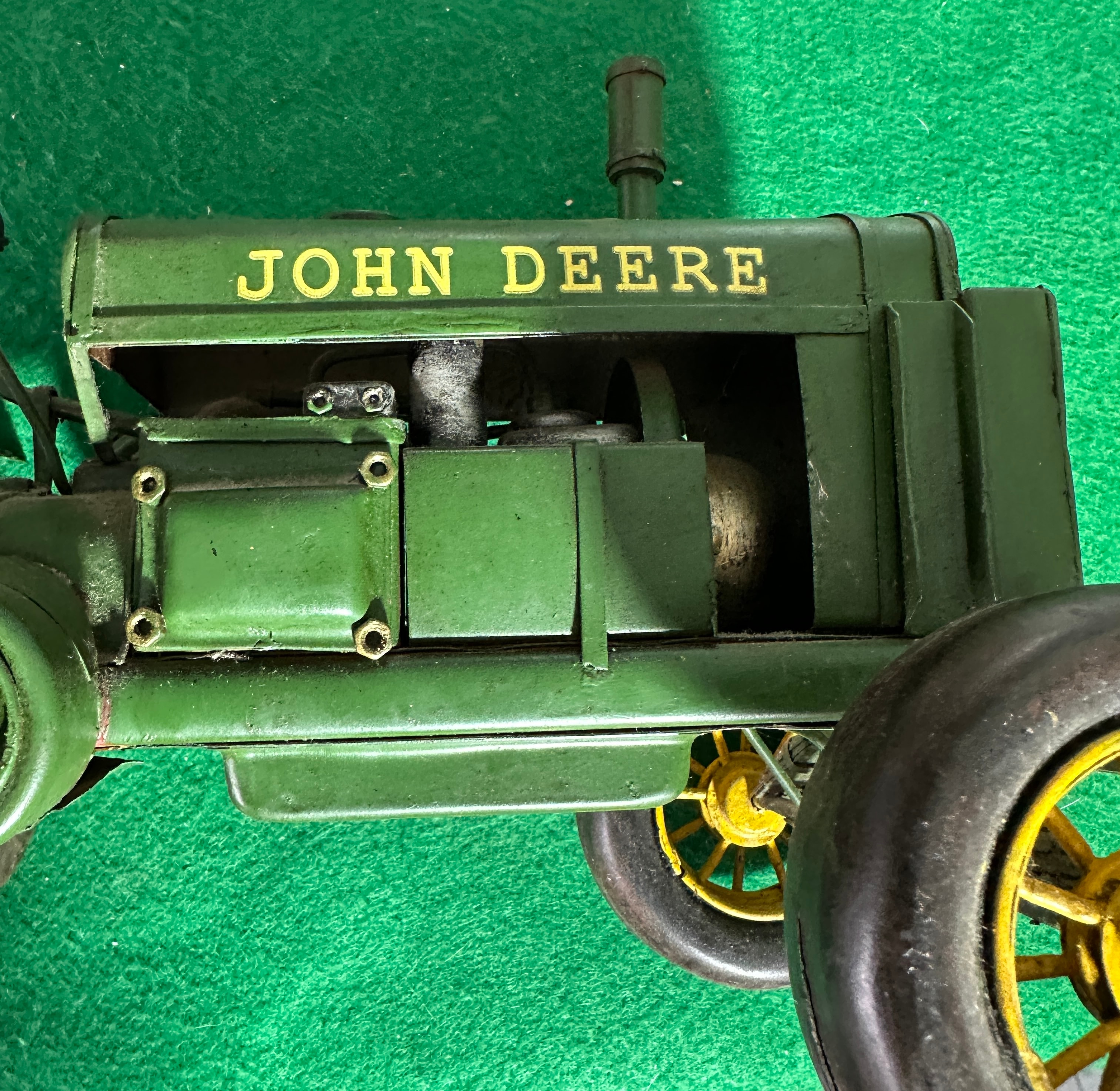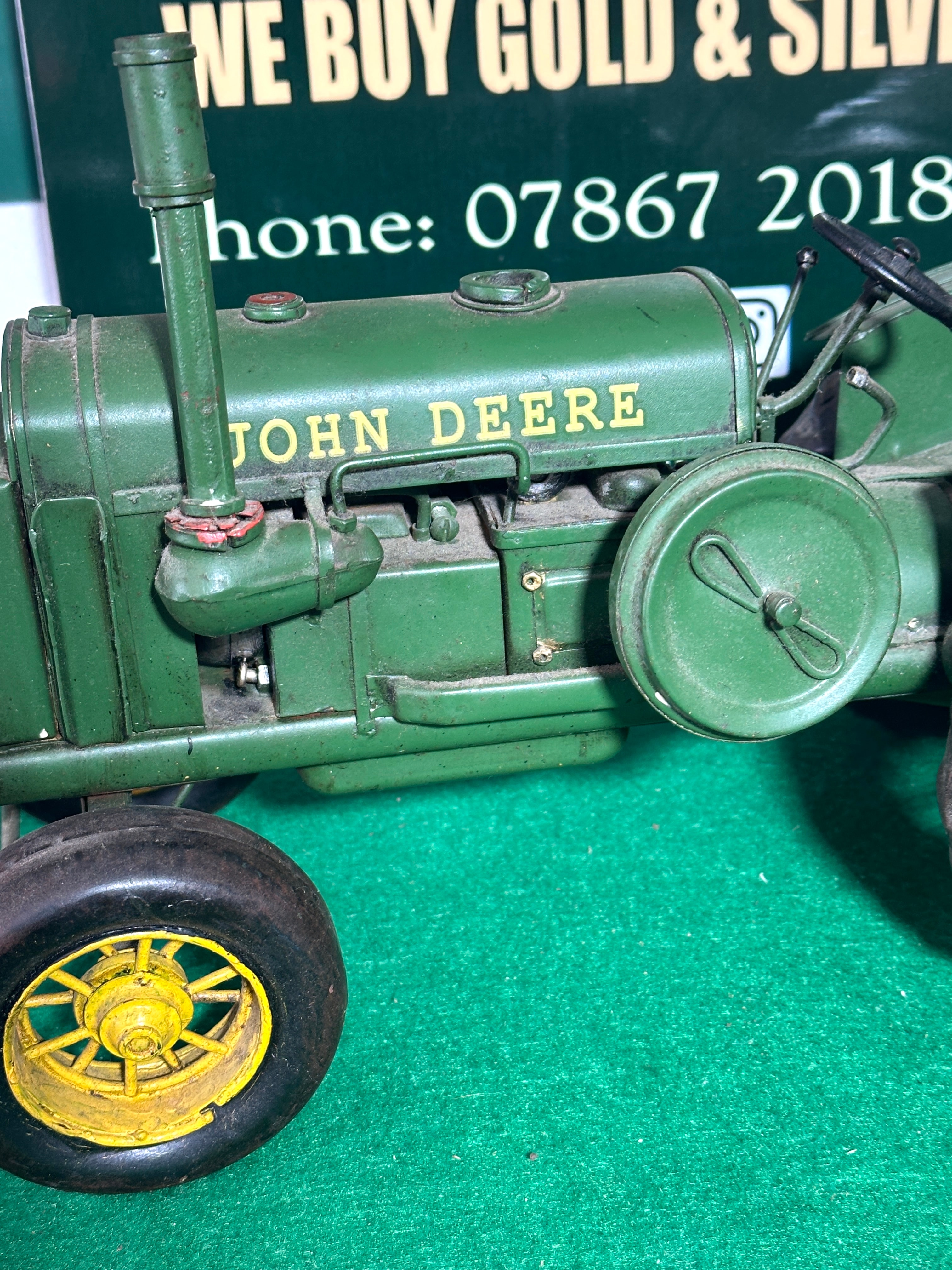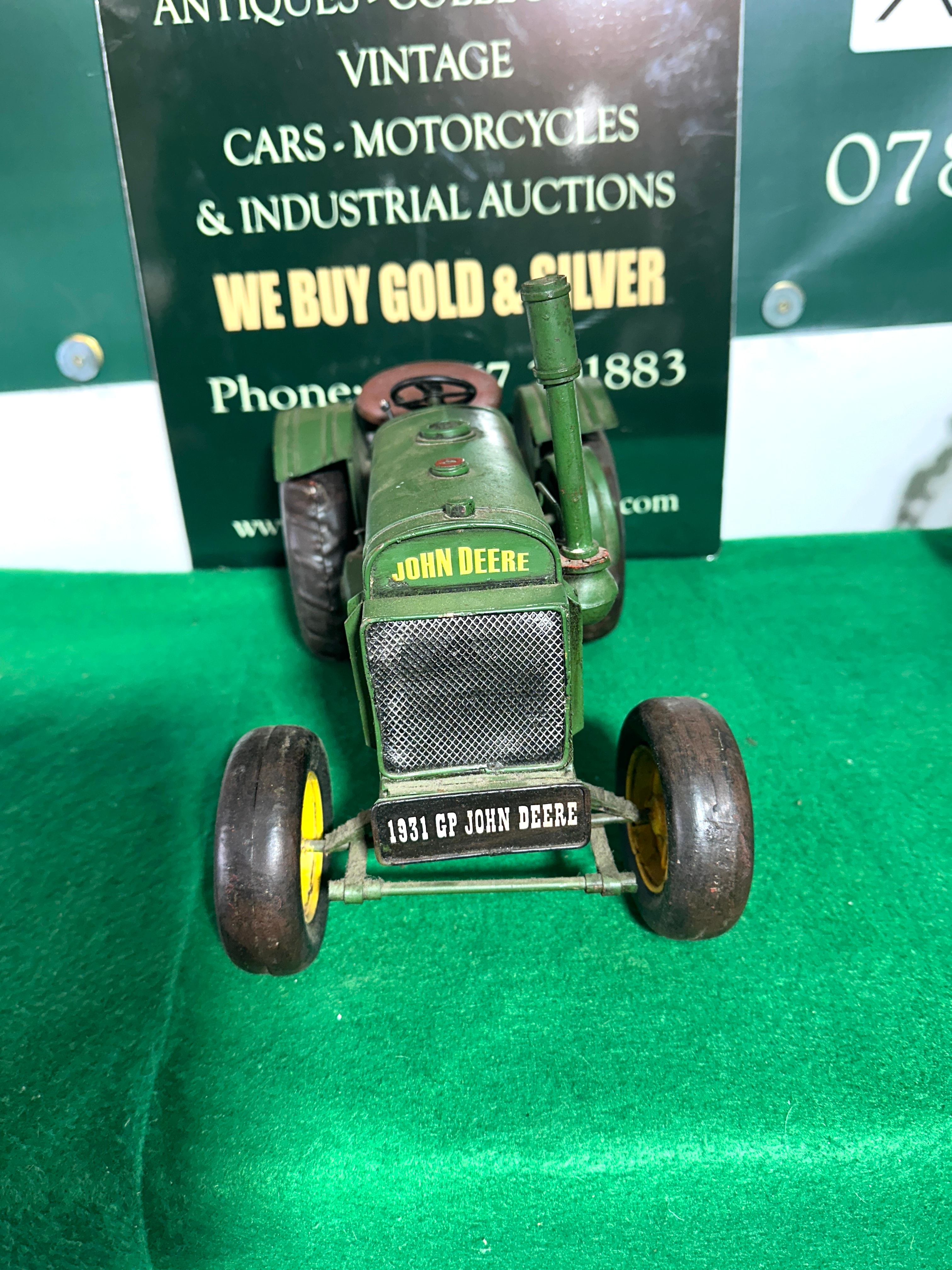 A Hallmark 2017 John Deere 1931 GP Tractor Model Ornament. Constructed primarily from painted green metal with yellow painted metal wheel hubs and black rubber tires, it features a reddish-brown painted metal seat. Markings on the front axle and engine bonnet identify it as a ‘1931 GP JOHN DEERE’. A label on the underside explicitly states, ‘NOT SUITABLE FOR CHILDREN AS PLAY OBJECT. IT IS NOT A TOY. THIS ITEM IS NOT A TOY. LEGISLATION SAYS SO.’, indicating its nature as a collectible display item rather than a child’s toy.