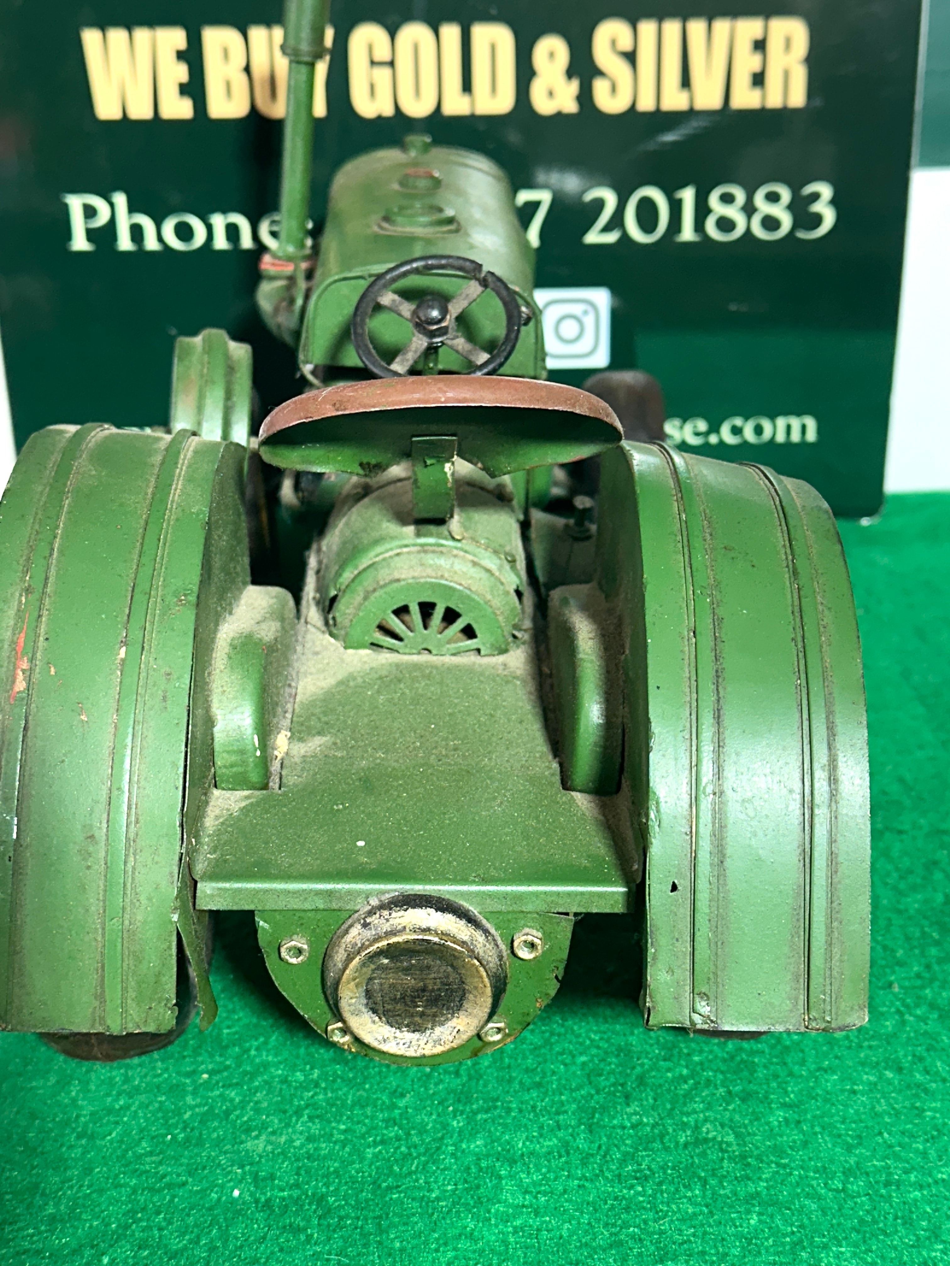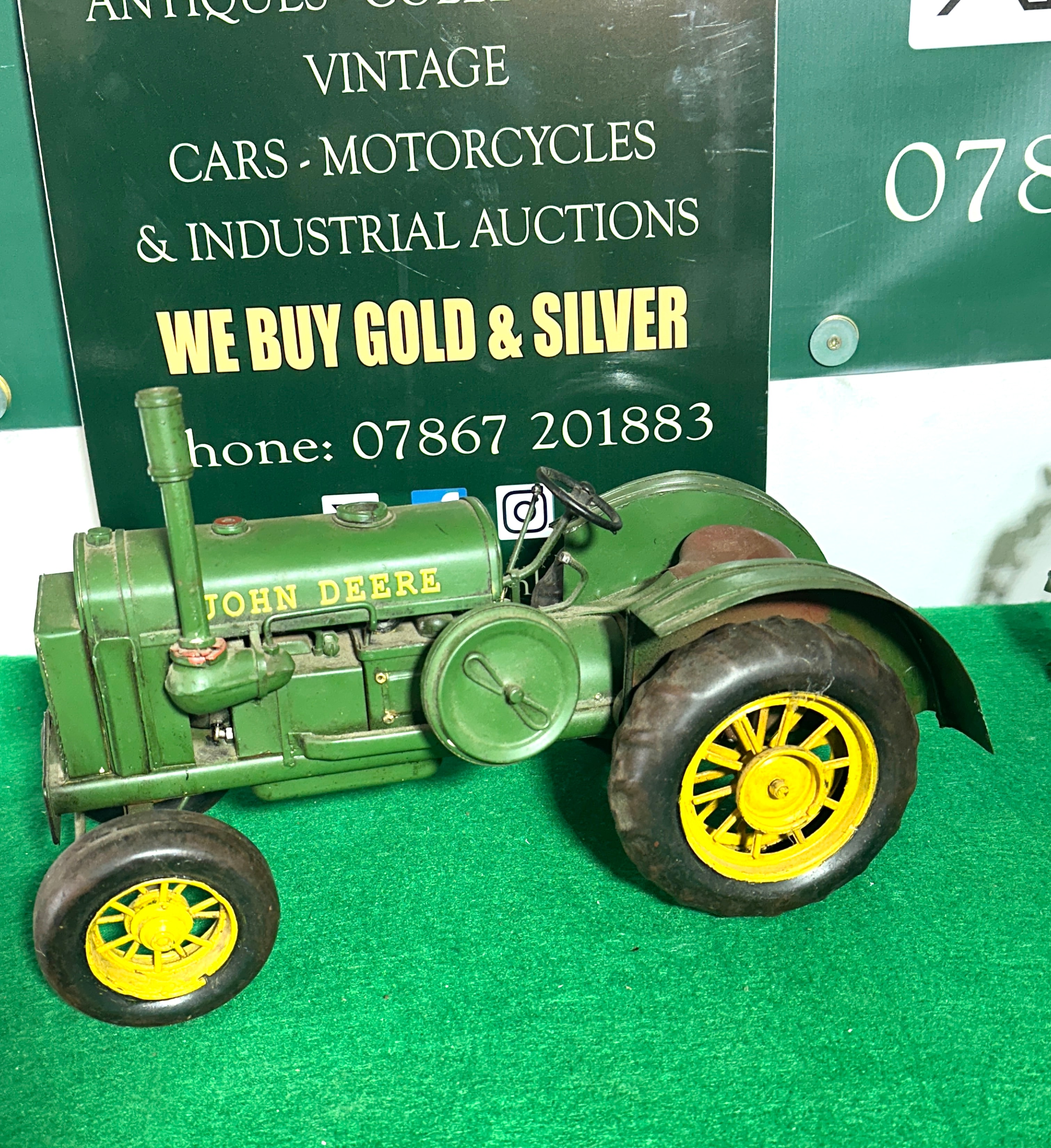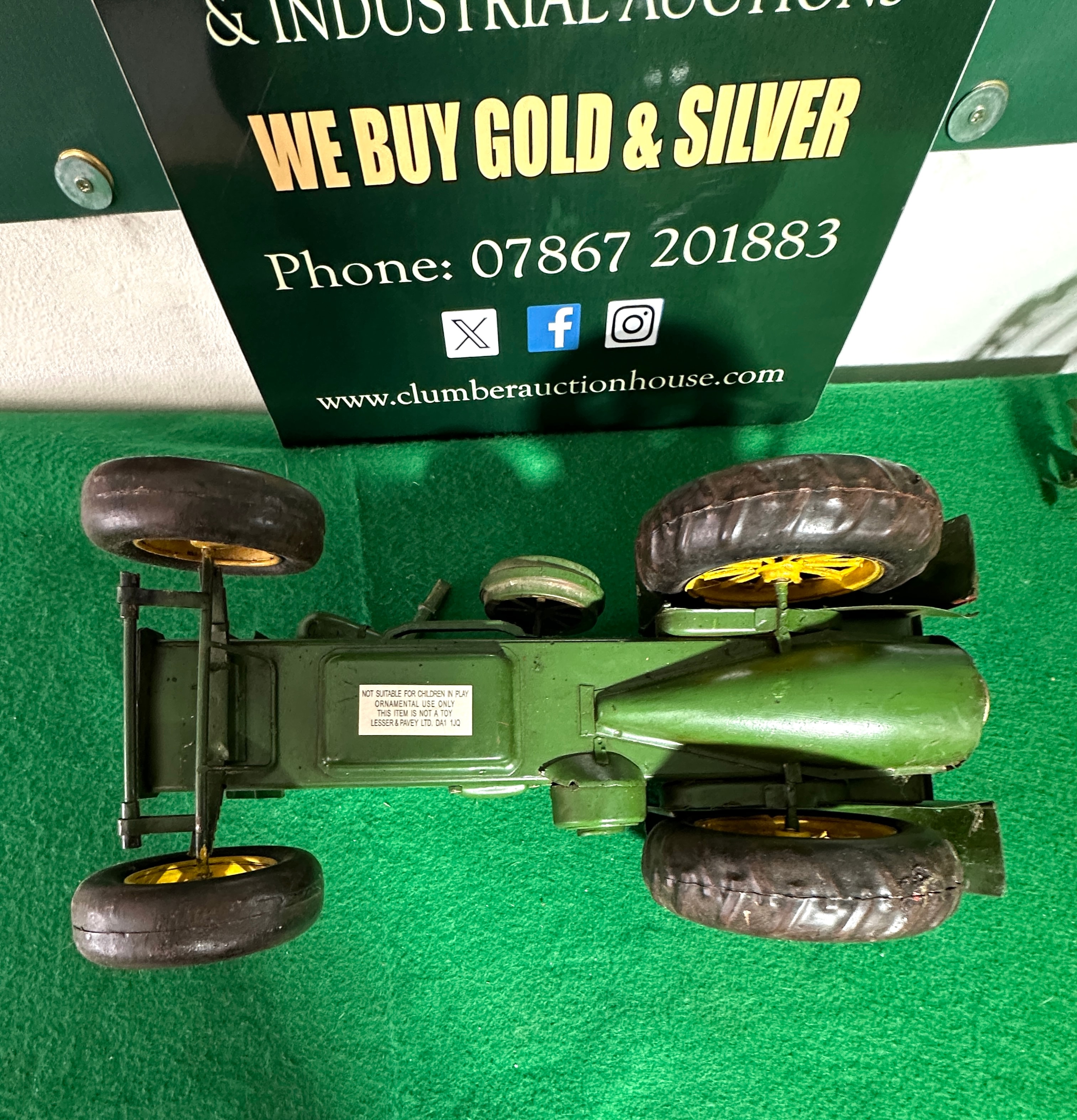 A Hallmark 2017 John Deere 1931 GP Tractor Model Ornament. Constructed primarily from painted green metal with yellow painted metal wheel hubs and black rubber tires, it features a reddish-brown painted metal seat. Markings on the front axle and engine bonnet identify it as a ‘1931 GP JOHN DEERE’. A label on the underside explicitly states, ‘NOT SUITABLE FOR CHILDREN AS PLAY OBJECT. IT IS NOT A TOY. THIS ITEM IS NOT A TOY. LEGISLATION SAYS SO.’, indicating its nature as a collectible display item rather than a child’s toy.