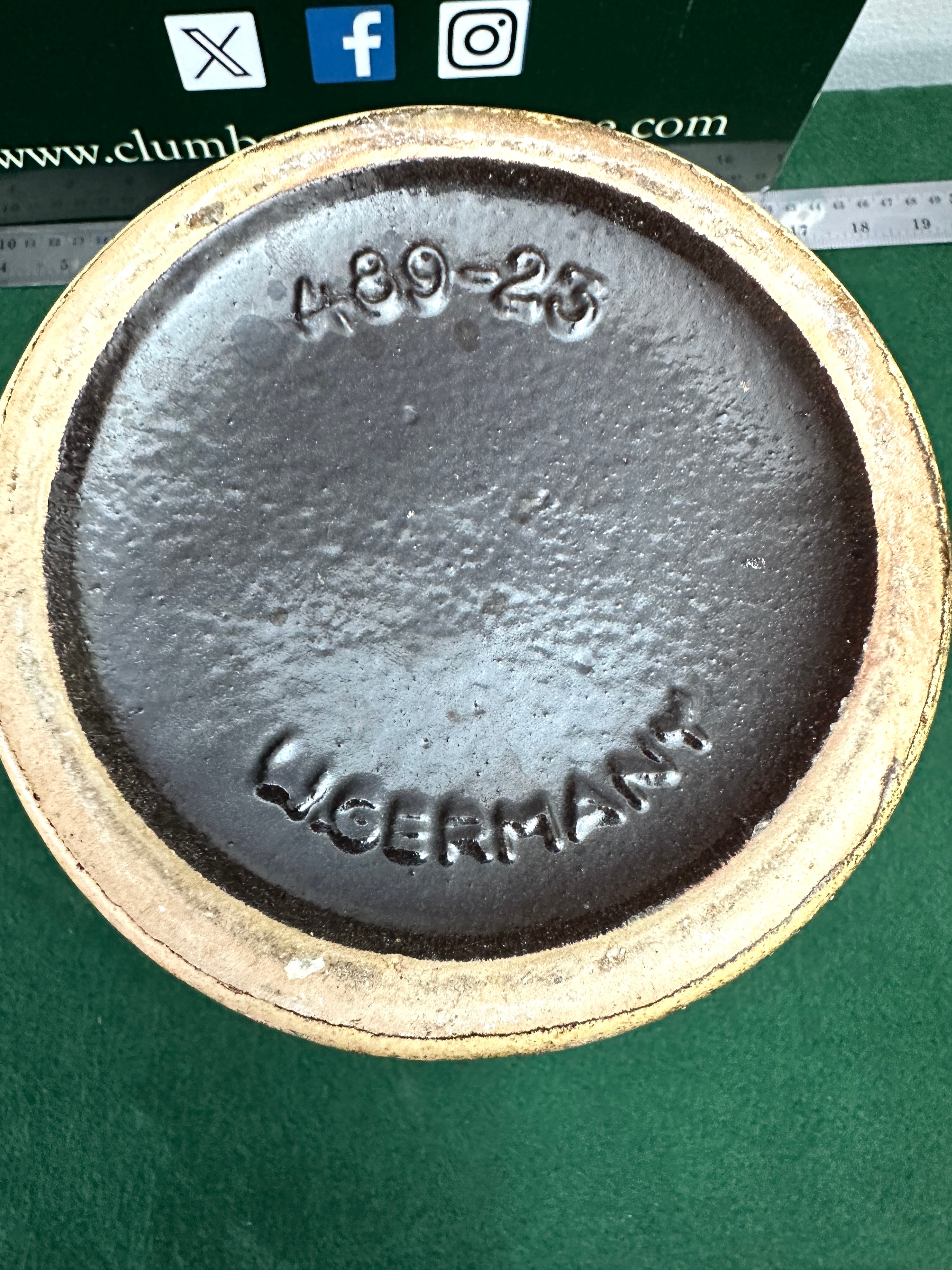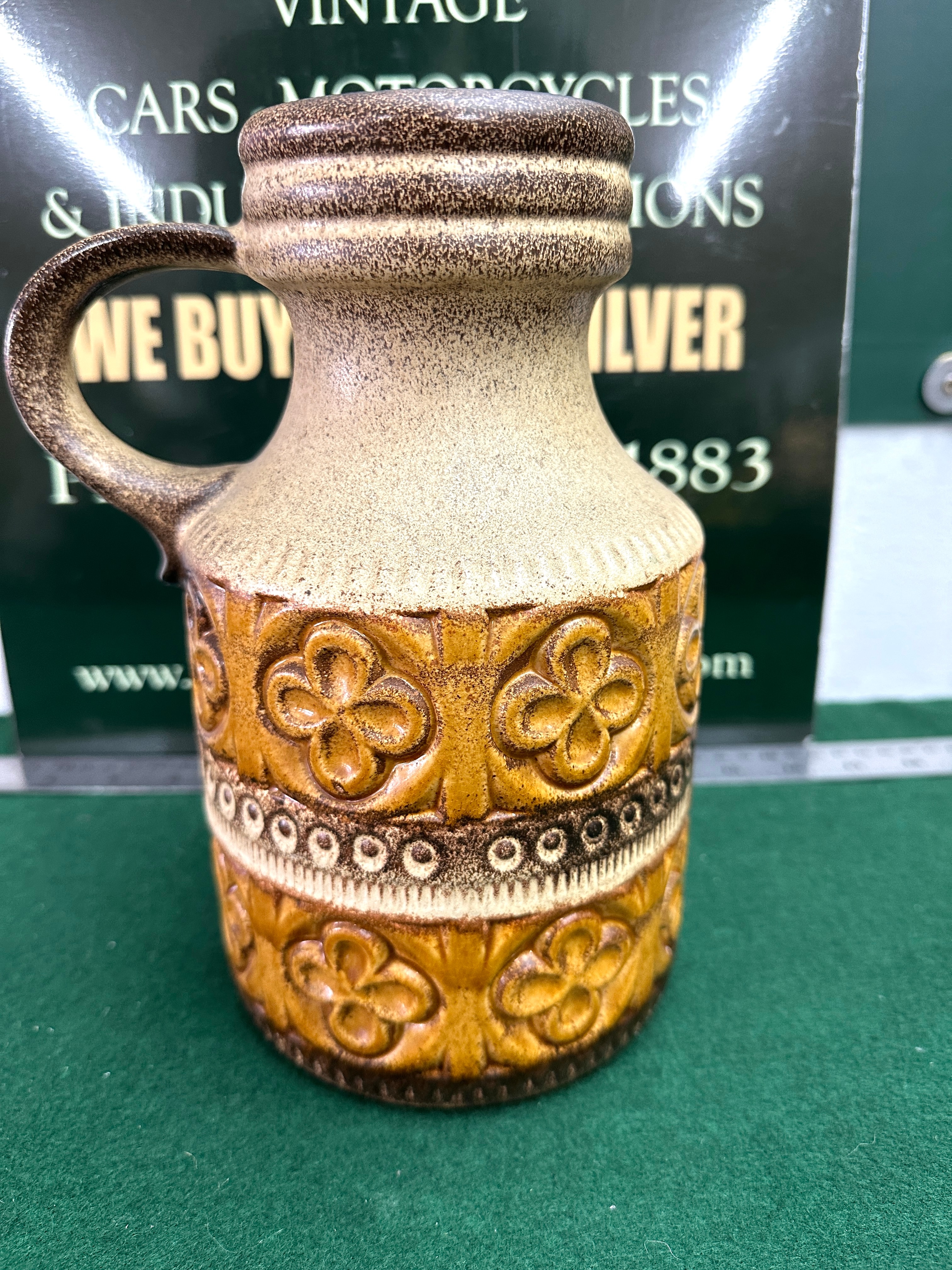 A Scheurich West Germany stoneware jug, model 489-23, exhibiting a mid-20th century European pottery style, often associated with “Fat Lava” ceramics. It features a bulbous body with a single handle, transitioning from a textured, speckled beige and brown glaze on the upper section to a richly decorated lower body. The lower half displays distinct bands of impressed floral (quatrefoil) and dot motifs in amber and dark brown glazes. The base is marked in raised relief with “GERMANY” and “489-23.”