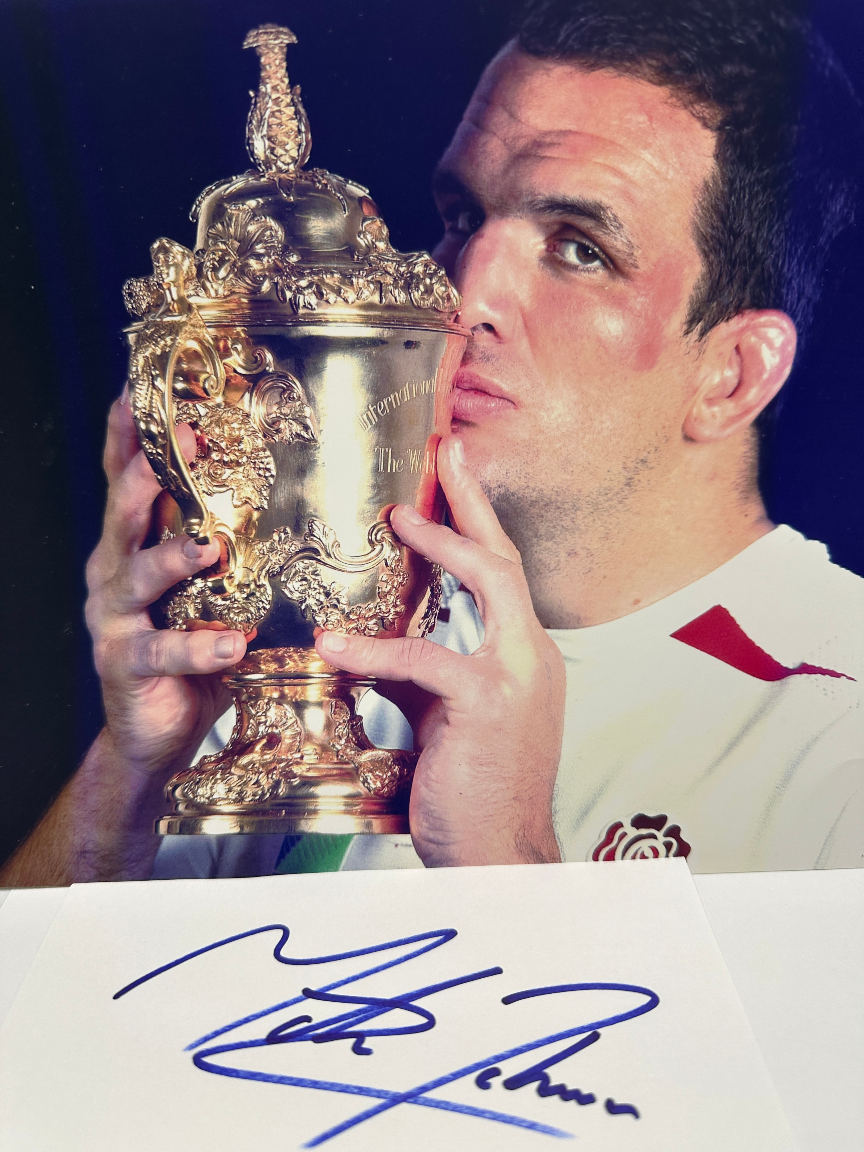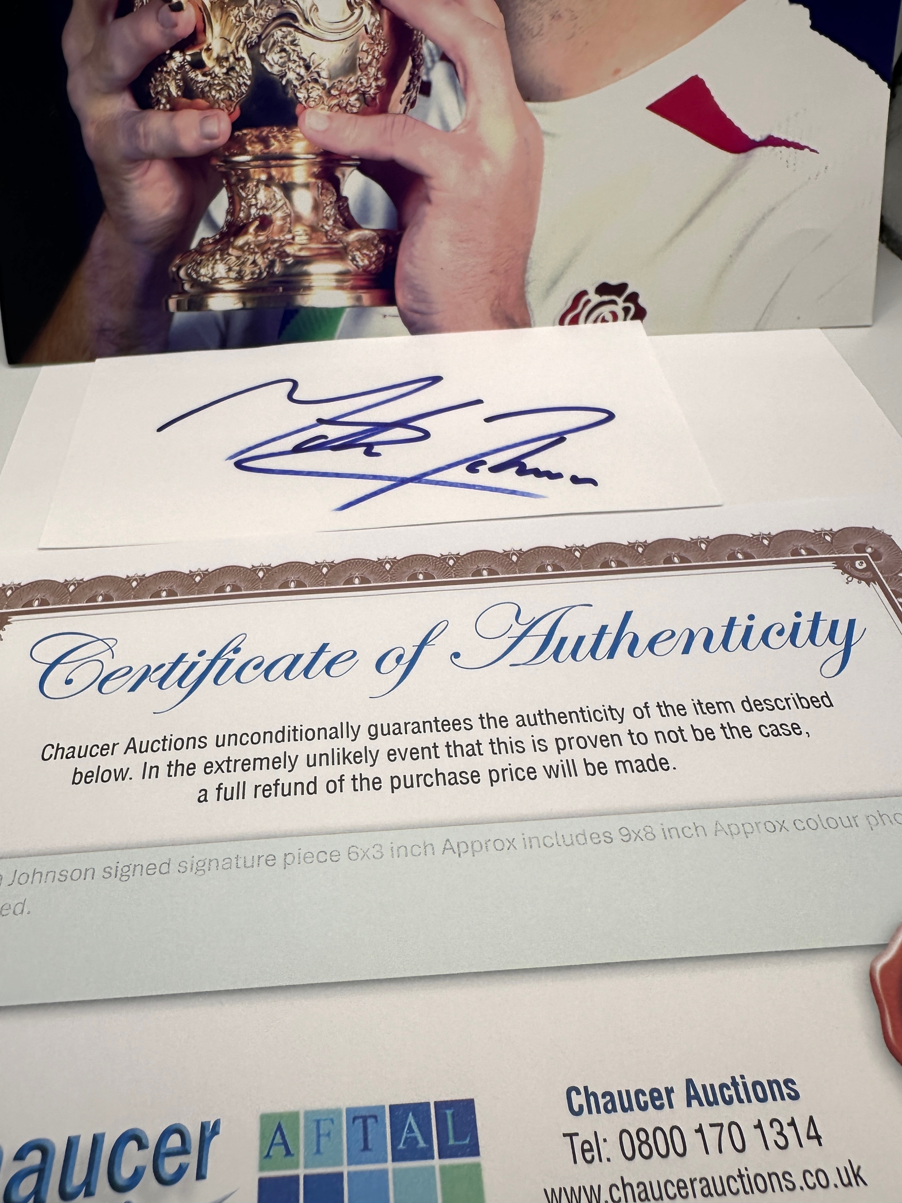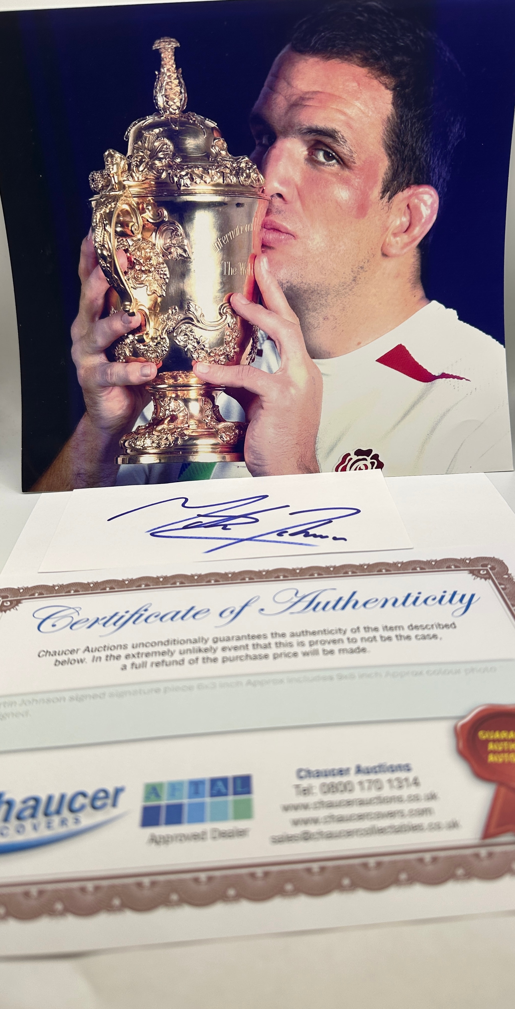 A Martin Johnson signed signature piece, comprising a contemporary glossy colour photograph depicting rugby player Martin Johnson kissing the gold-coloured Webb Ellis Cup, with a separate white card signed in blue ink. The photograph features the text “INTERNATIONAL” and “THE WEBB” partially visible on the trophy. Accompanied by a “Certificate of Authenticity” from “Chaucer Auctions,” which guarantees the item’s authenticity and explicitly describes it as a “Martin Johnson signed signature piece 6×3 inch Approx includes 9×8 inch Approx colour photograph.” Further documentation from “Chaucer Auctions / Chaucer Covers,” an “AFTAL Approved Dealer,” is also partially visible, listing contact information.