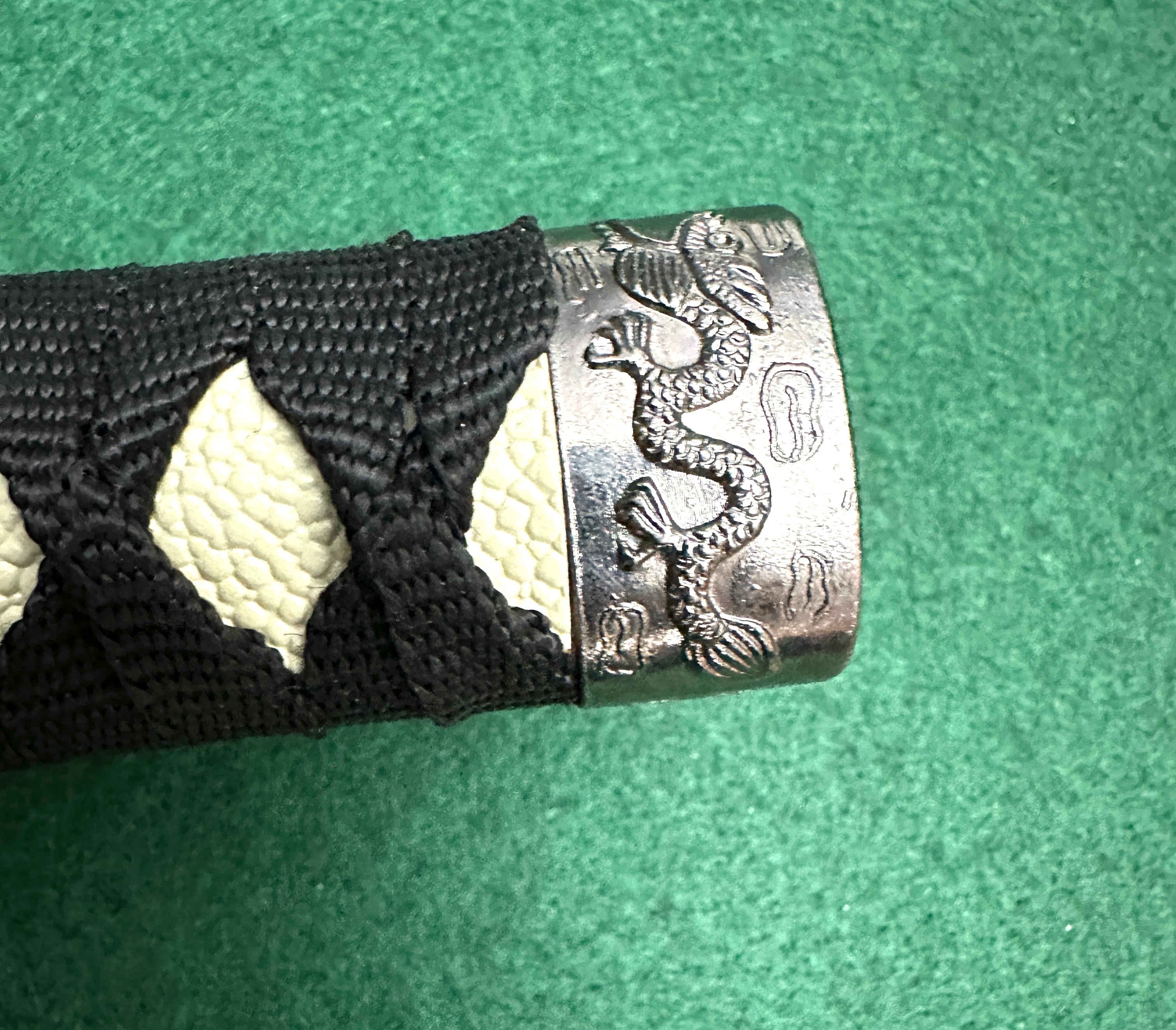A Japanese-style short sword or large dagger, resembling a tanto or small wakizashi. It features a polished metal blade. The hilt is wrapped in black cord over a white, textured underlayer, and fitted with silver-toned metal fittings. The pommel (kashira) is decorated with a relief of a dragon, while the hilt collar (fuchi) displays a landscape or geometric pattern. The accompanying black scabbard (saya) is equipped with a black cord (sageo). No discernable maker’s marks or inscriptions are visible on the item itself.