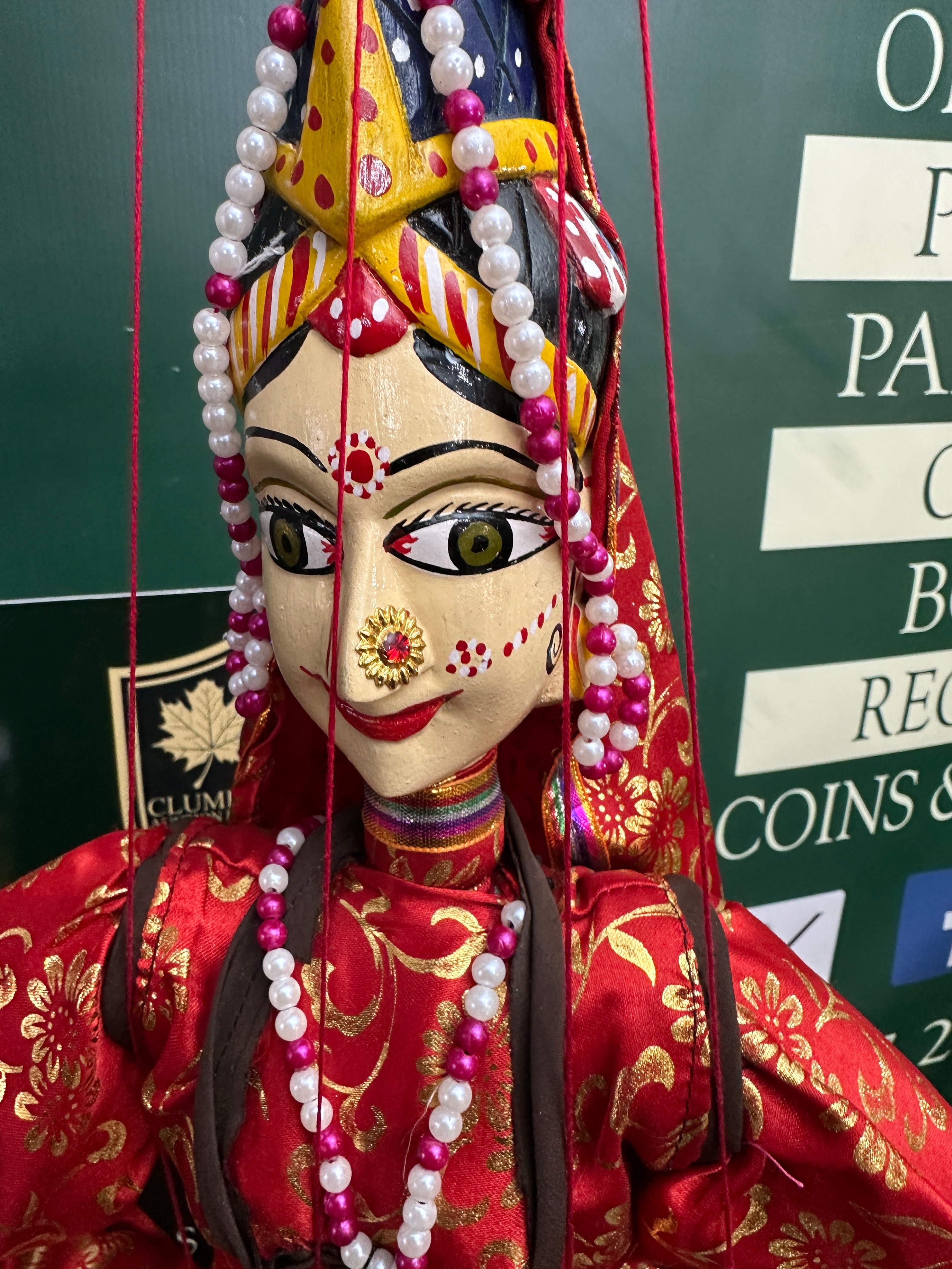 A Rajasthani Kathputli string puppet, featuring a carved and painted wooden head with expressive facial features, large eyes, a smiling mouth, and a faux nose ring. The figure is elaborately costumed in a vibrant red satin-like fabric with extensive gold floral and foliate patterns. Adornments include multiple strands of faux white and pink/purple pearl beads around the neck and waist, a complex beaded headdress, and black braided sleeves with yellow tassels. The puppet is manipulated by red strings attached to a red-painted wooden crossbar.