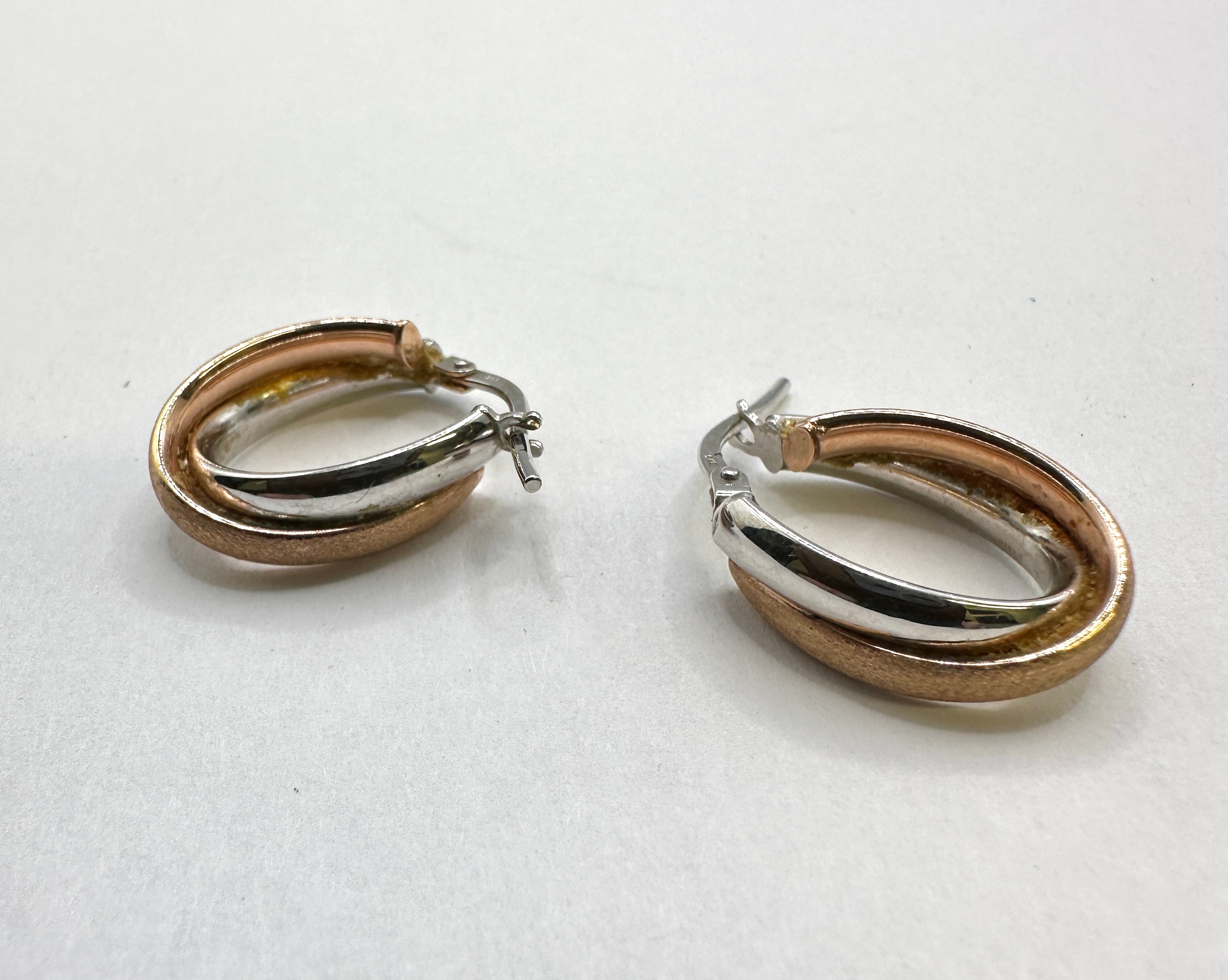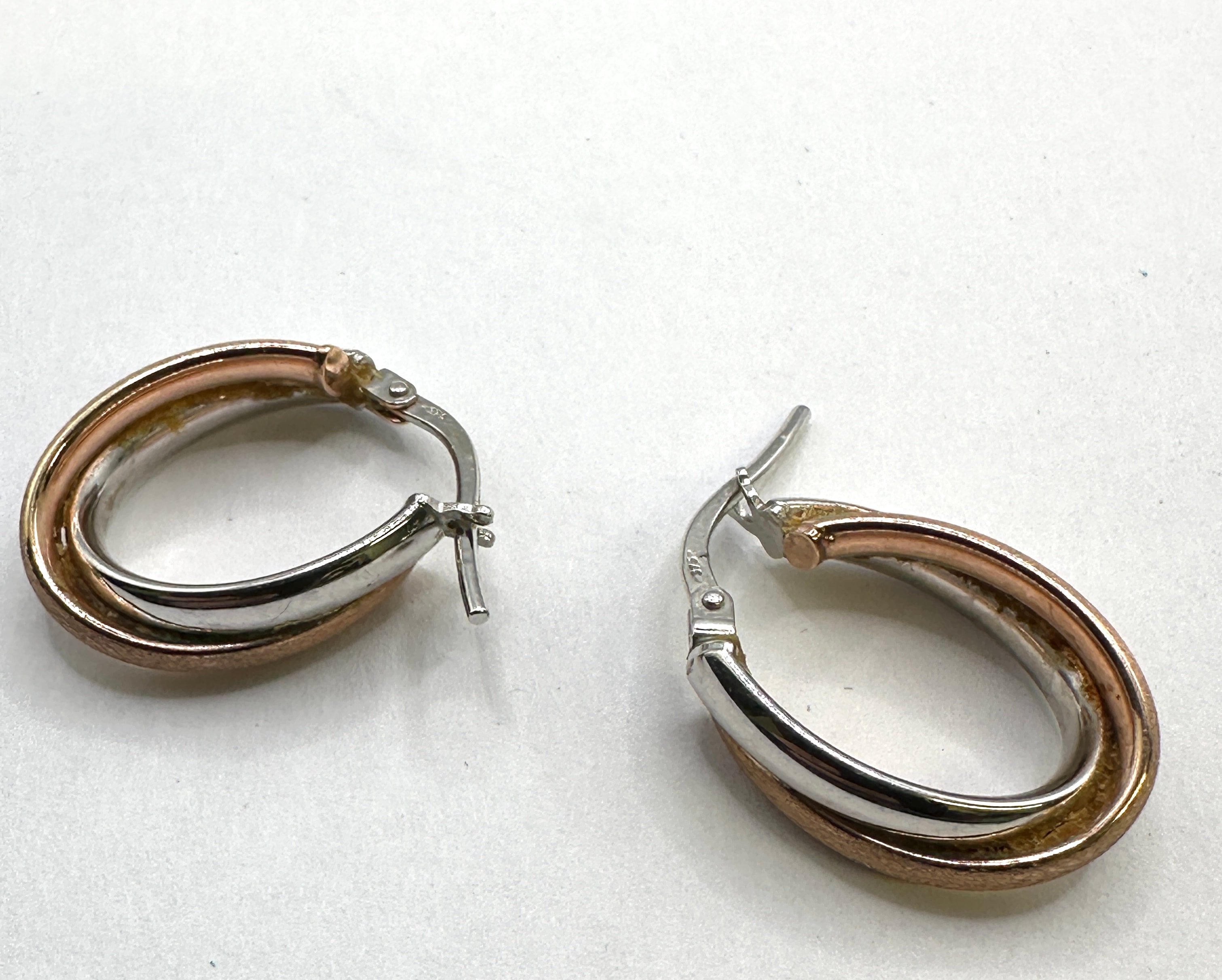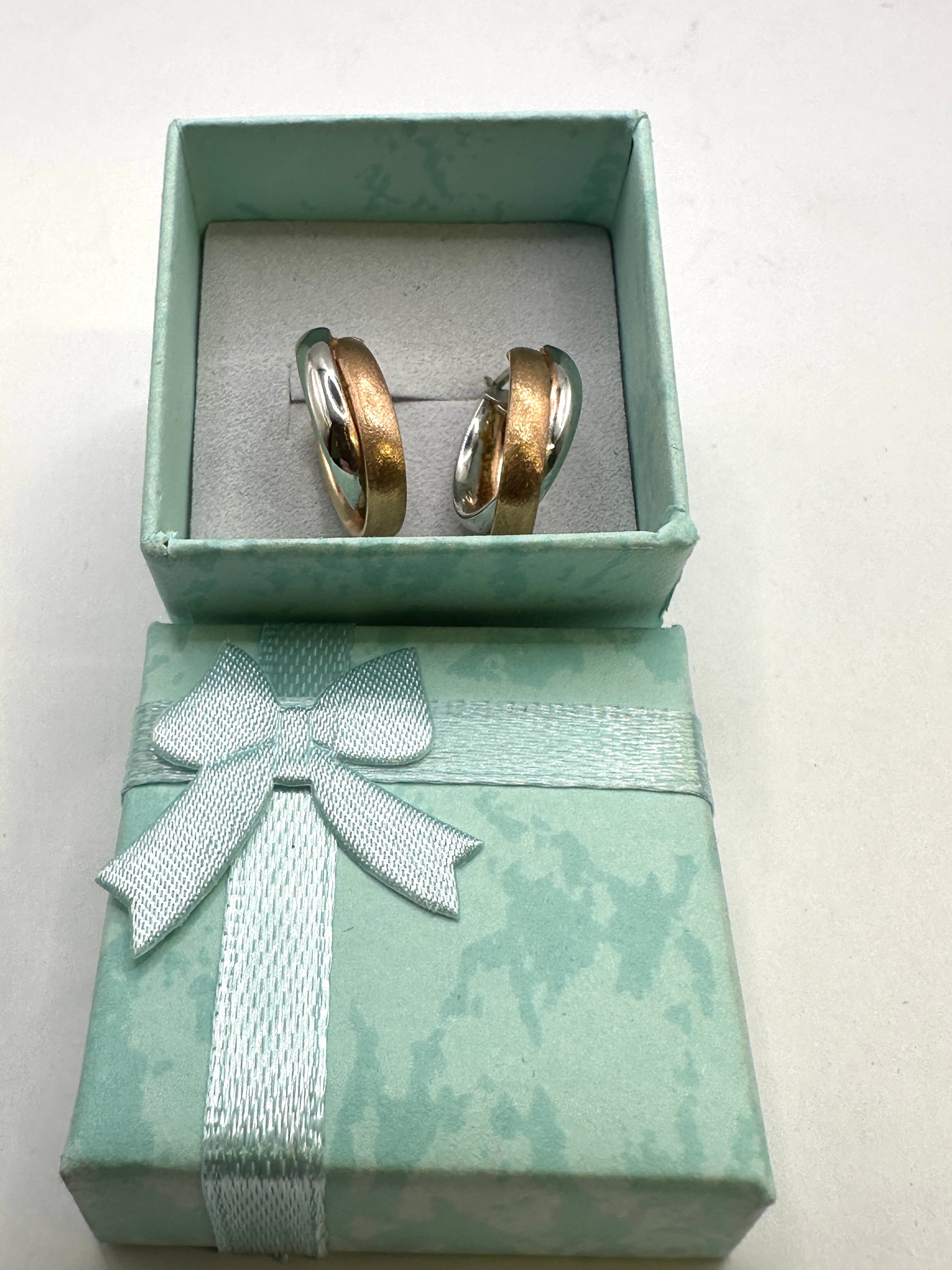 A pair of two-tone twisted oval hoop earrings, each featuring two intertwined oval bands: one polished 9k White Gold and the other frosted 9k rose gold. A ‘375’ mark is visible on the post of both earrings. The earrings are fitted with hinged post closures. They are accompanied by a modern, light blue textured gift box & ribbon.