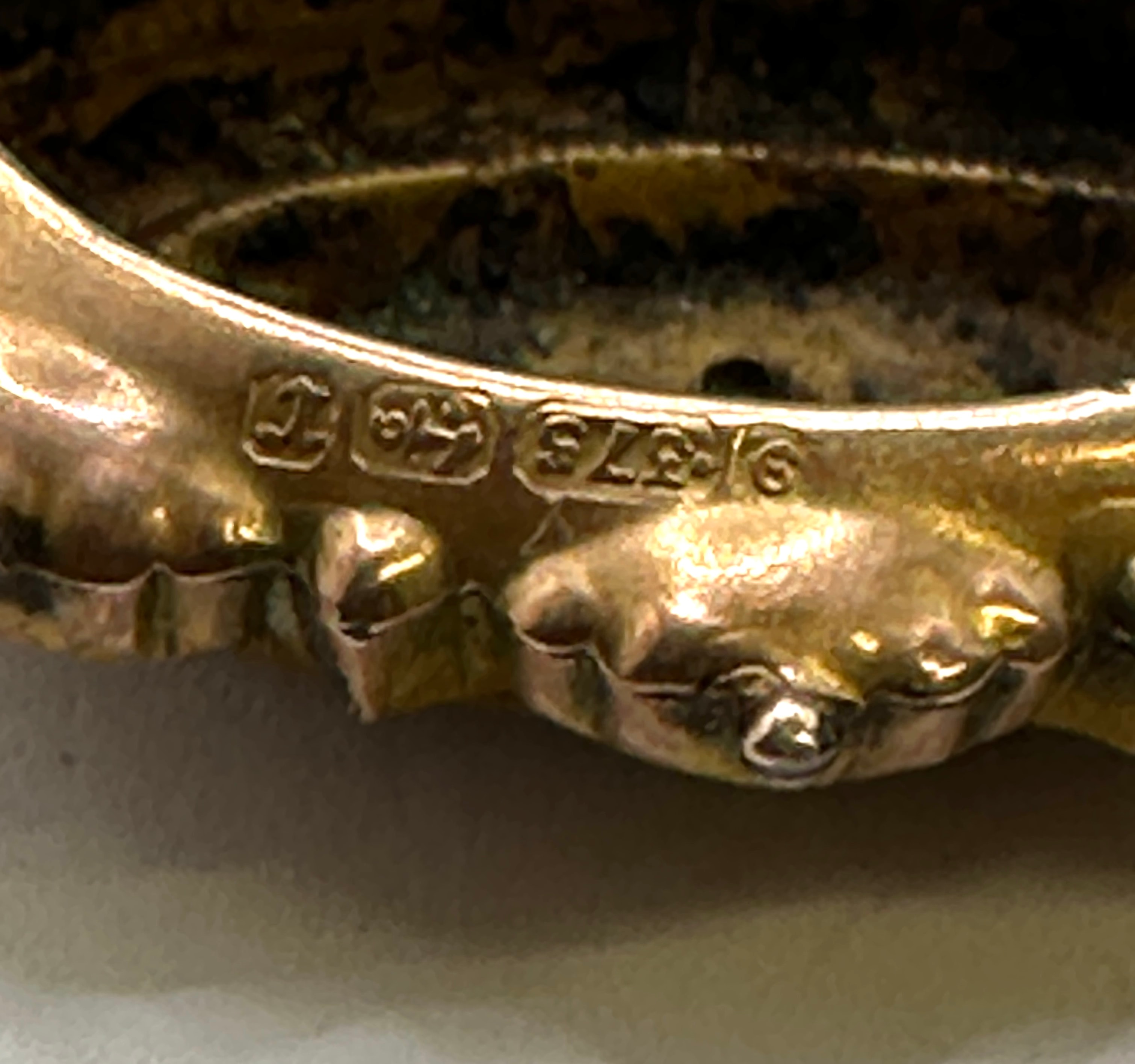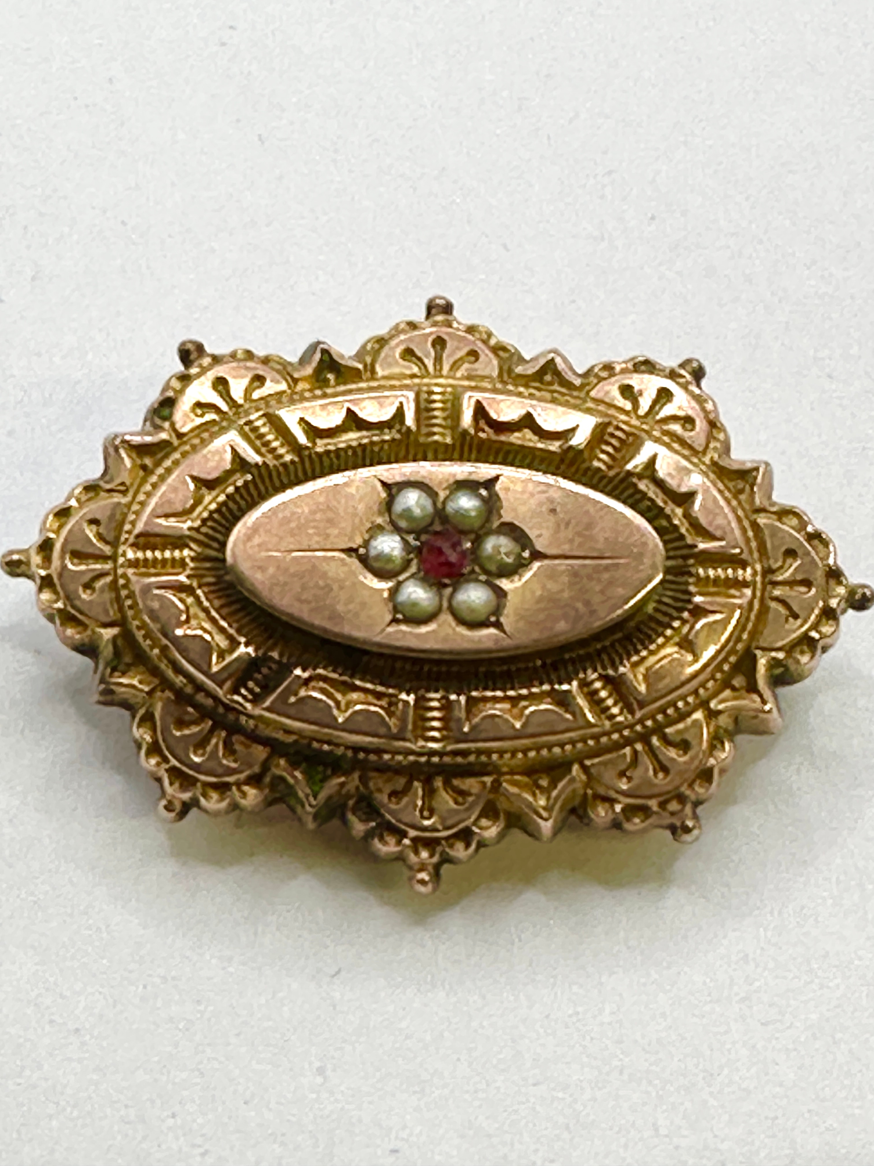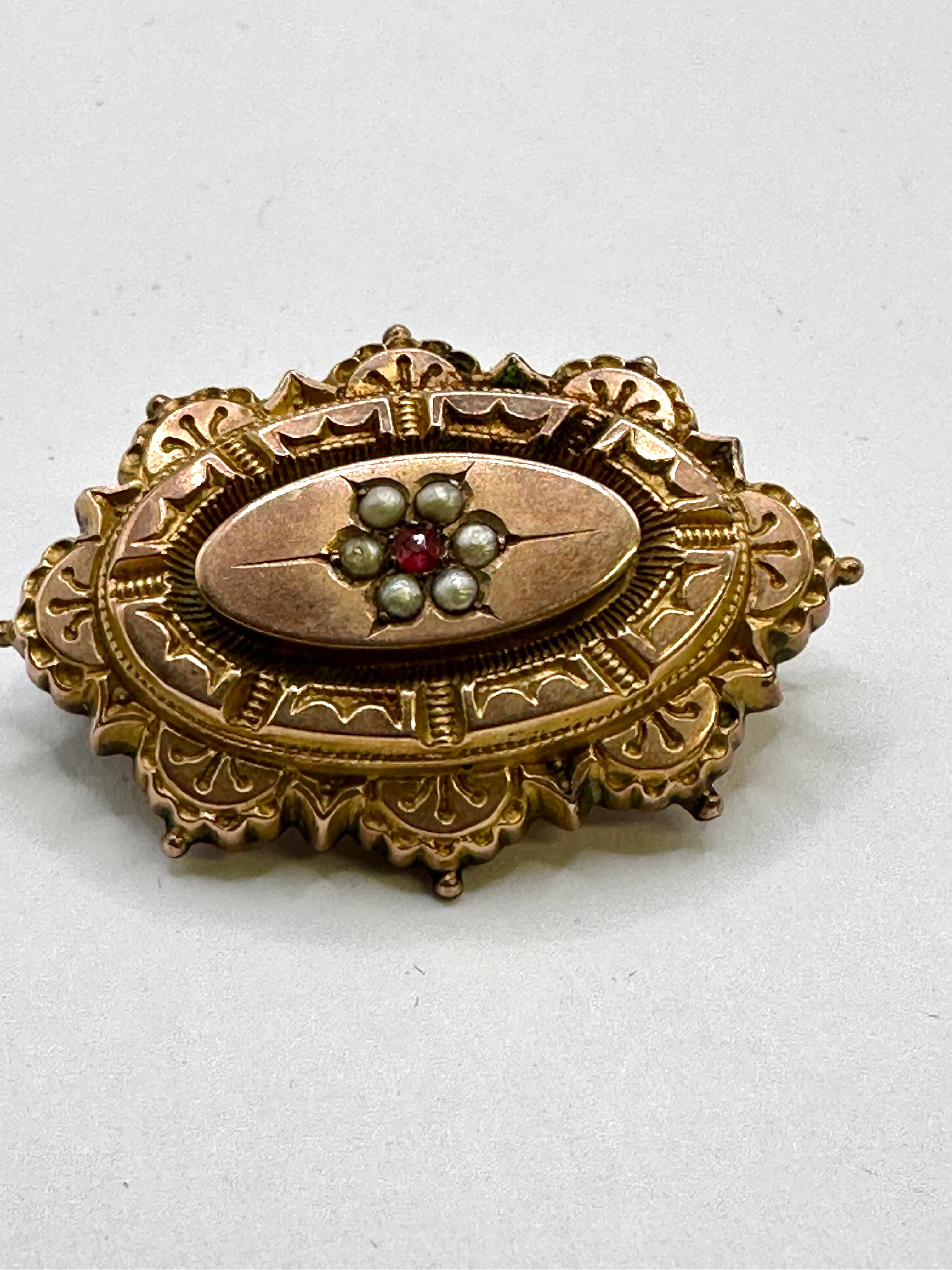 A Victorian 9-karat gold brooch decorated with seed pearls. This ornate, oval-shaped brooch is crafted from gold-toned metal, indicated by visible hallmarks “9” and “375” for 9-karat gold, along with a “T” in a shield and a Birmingham assay office anchor mark. The design features a scalloped outer border with intricate foliate and architectural detailing, framing a central raised oval panel. This central panel is decorated with a star-like motif composed of a single round red stone surrounded by six small white pearls. All visible stones are present.