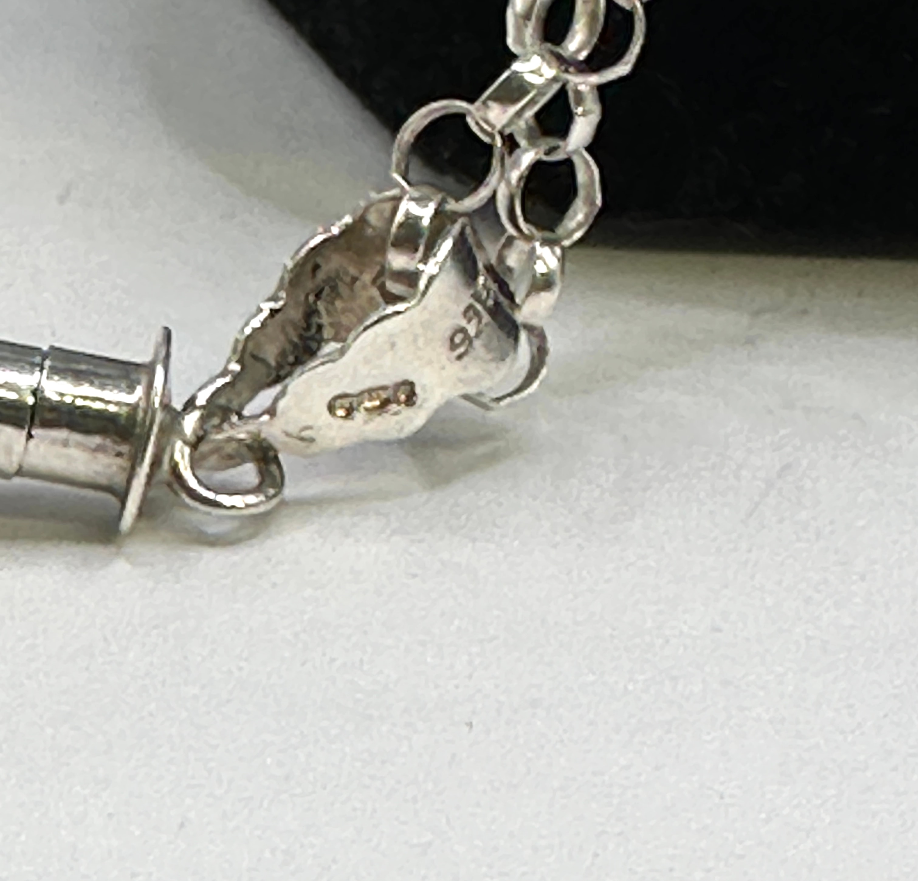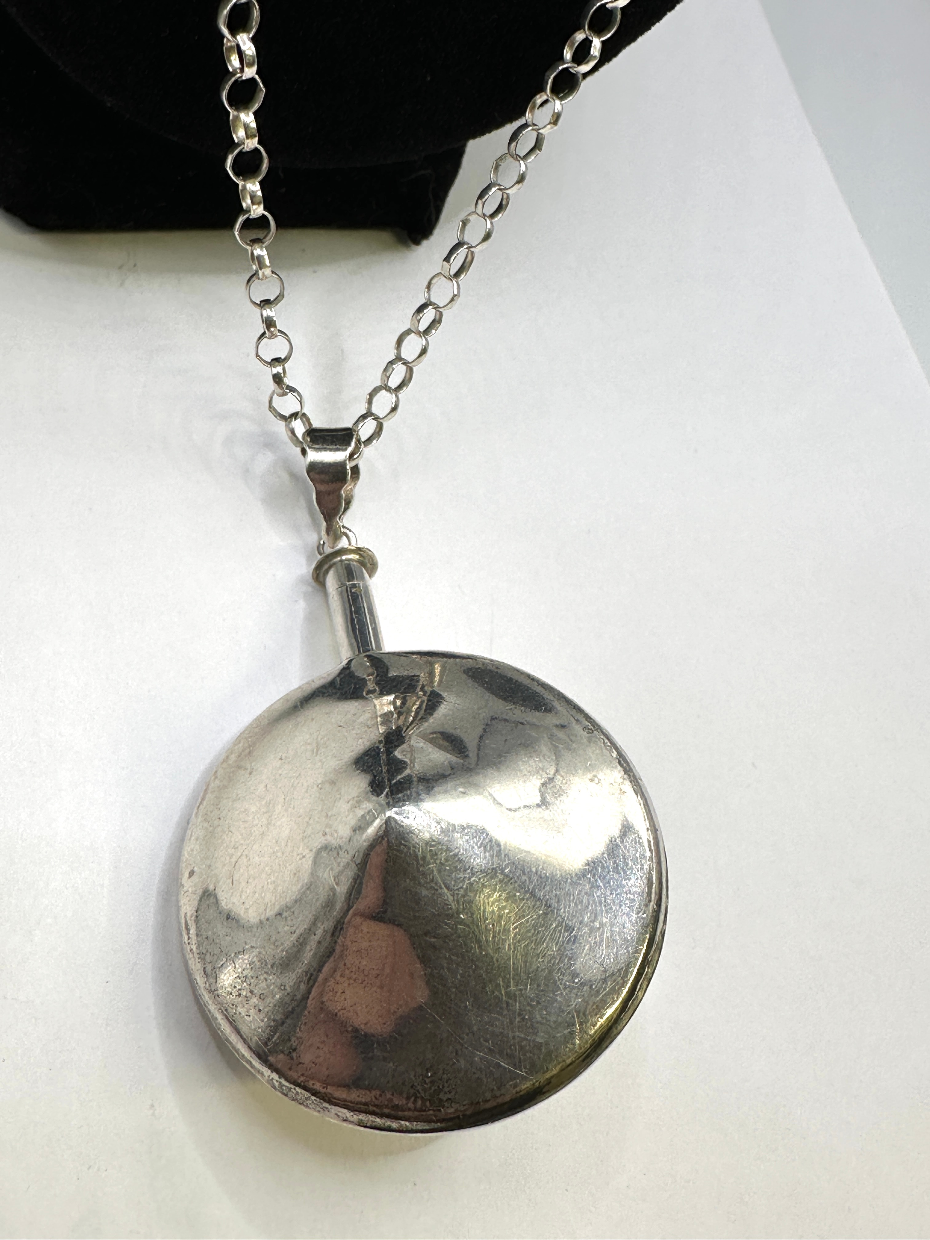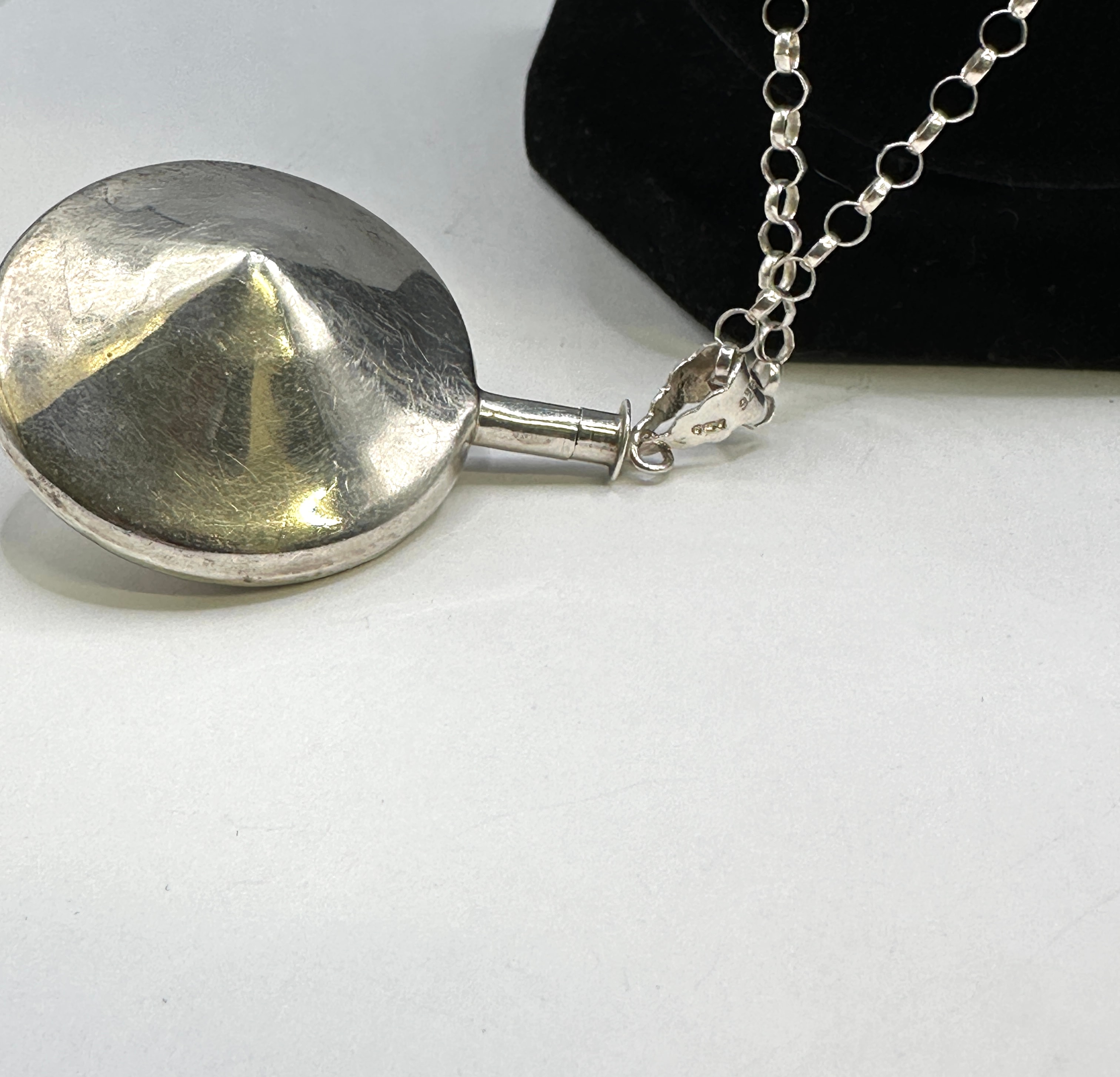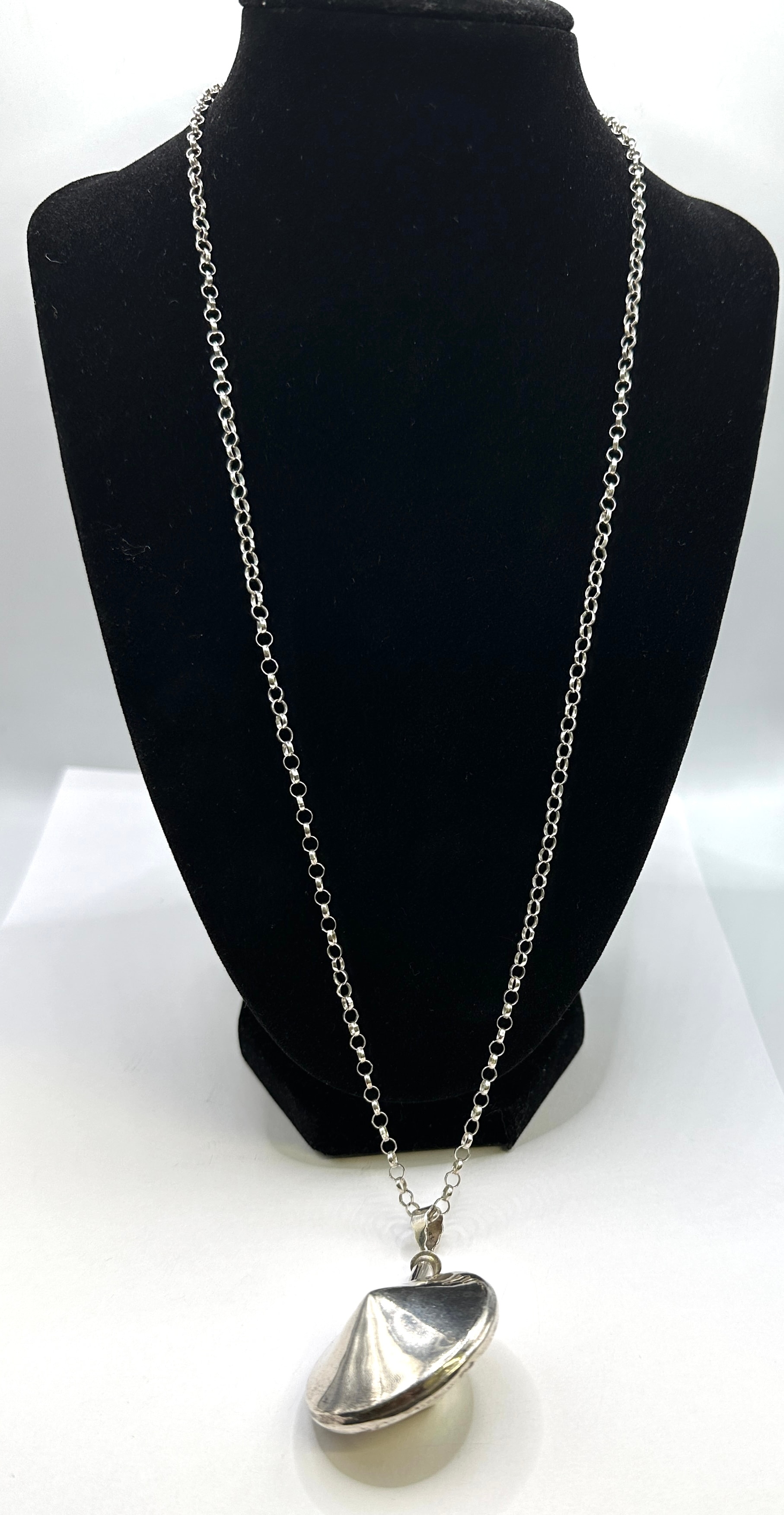 A 925 silver necklace featuring a long rolo chain and a distinctive pendant. The pendant is designed with a flattened, circular body, a conical protrusion on one side, and an integrated neck/stopper mechanism. The clasp is visibly marked ‘925’ and ‘MEXICO,’ confirming the material as 925 silver and its country of origin.