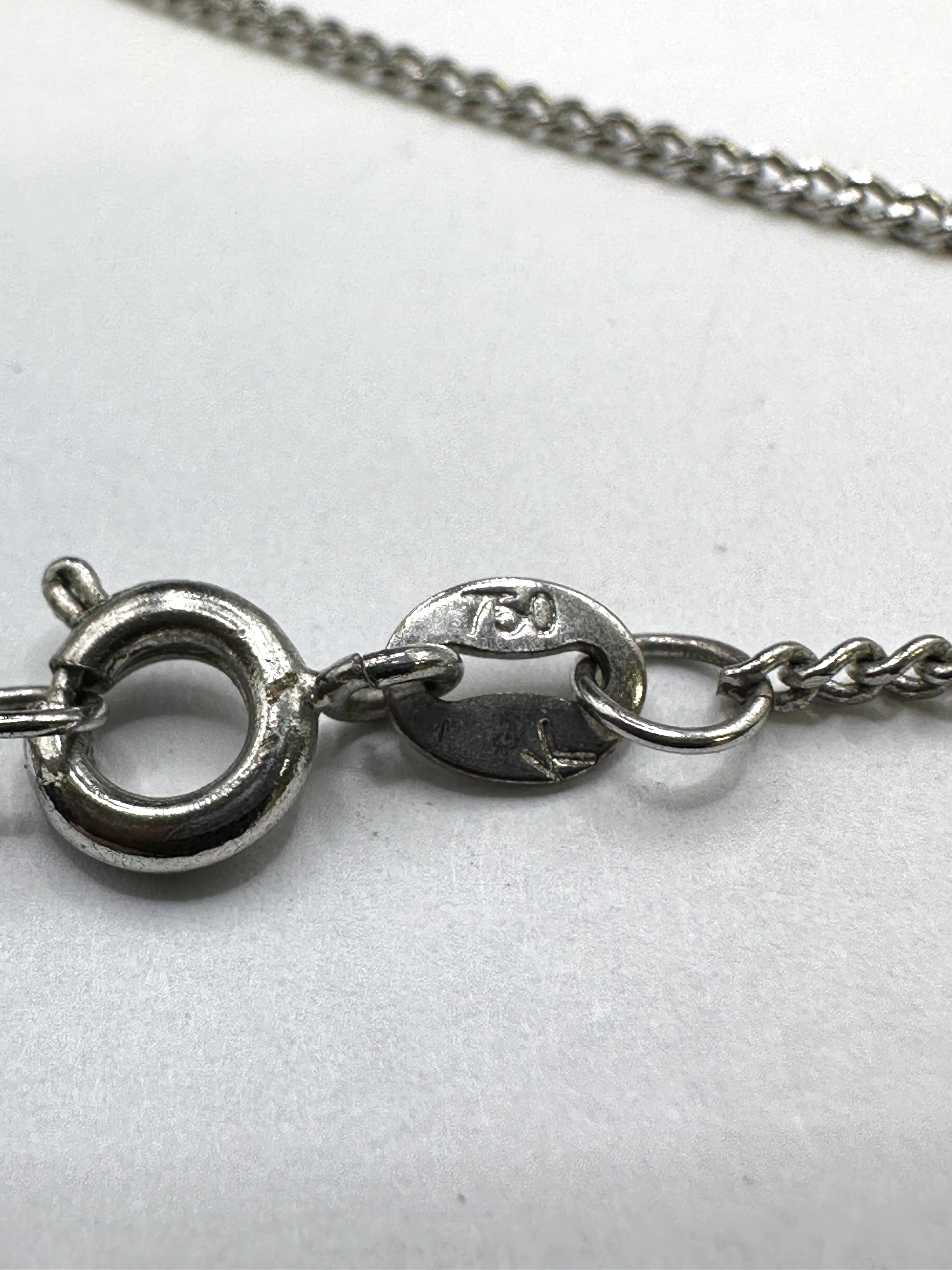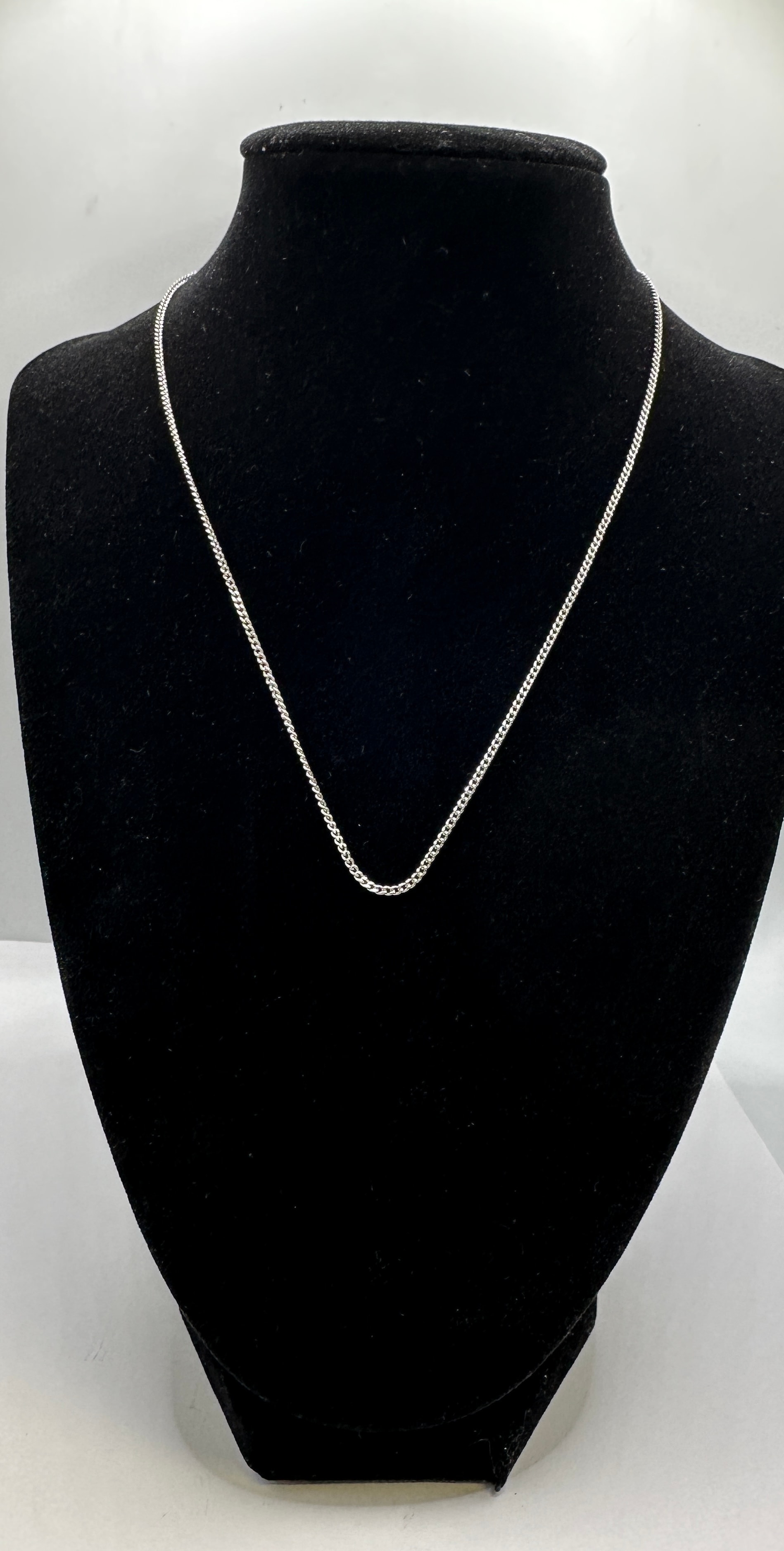 An 18k white gold curb link chain necklace, secured with a spring ring clasp. An oval jump ring connected to the clasp is stamped with ‘750’.Weight: 2.2 grams