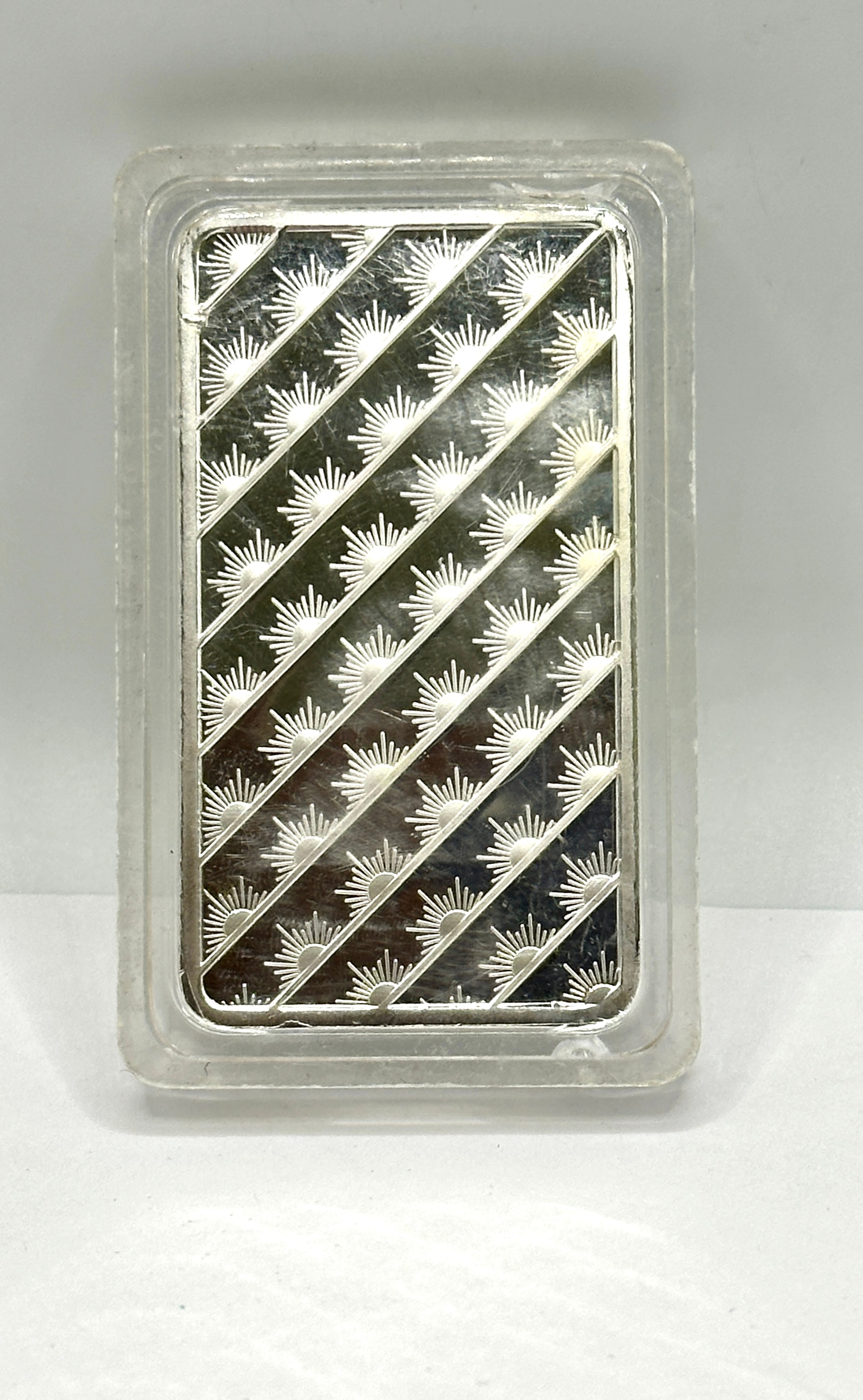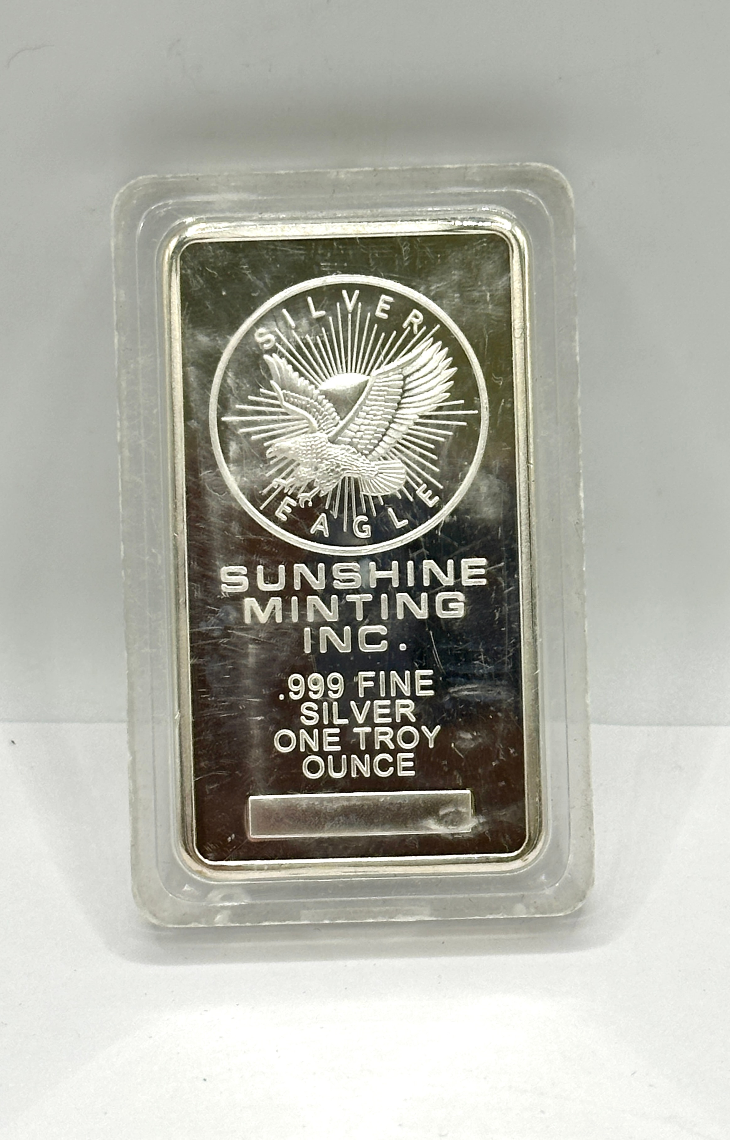 A Sunshine Minting Original 1 oz .999 Fine Silver Bar. This rectangular silver bullion bar is sealed within a clear plastic protective case. The obverse features a central circular emblem depicting a stylized eagle with radiating sun rays, encircled by the text “SILVER EAGLE”. Below this, it is marked “SUNSHINE MINTING INC.” and further specifies “.999 FINE SILVER ONE TROY OUNCE”. The reverse displays a repeating pattern of stylized sunbursts arranged diagonally.