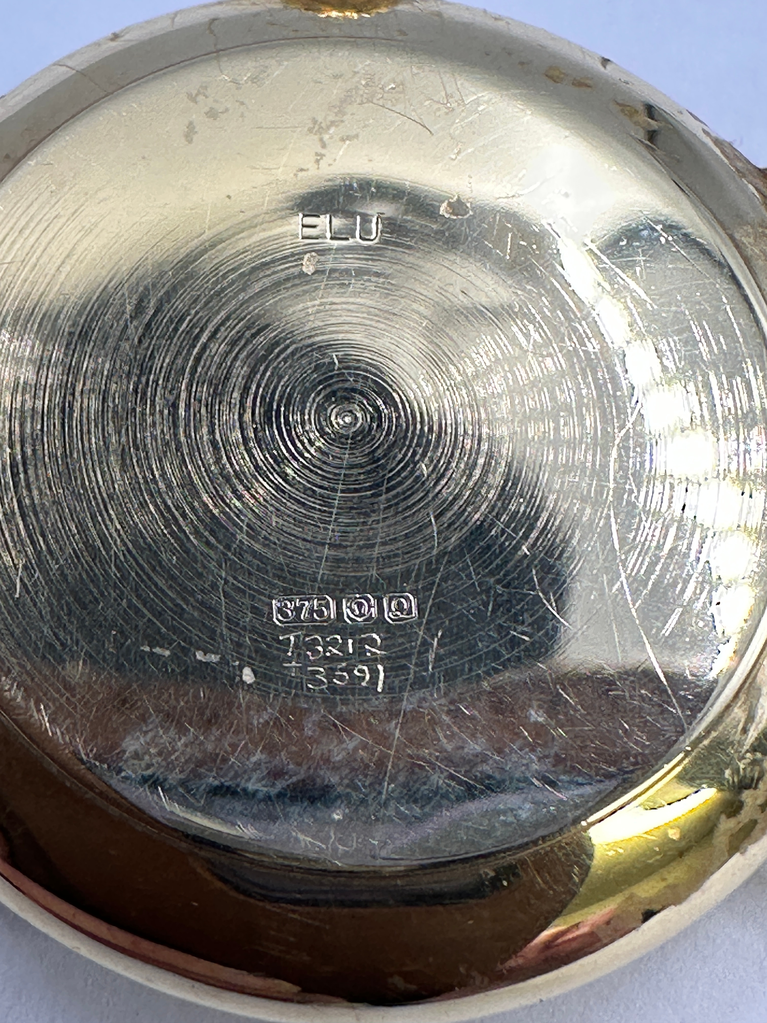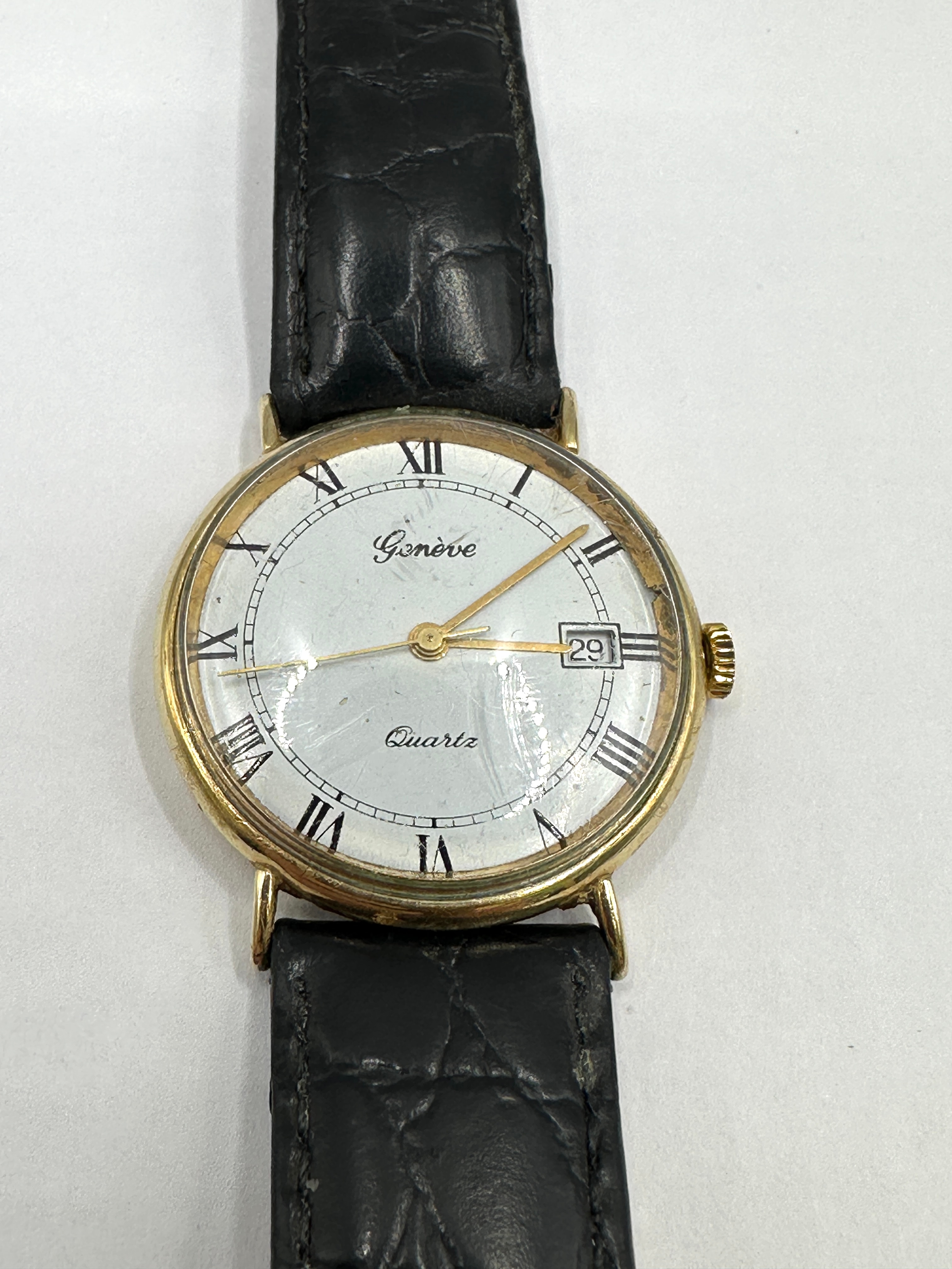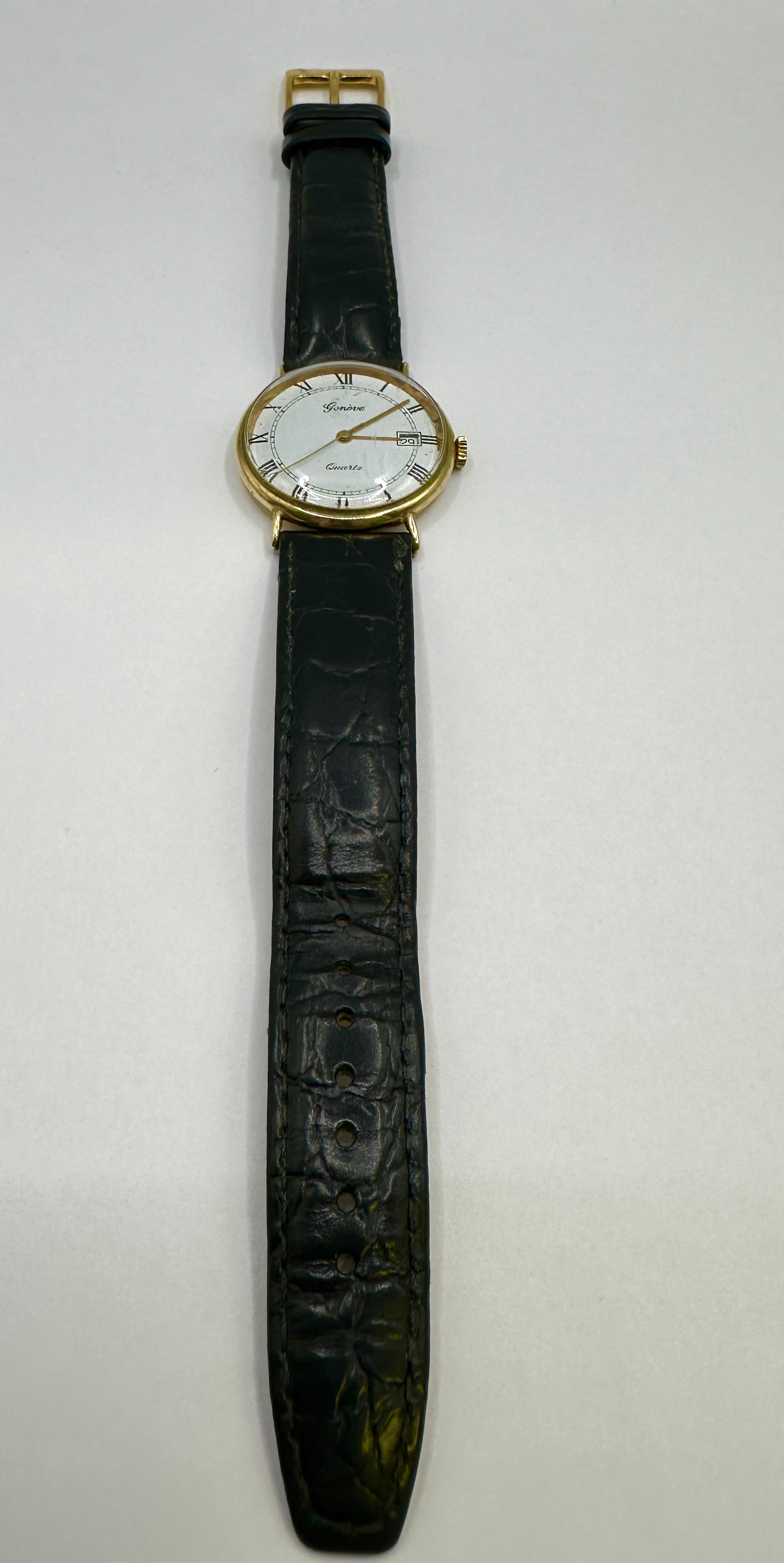 A 9k gold wristwatch with a round case and a white dial featuring black Roman numeral hour markers, gold-tone dauphine hands, and a date aperture at 3 o’clock. The dial is marked “Genève” and “Quartz.” It is fitted with a black textured leather strap with a matching gold-tone buckle. The polished 9k gold case back is marked “ELU,” “375,” along with several small hallmarks, and the numbers “13212” and “3591.”