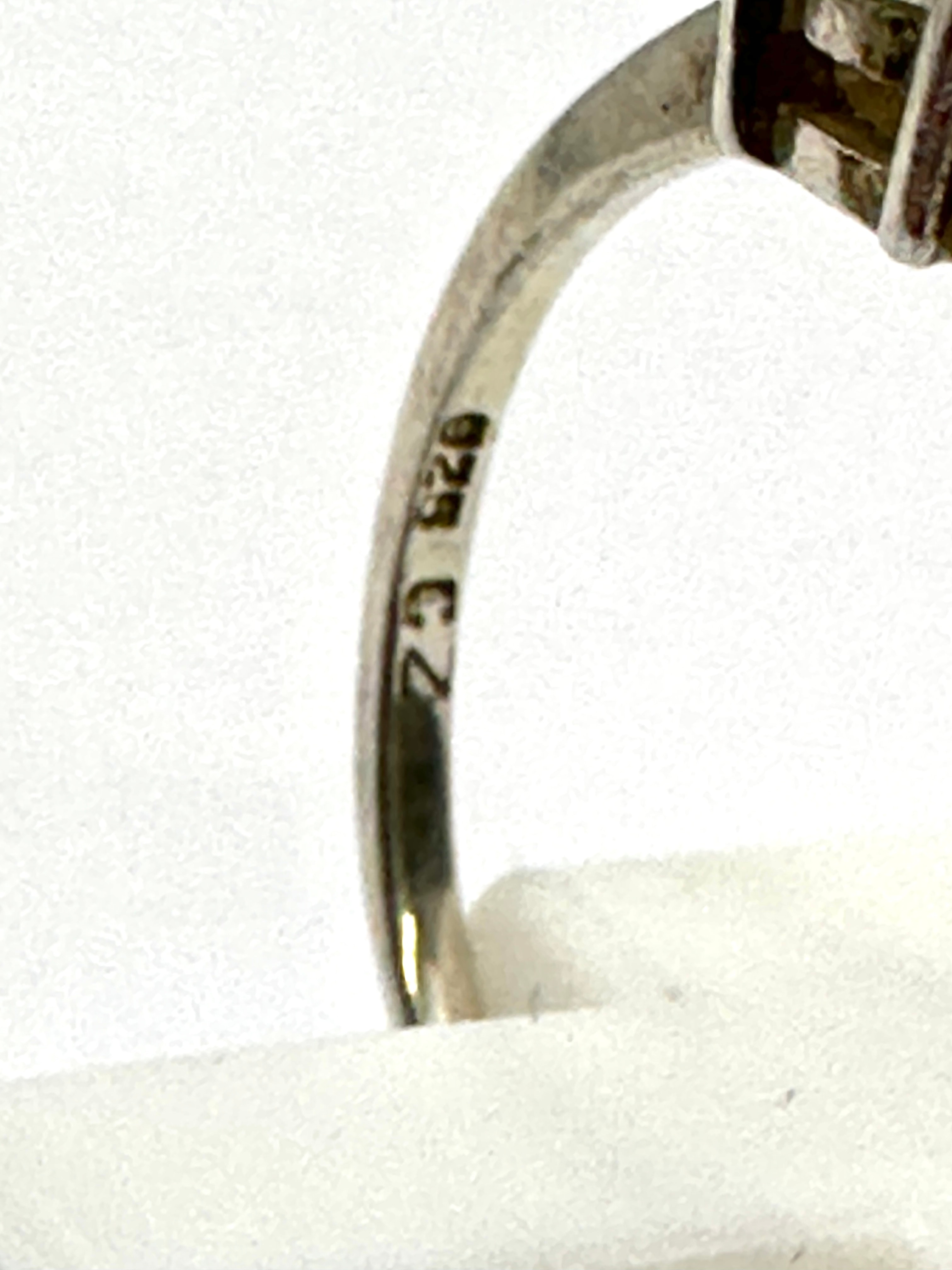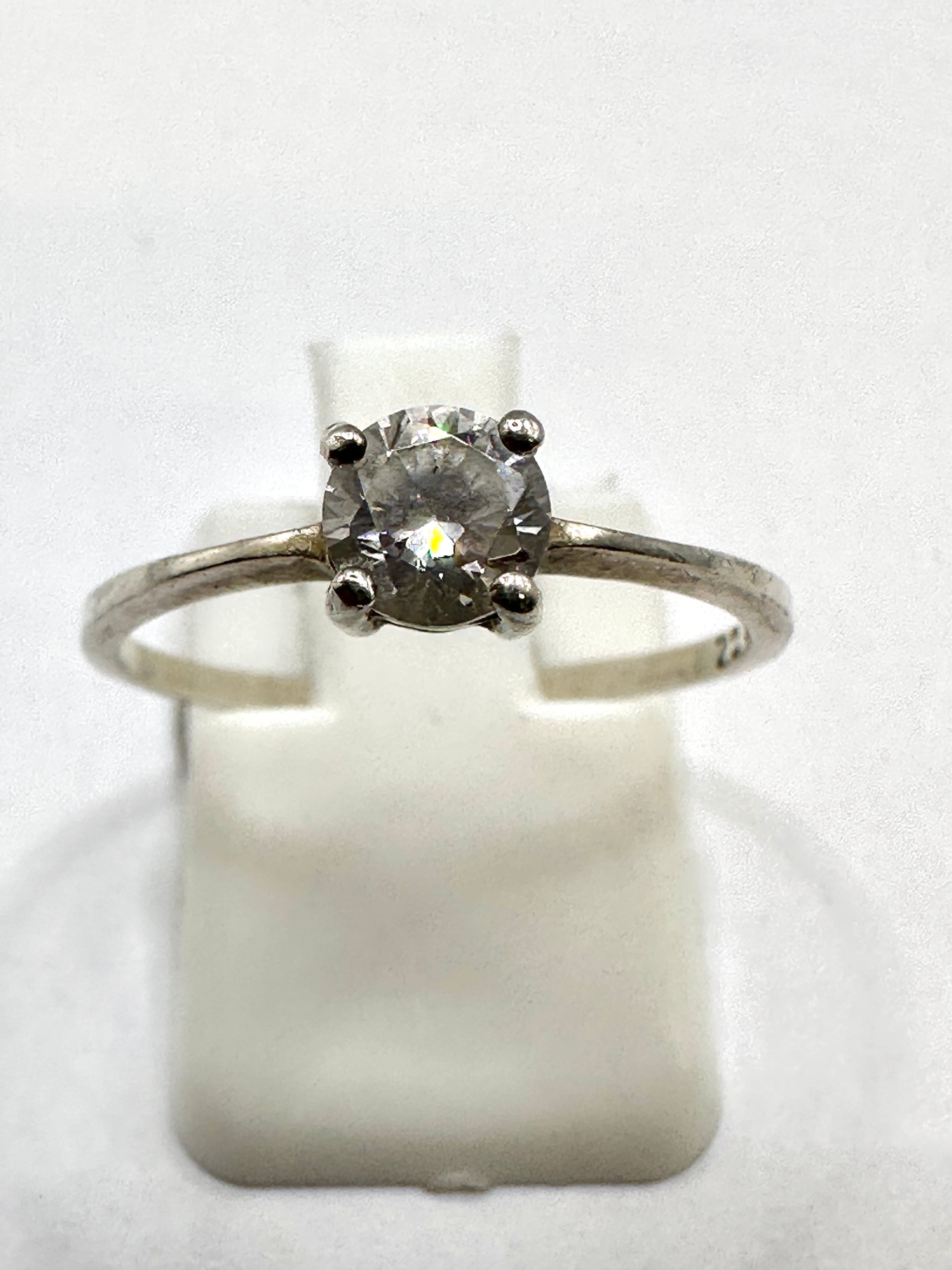 A vintage solitaire style finger ring crafted from 925 silver, featuring a single round faceted clear cubic zirconia stone. The stone is securely set with four prongs on a slender, smooth band. Hallmarks “925 CZ” are visible on the interior of the band.