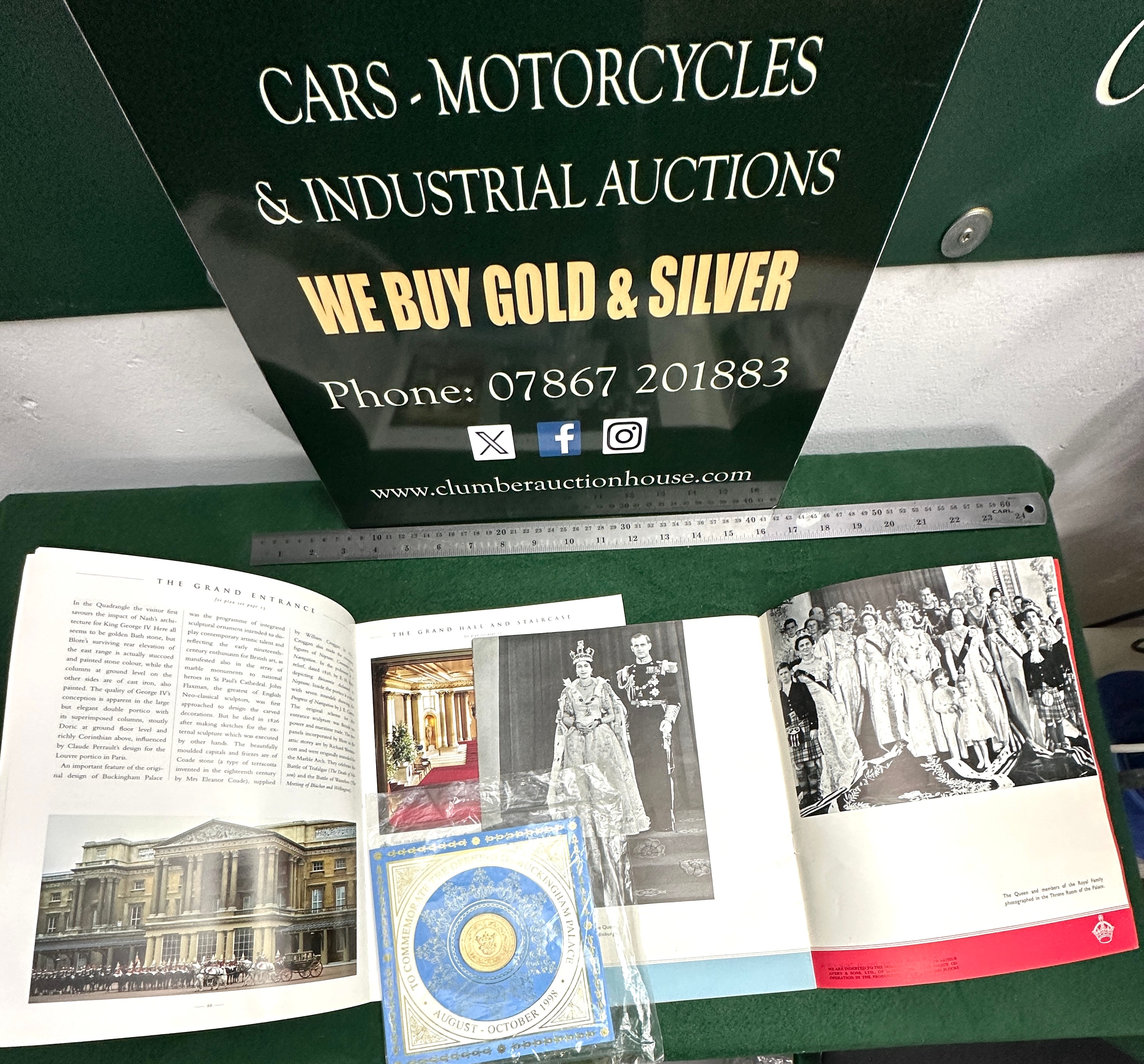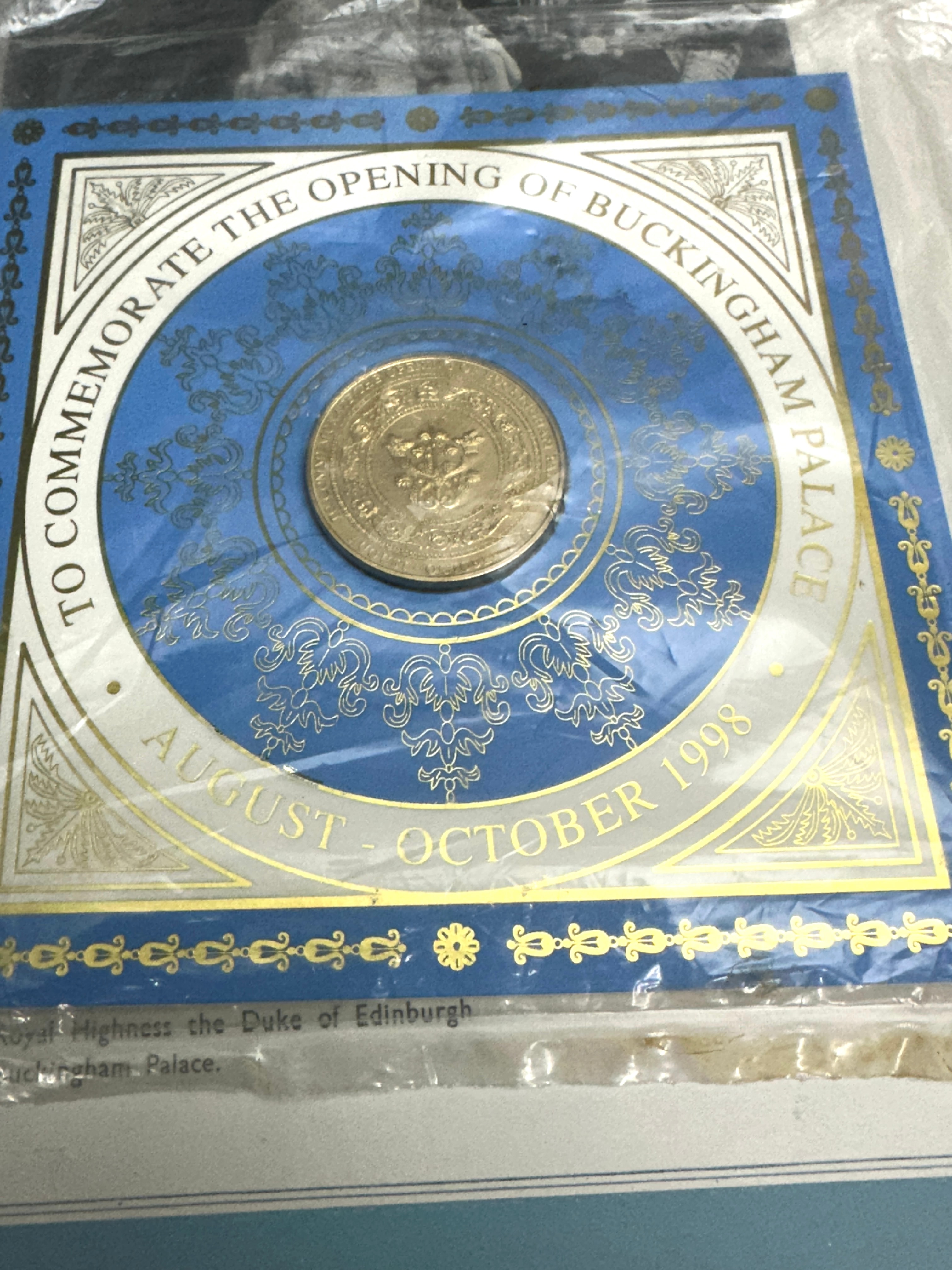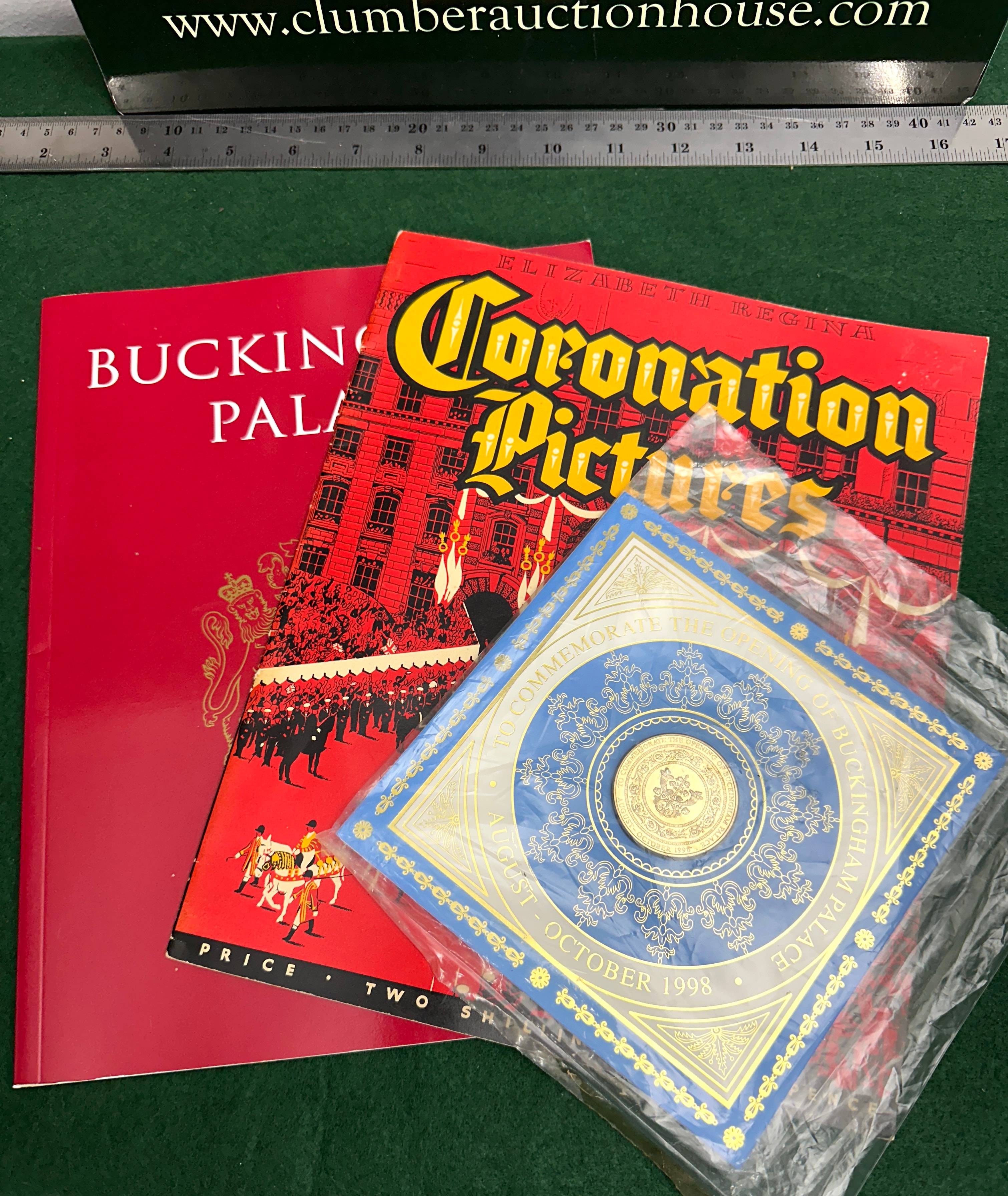 This lot comprises three items related to British royalty. The collection includes a ‘Medallion To Commemorate The Opening Of BUCKINGHAM PALACE AUGUST – OCTOBER 1998’, as identified in web research, featuring an embossed royal design. This gold-colored, circular metallic object is presented in its original blue and gold commemorative card packaging, sealed in clear plastic, and mentions “Royal Highness the Duke of Edinburgh.” Also included is a smaller red softcover booklet titled ‘ELIZABETH REGINA Coronation Pictures’, consistent with ‘The Book Of The Coronation By Francis Hunt & Alan Lindsay’ found in web research. The third item is a large red hardcover book titled ‘BUCKINGHAM PALACE’, featuring a gold crest and ‘PRICE • TWO S’ on the cover.