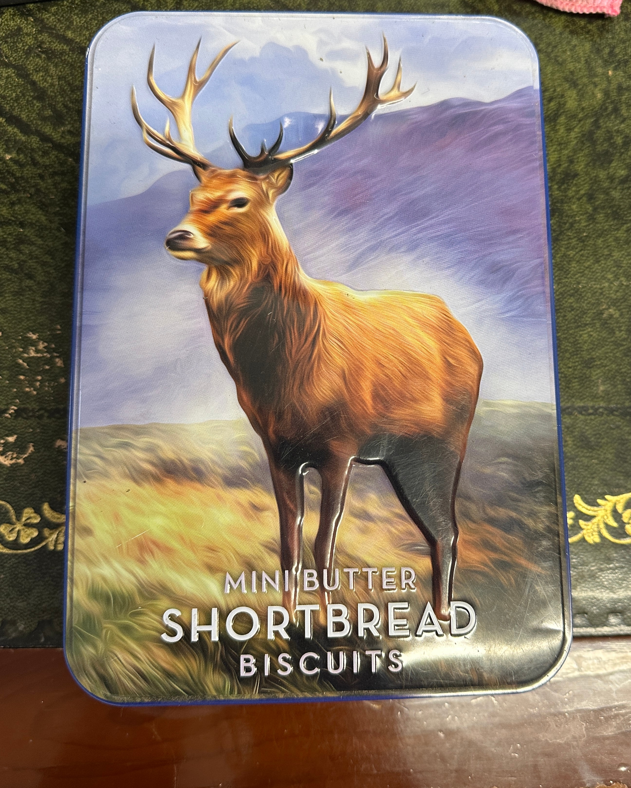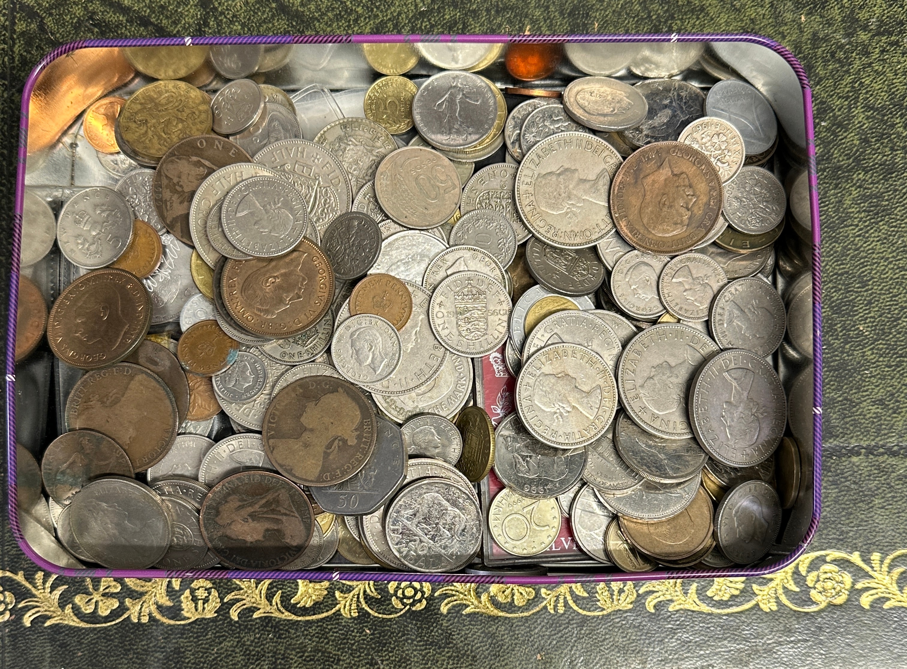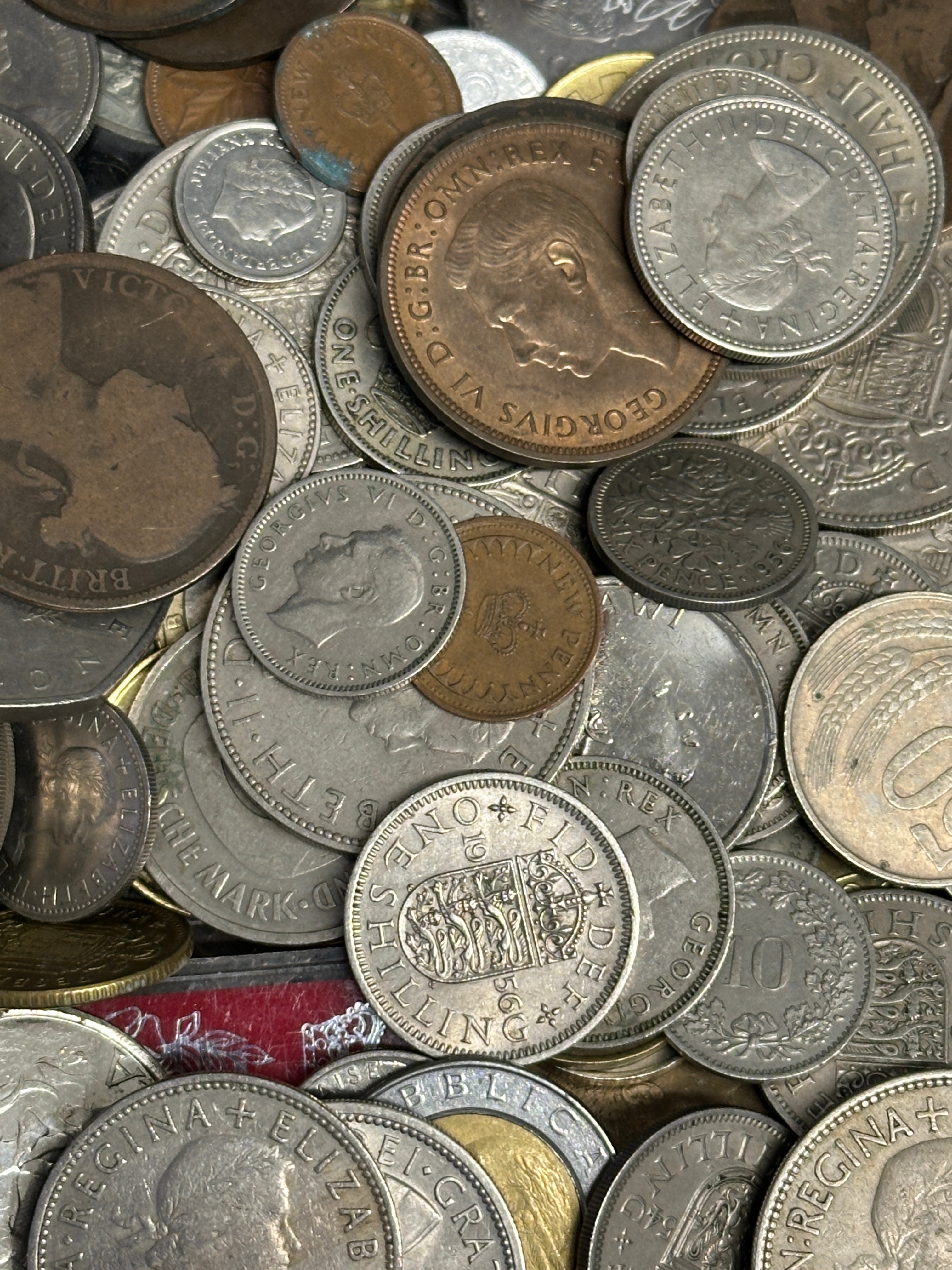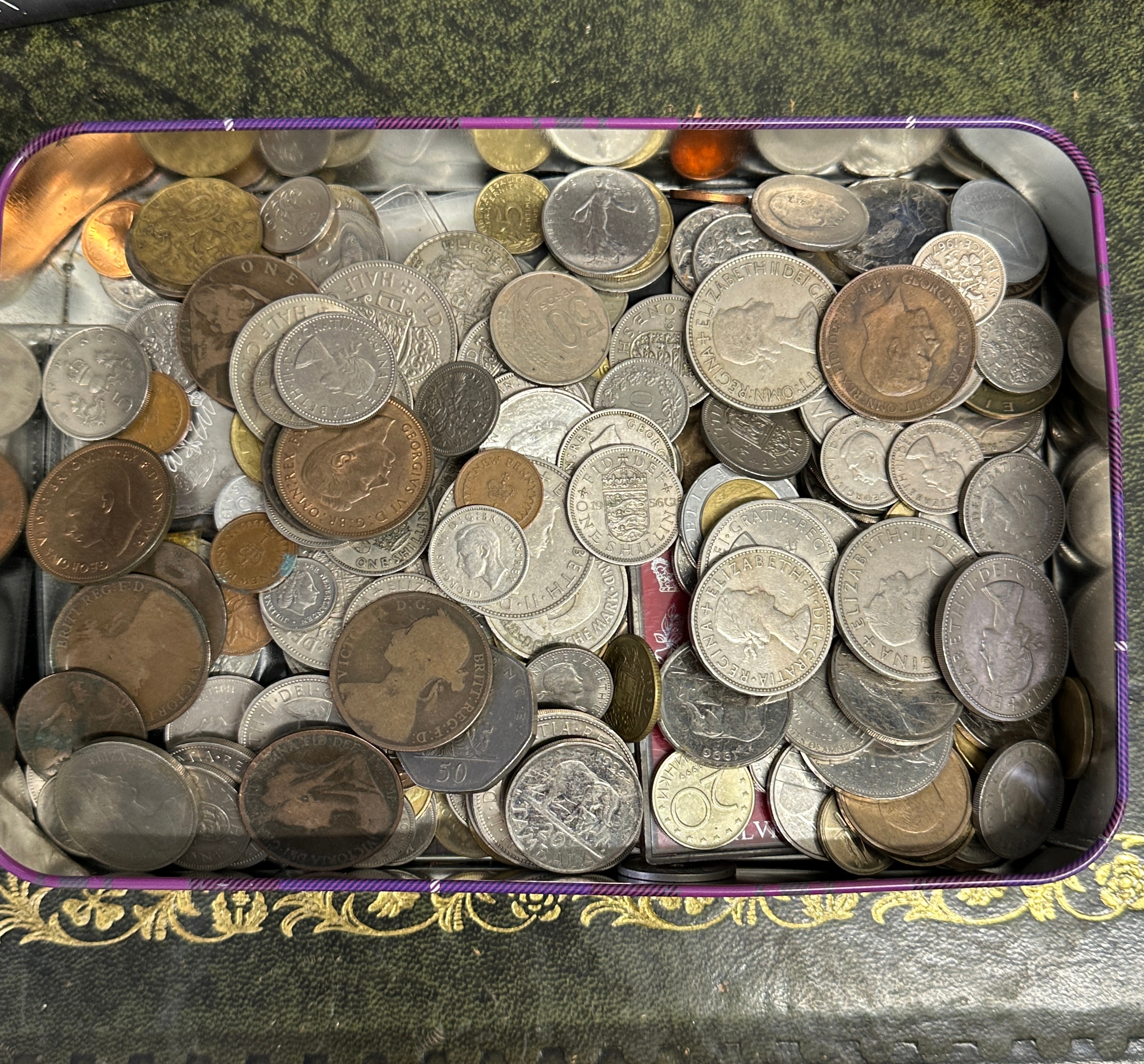 A collection of mixed world coins, primarily comprising circulated British and Commonwealth coinage from the mid-20th century. The assortment includes various monarchs such as George V, George VI (identifiable by the Latin inscription “GEORGIUS VI D: G: BRITT: OMN: REX F: D: IND: IMP.”), and Elizabeth II. Visible denominations include “ONE SHILLING” (dated 1953), “50”, and “10”, among others. The coins exhibit mixed metallic compositions, including copper, bronze, brass, and various silver-colored alloys. The collection is housed within a rectangular metal tin, originally for “MINI BUTTER SHORTBREAD BISCUITS,” featuring a lid depicting a stag in a landscape.