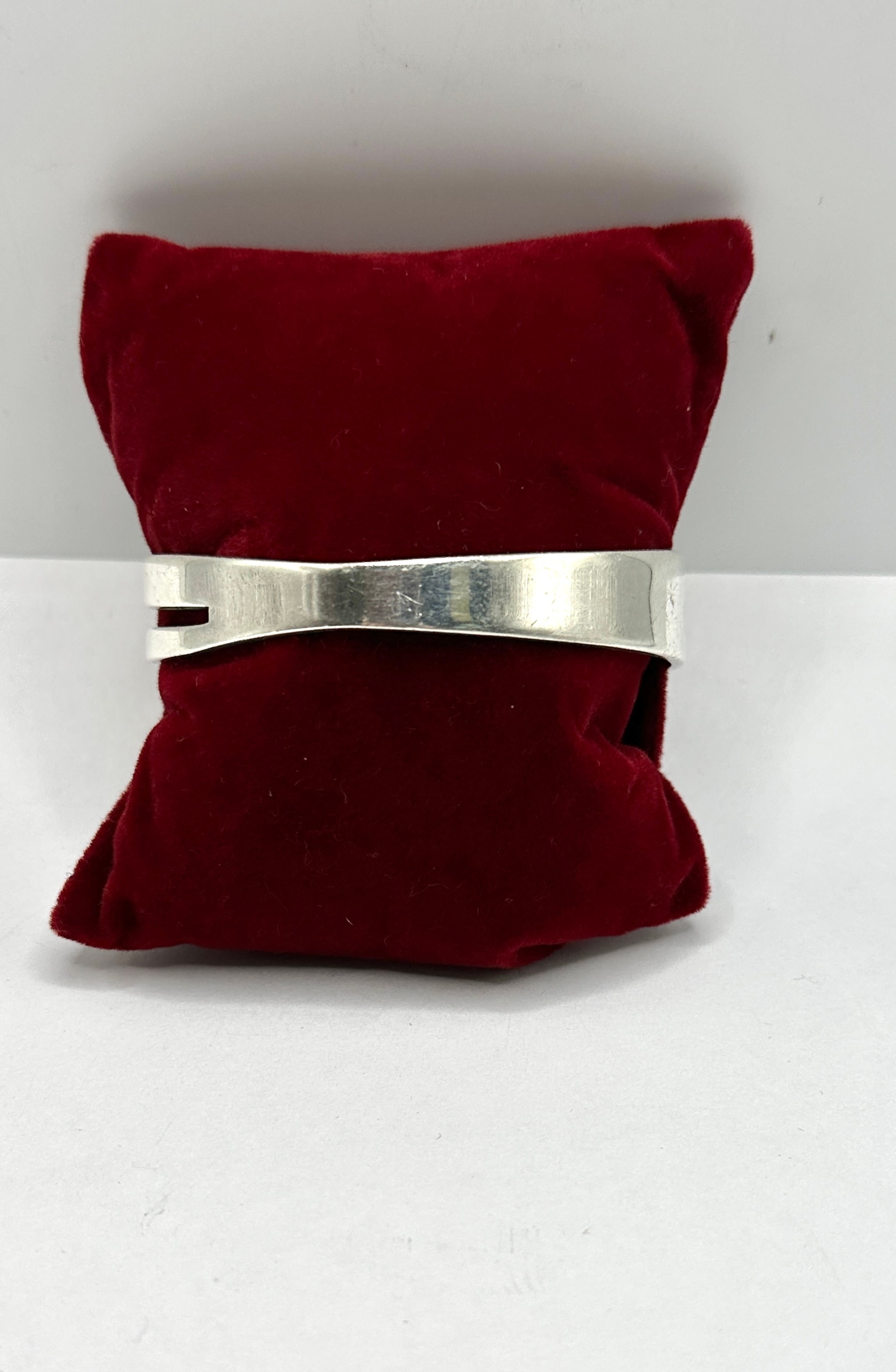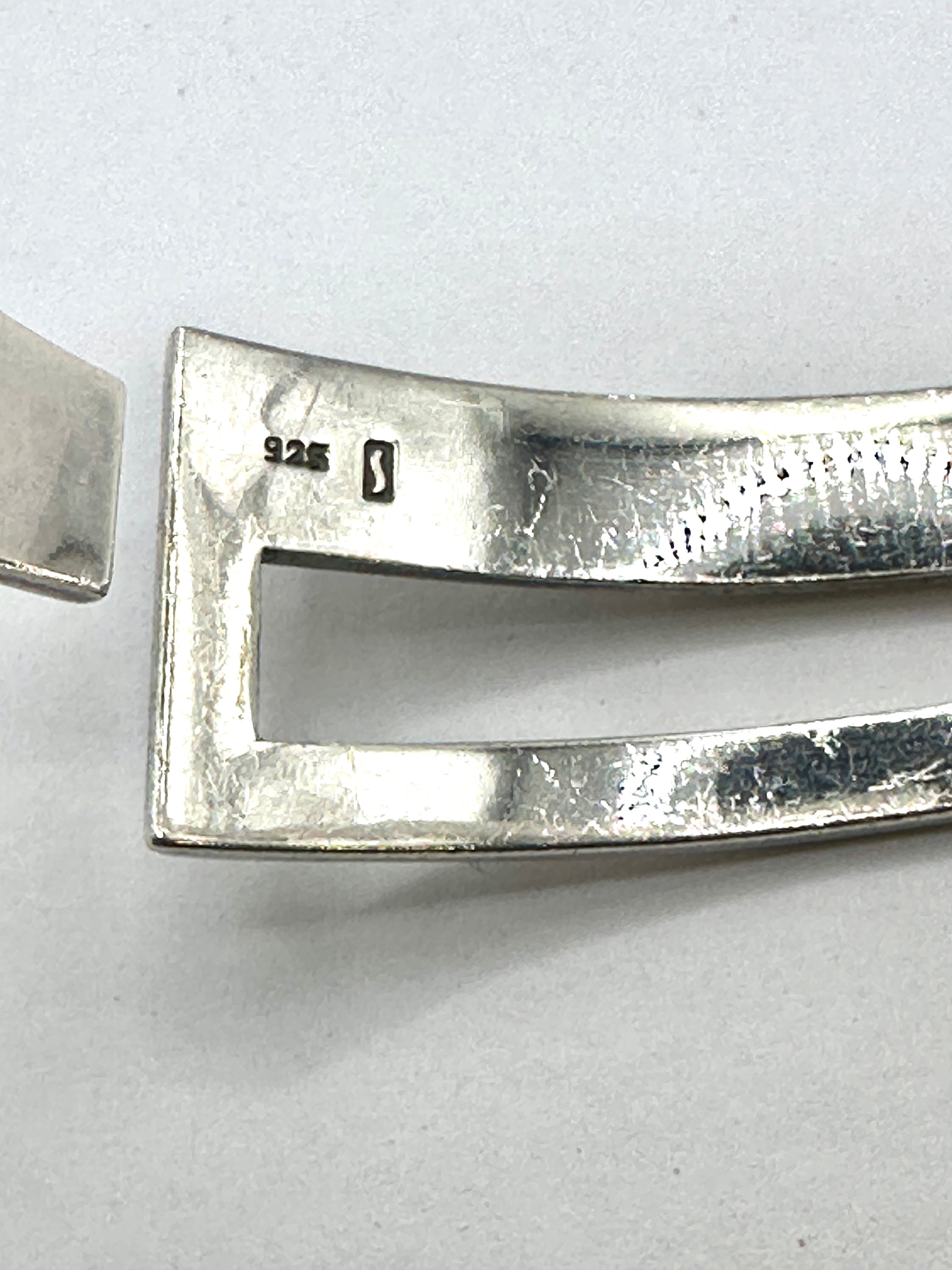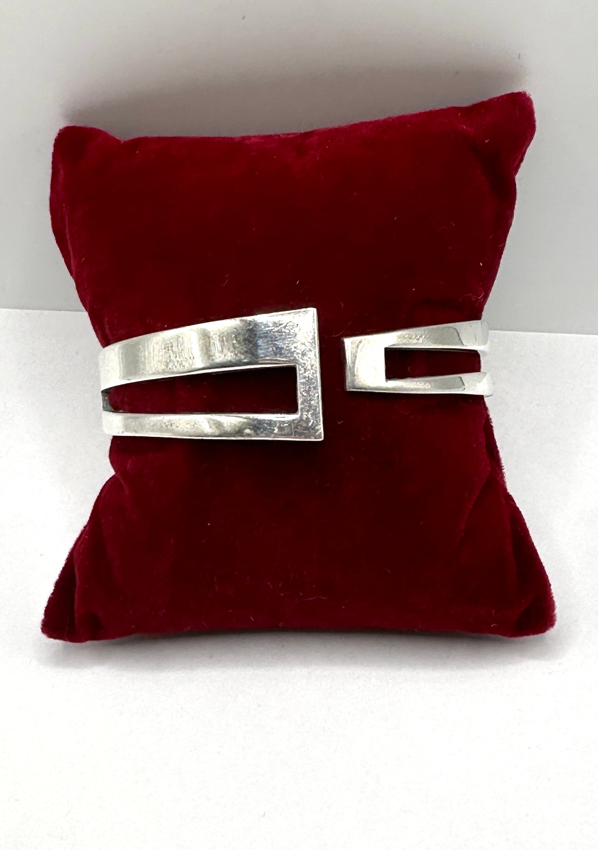 An open cuff bracelet crafted from sterling silver, characterized by a minimalist and modernist geometric design with a prominent rectangular cut-out detail at the front. The interior of the cuff bears a “925” stamp, indicating sterling silver, alongside a maker’s mark appearing as a stylized ‘J’ within a square outline.