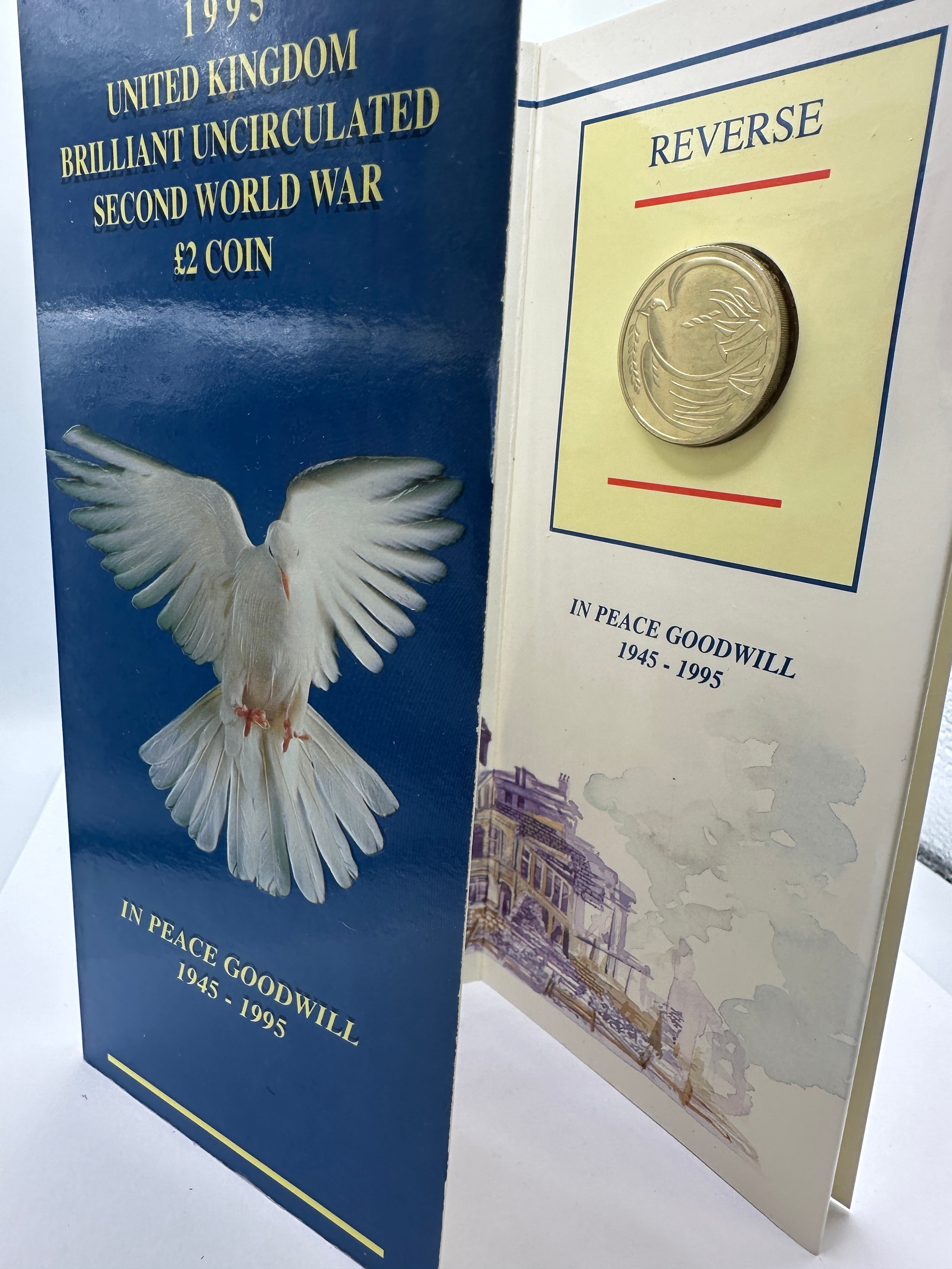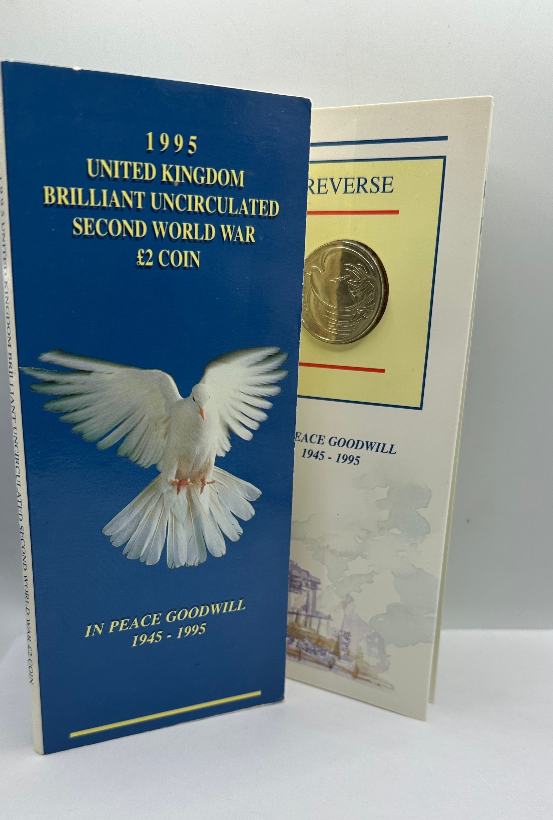 A 1995 Royal Mint UK Brilliant Uncirculated Second World War 50th Anniversary Dove of Peace £2 Coin, presented in its original bi-fold cardstock folder. The blue front cover of the folder features a white dove and the inscription “IN PEACE GOODWILL 1945 – 1995”, marking it as a “Second World War” commemorative issue. The inside right page of the folder displays the bi-metallic £2 coin, which depicts a dove with outstretched wings, and repeats the “IN PEACE GOODWILL 1945 – 1995” inscription.