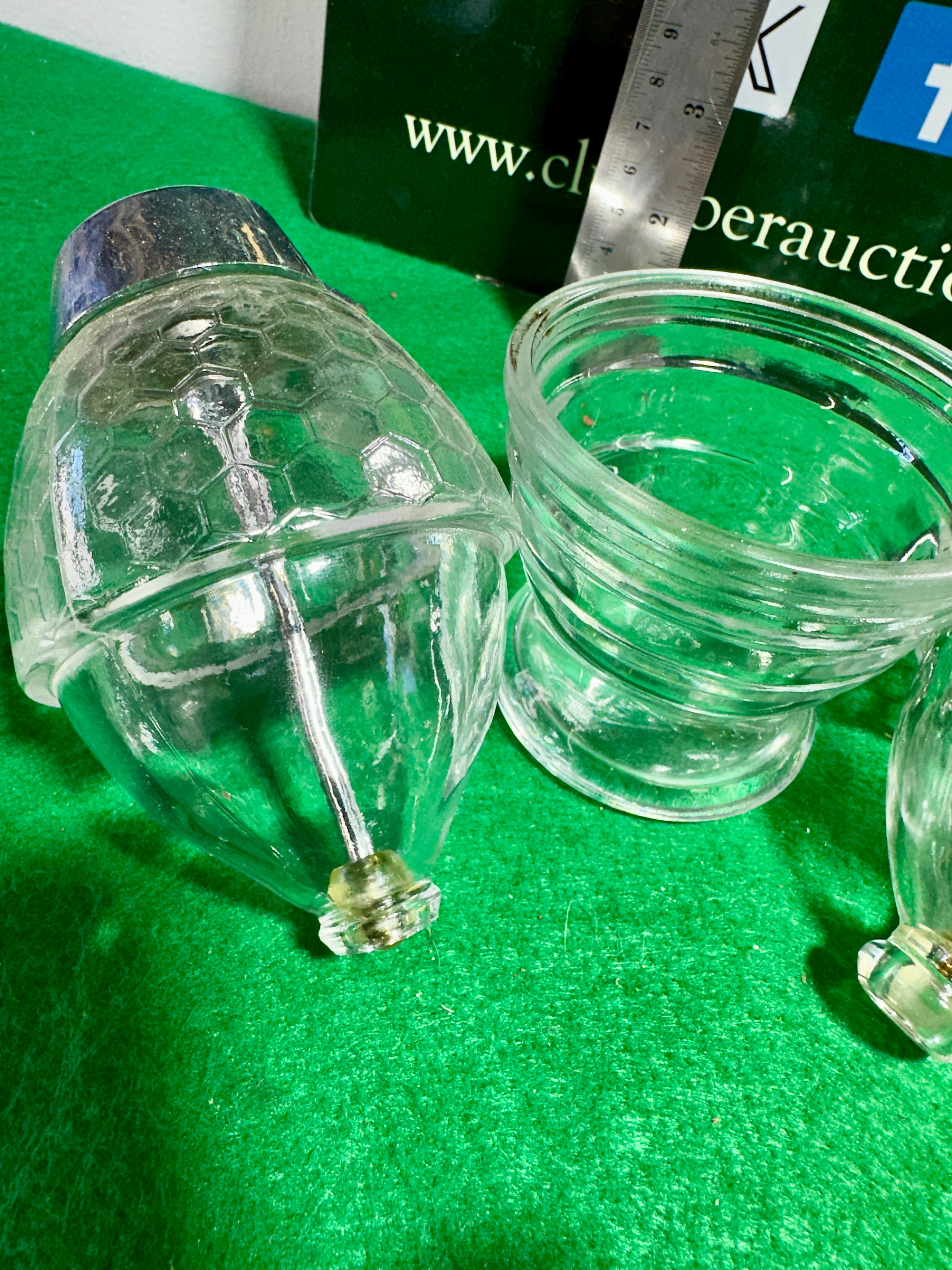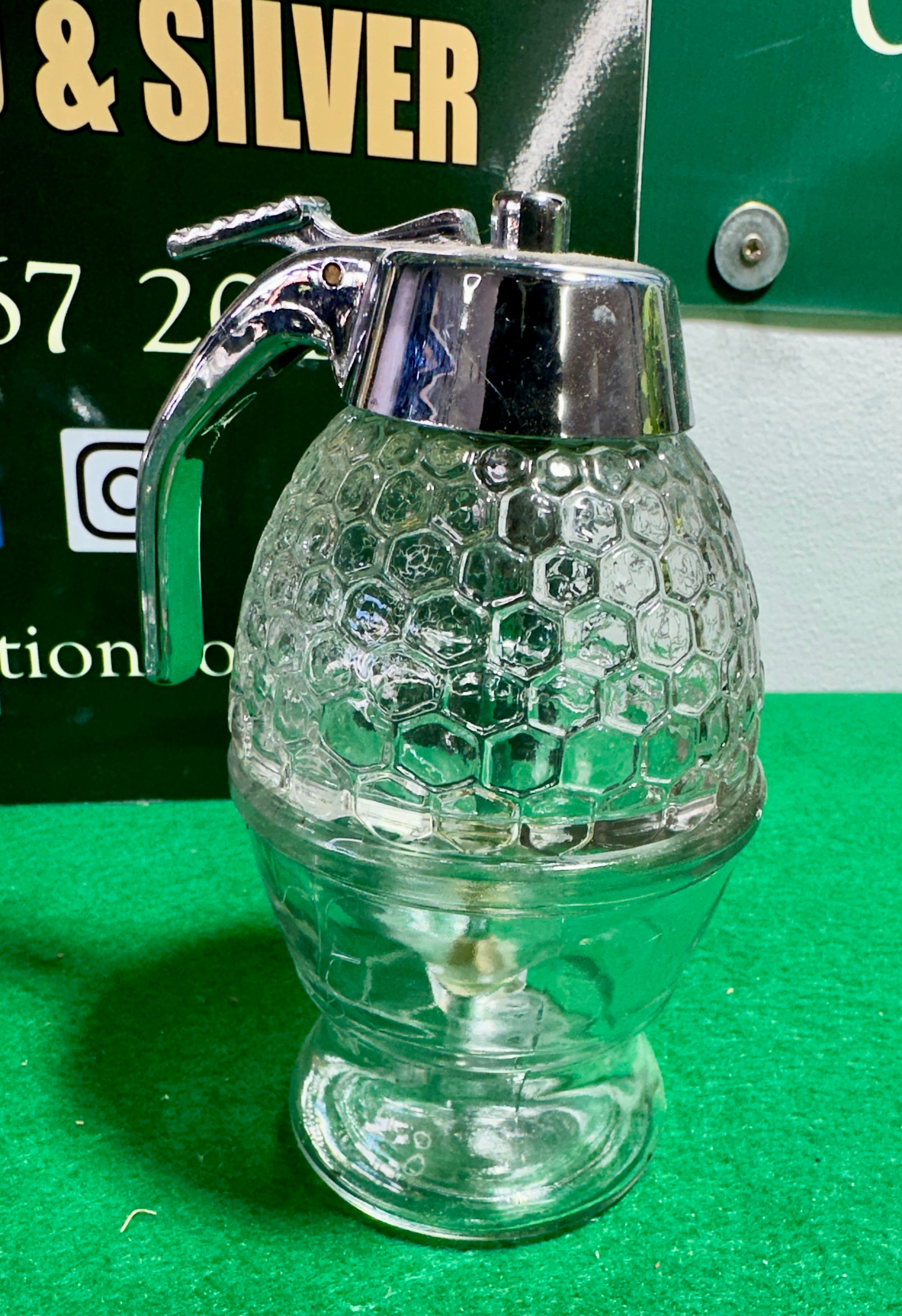 This group comprises two clear glass honey or syrup dispensers, each featuring a squat, ovular glass body adorned with a raised honeycomb pattern on its upper half, tapering to a smooth, footed base. They are fitted with chrome-plated metal top mechanisms incorporating a lever-operated pouring spout and an internal stopper rod. Also included are two additional matching clear glass bases.