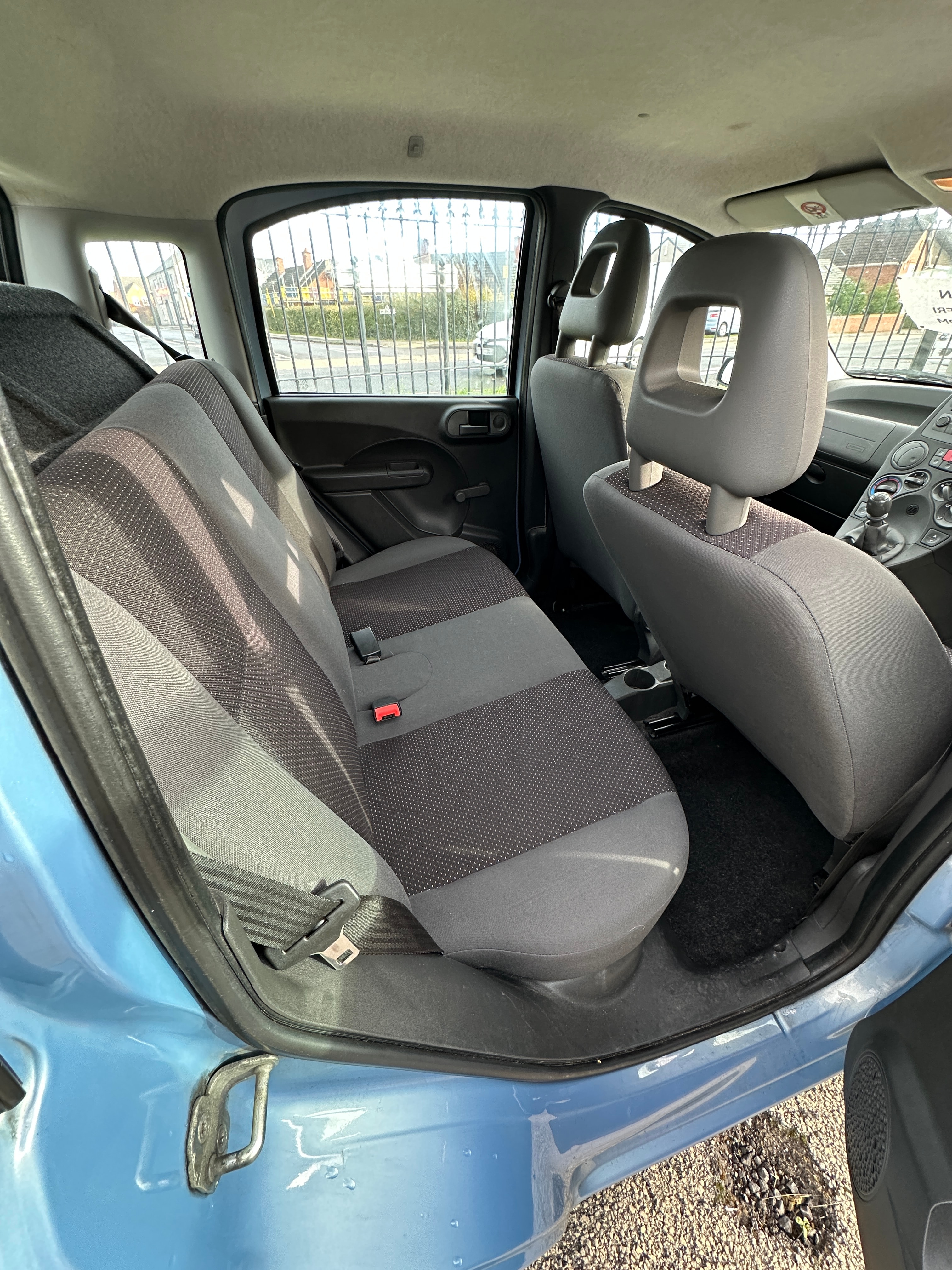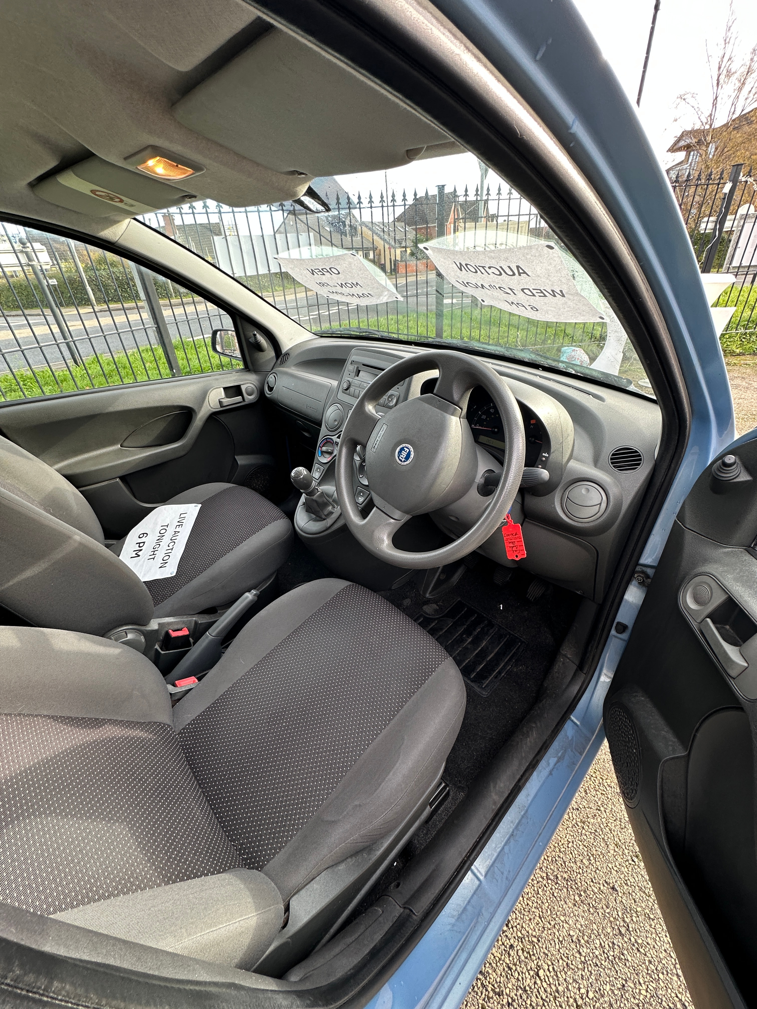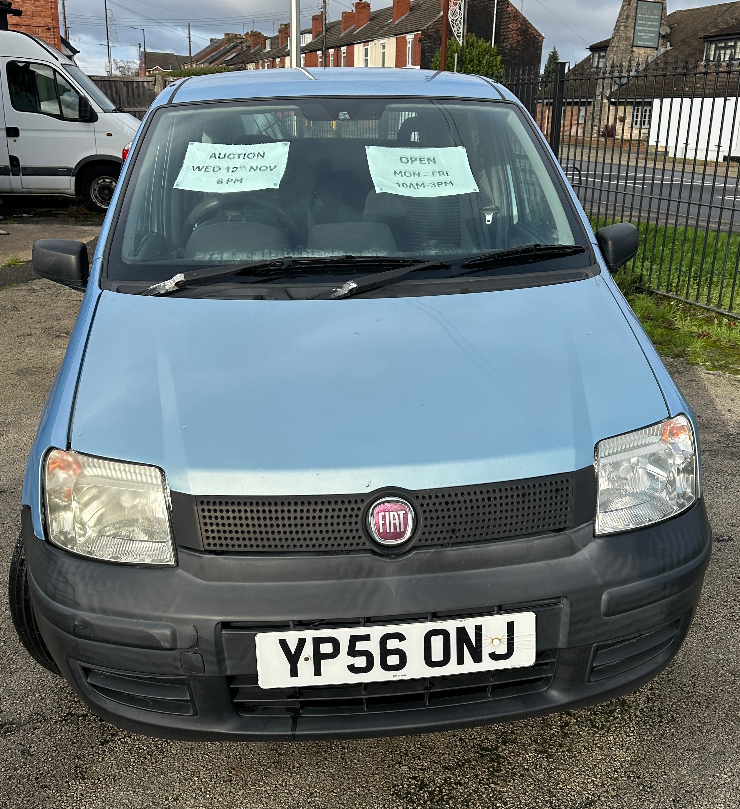 A 2006 Fiat Panda second-generation compact five-door city car, finished in light blue. This vehicle features a UK license plate ‘YP56 ONJ’ and prominent ‘FIAT’ and ‘Panda’ badging. Constructed primarily from painted metal, plastic, and glass, the car has a grey fabric interior. The odometer displays 54,808 total miles. Visible signage taped to the windscreen indicates an ‘AUCTION WED 15TH NOV 6 PM’ and ‘OPEN MON – FRI 10AM – 3PM’.