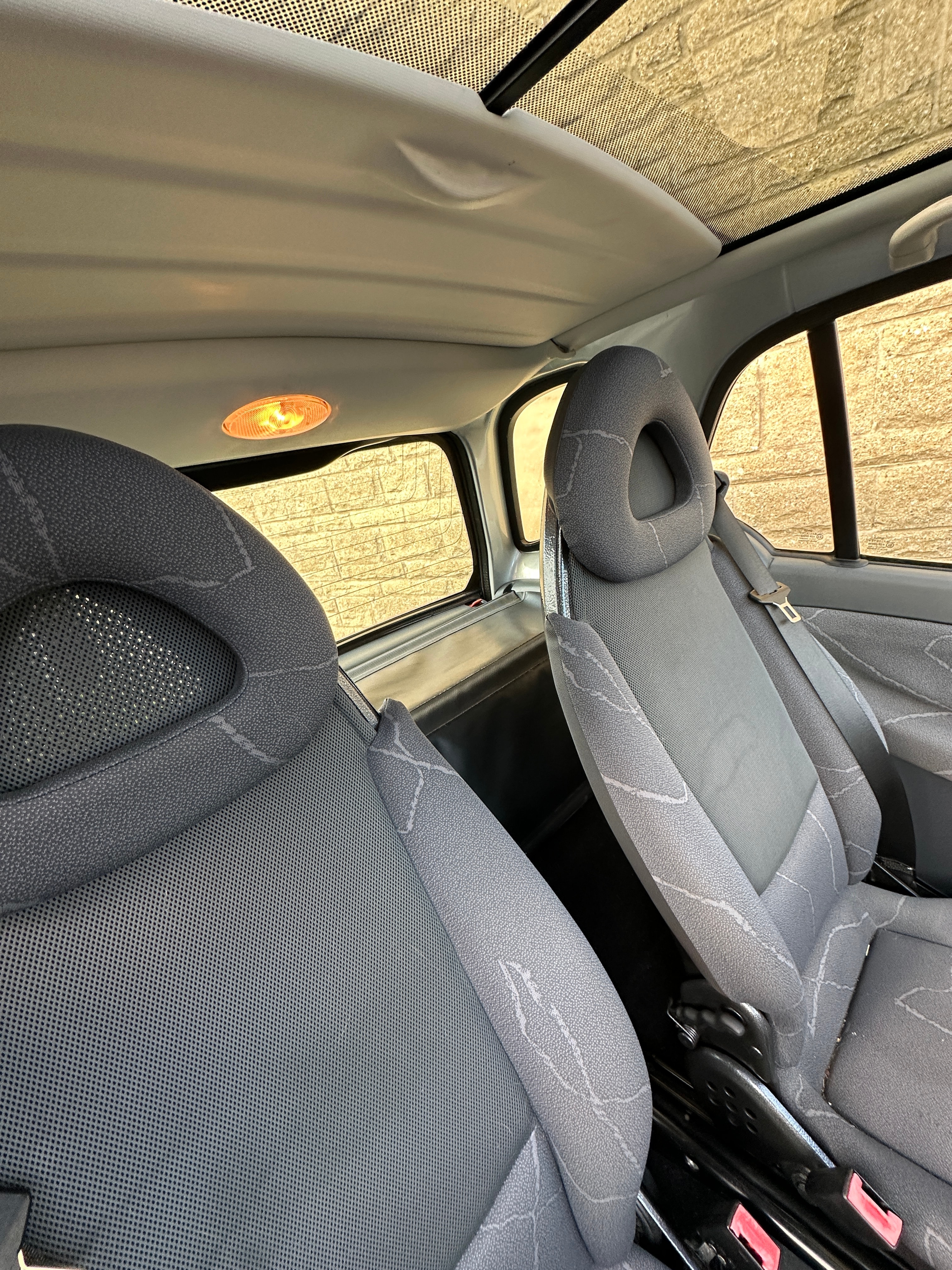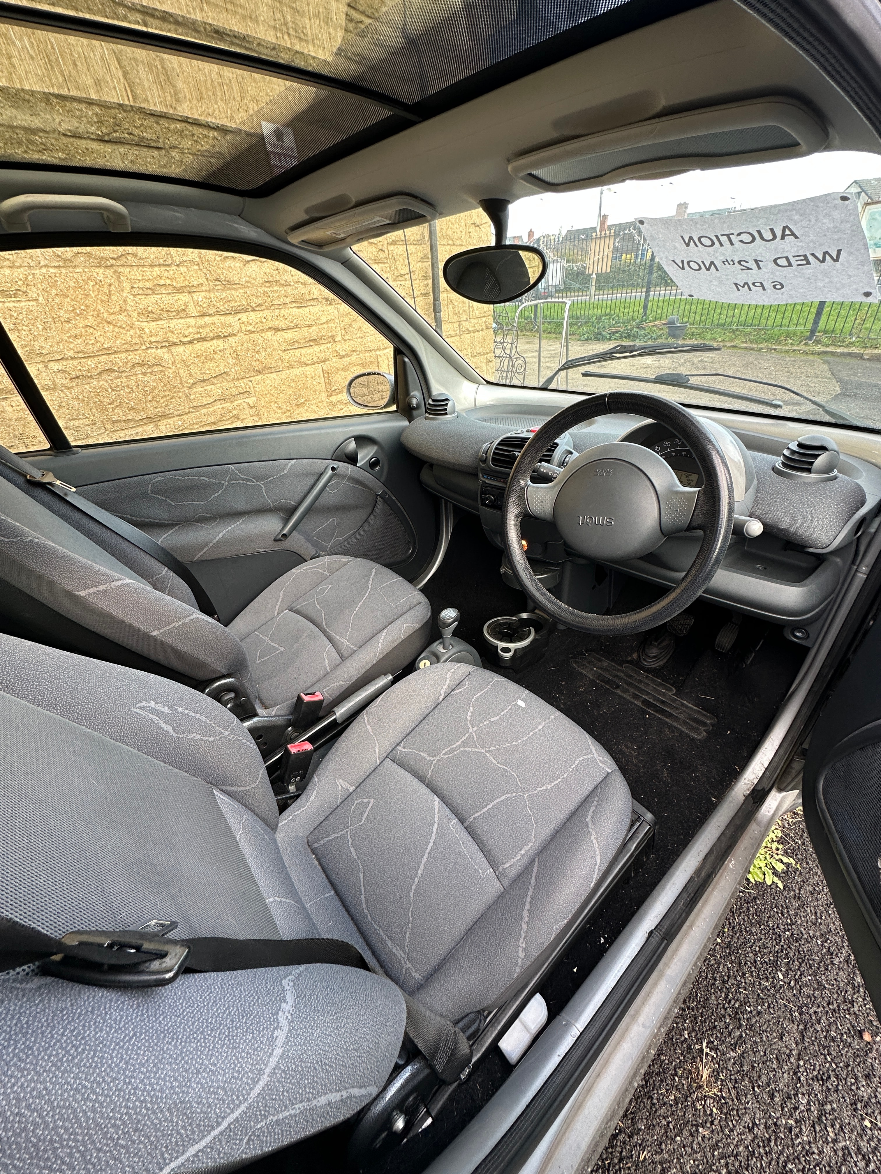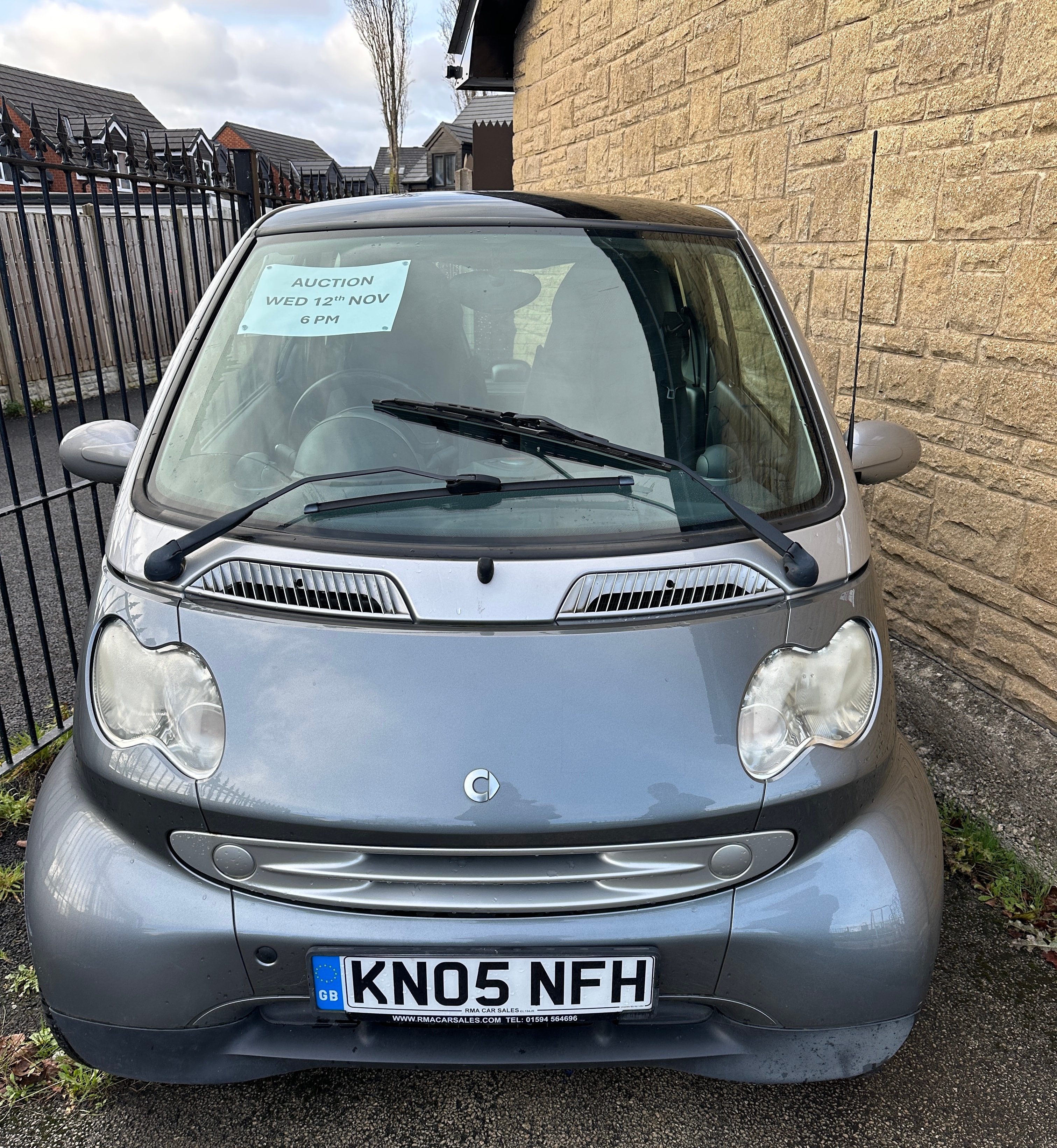 A 2005 Smart Fortwo Coupe, identified as a Mk1 W450 Facelift model (2002-2006 range), finished in grey with a black panoramic glass roof. This two-door compact city car features a UK license plate ‘GB KN05 NFH’. The interior is fitted with grey fabric seats displaying a subtle patterned design, complemented by a black plastic dashboard. The digital odometer displays 48,226 miles. The vehicle is a petrol model with an automatic transmission. A paper sign on the windshield reads “AUCTION WED 12TH NOV 6 PM”, and small text below the license plate indicates “WWW.RMACARSALES.COM TEL: 01304 884026”.