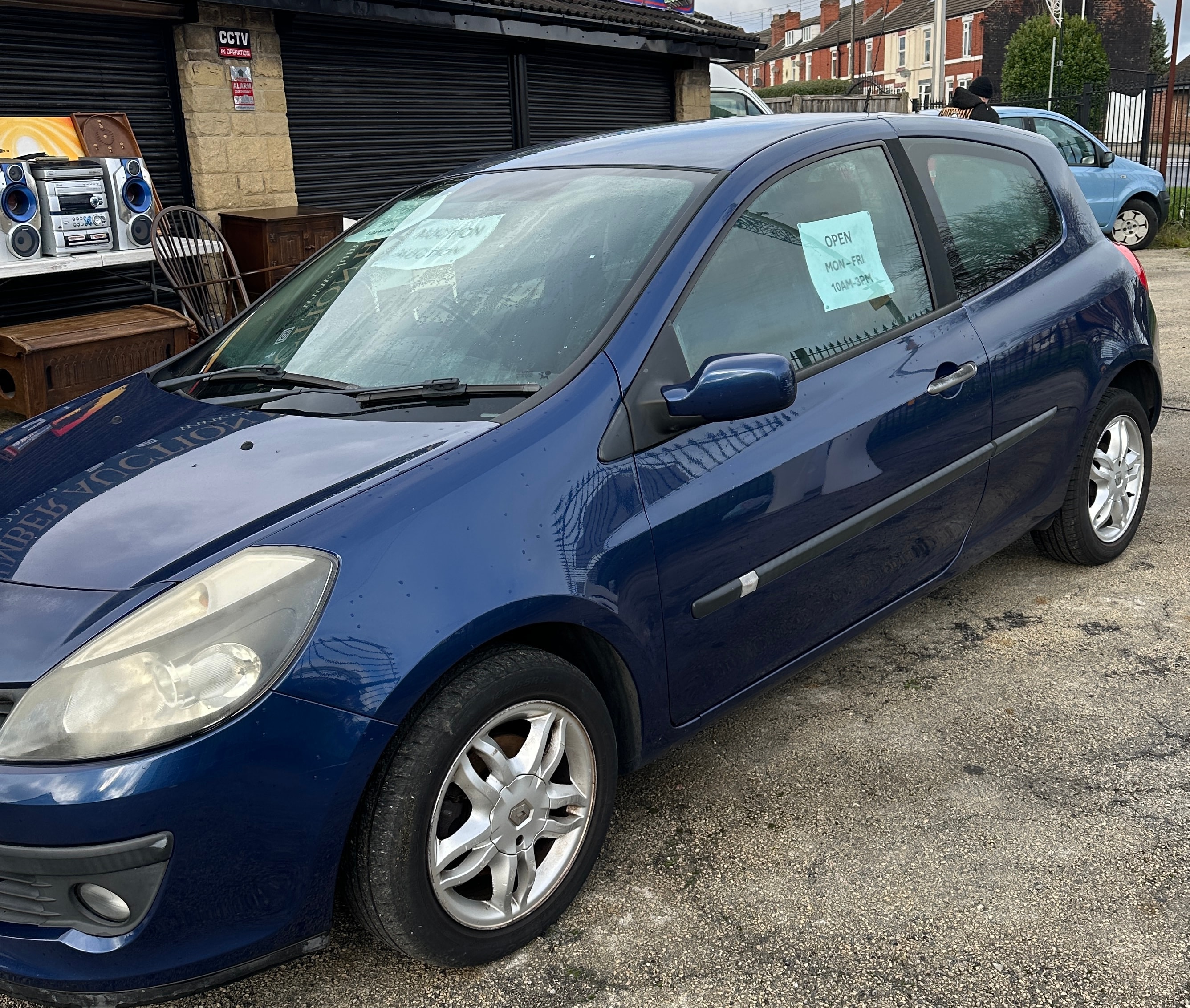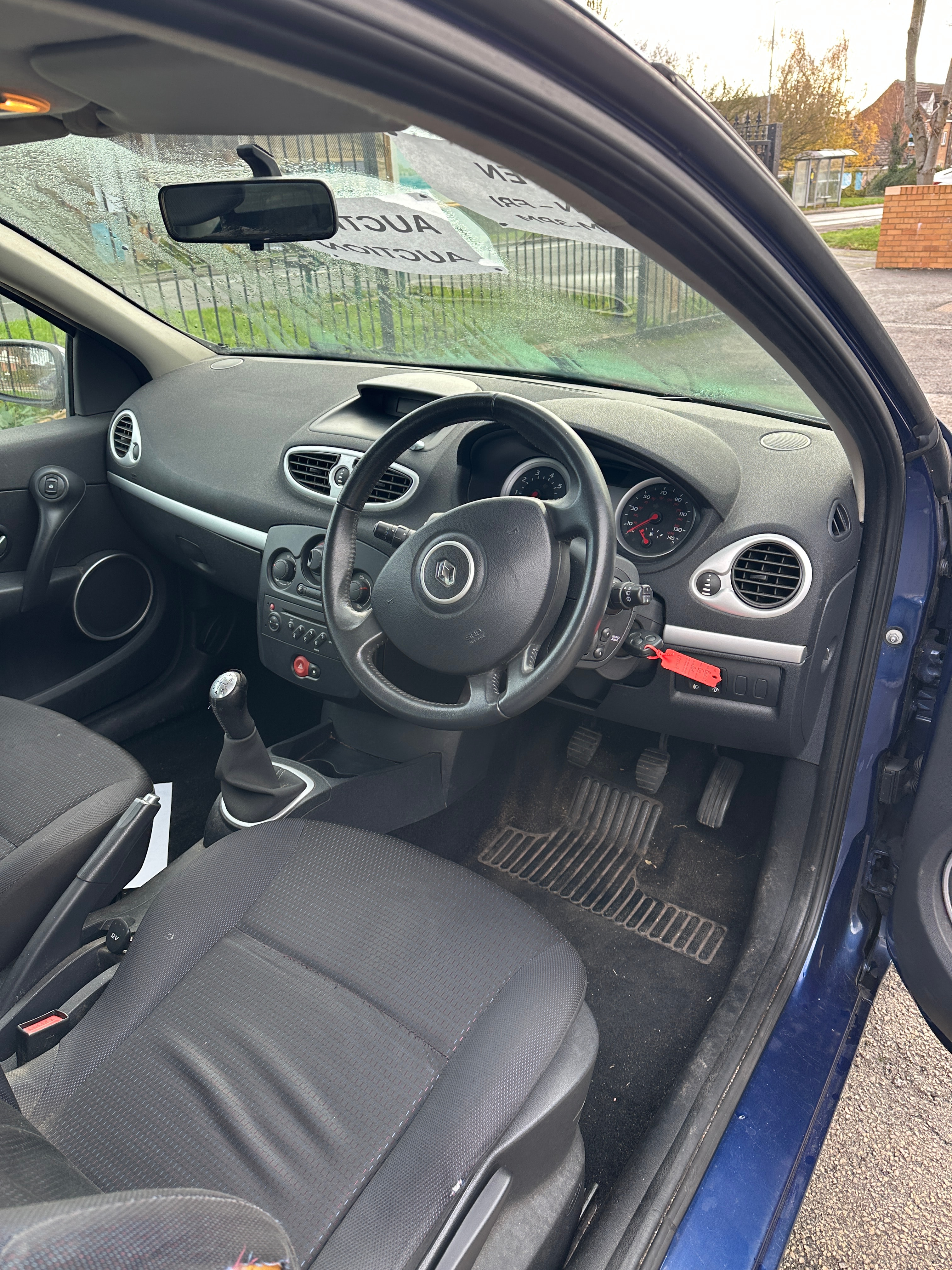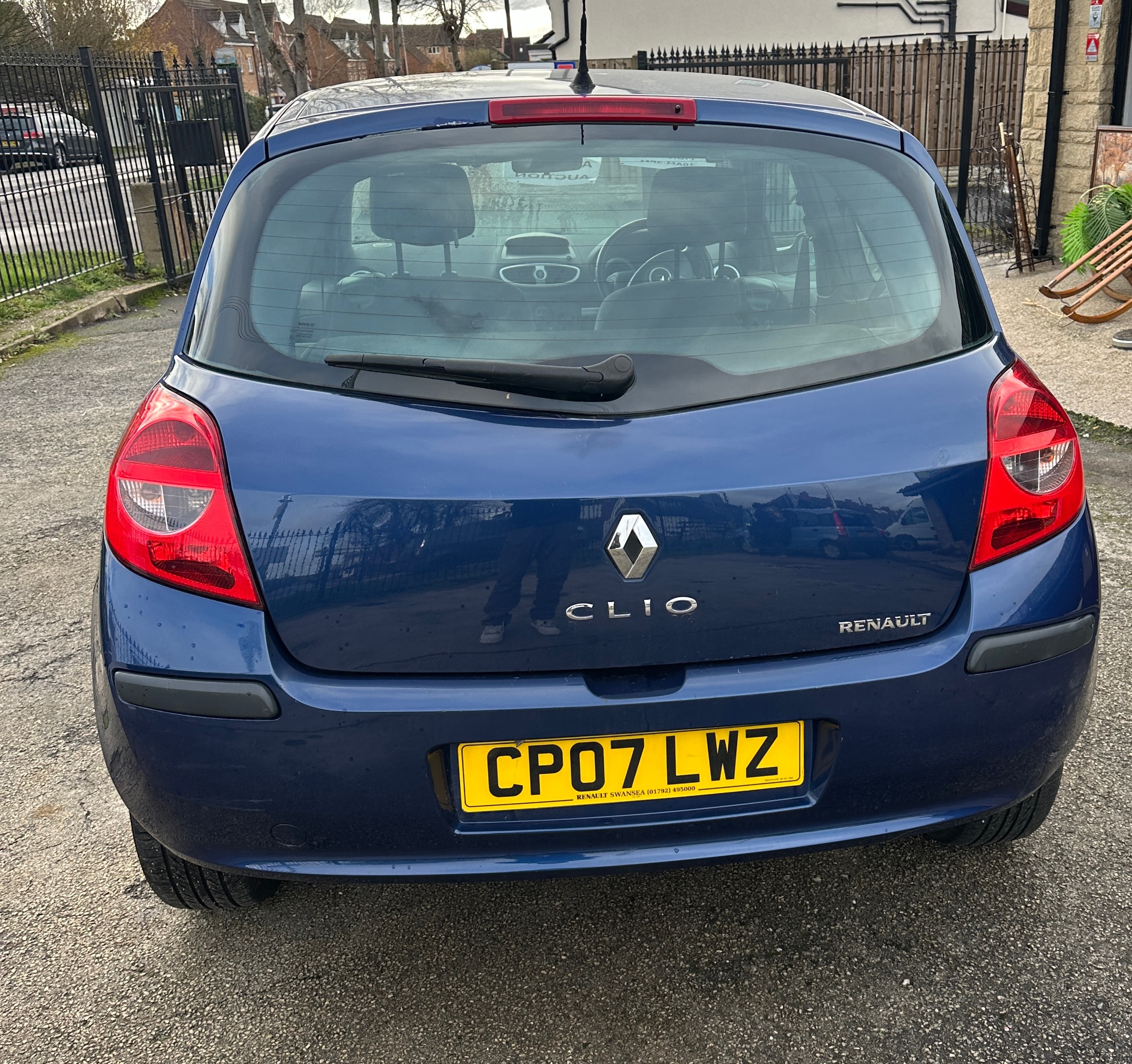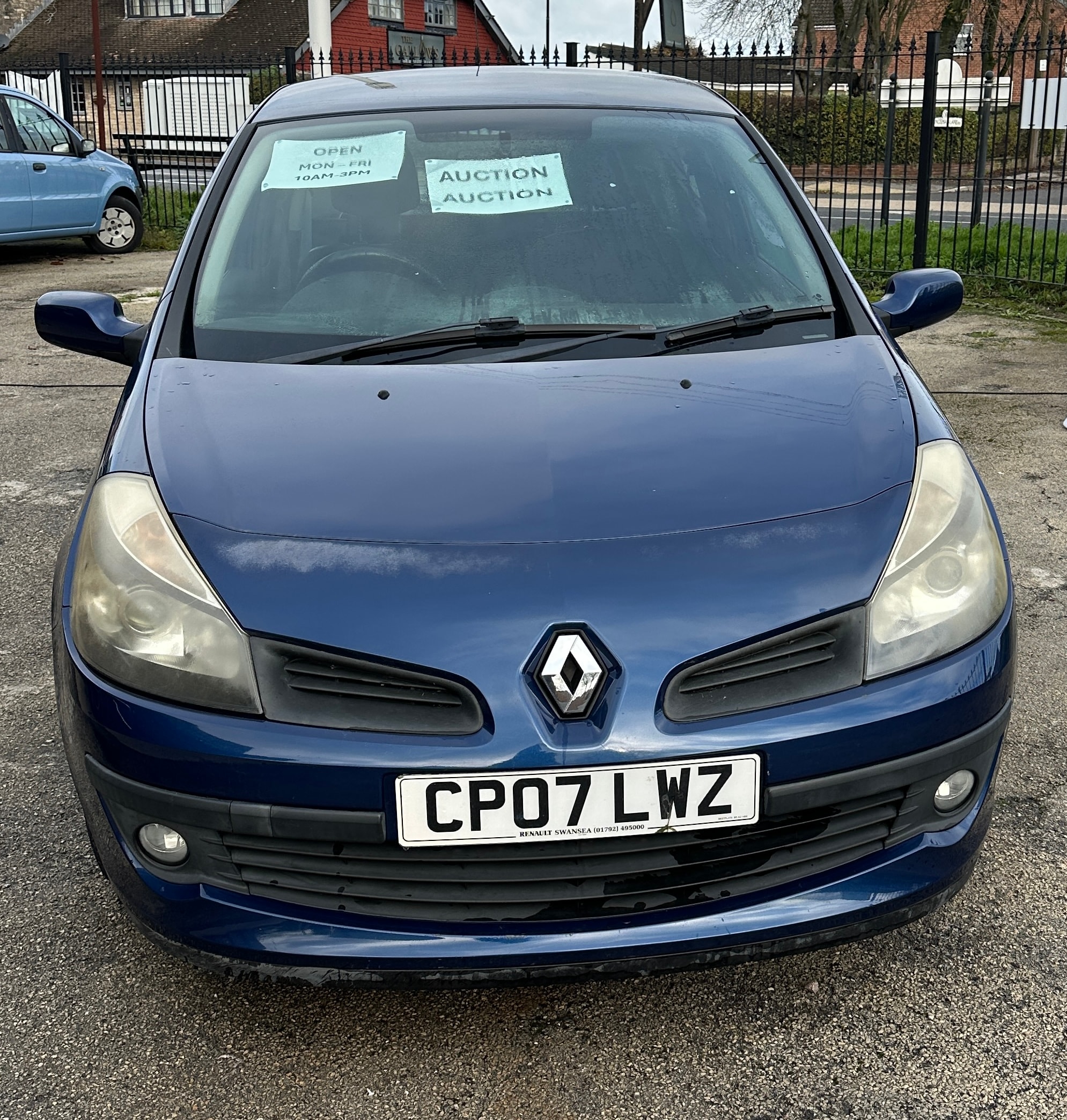 A 2007 Renault Clio 3-Door Hatchback, finished in a dark blue metallic paint. The vehicle features a painted metal body, plastic trim, and alloy wheels. “RENAULT” and “CLIO” badging are present on the rear, with the Renault diamond emblem on the front grille. It bears UK license plates, “CP07 LWZ”, with “RENAULT SWANSEA 01792 788000” on the rear plate surround. The interior is fitted with dark fabric seats and a manual transmission. The dashboard’s digital display shows a mileage of 101,375 miles and a trip reading of 630.5 miles.