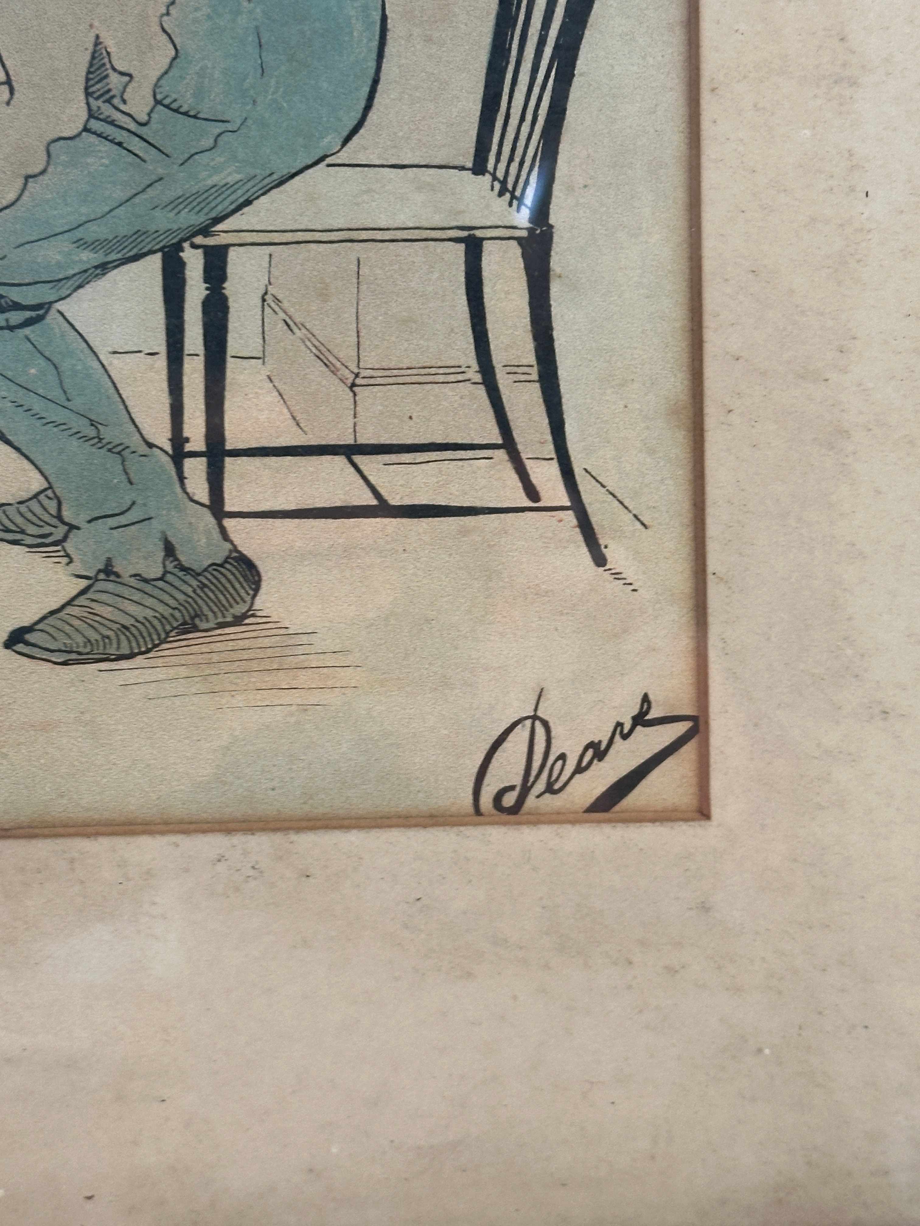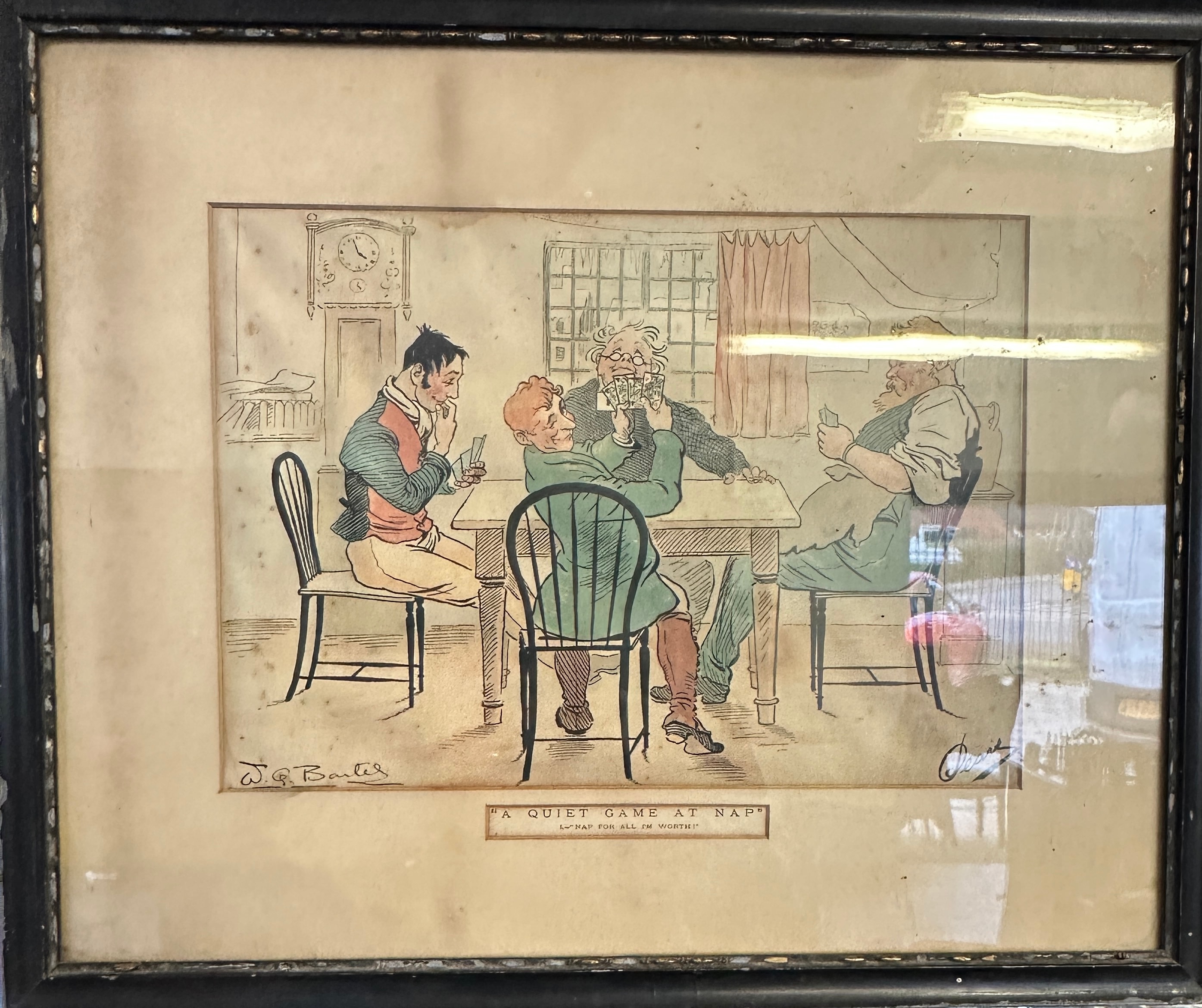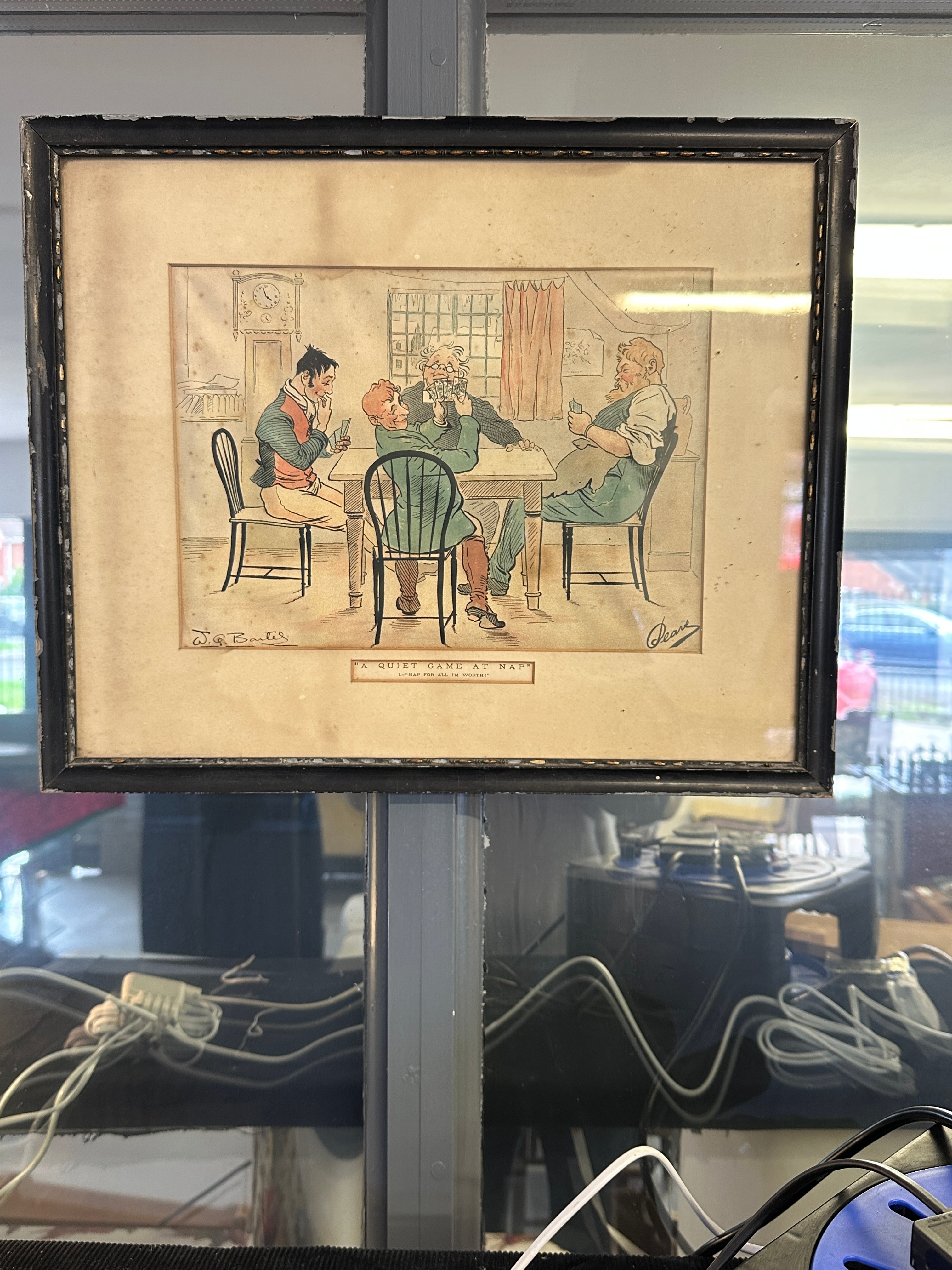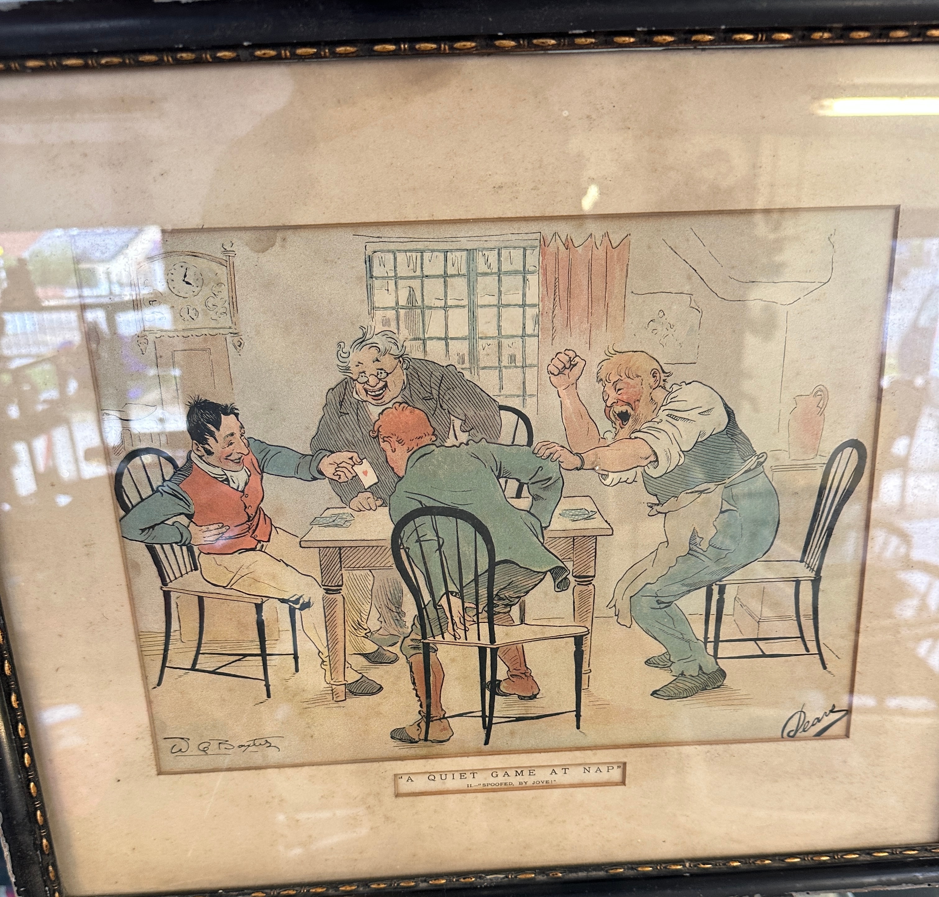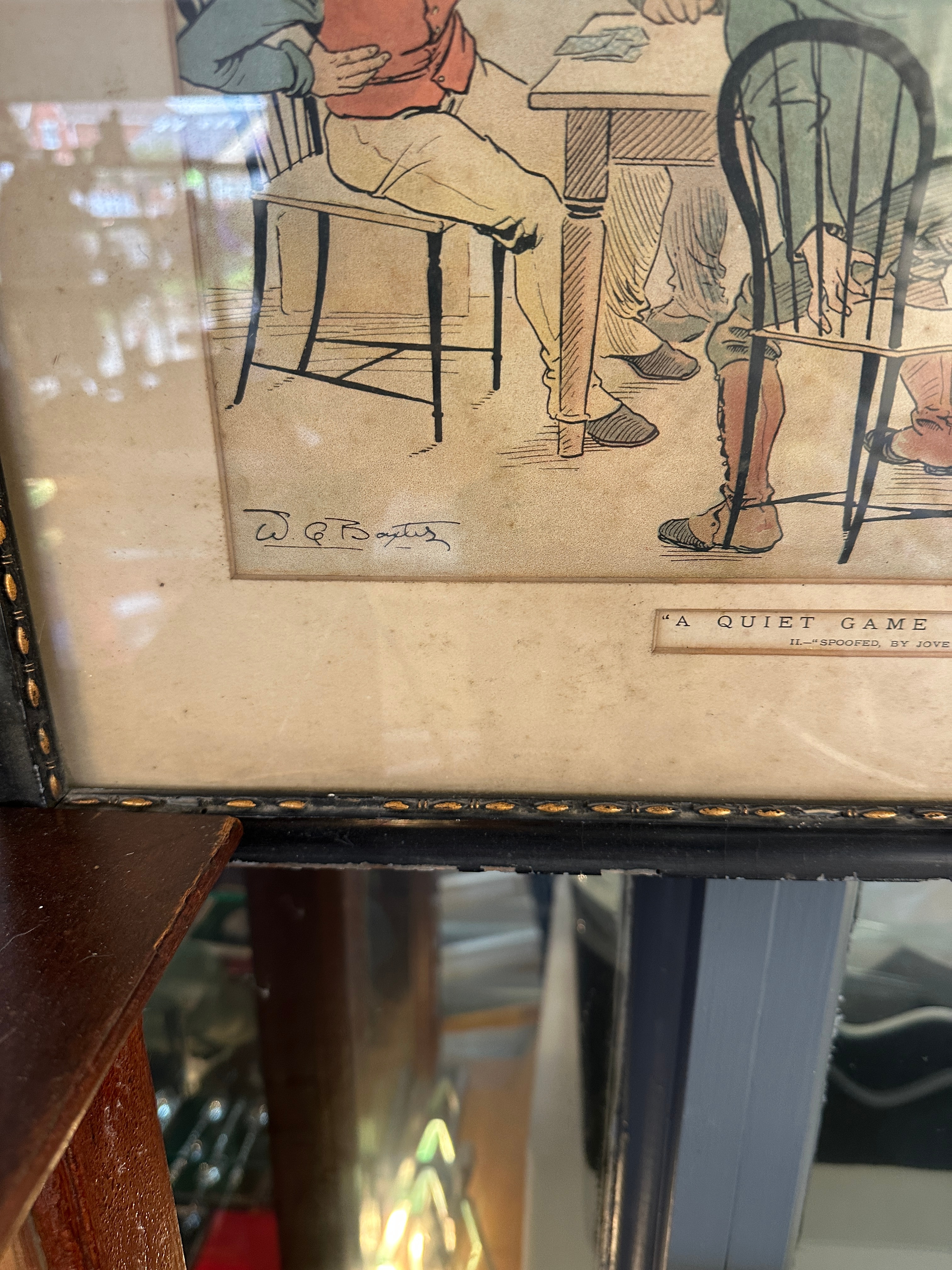 A pair of hand-colored prints by W.G. Baxter, titled ‘A Quiet Game at Nap’. Each print depicts a humorous caricature scene of four men playing a card game, executed in ink with watercolor washes. The visible text below the image reads: “A QUIET GAME AT NAP” and “II.-“SPOOFED, BY JOVE!”, indicating the title and a humorous exclamation related to the card game Napoleon. Signatures are present on the artwork itself, with “W. G. Baxter” on the lower left and “Pears” on the lower right, indicating the artist and publisher/printer respectively. Each print is set within a light-colored mat and presented under glass in a dark, possibly gessoed and gilded, wooden frame.