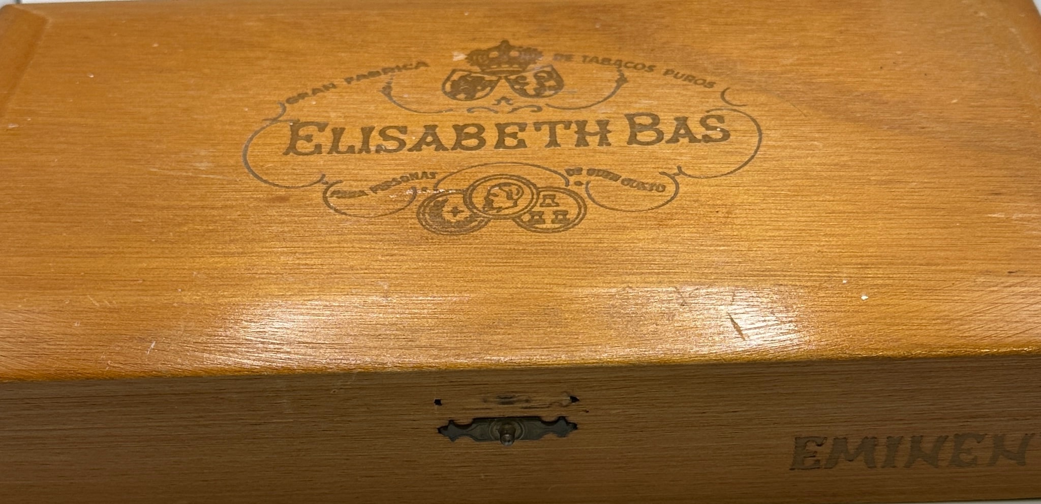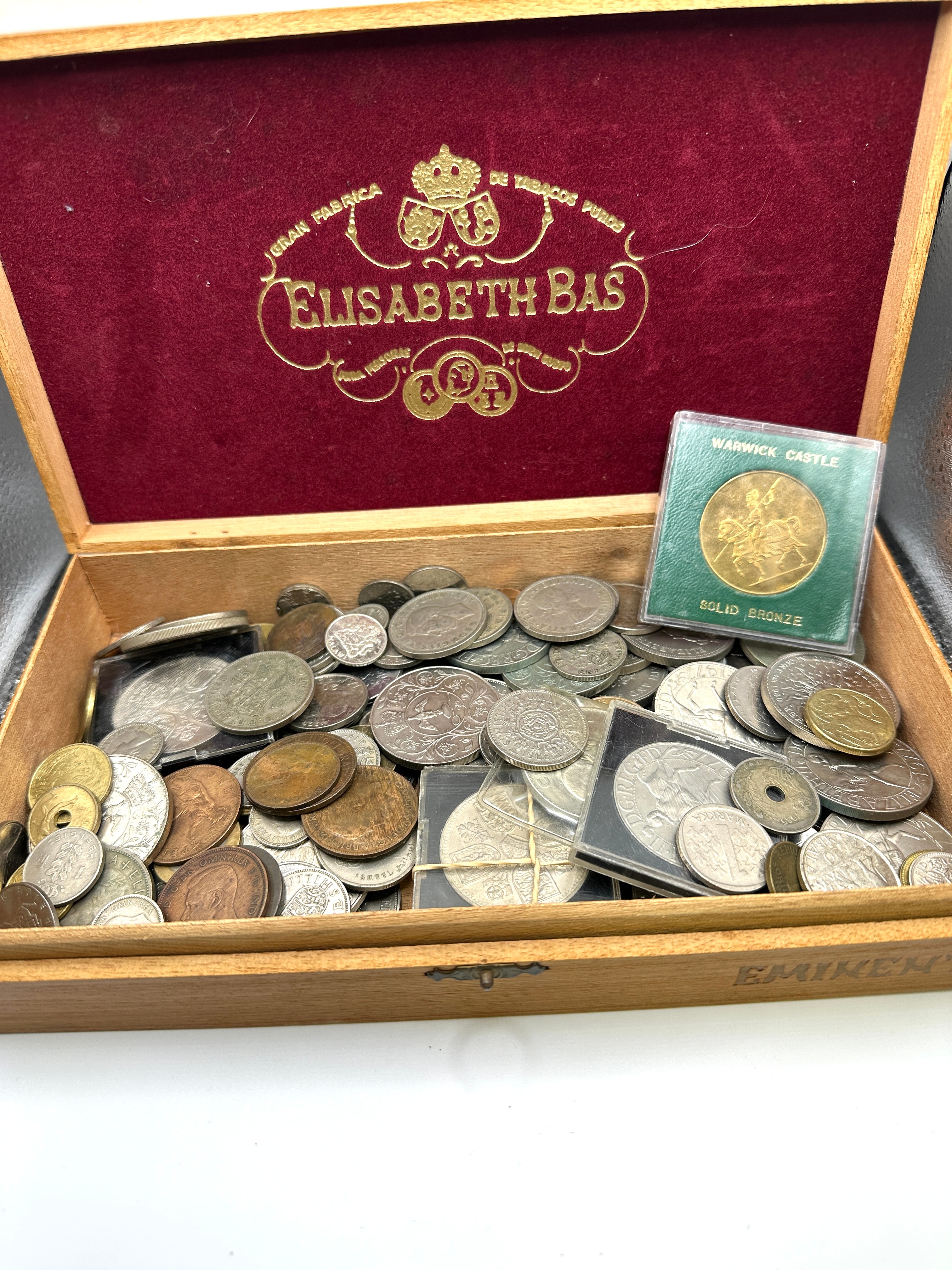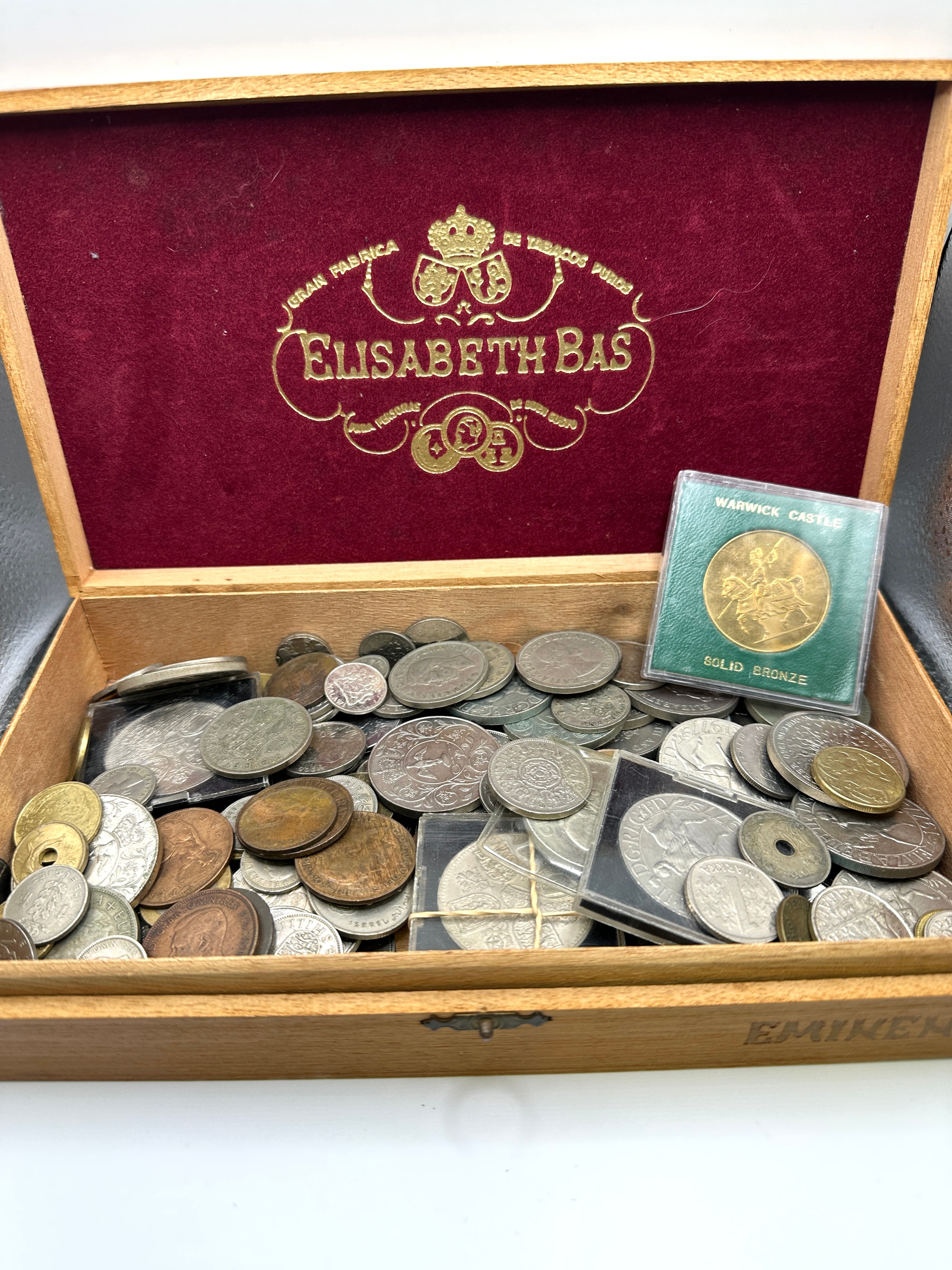 A vintage wooden cigar box, featuring a deep red velvet-lined interior lid adorned with gold foil text reading “GRAN FABRICA DE TABACOS PUROS” and “ELISABETH BAS,” accompanied by “PARA PERSONAS DE BUEN GUSTO.” The exterior of the box also bears the “ELISABETH BAS” branding and the partial word “EMINEN,” consistent with cigar box markings. The box is filled with a diverse collection of metallic coins and medallions, exhibiting various silver, bronze, and copper tones, some encapsulated in plastic holders. Among these is one green-bordered holder containing a “WARWICK CASTLE SOLID BRONZE” medallion depicting figures on horseback.