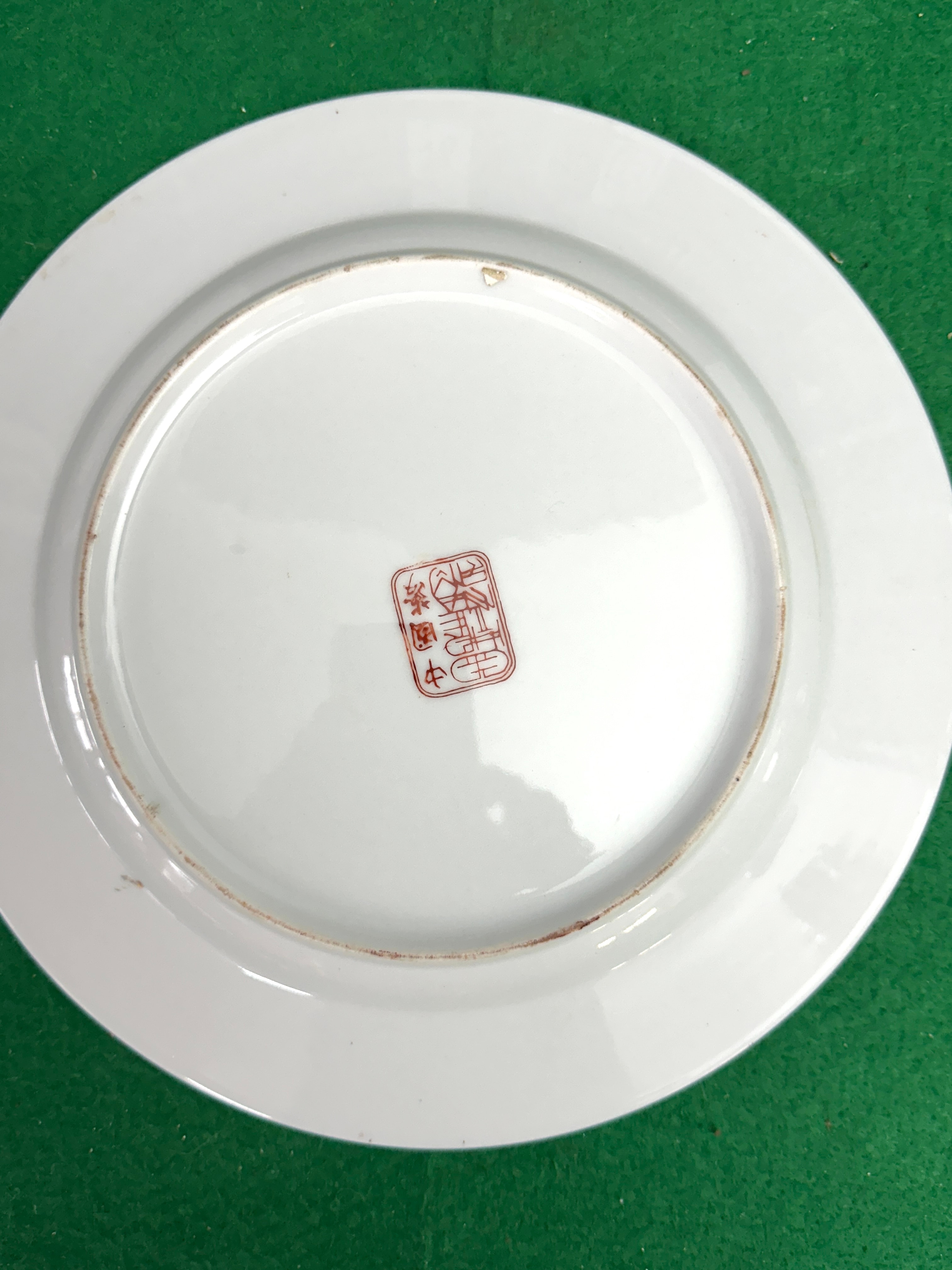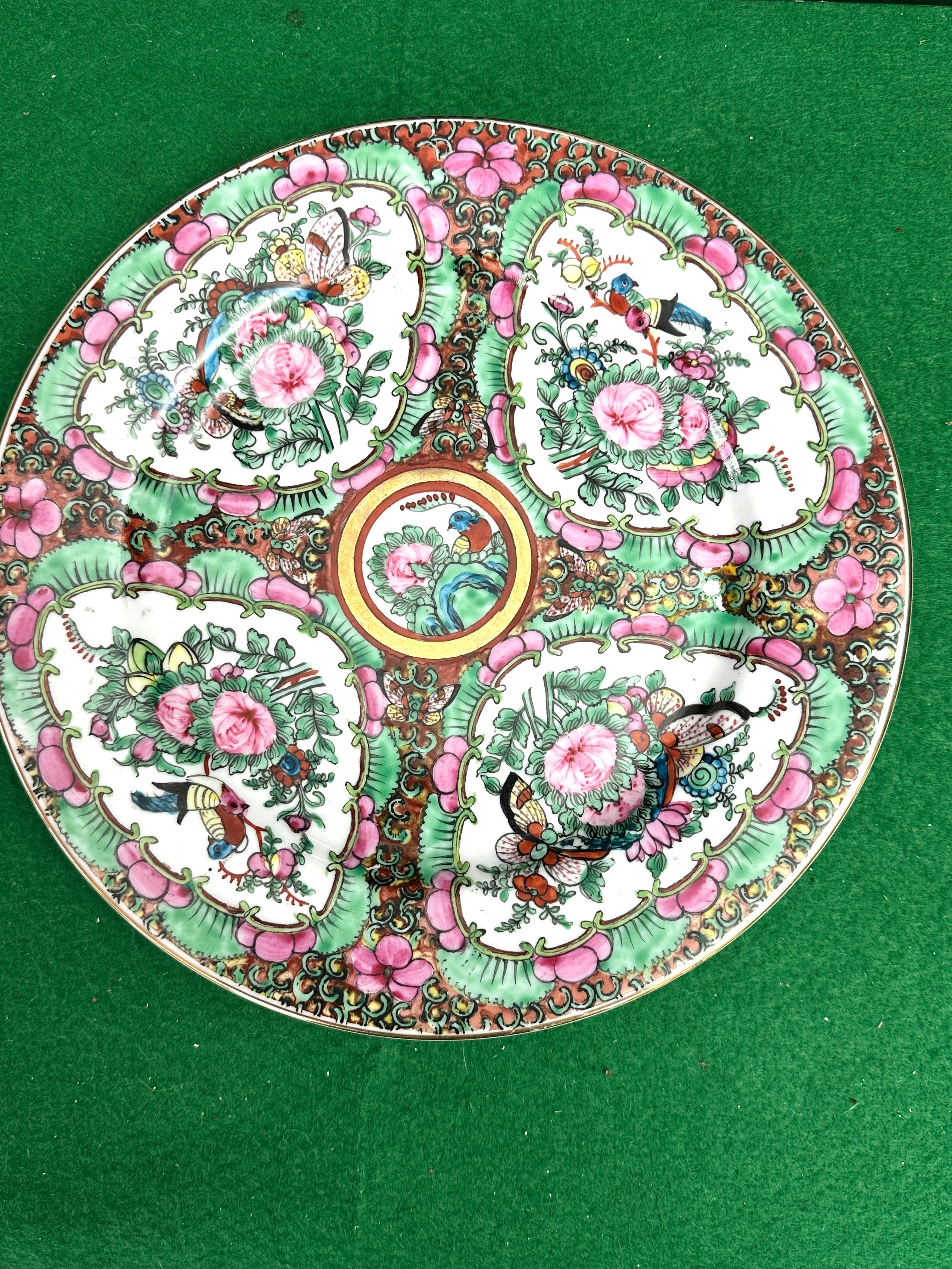 A Chinese Rose Medallion porcelain plate or charger, featuring vibrant polychrome enamel decoration. The design is executed in the traditional Famille Rose style, comprising four main lobed panels depicting birds and lush pink floral arrangements, interspersed with intricate patterns and a central circular motif of a bird on a branch. Predominant colors include rich pinks, greens, and gold, set against a white ground within the panels and detailed scrolling borders. The reverse is plain white porcelain and bears a rectangular red seal mark with four Chinese characters, 華記中國 (Hua Ji Zhong Guo), which translates to ‘Hua Ji, China’ or ‘China, Hua Ji Mark.’