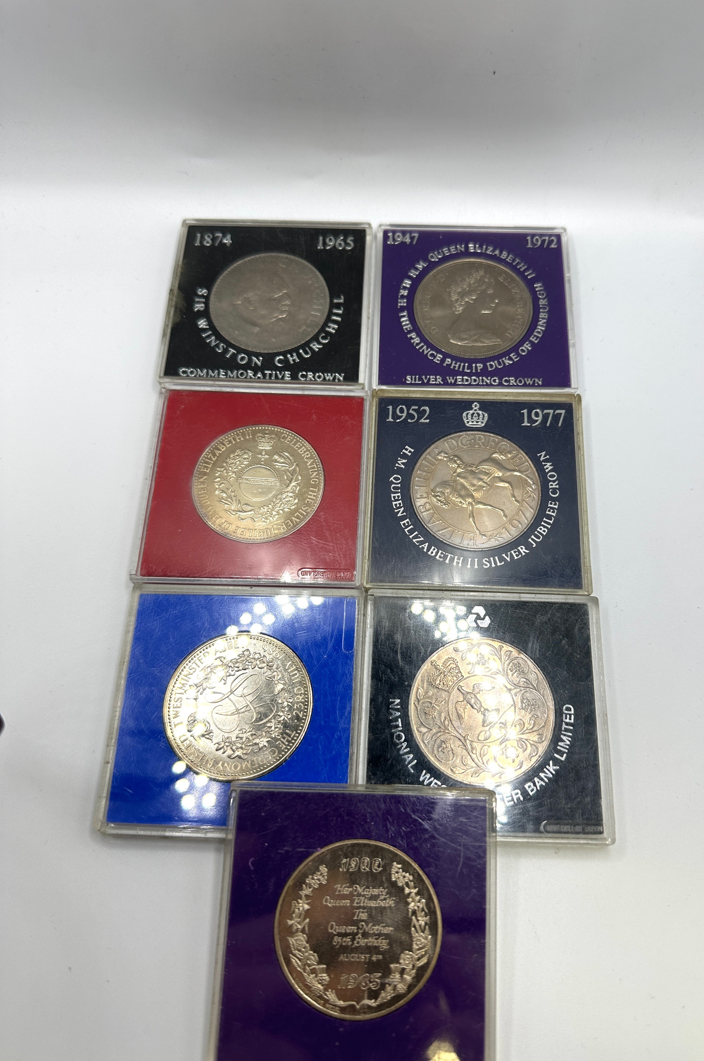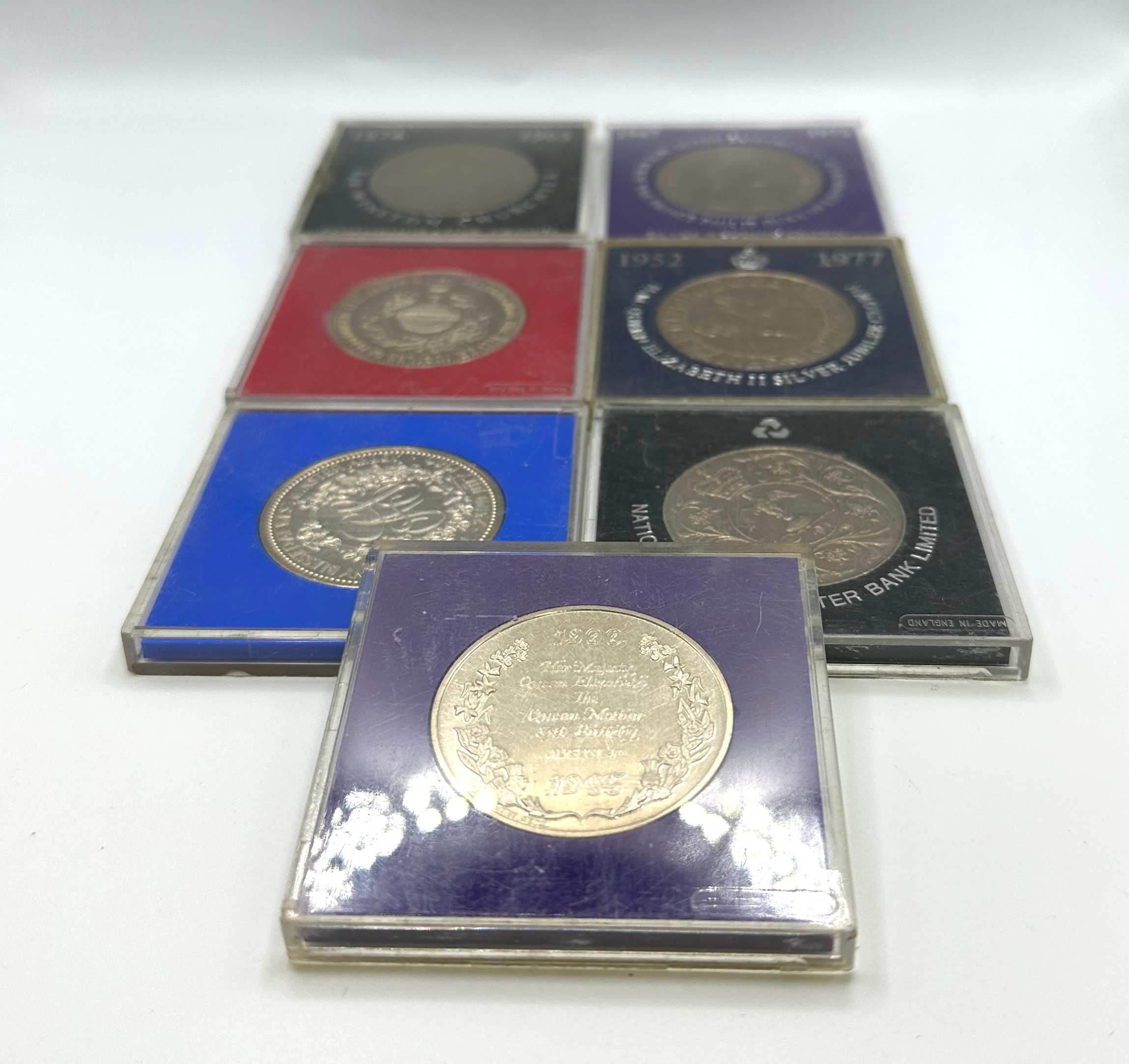 A collection of seven individually cased commemorative medallions, predominantly celebrating British royal events and figures. The collection includes pieces commemorating “SIR WINSTON CHURCHILL COMMEMORATIVE CROWN” (1874-1965), “H.M. QUEEN ELIZABETH-II” and “H.R.H. THE PRINCE PHILIP DUKE OF EDINBURGH SILVER WEDDING CROWN” (1947-1972), “H.M. QUEEN ELIZABETH II SILVER JUBILEE” (1952-1977) on multiple items, and “Her Majesty Queen Elizabeth II Queen Mother 80th Birthday” (1900-1980). One distinct medallion, housed in a blue case, features intricate Arabic script alongside an emblem, departing from the primary British theme. The metallic items appear silver-toned or bi-metallic and are housed in clear plastic cases with colored inserts (black, red, blue, and purple). Some cases bear text such as “NATIONAL WESTMINSTER BANK LIMITED” and “MADE IN ENGLAND”.