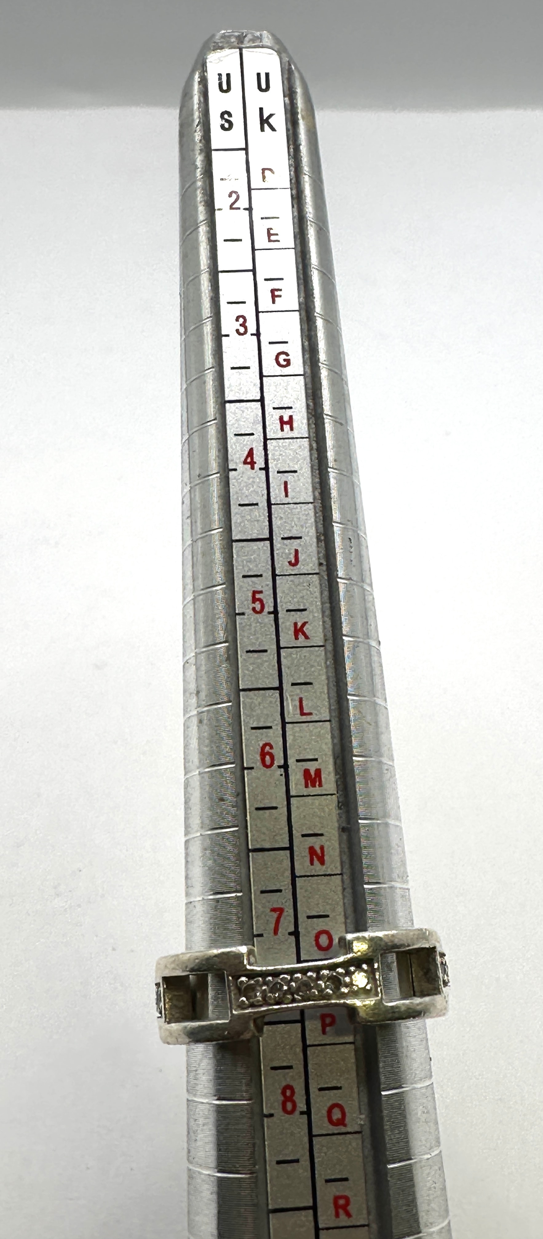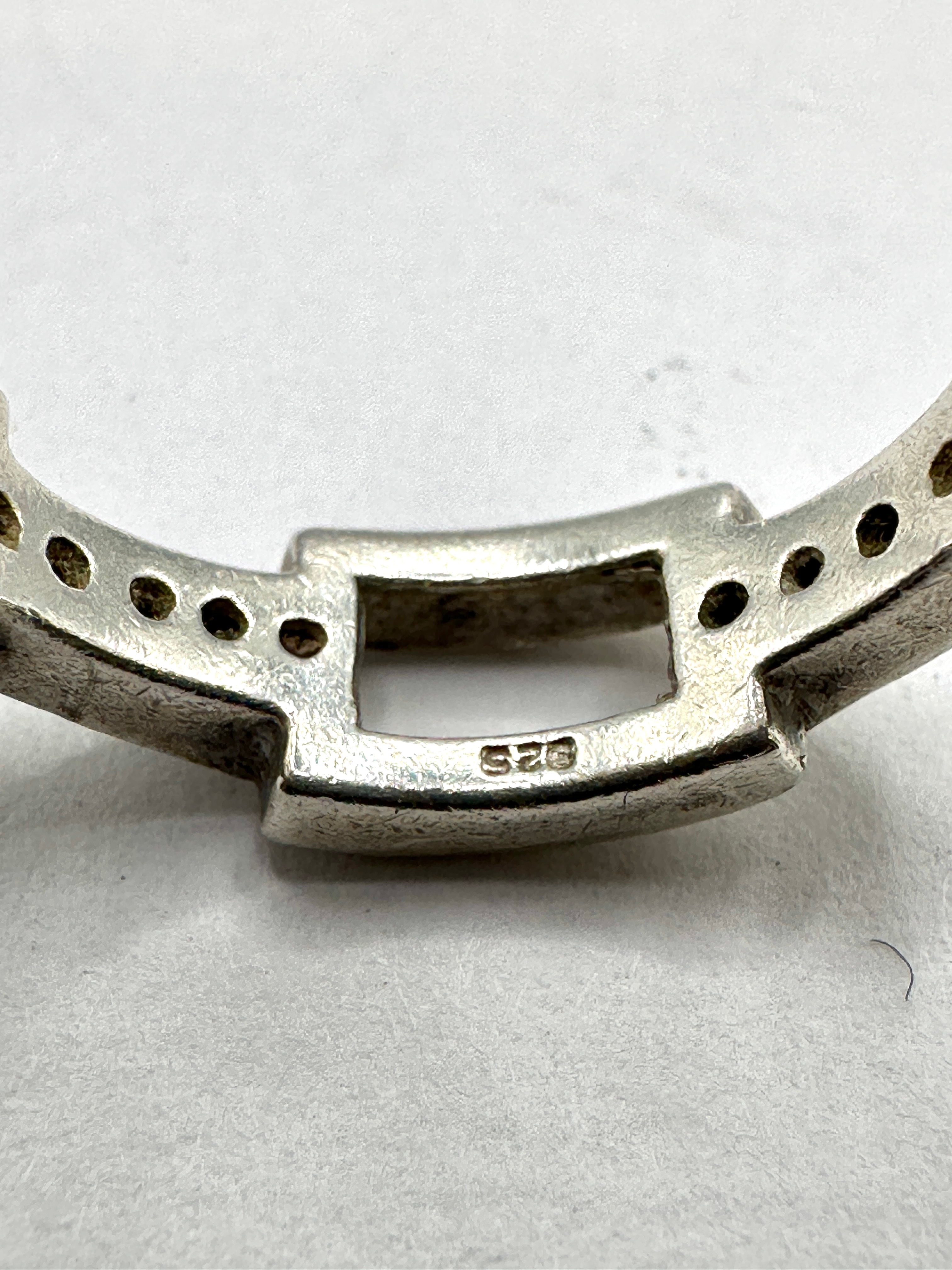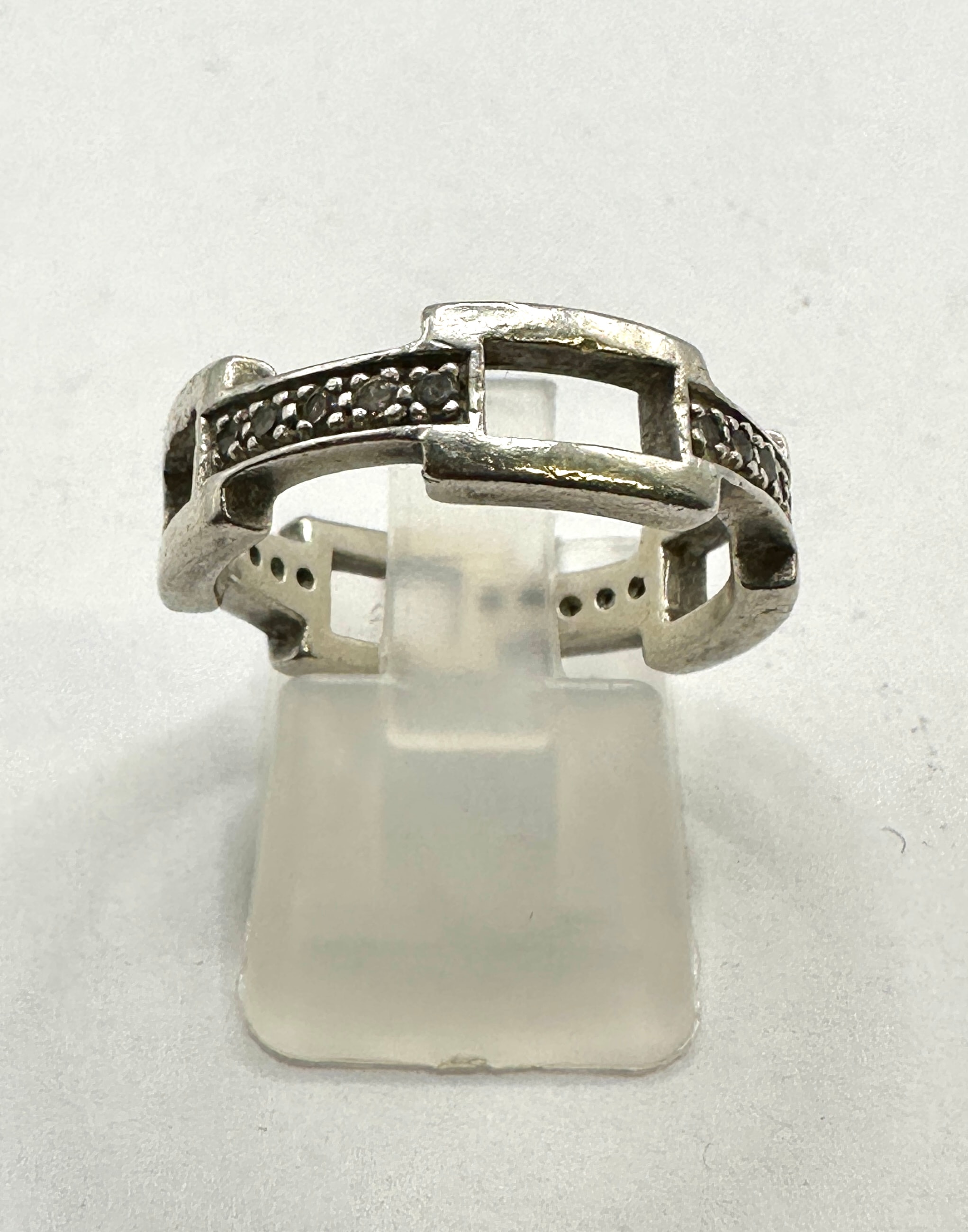 A modern geometric ring, crafted from 925 silver, featuring an openwork design with interconnected links. Sections of the band are pavé or channel-set with numerous small, round, colorless marcasite stones. The interior of the band is marked ‘S25’.