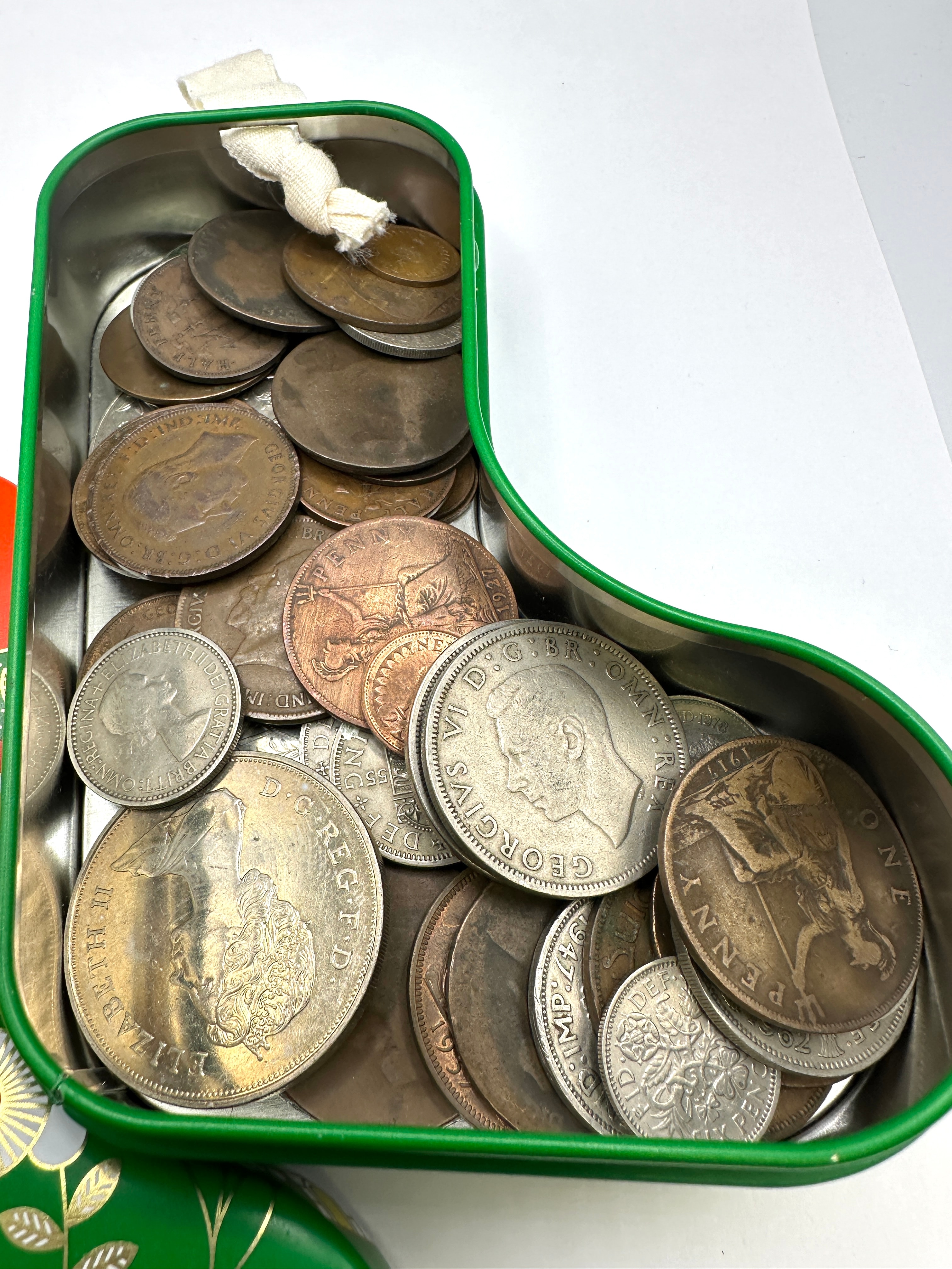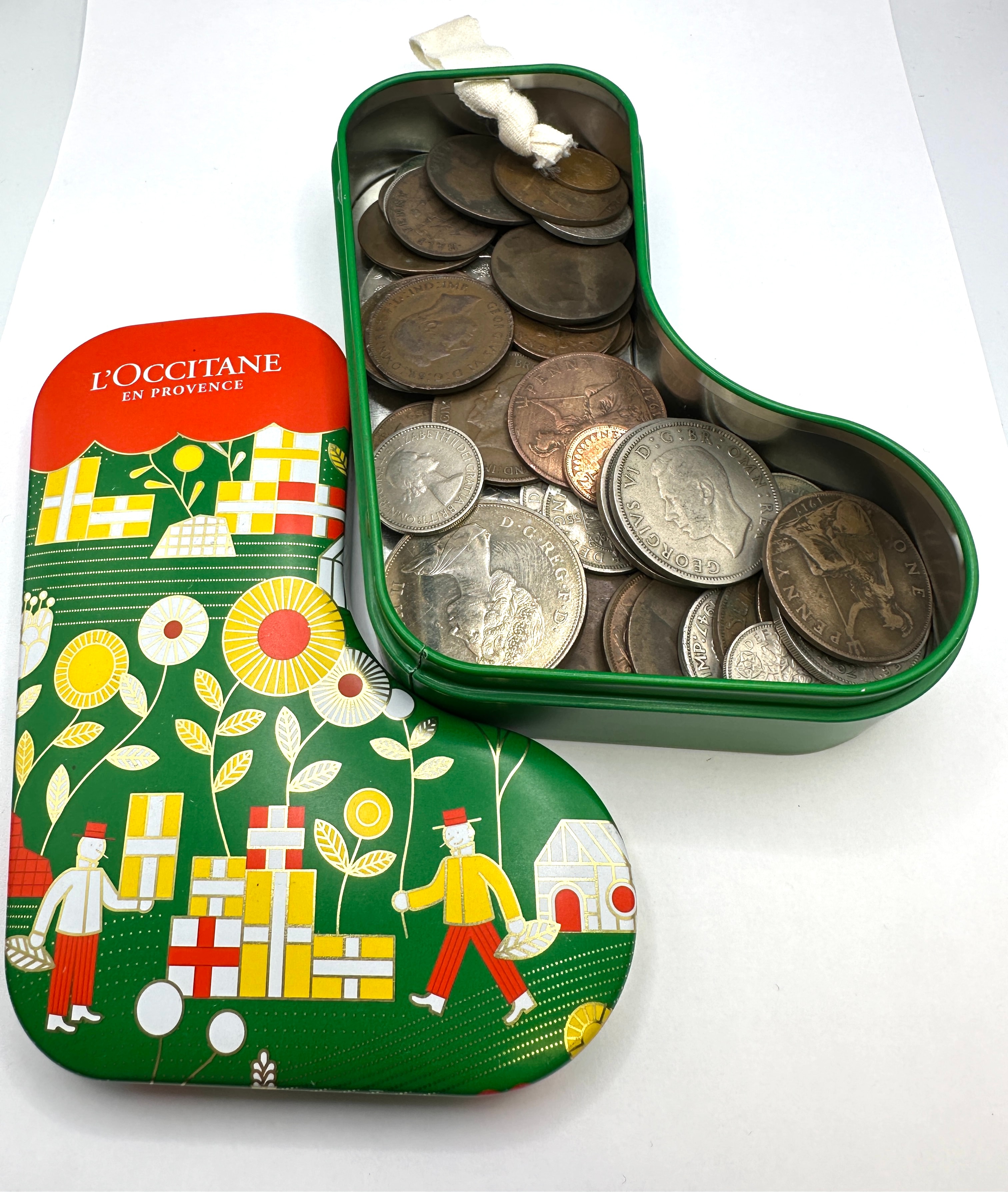A L’Occitane Christmas Stocking Tin, primarily green, red, and yellow, decorated with festive motifs of figures, presents, and flowers. The lid is branded ‘L’OCCITANE EN PROVENCE’. The tin contains a collection of assorted metal coins, largely appearing to be British or Commonwealth coinage. Visible details on the coins include denominations such as ‘ONE PENNY,’ and Latin inscriptions identifying monarchs including ‘GEORGIVS V D. G. BRITT: OMN: REX F. D. IND: IMP:’ and ‘ELIZABETH II D. G. REG. F. D.’, spanning from at least the early to mid-20th century; one coin clearly shows the year ‘1947’.