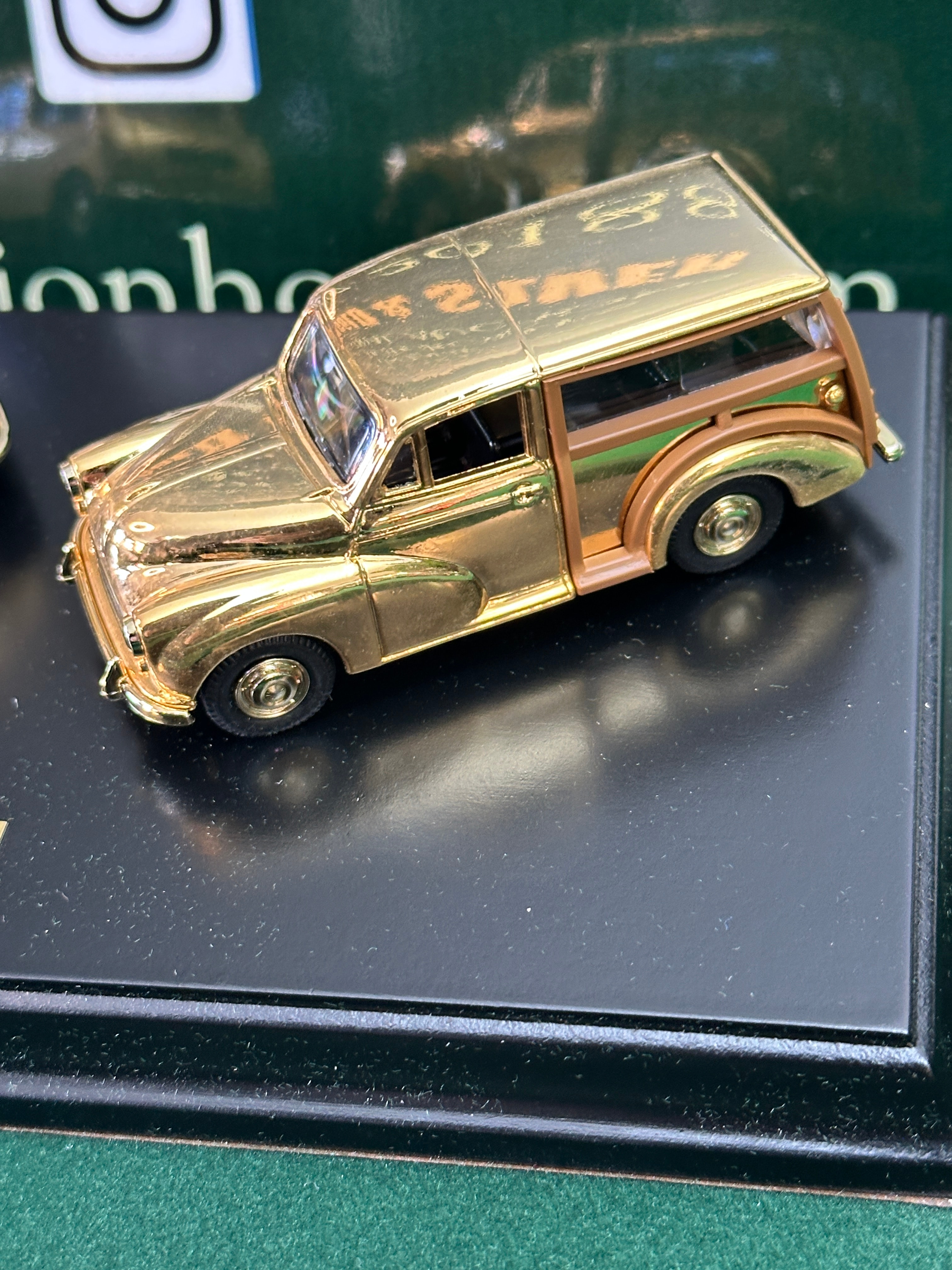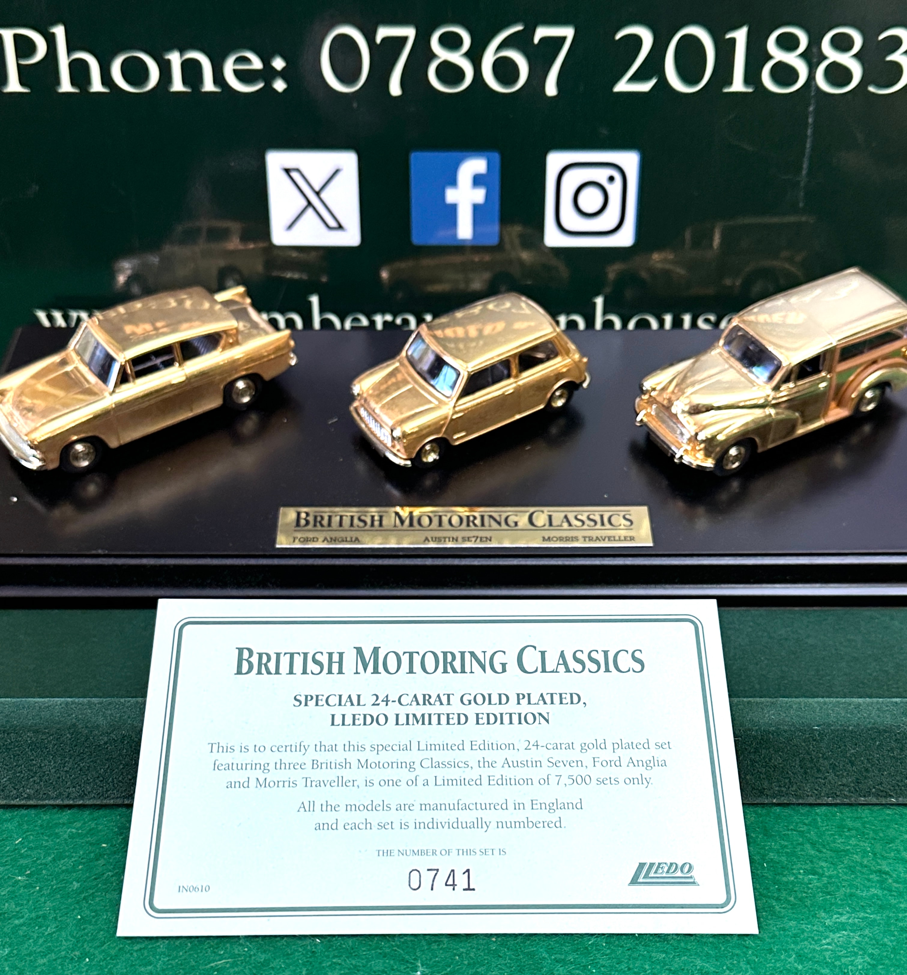 A Lledo ‘British Motoring Classics of the 1960’s’ 24-carat gold plated limited edition die-cast model car set. This set features three miniature replicas: a Ford Anglia, an Austin Se7en, and a Morris Traveller. It is presented on a black display base within its original green cardboard box. An accompanying certificate confirms it as a “LLEDO LIMITED EDITION” numbered 0741 out of 7,500 sets, noting all models are “manufactured in England.” The outer packaging displays a lion rampant logo and multilingual safety warnings, including French (“Contient de petits morceaux susceptibles d’être avalés,” “L’emballage du produit aux normes obligatoires de securité est garantie par l’importateur”), German (“Kleine Teile, die verschluckt werden könnten,” “Geprüft nach ASTM F963-95”), and Italian (“Contiene piccole parti che potrebbero essere ingerite,” “Conforme alle norme sulla sicurezza dei giocattoli”).