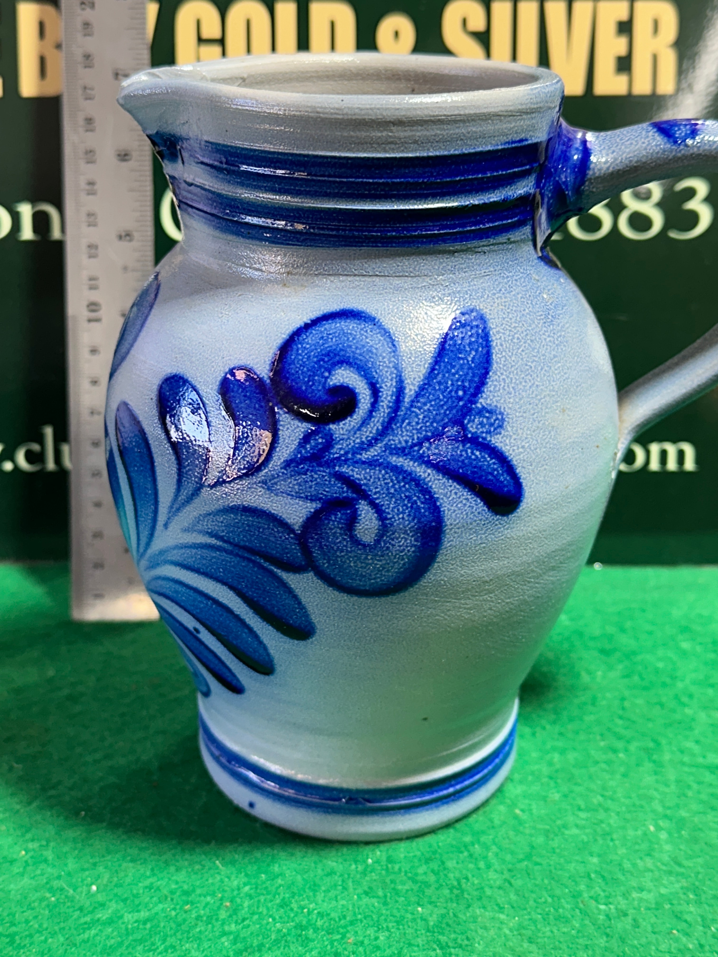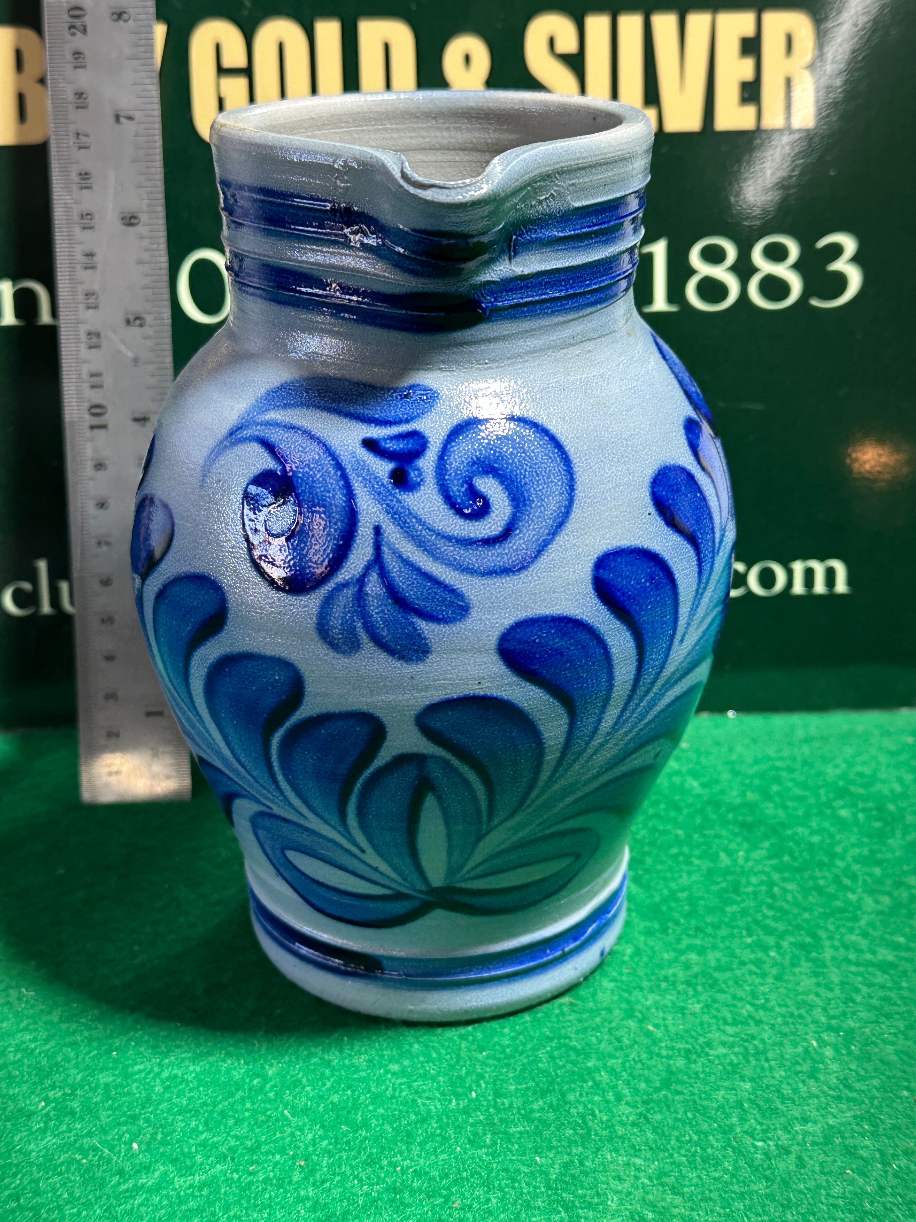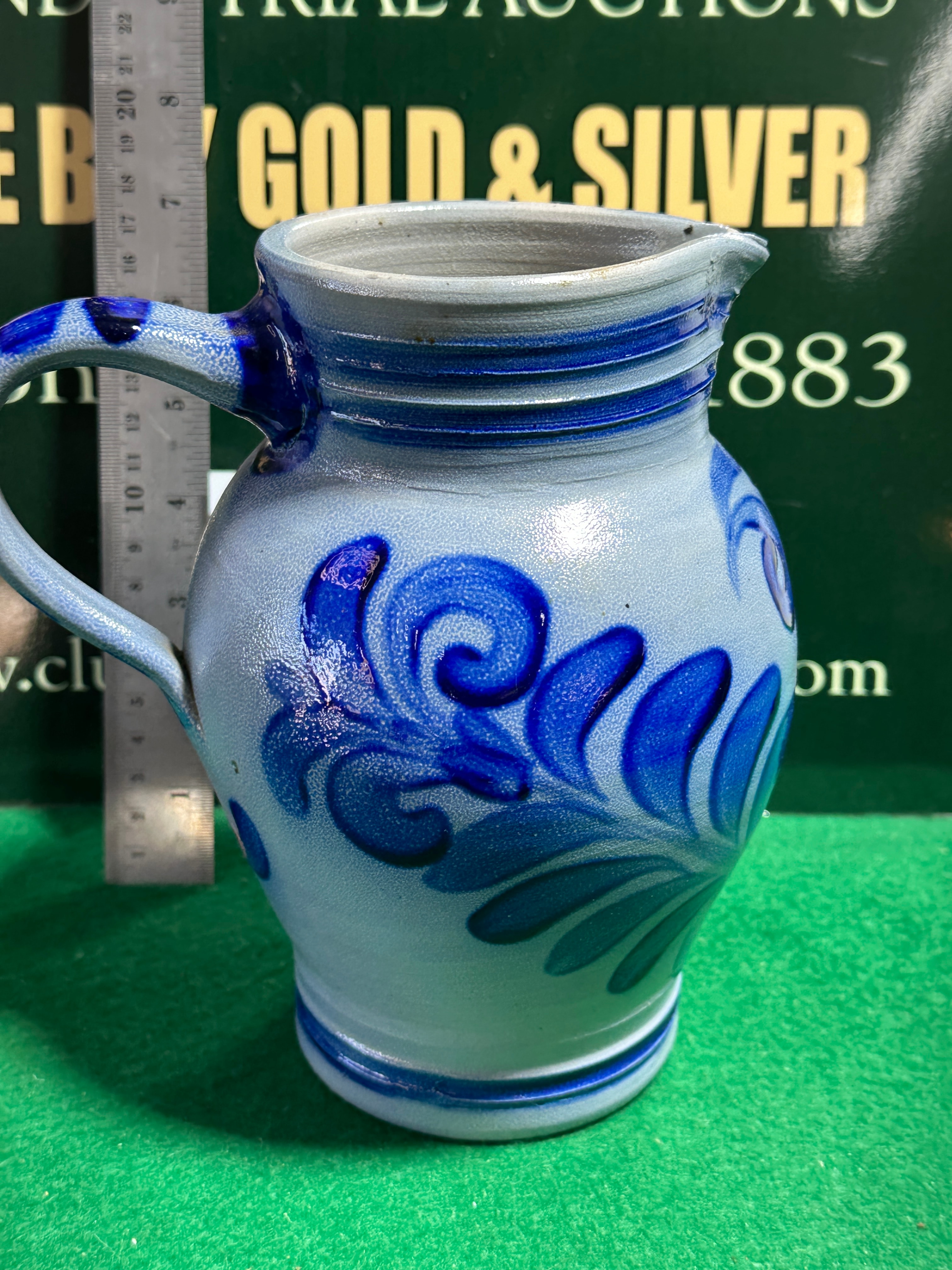 A German Salt Glazed Stoneware Pitcher, featuring a light grayish-blue body adorned with bold cobalt blue painted decoration. The design consists of elaborate foliate scrolls and stylized swirl motifs that wrap around the vessel. It has a rounded body, a defined pouring spout, and an attached handle, with multiple horizontal incised lines detailing the neck and base.