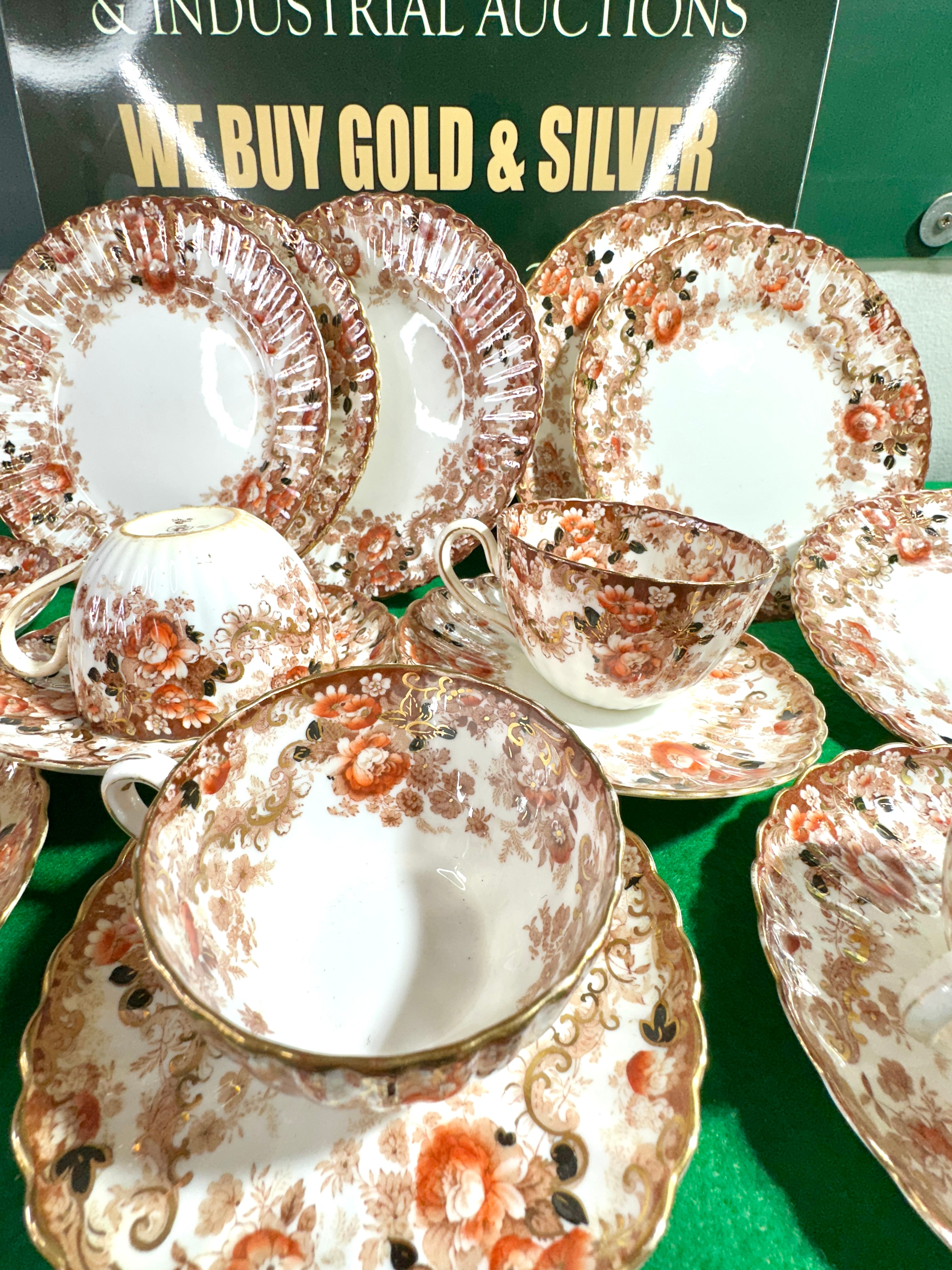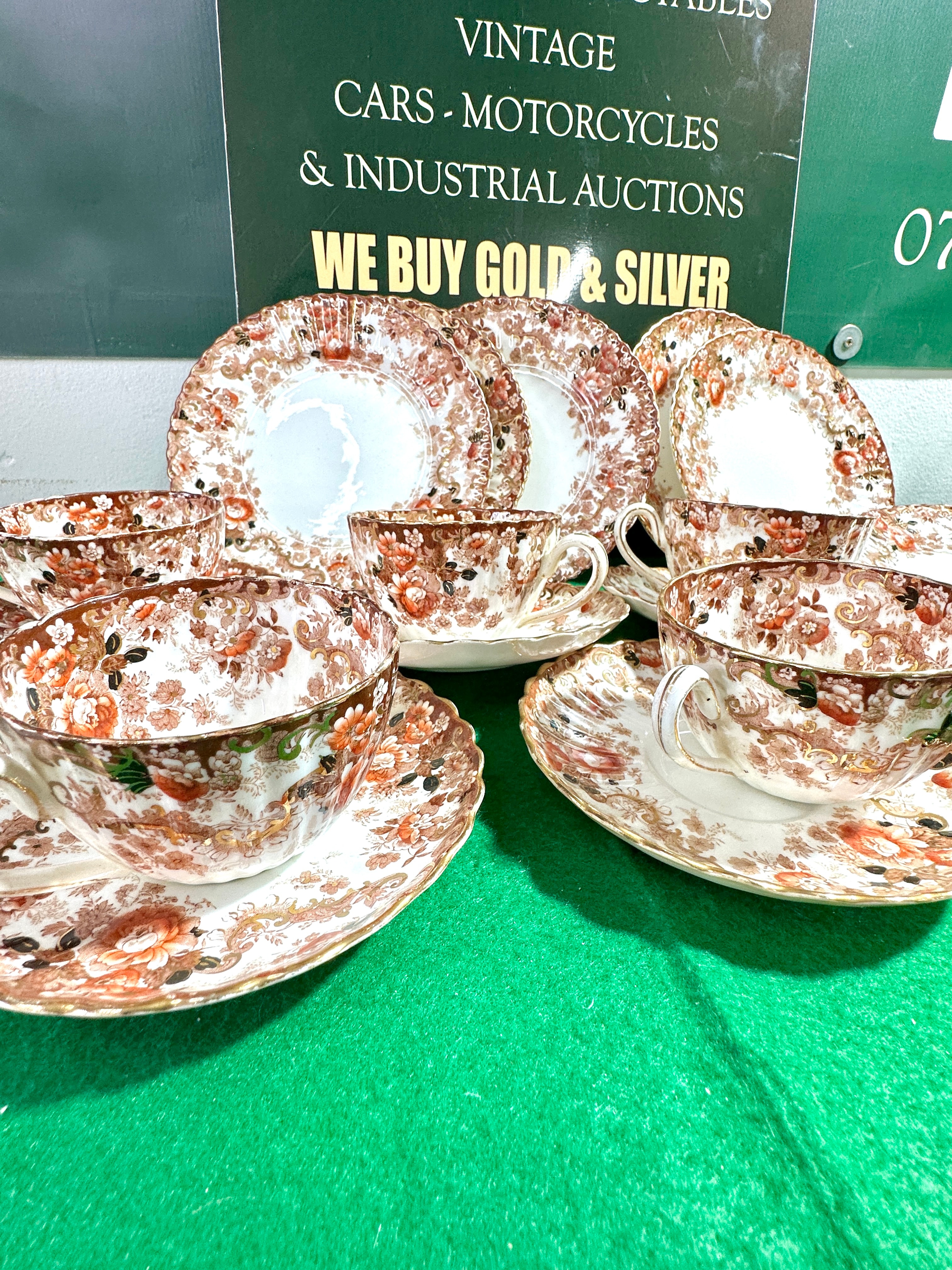 A Samuel Radford ‘Victorian Rust’ eighteen-piece ceramic tea and dinnerware set, comprising six teacups, six matching saucers, and six larger plates. Each piece features a white ground adorned with an ornate floral and foliate pattern in shades of rust-orange and brown, accentuated by intricate gold scrollwork and trim on scalloped or fluted edges. A backstamp observed on one saucer reveals a crown symbol above a circular mark, accompanied by the letter ‘B’ and the registration number ‘82424’.
