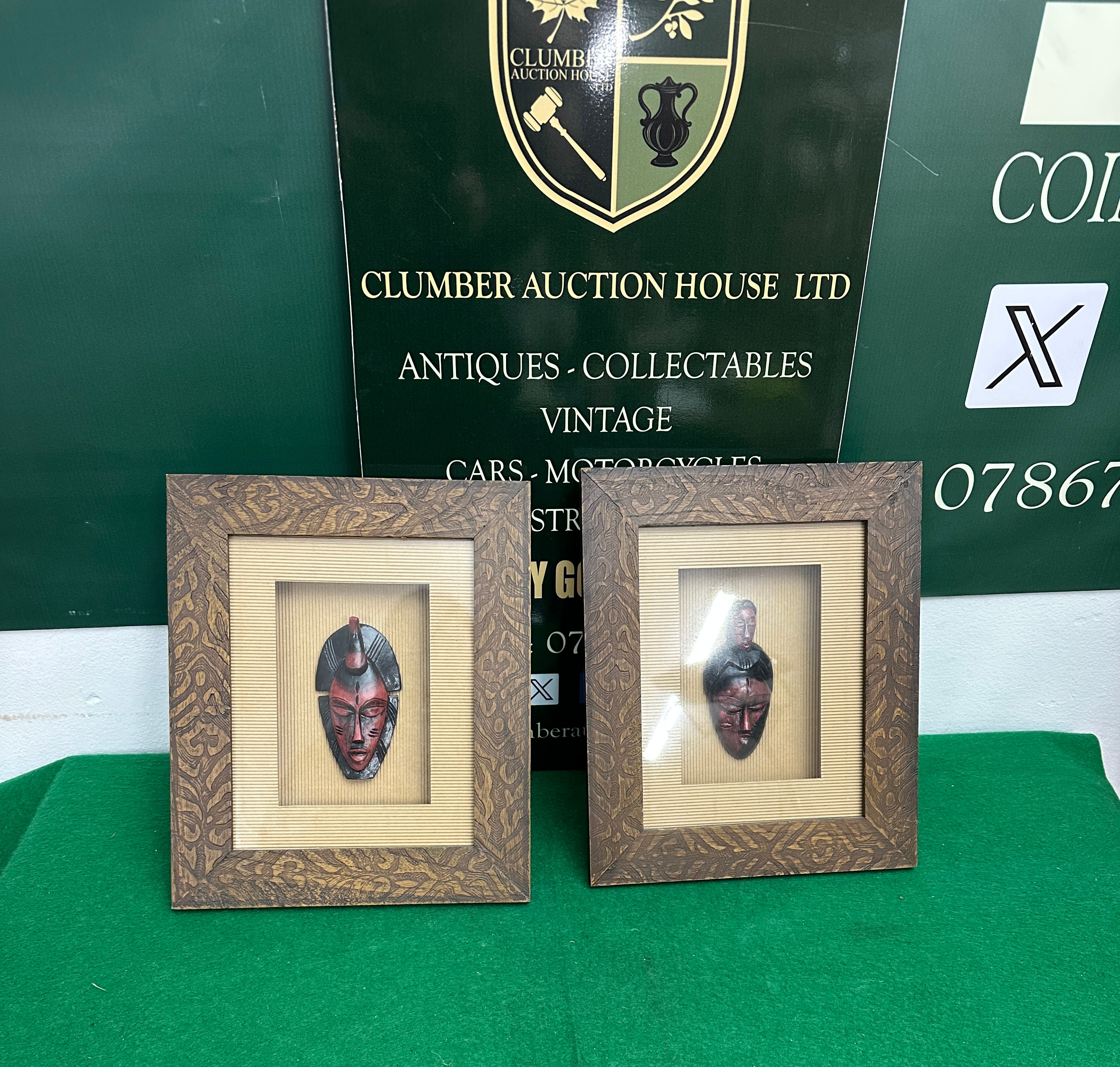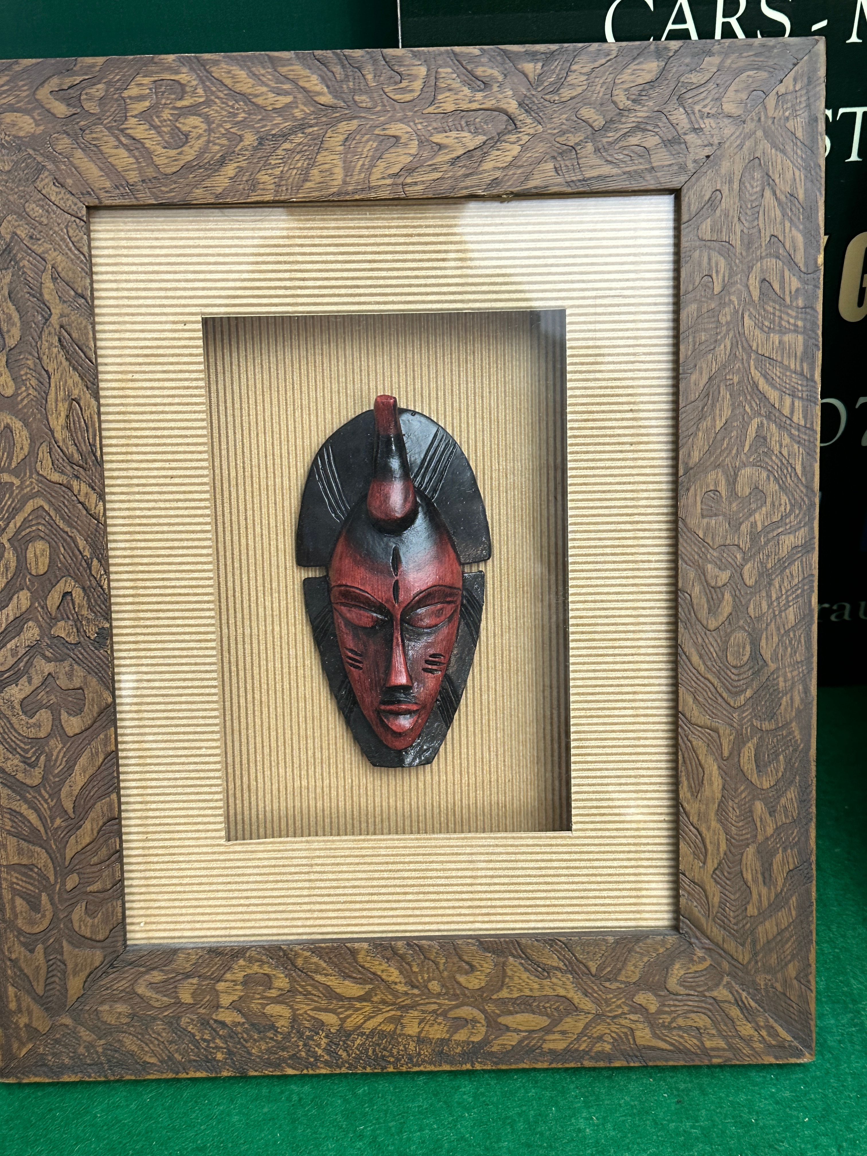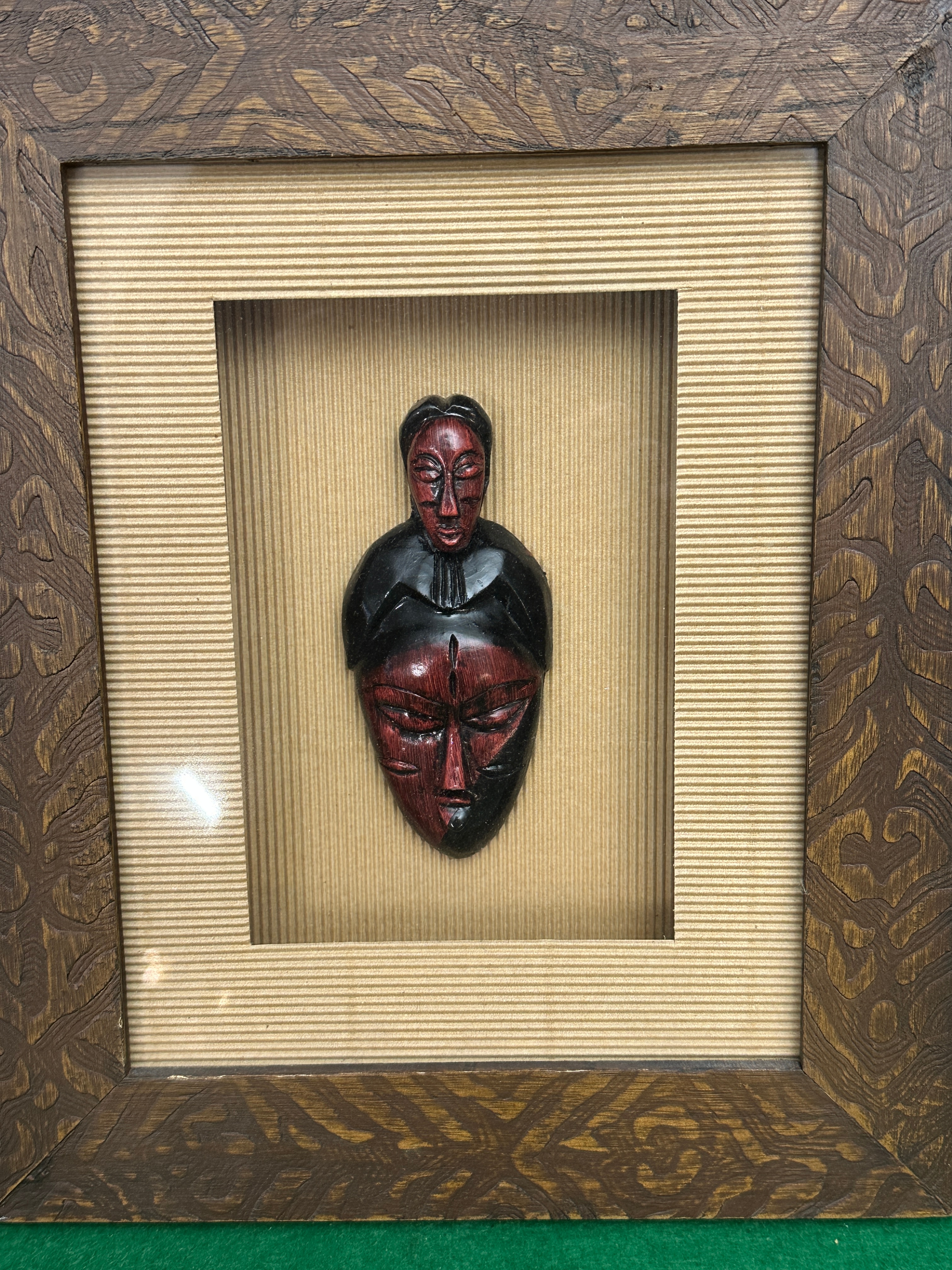 A pair of framed relief sculptures, each featuring a small, carved wood mask with a black and red painted finish. The masks depict stylized faces with an ethnic or tribal aesthetic and are mounted on a corrugated cardboard background behind a clear protective front. The shadow box style frames are crafted from dark-stained wood, adorned with an embossed or carved foliate pattern. The reverse of each frame shows an MDF backing board fitted with a sawtooth hanger. No distinguishing marks or text are visible on the items themselves.