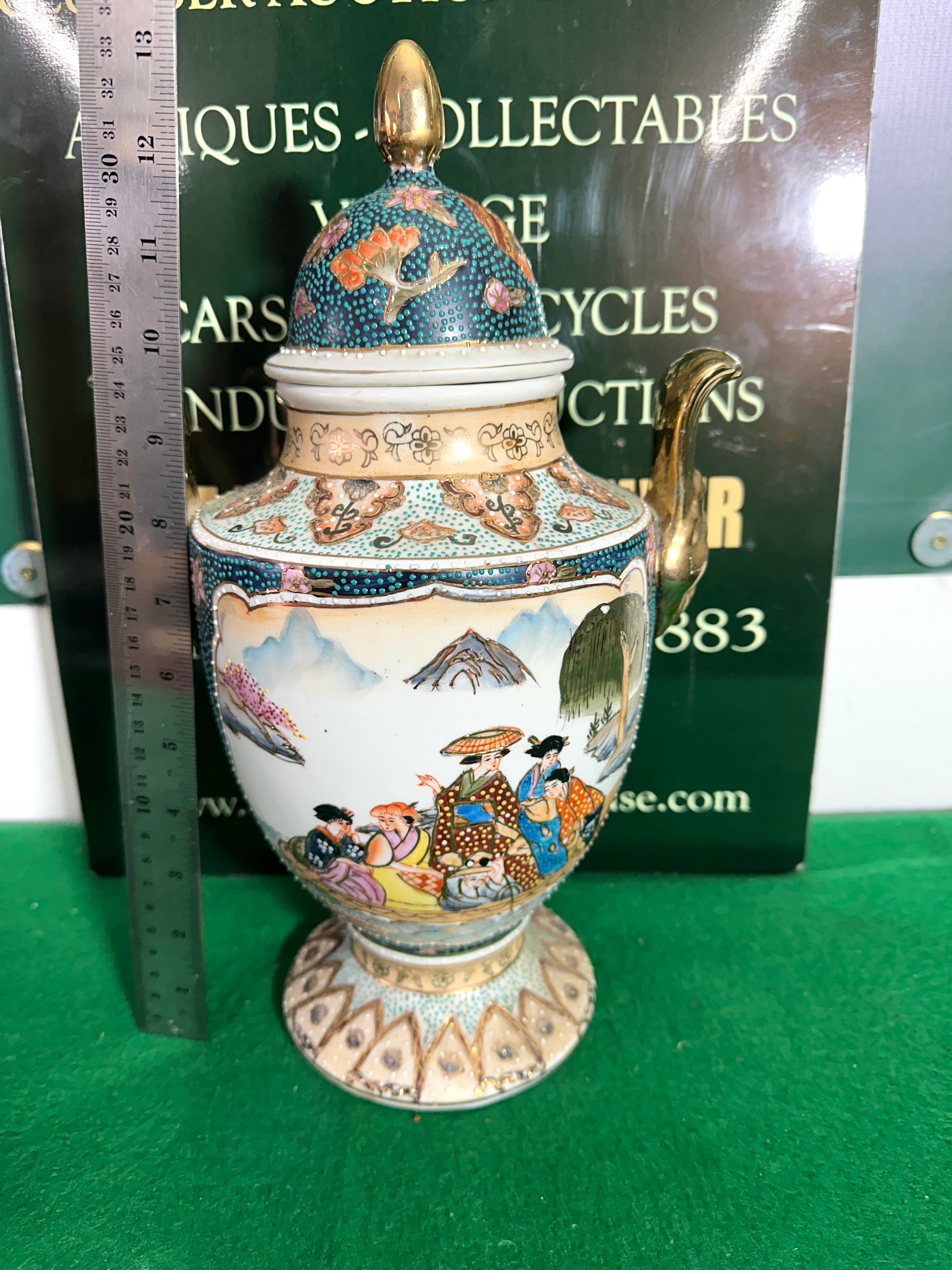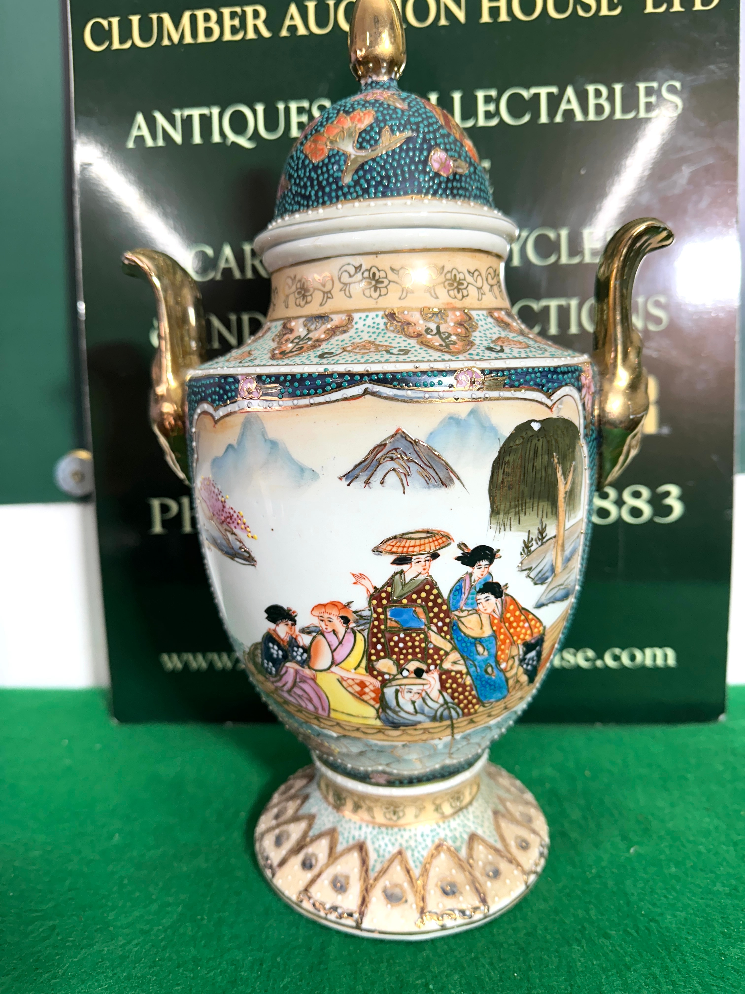 A Japanese Satsuma polychrome and gilt lidded vase. This ceramic lidded pot features vibrant polychrome and gilt decoration in a traditional Japanese export style. The main body depicts a detailed figural scene of individuals in traditional attire within a mountainous landscape, complemented by intricate geometric, floral, and cloud-like patterns on the shoulder, lid, and pedestal-style foot. It is topped with a metallic gold-toned finial on the domed lid and has a single ornate gold-toned handle. The material appears to be glazed ceramic, with gilded metal components. No specific textual markings or maker’s marks are visible on the item itself.