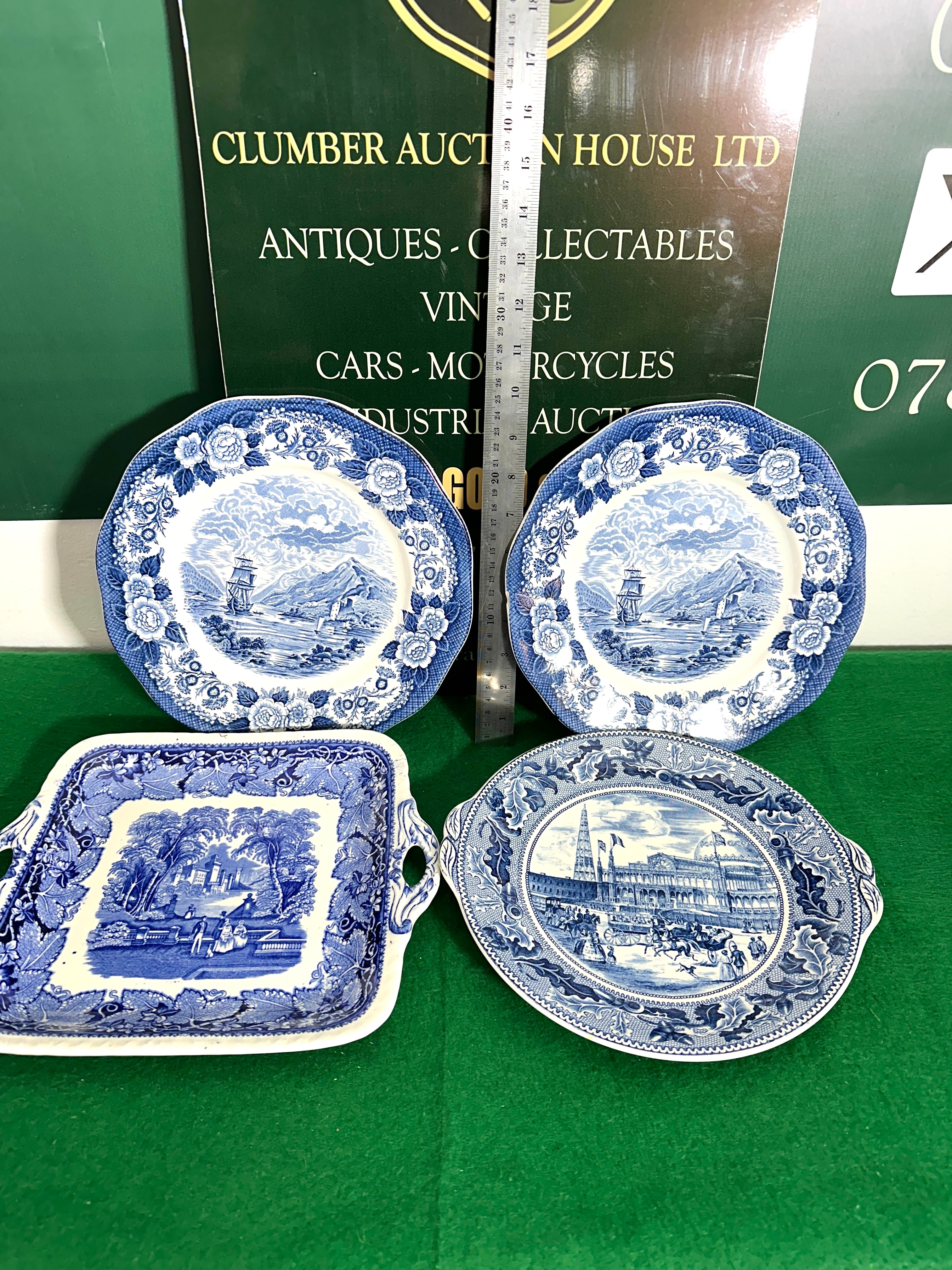 A collection of four pieces of blue and white ceramic transferware, dating from the late 19th to mid-20th century. The lot comprises two scalloped-edge plates, one square serving dish with integral handles, and one round serving plate with integral handles.