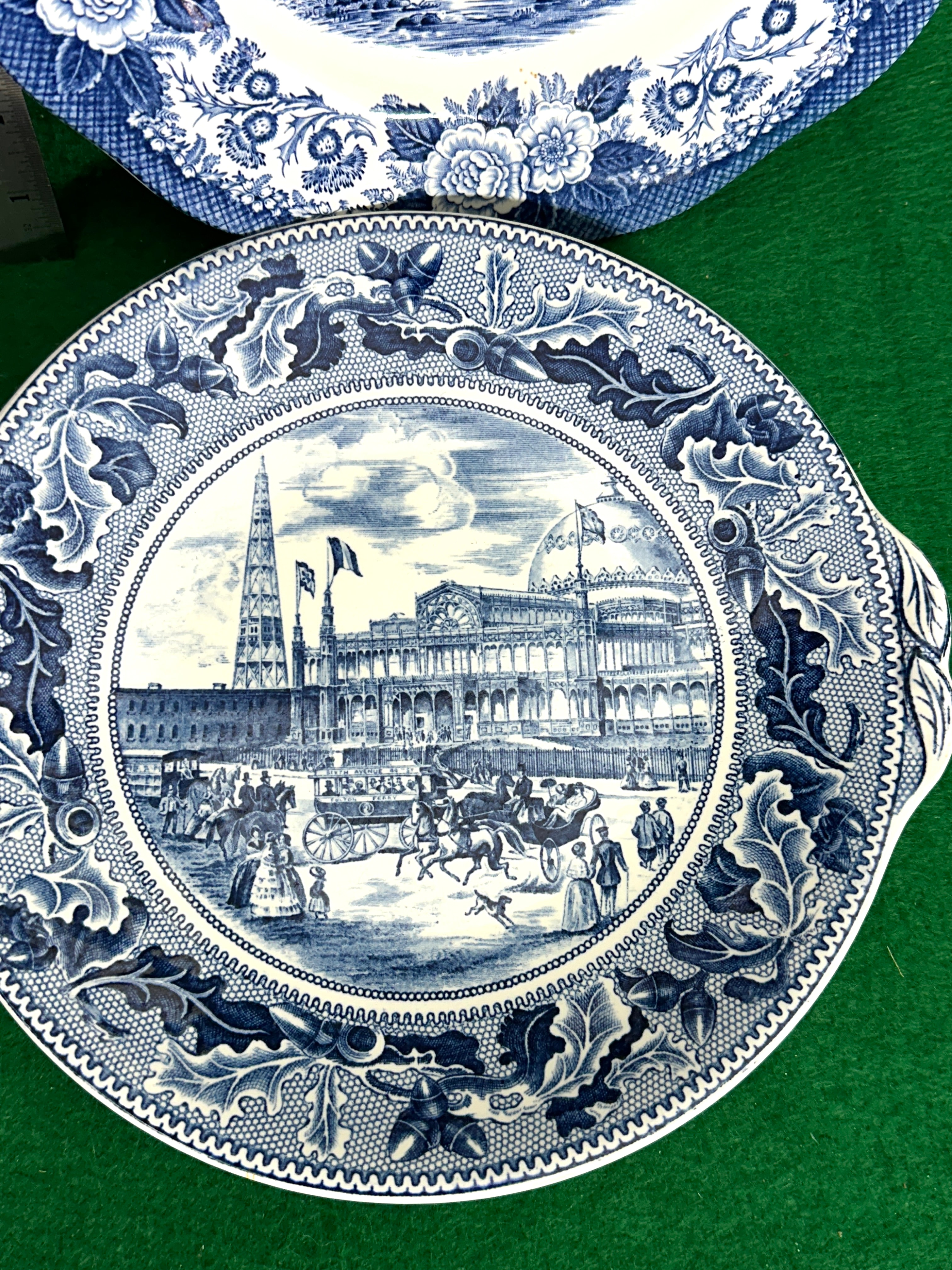 The round serving plate with integral handles depicts the New York Crystal Palace during an International Industrial Exhibition, surrounded by an acorn and leaf border. The reverse is marked ‘New York Crystal Palace HISTORIC AMERICA Johnson Bros. England IRONSTONE’.