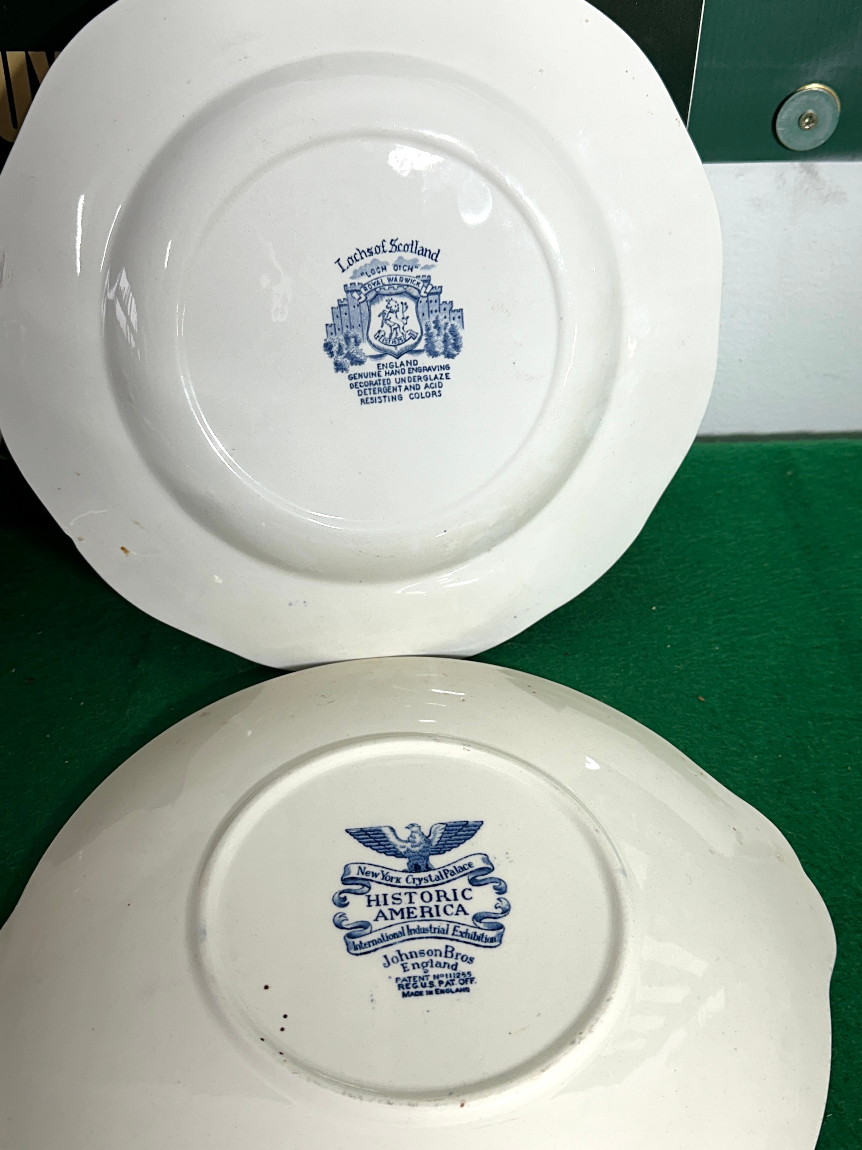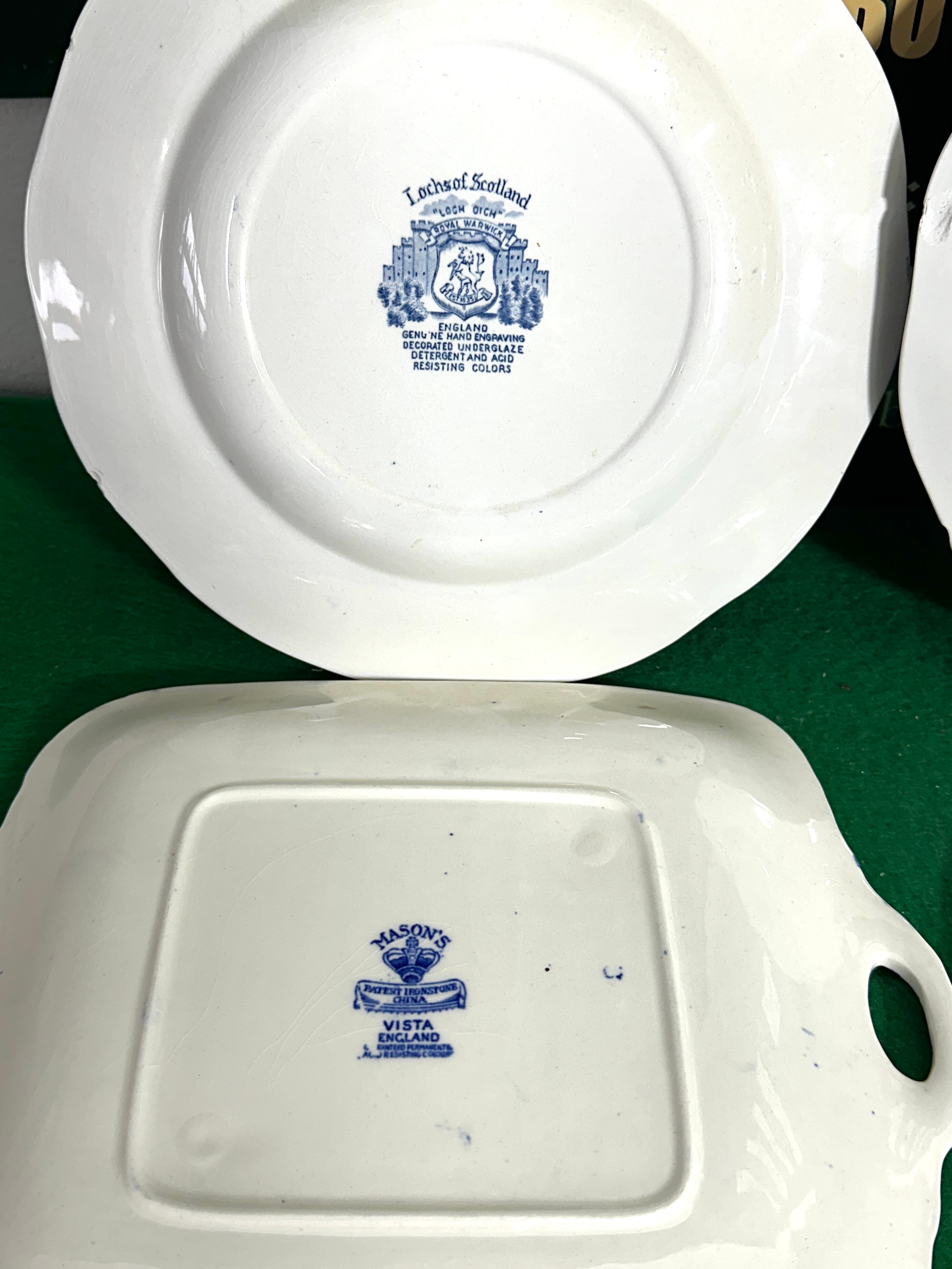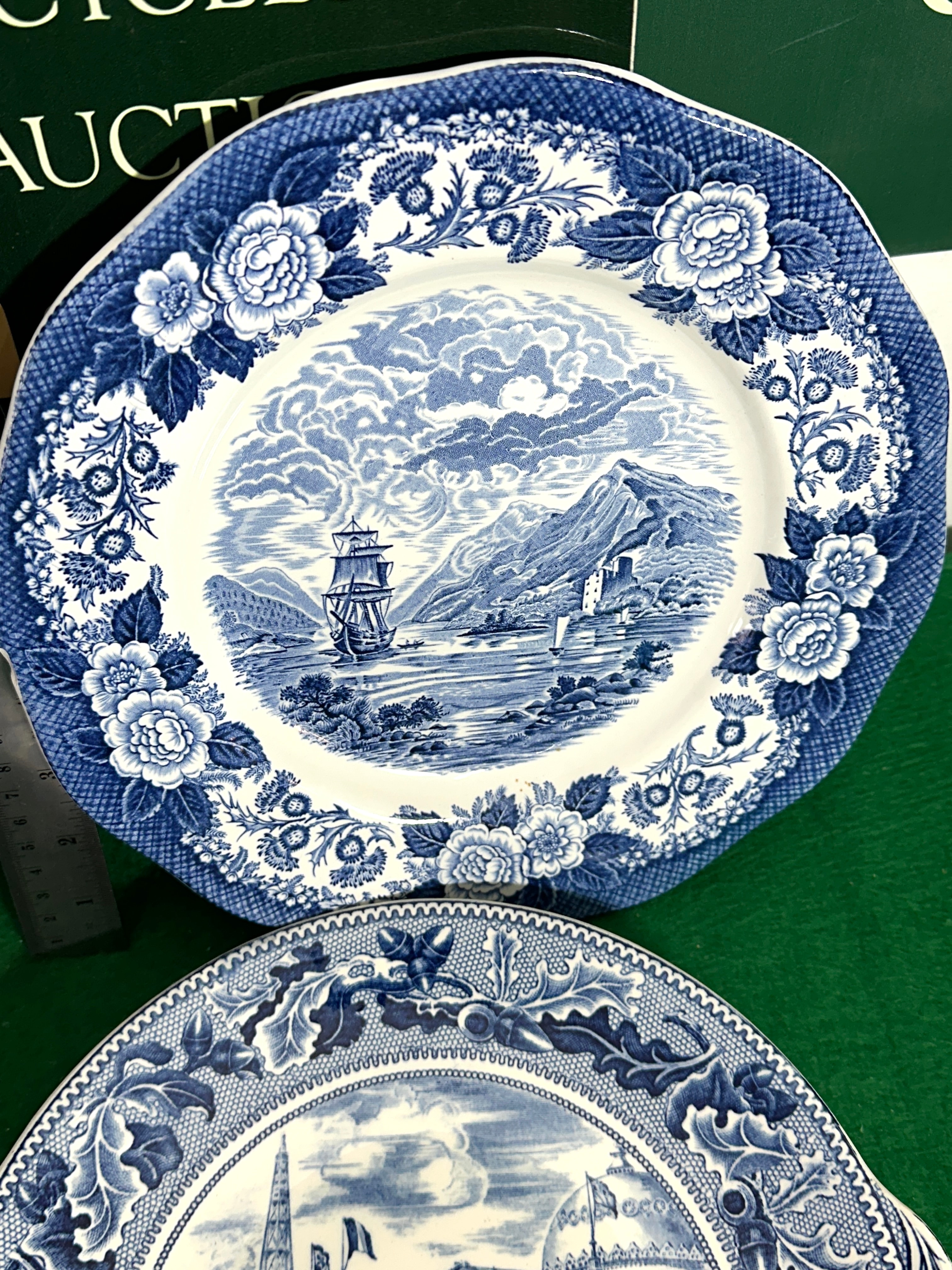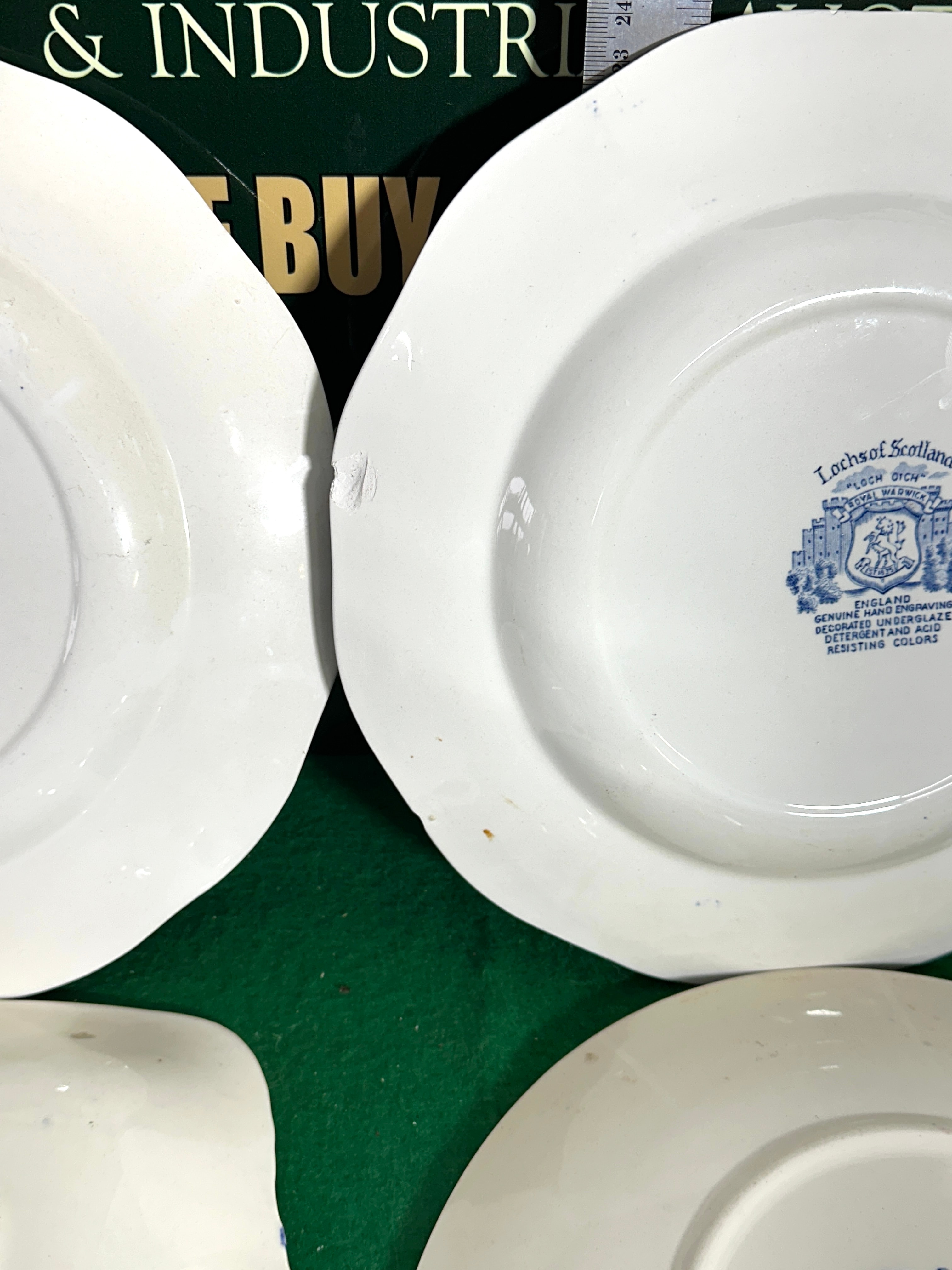 One scalloped-edge plate features a transfer-printed scene of a sailing ship on a loch with a floral border, commonly known in the market as ‘Lochs of Scotland’ by Royal Warwick. The reverse is clearly marked ‘Lochsol Scotland WALSH BROS. ENGLAND’ with additional text ‘GENUINE HAND ENGRAVING, PERMANENT UNDERGLAZE, DISHWASHER & MICROWAVE RESISTING COLORS’.