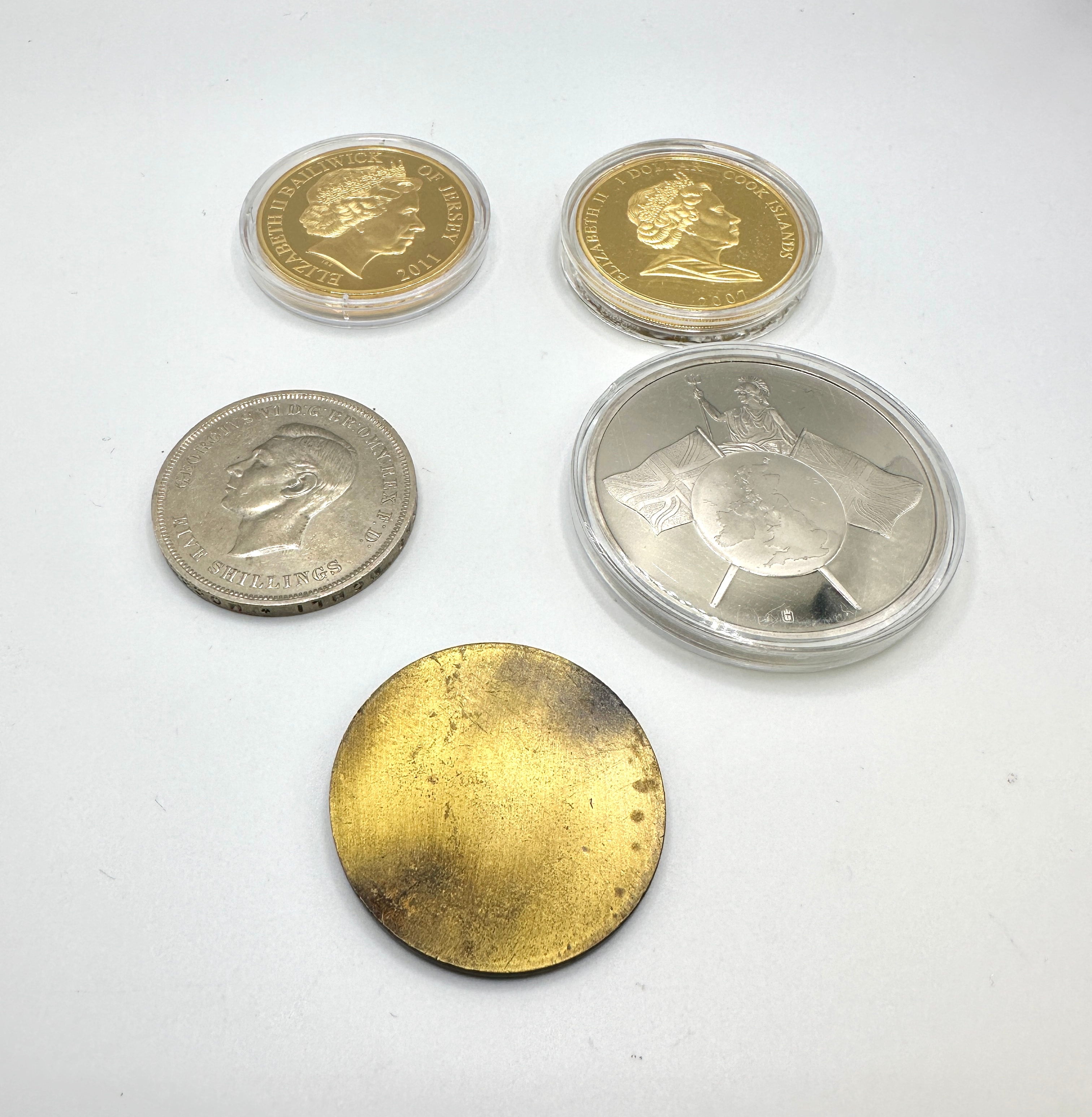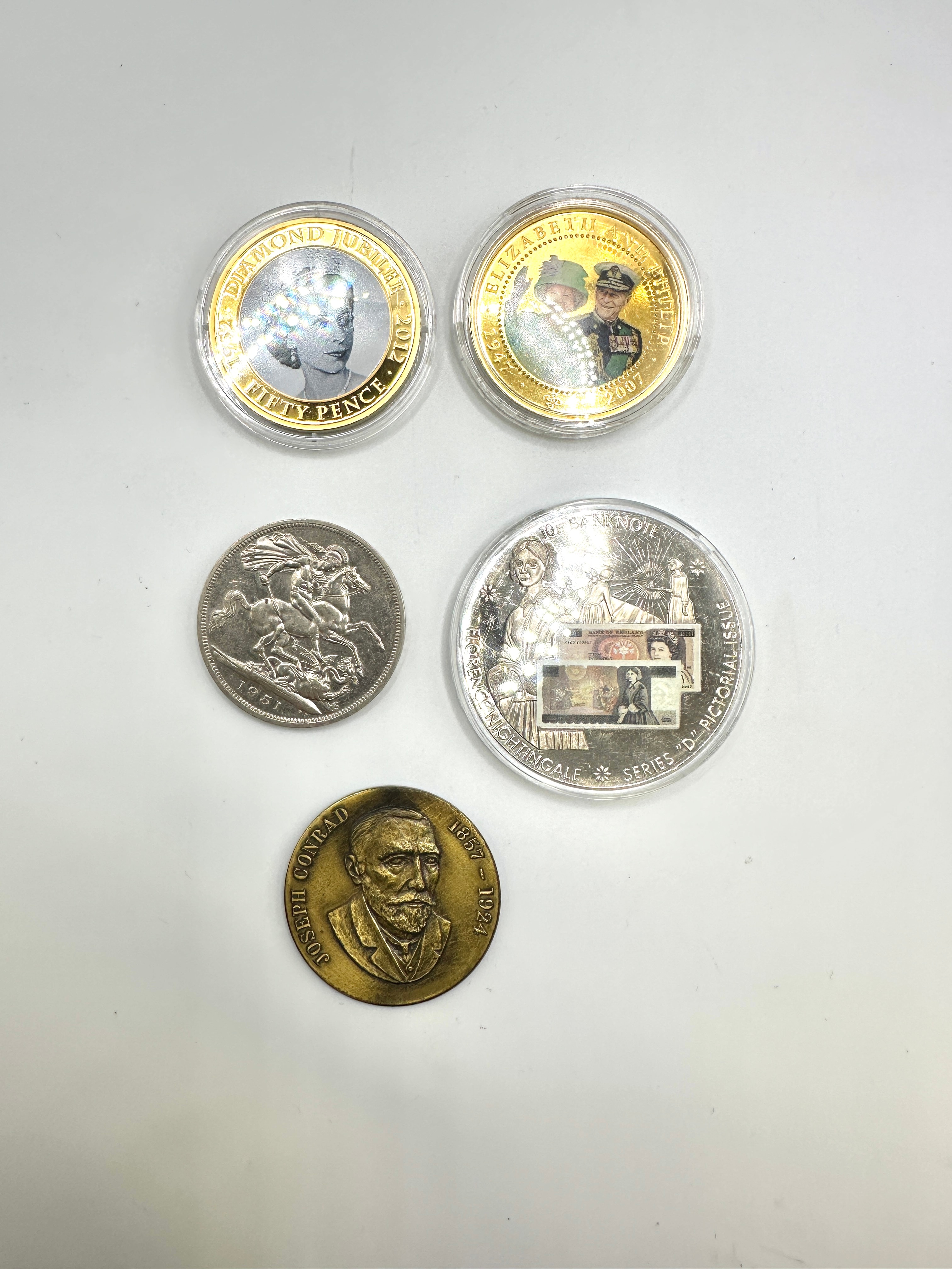 A collection of five numismatic items. The group is led by a large, silver-toned commemorative coin, identified through web intelligence as a British Banknote Coin Series ‘D’ Pictorial Issue Florence Nightingale. This encapsulated coin features an allegorical figure on its reverse and a multi-vignette design on its obverse themed “NIGHTINGALE” and “VICTORIAN,” with visible text indicating “BANK OF ENGLAND ONE POUND.” Also included are three modern commemorative bi-metallic coins, each encapsulated: a Queen Elizabeth II “Diamond Jubilee Fifty Pence” from 2012 (silver-toned center, gold-toned outer ring), a “Cook Islands” Queen Elizabeth II coin from 2007 (gold-toned center, silver-toned outer ring), and a “Bailiwick of Jersey” Queen Elizabeth II coin from 2011 (gold-toned center, silver-toned outer ring). The collection further comprises a 1951 silver-toned British “Two Shillings” coin, unencapsulated, depicting King George VI on the obverse with the inscription “GEORGIVS VI D:G:BR:OMN:REX F:D:IND:IMP.” and St. George and the Dragon on the reverse. The final item is an unencapsulated bronze-toned medallion commemorating “JOSEPH CONRAD 1857-1924” with his portrait on the obverse and a blank reverse.