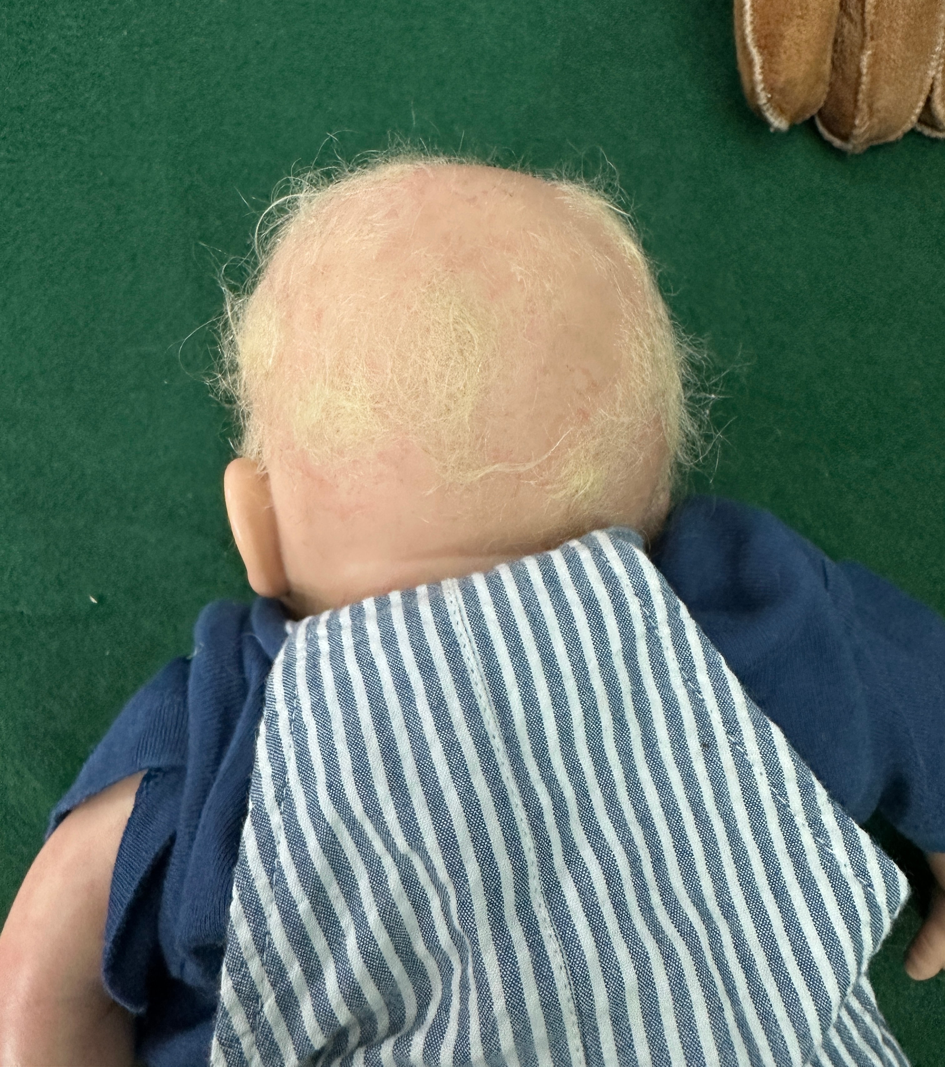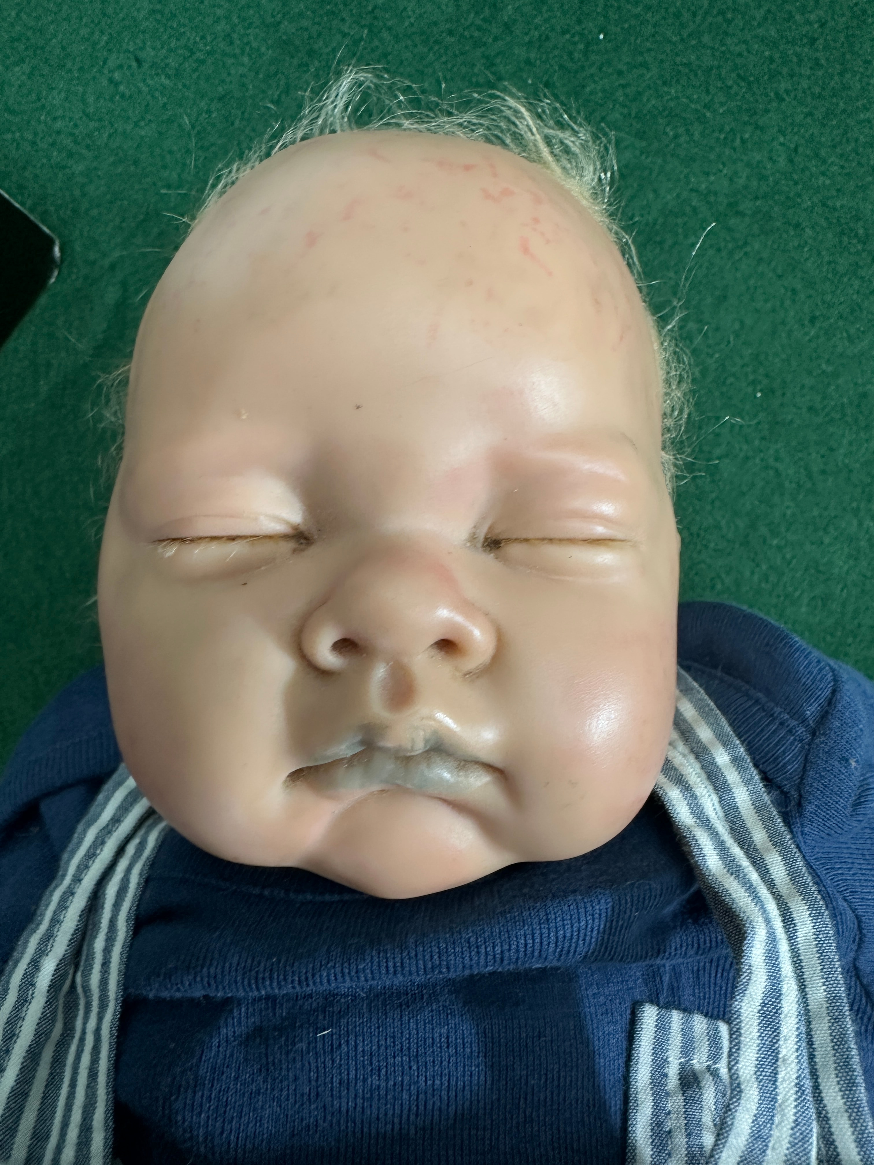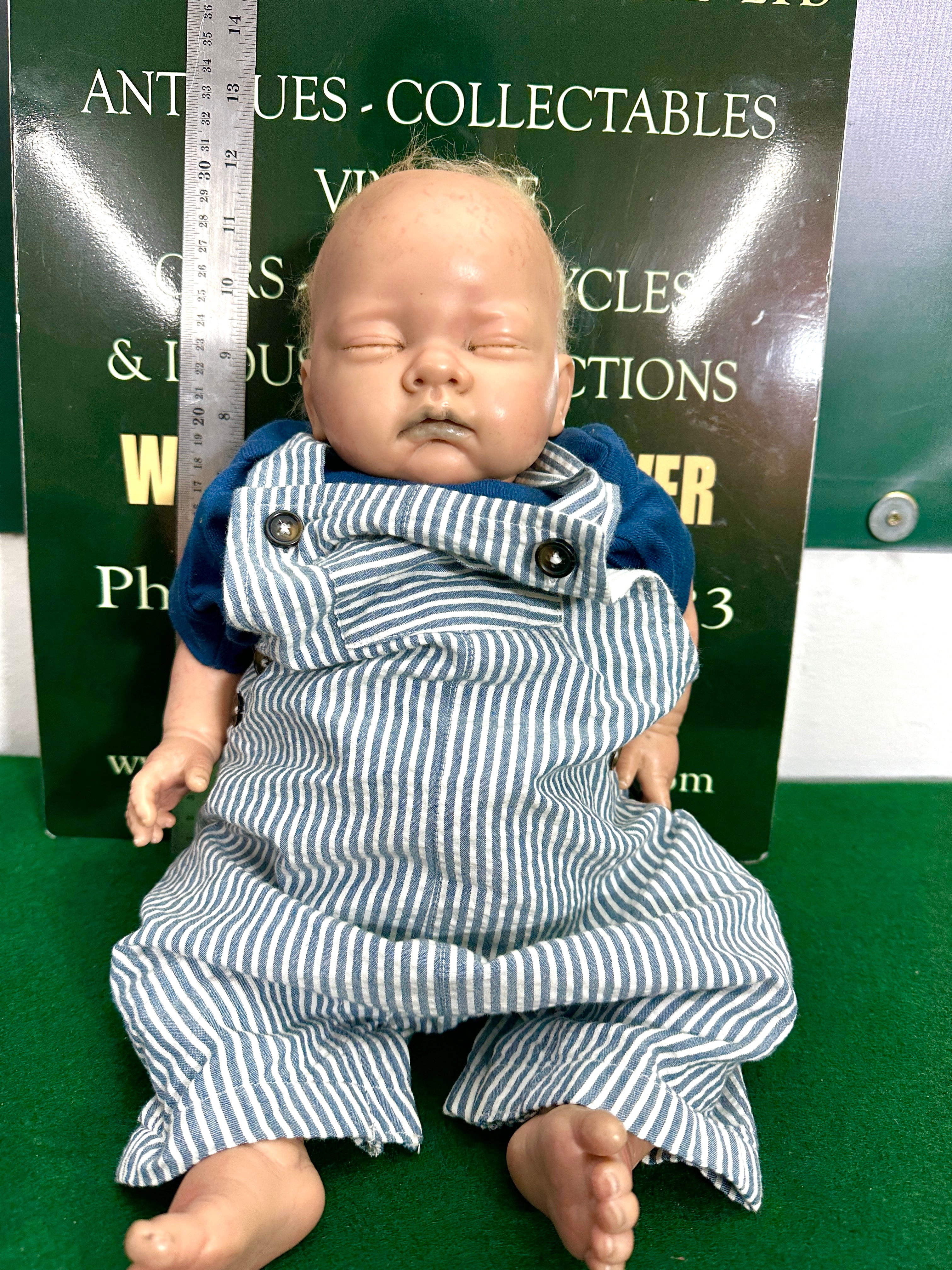 A realistic infant doll, likely a reborn type, depicting a sleeping baby with closed eyes and sparse, rooted blonde hair. The doll features soft-feel skin, composed of silicone or vinyl, and is dressed in a blue long-sleeved shirt beneath blue and white striped overalls with two visible dark buttons. No manufacturer markings are visible on the doll itself.