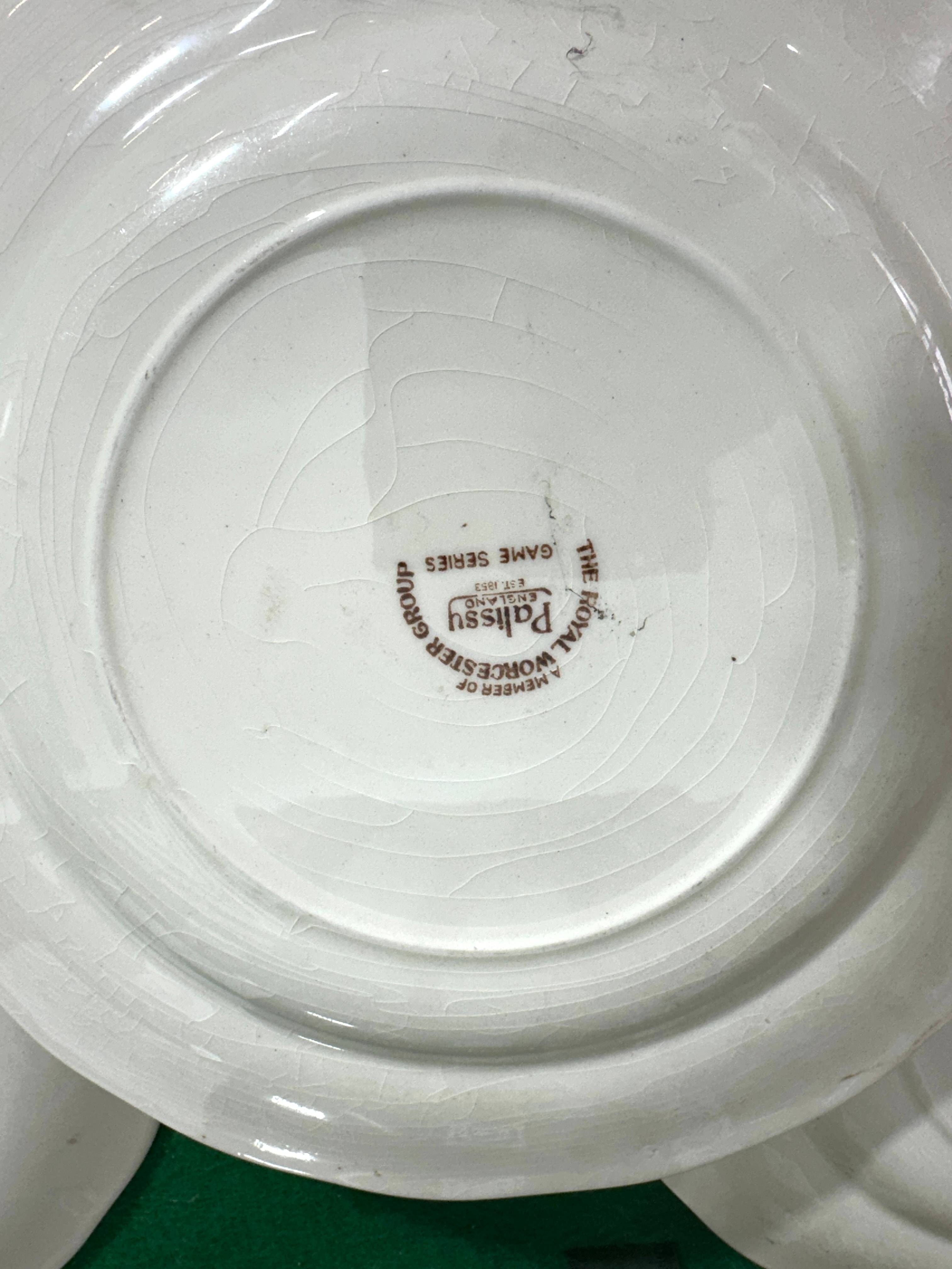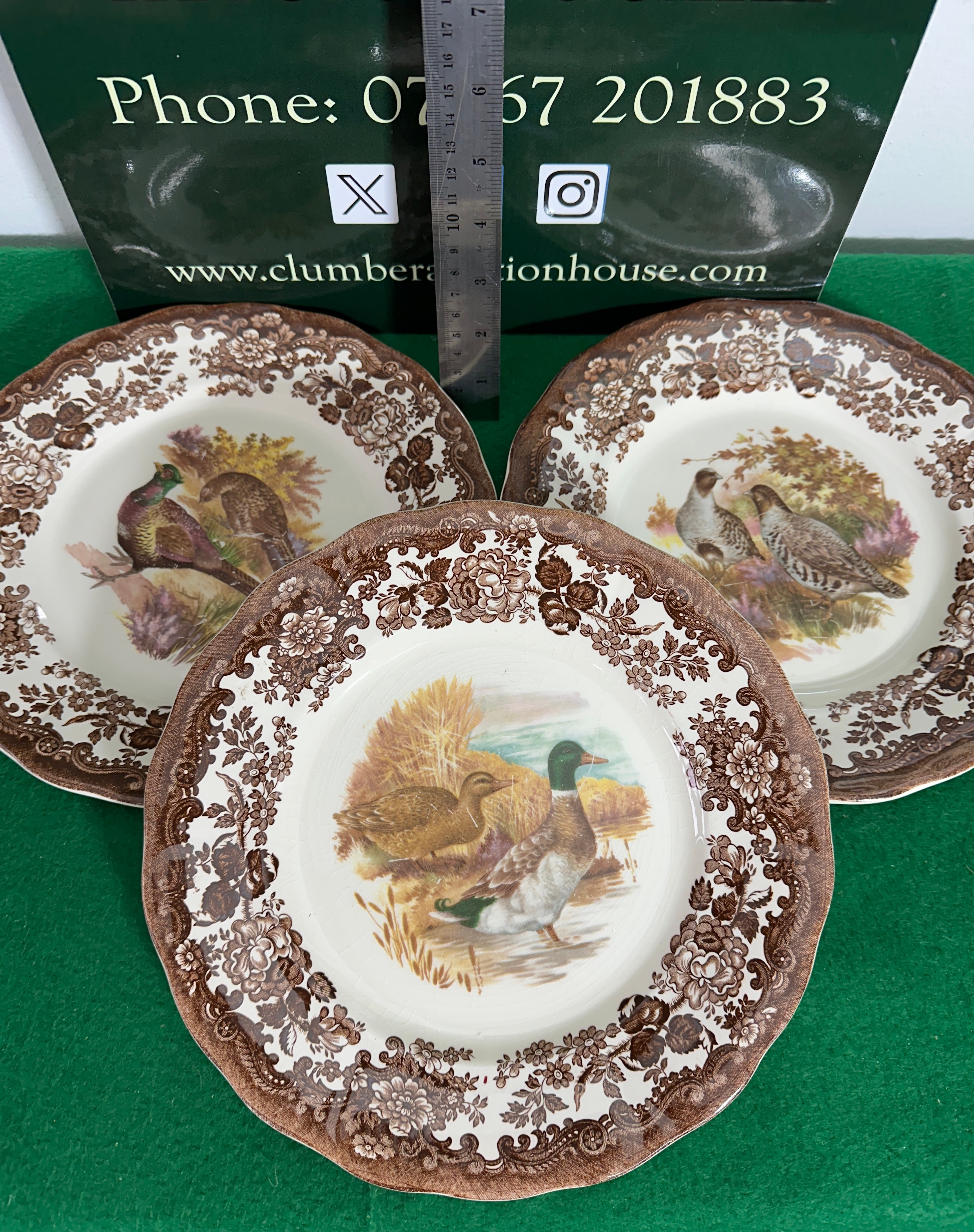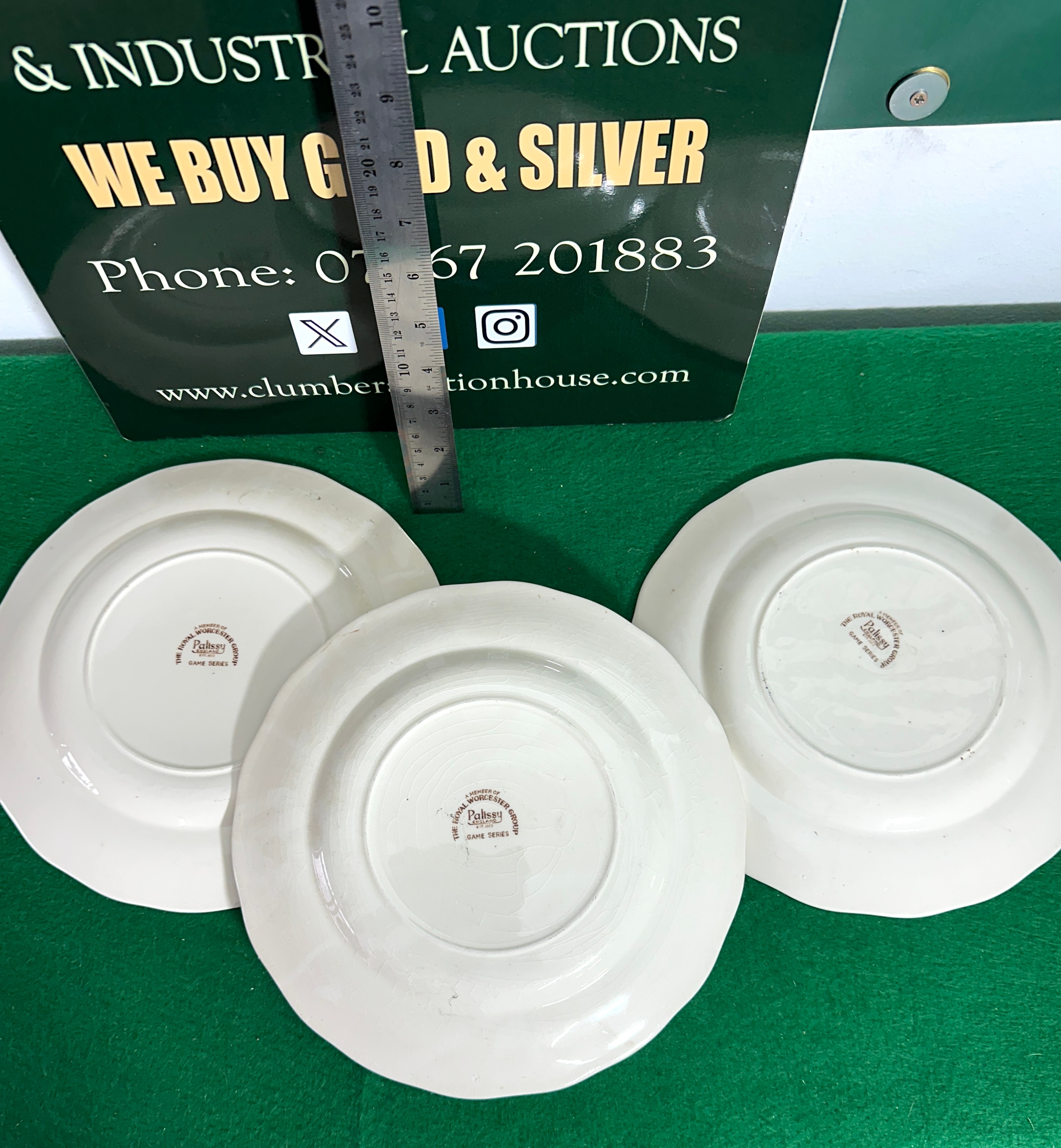 A set of three Palissy ‘Game Series (Birds)’ luncheon plates. Each ceramic plate features a scalloped rim and a central polychrome transferware scene depicting various game birds, including pheasants, ducks, and quail/partridges, set within natural landscapes. The central image is framed by a repeating brown and white floral and foliate transferware pattern. The reverse of each plate bears the circular backstamp ‘THE ROYAL WORCESTER GROUP / A MEMBER OF Palissy / ENGLAND / EST 1853 / GAME SERIES’.