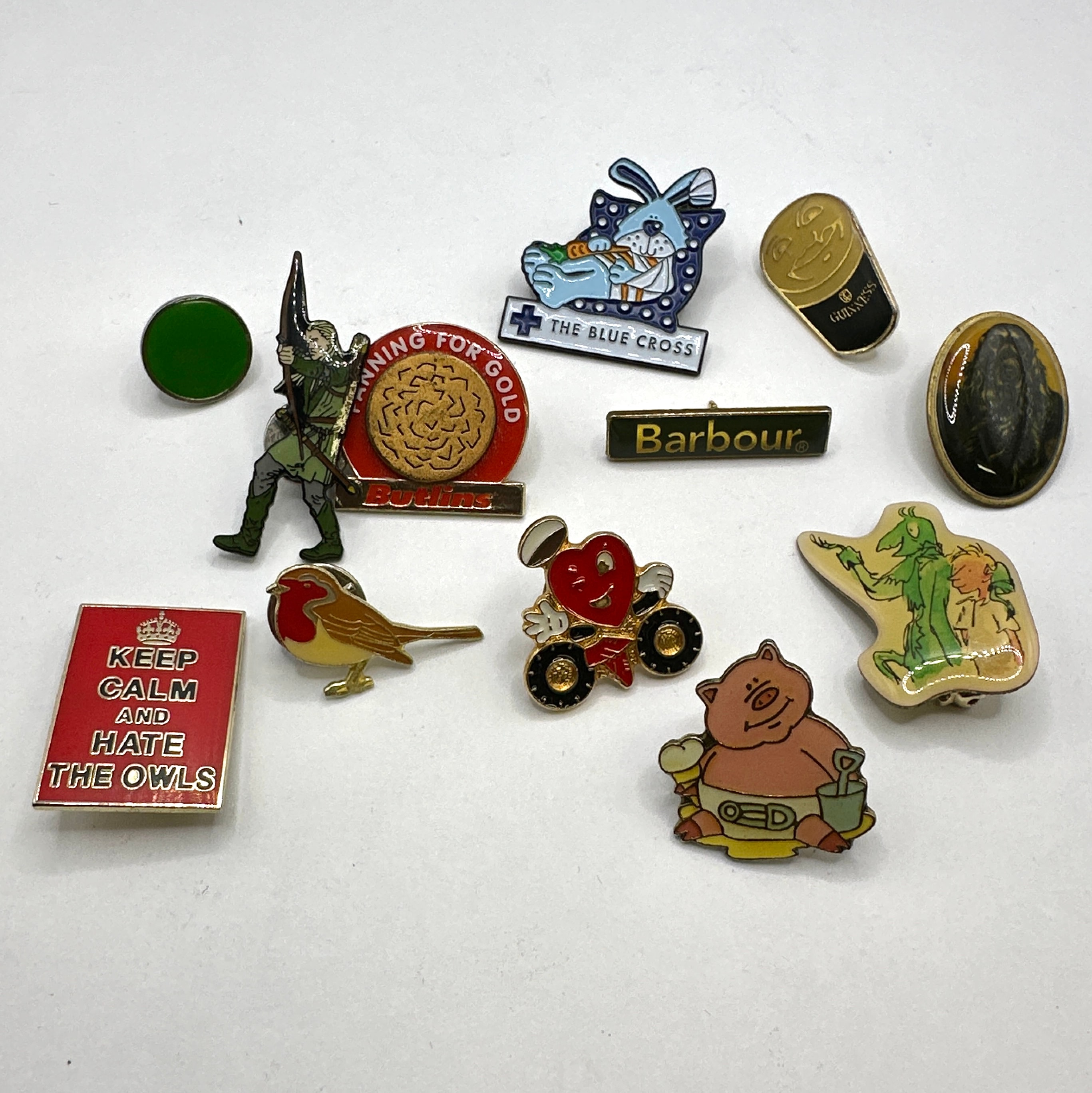 This collection comprises eleven assorted metal and enamel pins or badges, showcasing a variety of styles. Specific examples include a ‘Butlins’ pin depicting a miner with ‘PANNING FOR GOLD,’ a ‘THE BLUE CROSS’ blue rabbit, a stylized ‘GUINNESS’ can, a ‘Barbour’ branded bar, a red rectangular pin stating “KEEP CALM AND HATE THE OWLS” with a crown motif, a cartoon robin, a red heart on wheels, a whimsical pig in a diaper, a plain green circular pin, and a textured dark oval pin. The visible text is exclusively in English. The varied aesthetics suggest a period spanning the late 20th to early 21st century.