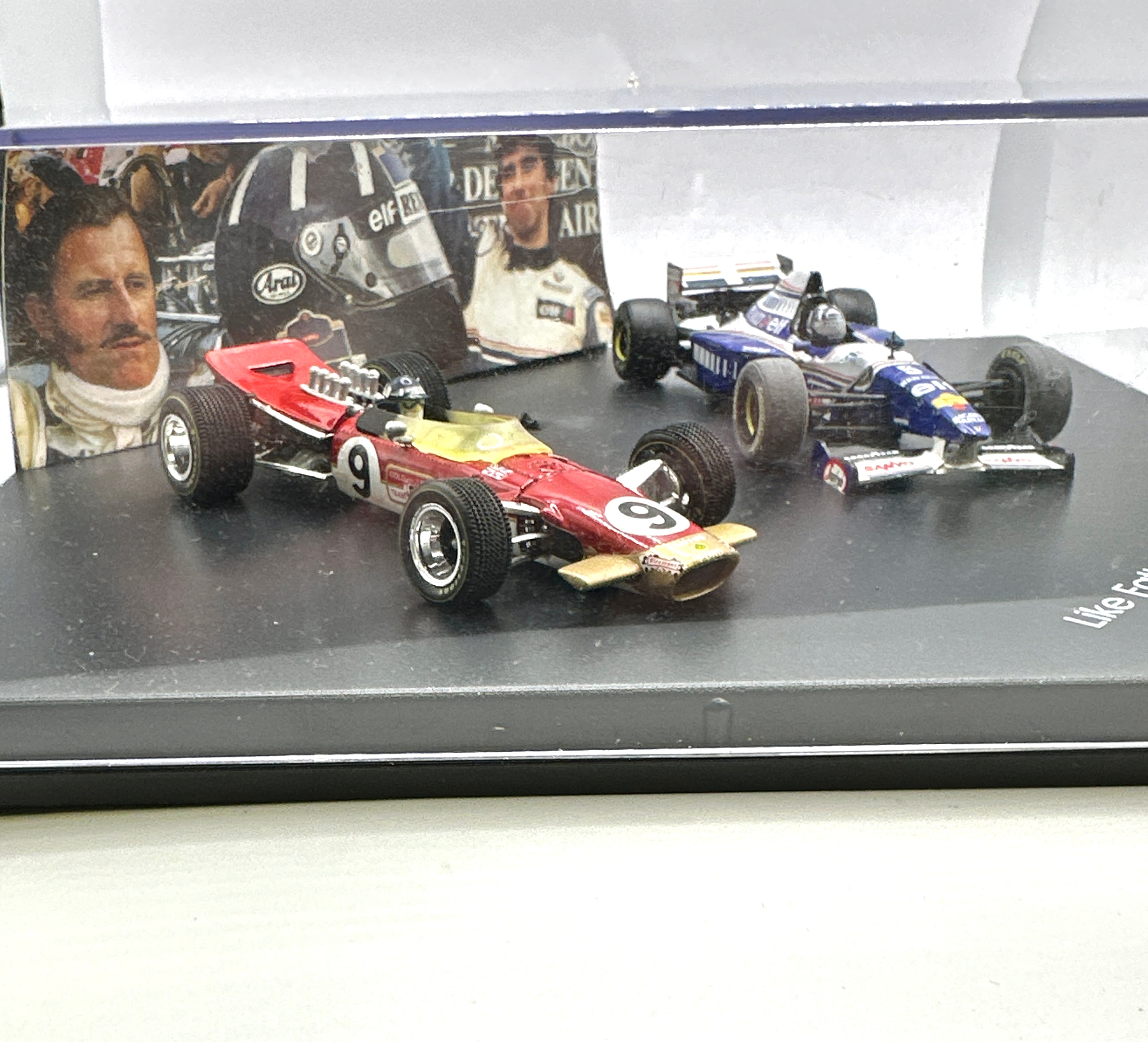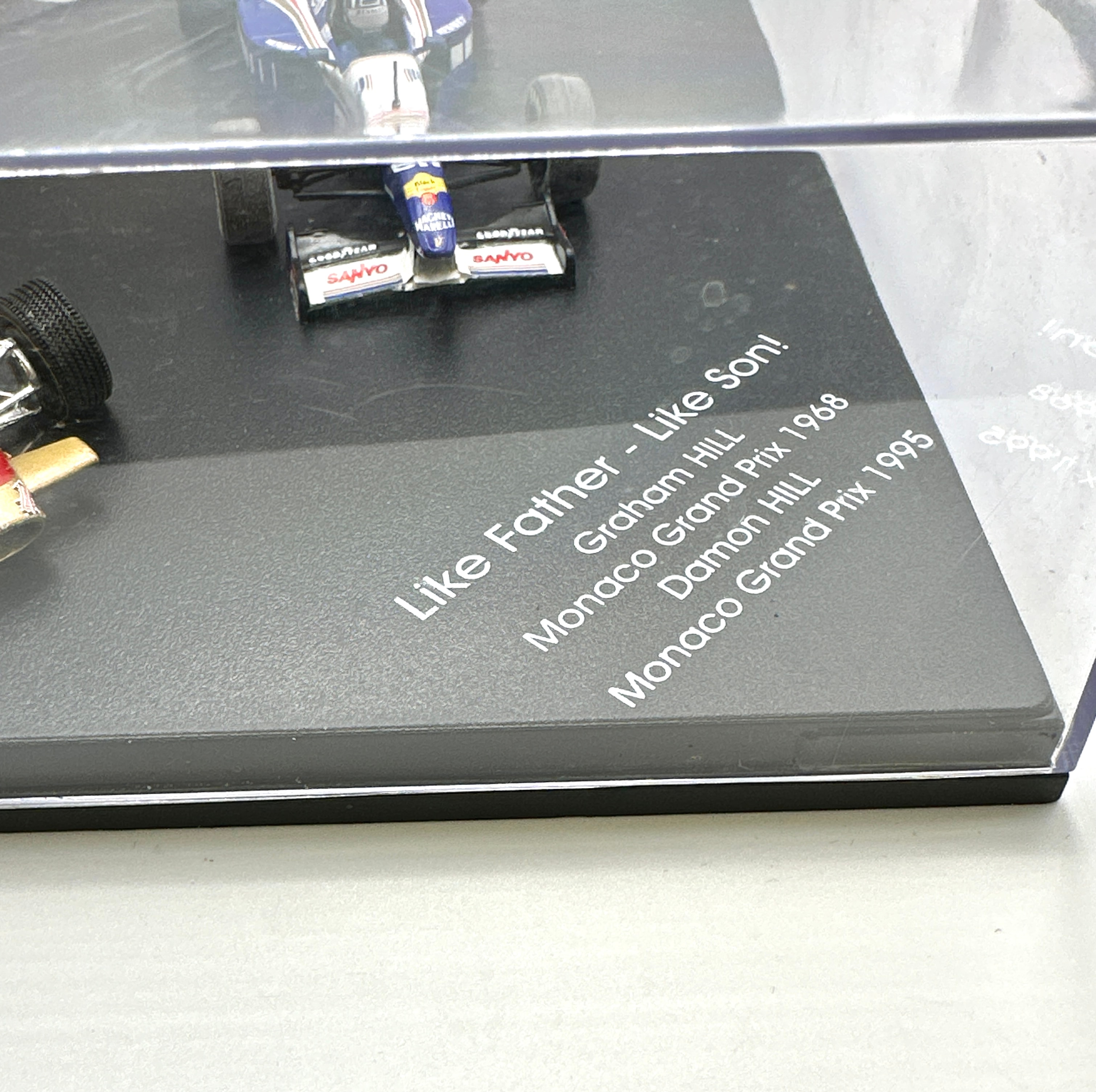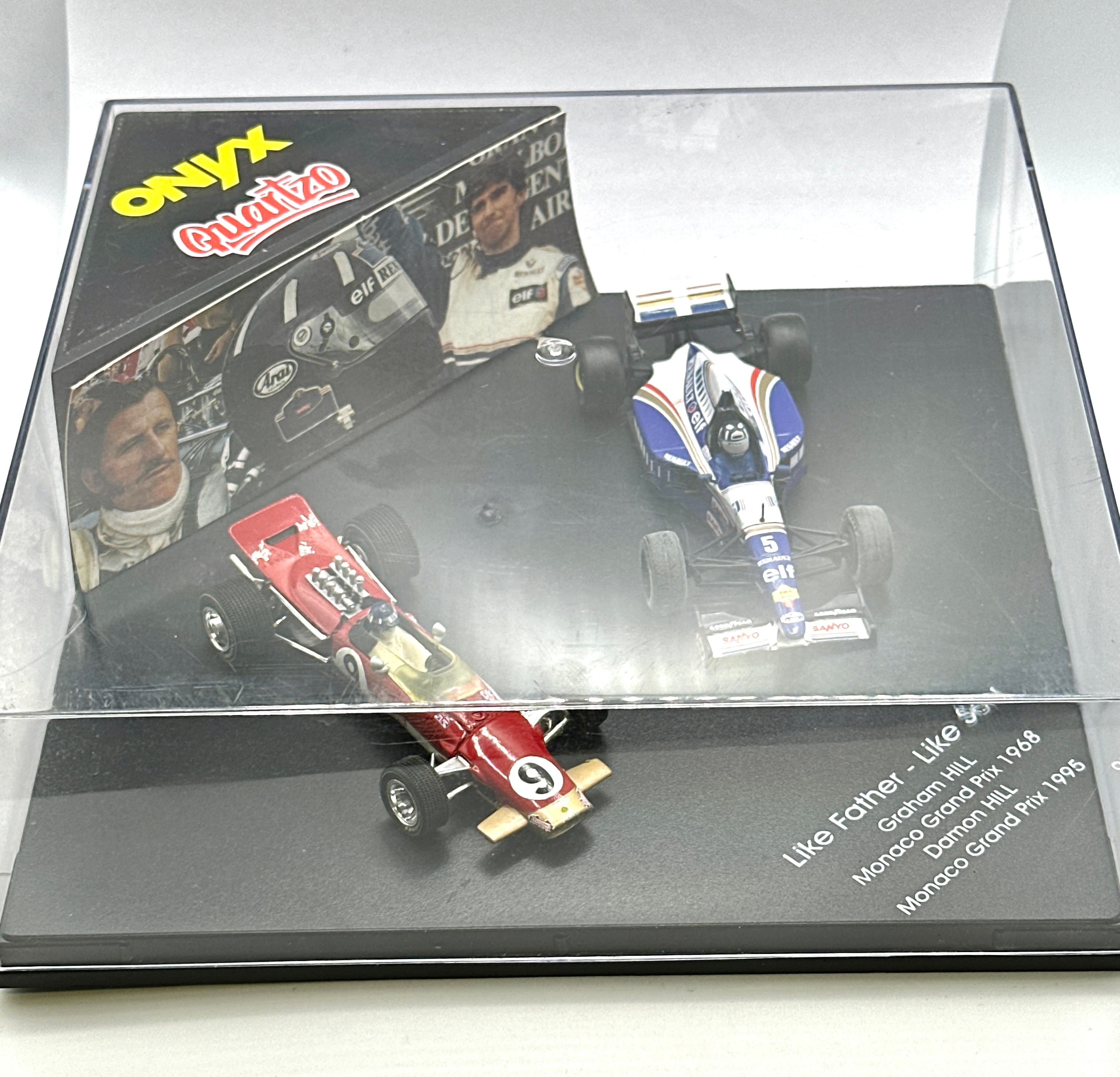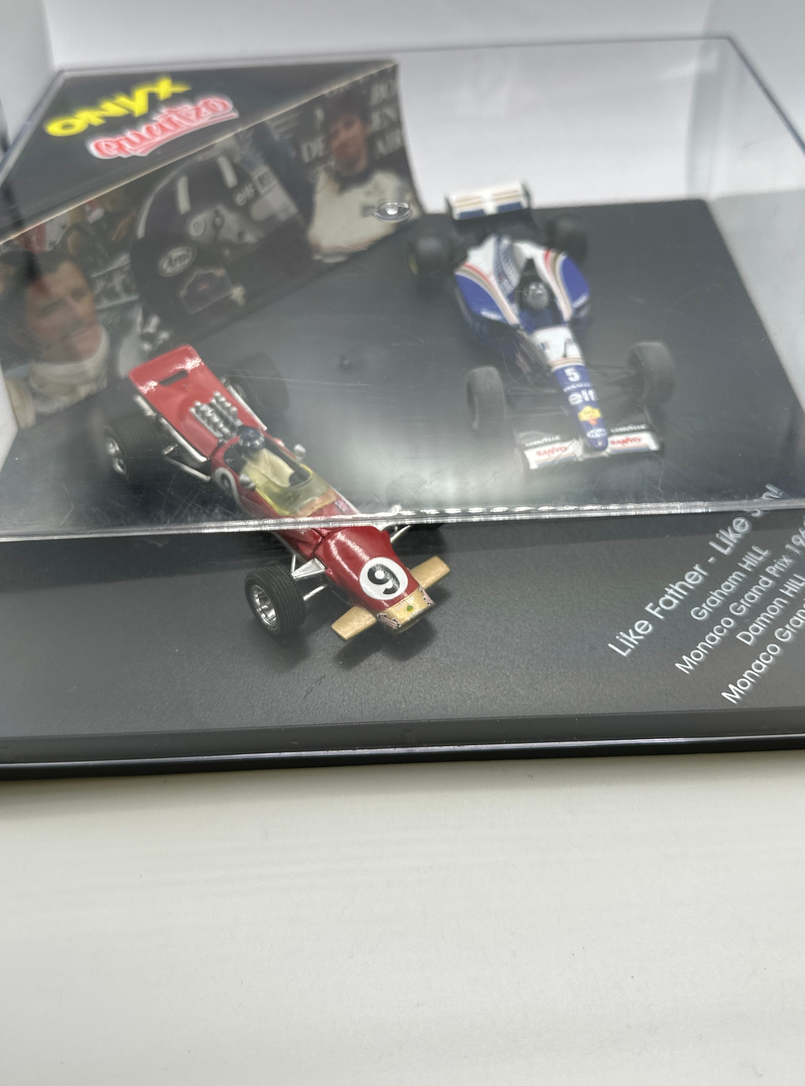 An ONYX (Quartzo) ‘Like Father – Like Son’ die-cast model car display set, featuring two Formula 1 racing cars. The set includes a vintage red open-wheel car bearing the number “9”, identified as “Graham Hill Monaco Grand Prix 1968”, and a more modern blue, white, and red F1 car with the number “5” and sponsor decals including “elf”, “SANYO”, and “GOOD YEAR”, identified as “Damon Hill Monaco Grand Prix 1995”. The models are presented within a clear plastic display case with a black base and a printed cardboard background. The background insert also depicts images of racing drivers and “elf”, “Arai” branding.