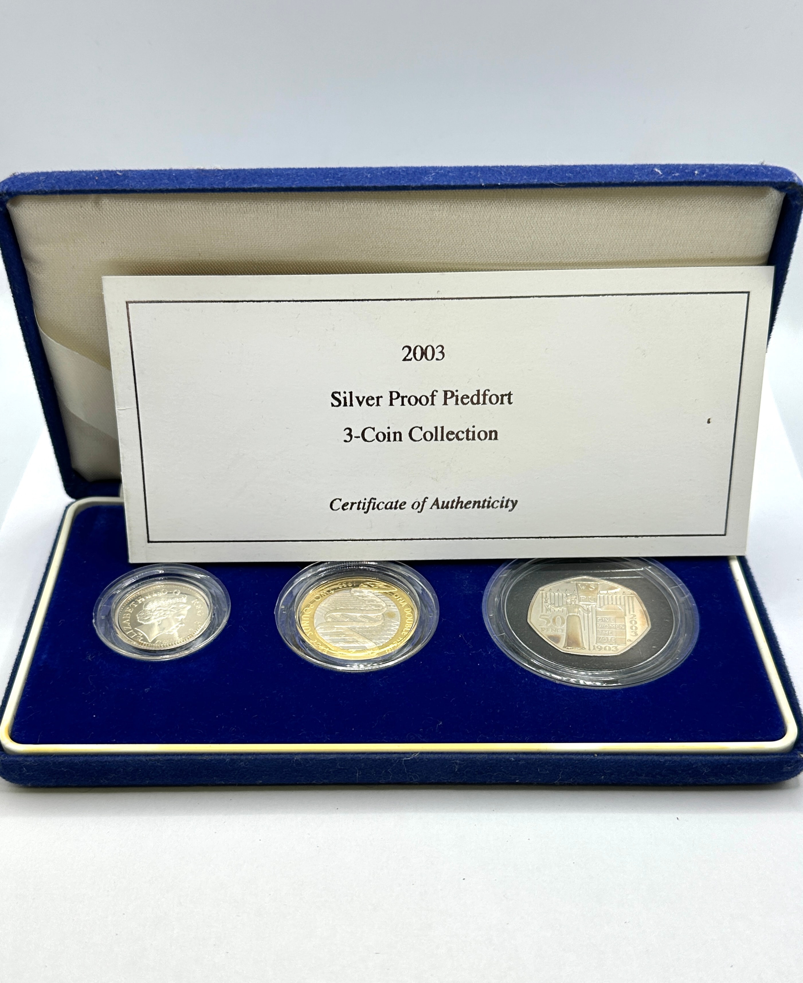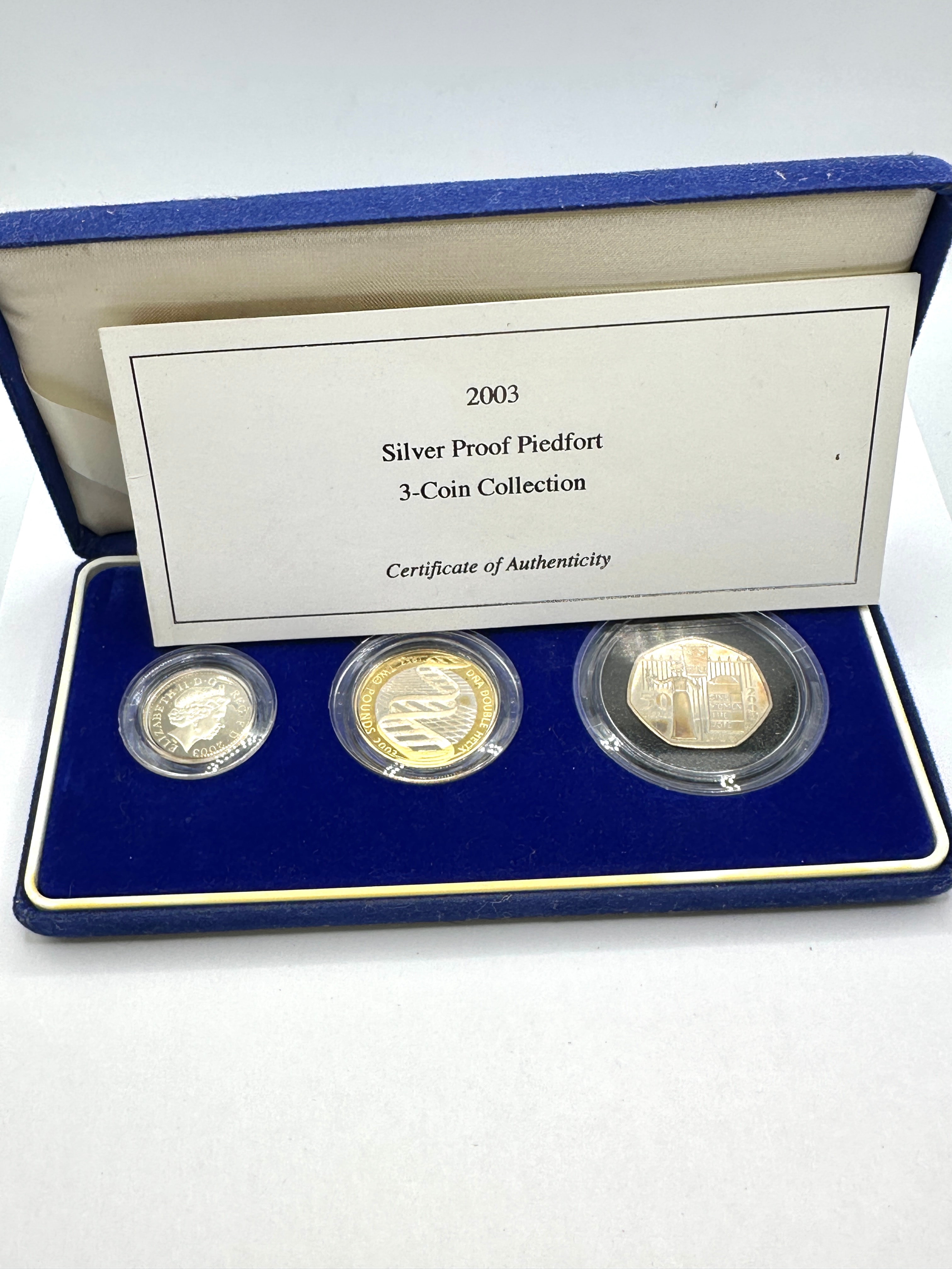 A 2003 Silver Proof Piedfort 3-Coin Collection, presented in a hinged, rectangular blue velvet/felt-covered display case with a fitted, velvet-lined interior. The collection comprises three encapsulated coins of varying sizes, accompanied by a “Certificate of Authenticity.” Visible details on the coins include a monarch’s profile with the inscription “ELIZABETH II D G REG F D,” a design featuring a bridge with “NEWFOUNDLAND 1903 2003,” and a cross motif with the year “2003.”