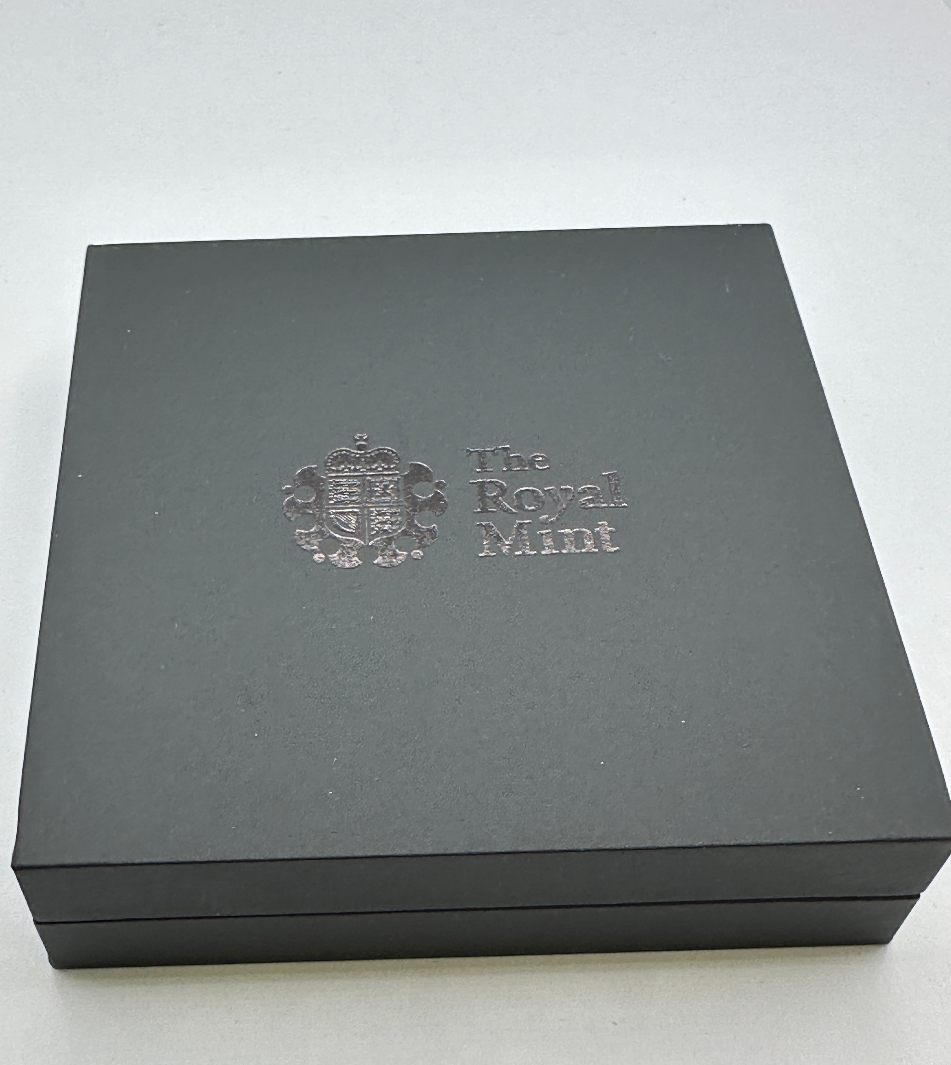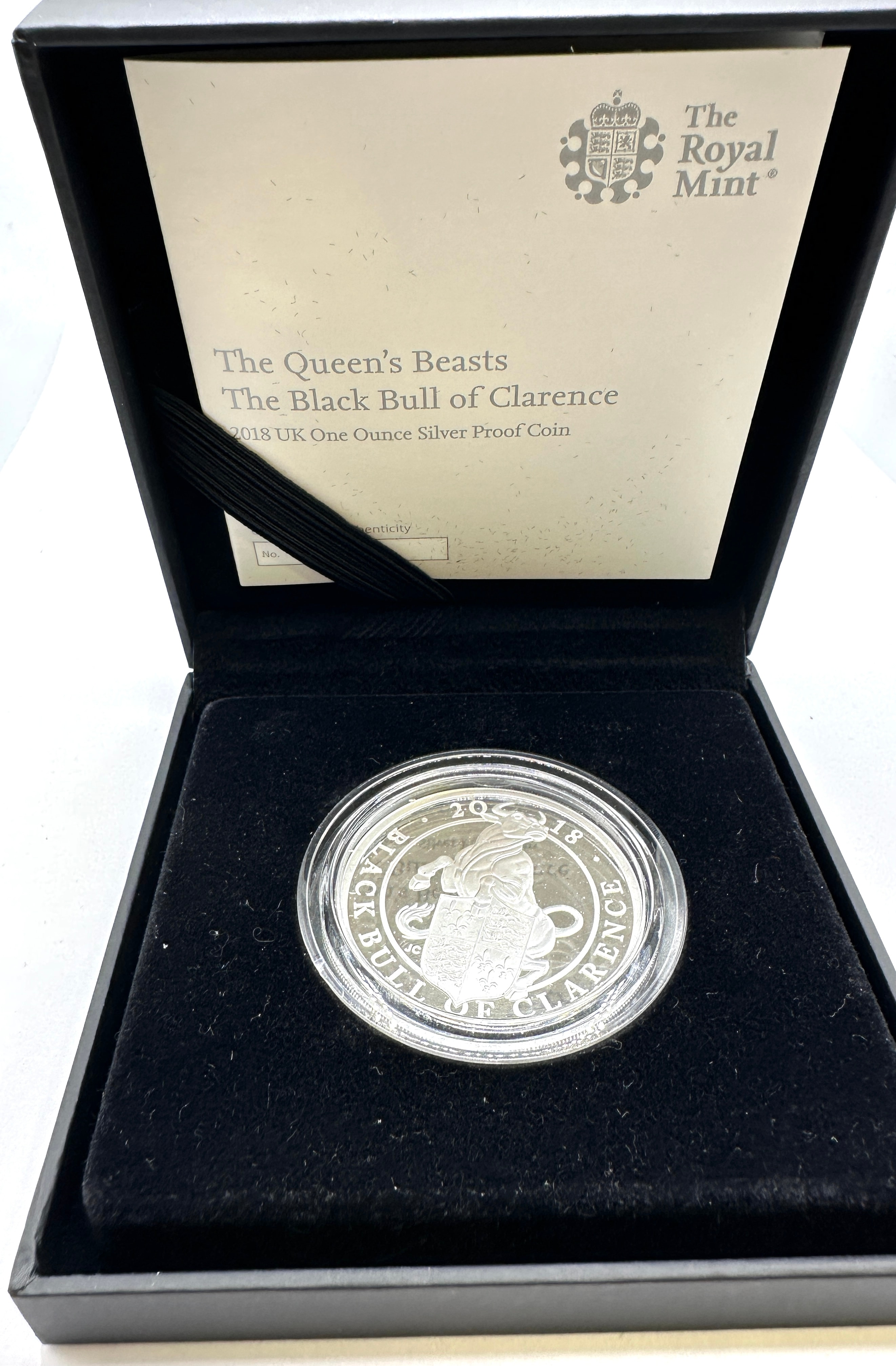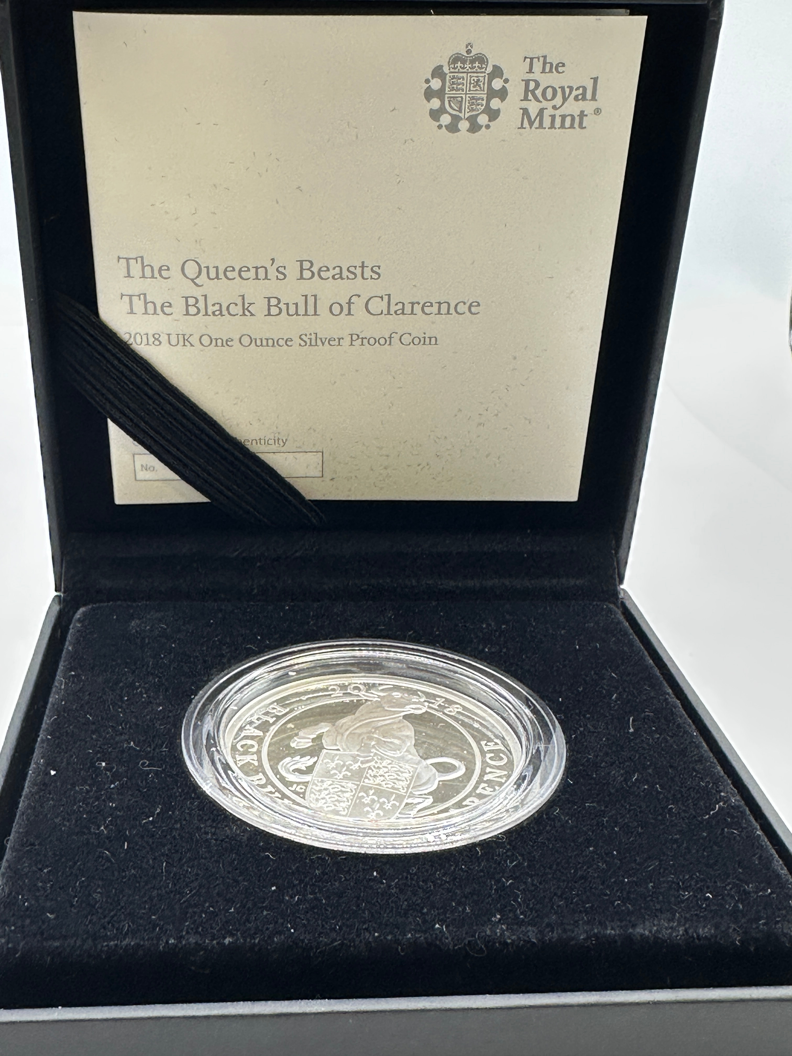 A 2018 UK One Ounce Silver Proof Coin from “The Queen’s Beasts” series, depicting “The Black Bull of Clarence.” The coin is encapsulated in clear plastic, displaying the year “2018” and “BLACK BULL OF CLARENCE” alongside a heraldic bull design. It is presented in its original black, velvet-lined presentation box, which features an embossed “The Royal Mint” logo on the lid, and includes an accompanying information card from The Royal Mint.