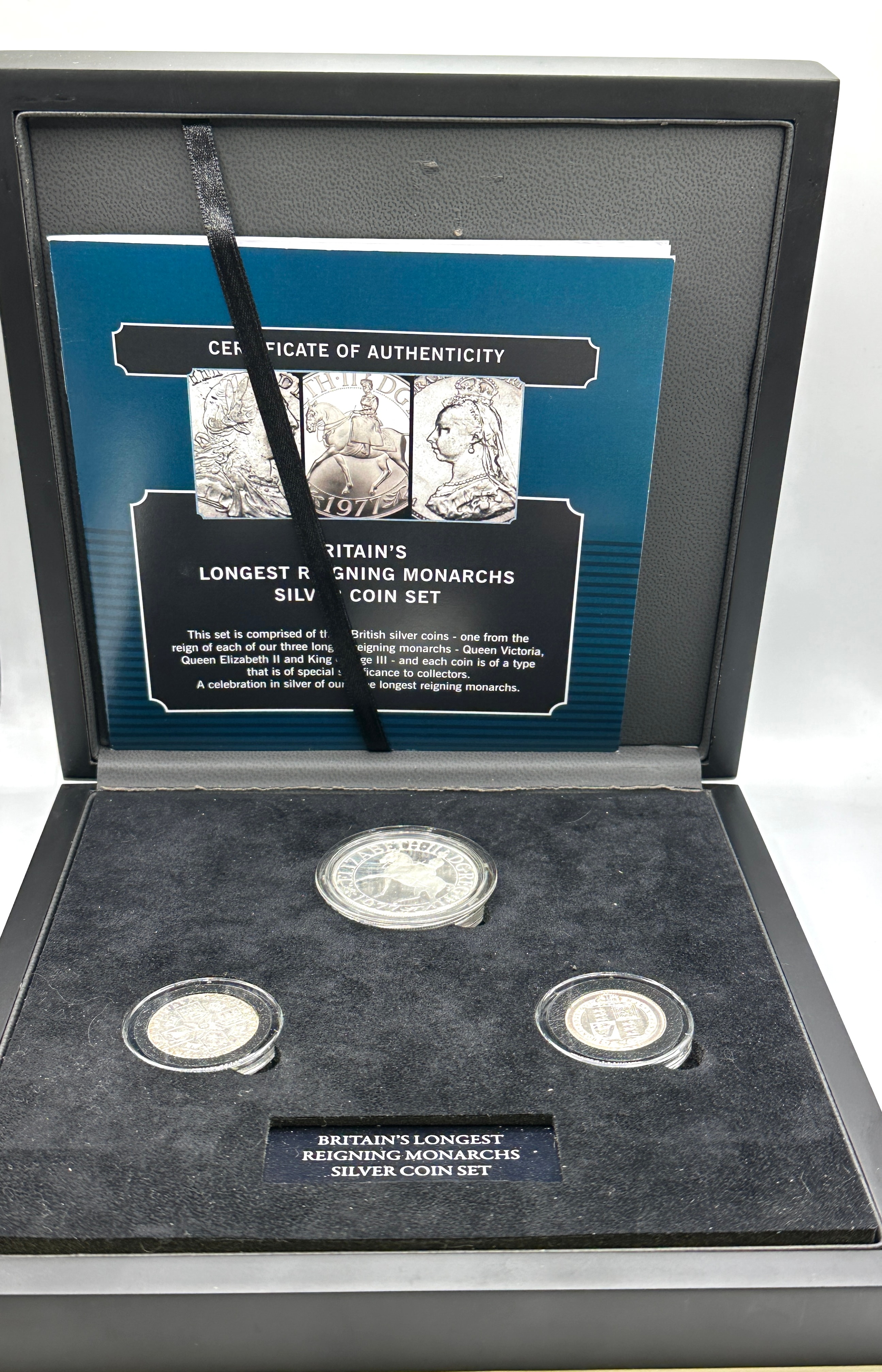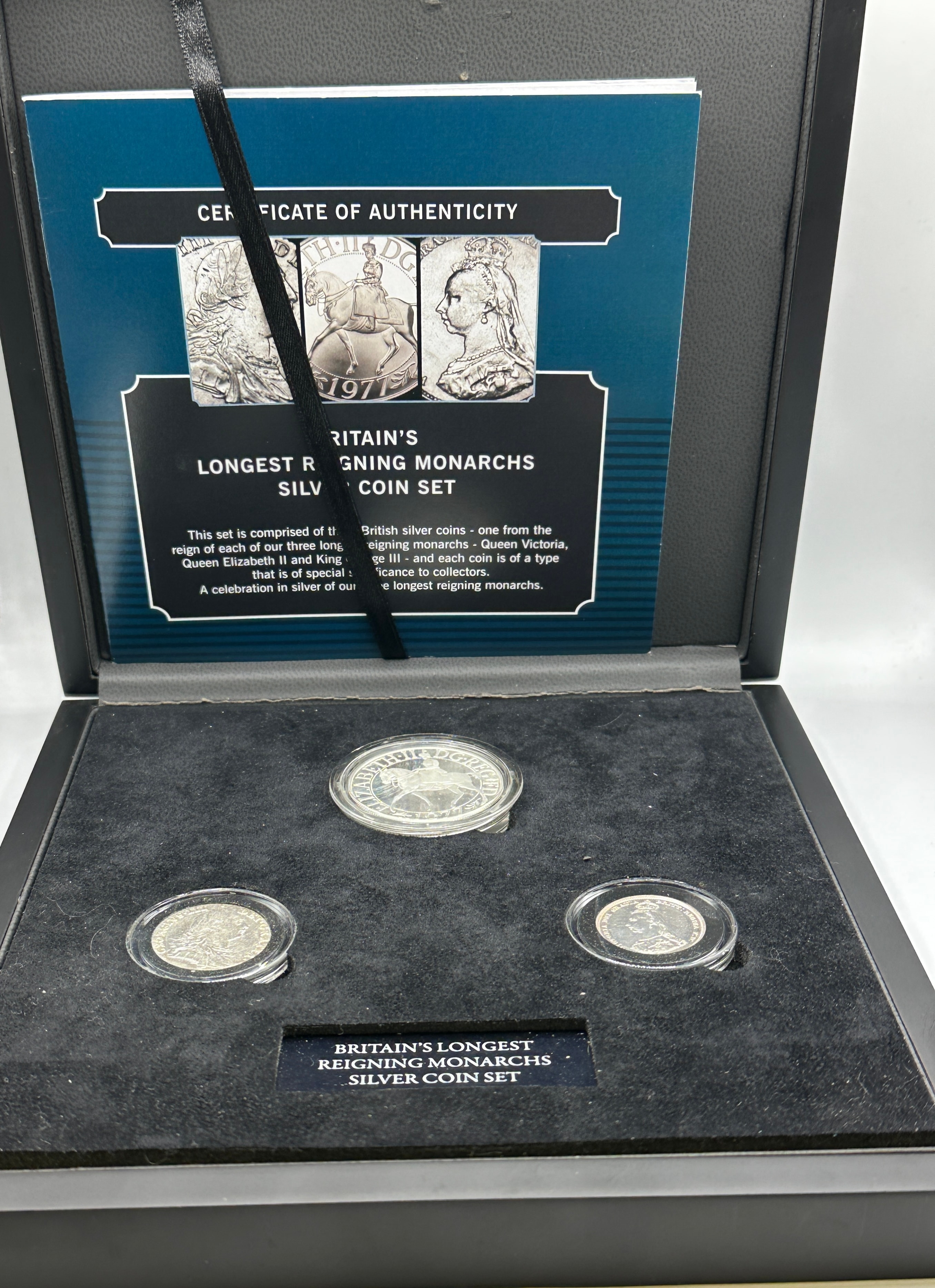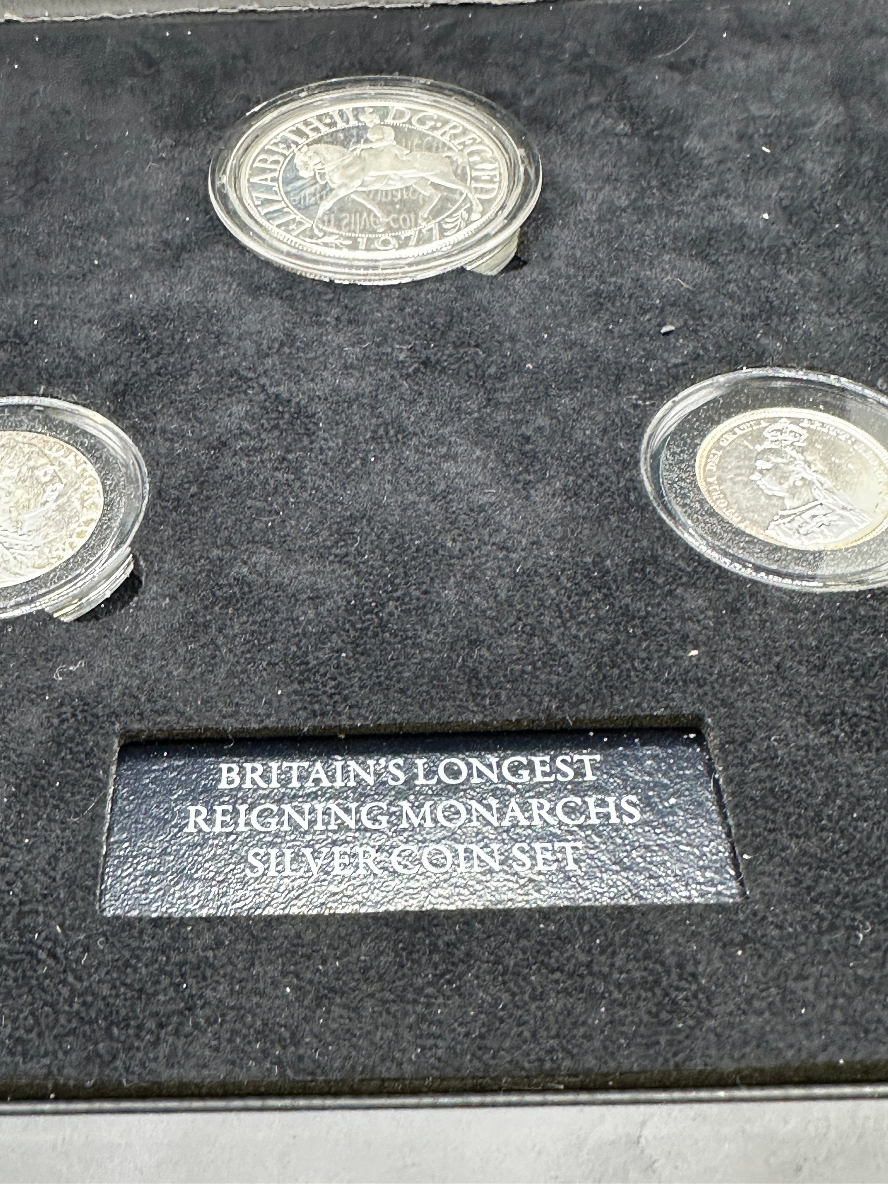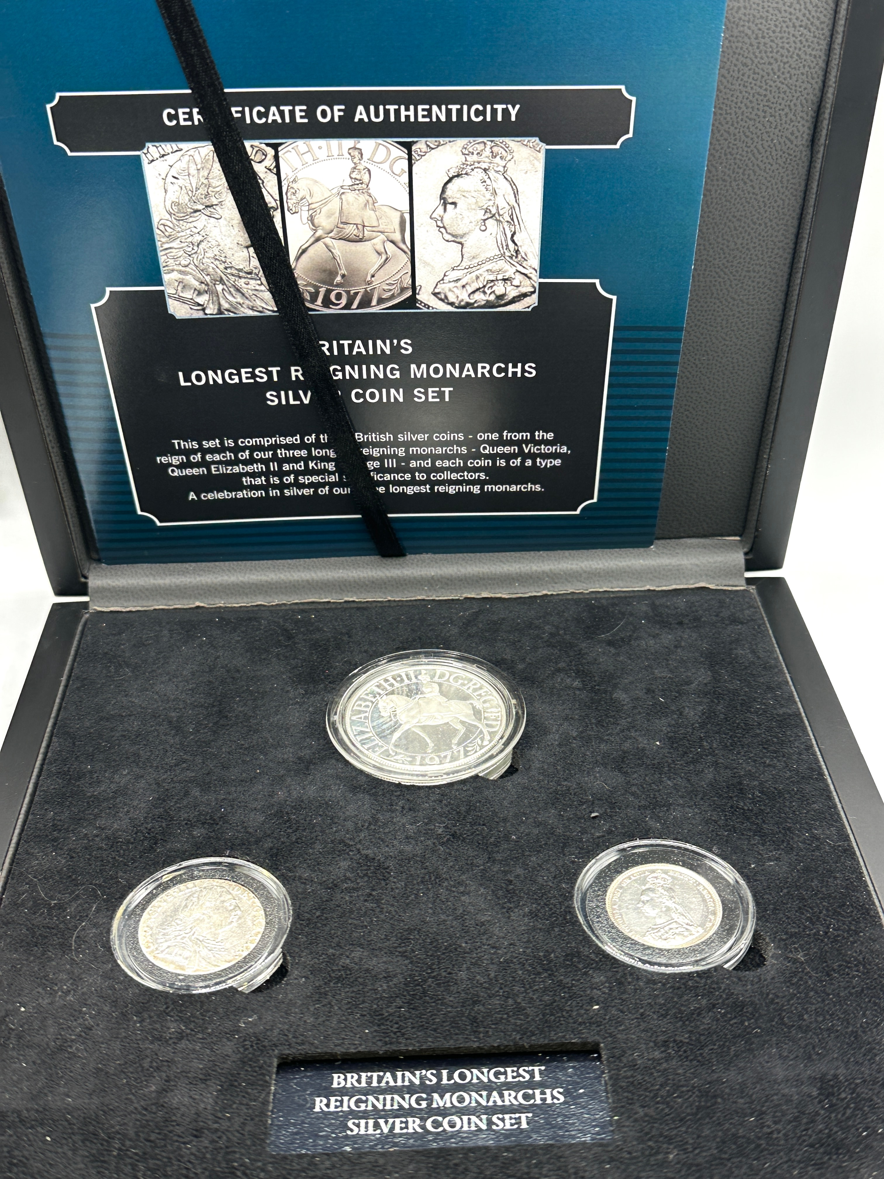 A ‘Britain’s Longest Reigning Monarchs Sterling Silver Coin Set’, presented in a matte black hinged display case with a black velvet-lined interior. The set contains three silver coins, each individually encapsulated in clear plastic. One coin depicts Queen Elizabeth II on horseback, with the inscription “ELIZABETH II D.G. REG F.D.”. Another coin shows a profile of Queen Victoria with “VICTORIA DEI GRATIA BRITT: REGINA F:D:”. The third coin’s monarch profile is less distinct. The inside of the case lid features a “CERTIFICATE OF AUTHENTICITY” and text further describing the set as a collection of “British silver coins” commemorating long-reigning monarchs including Queen Elizabeth II and Queen Victoria. An embedded plaque within the velvet interior reiterates the set’s title.