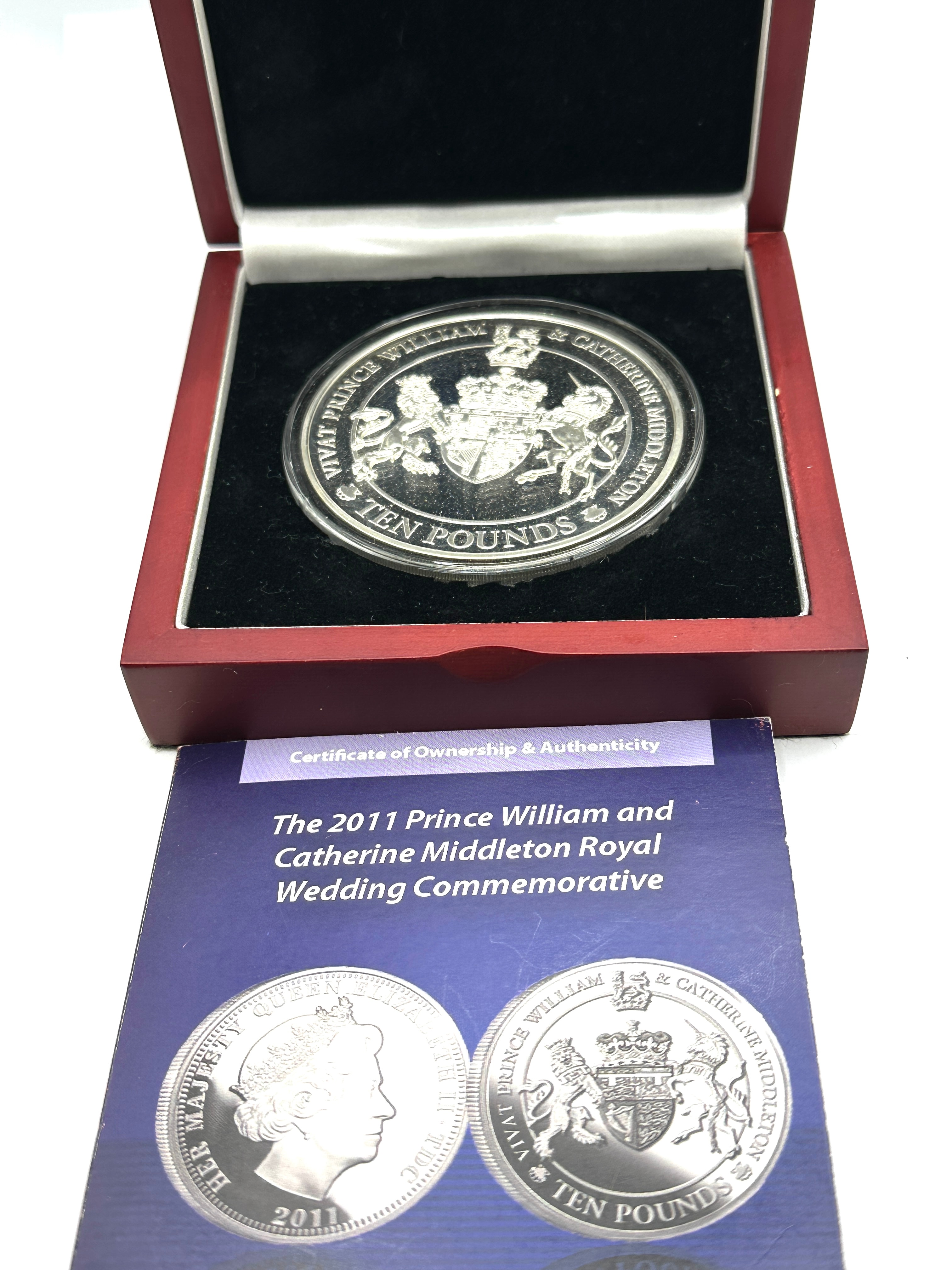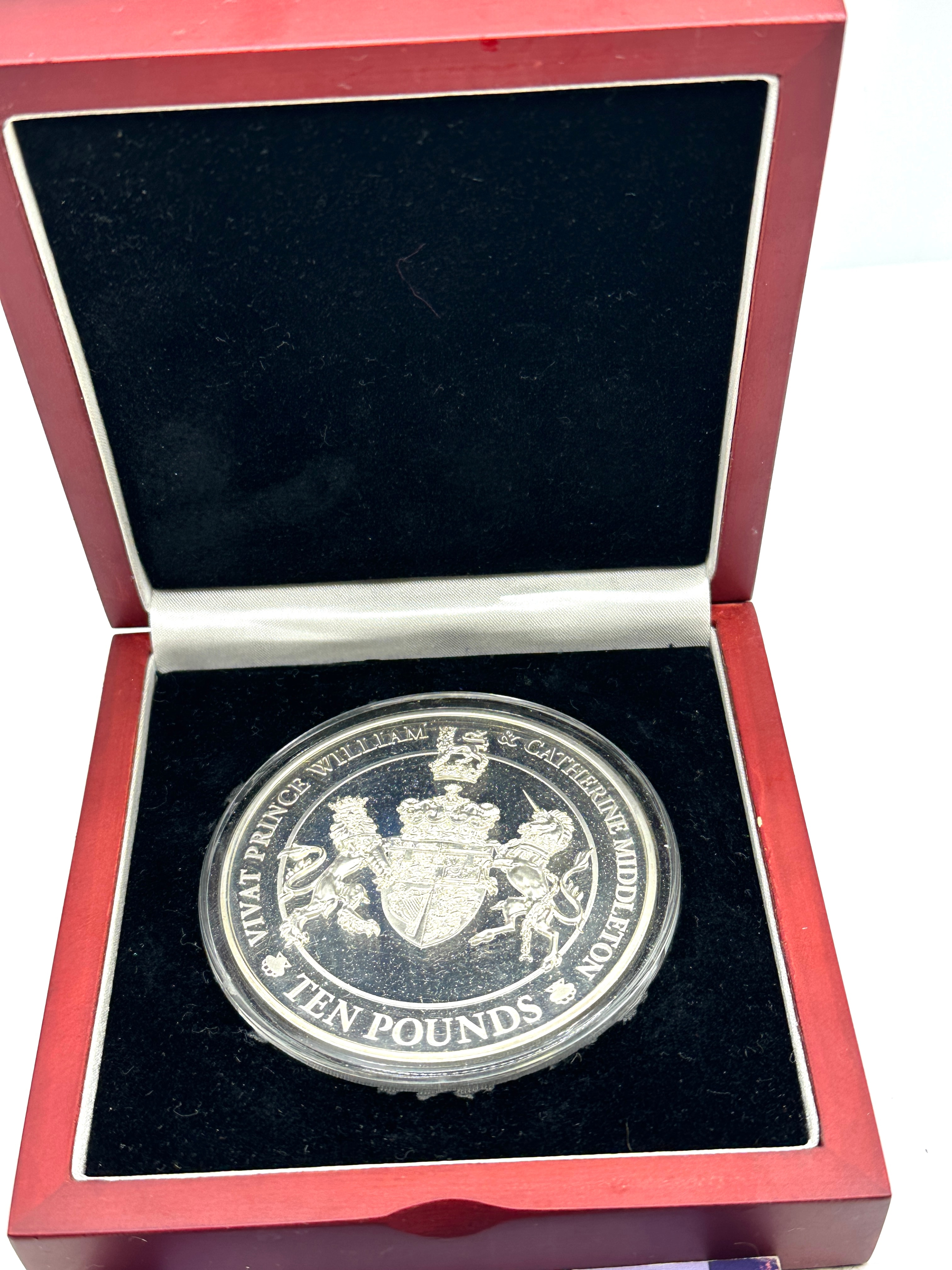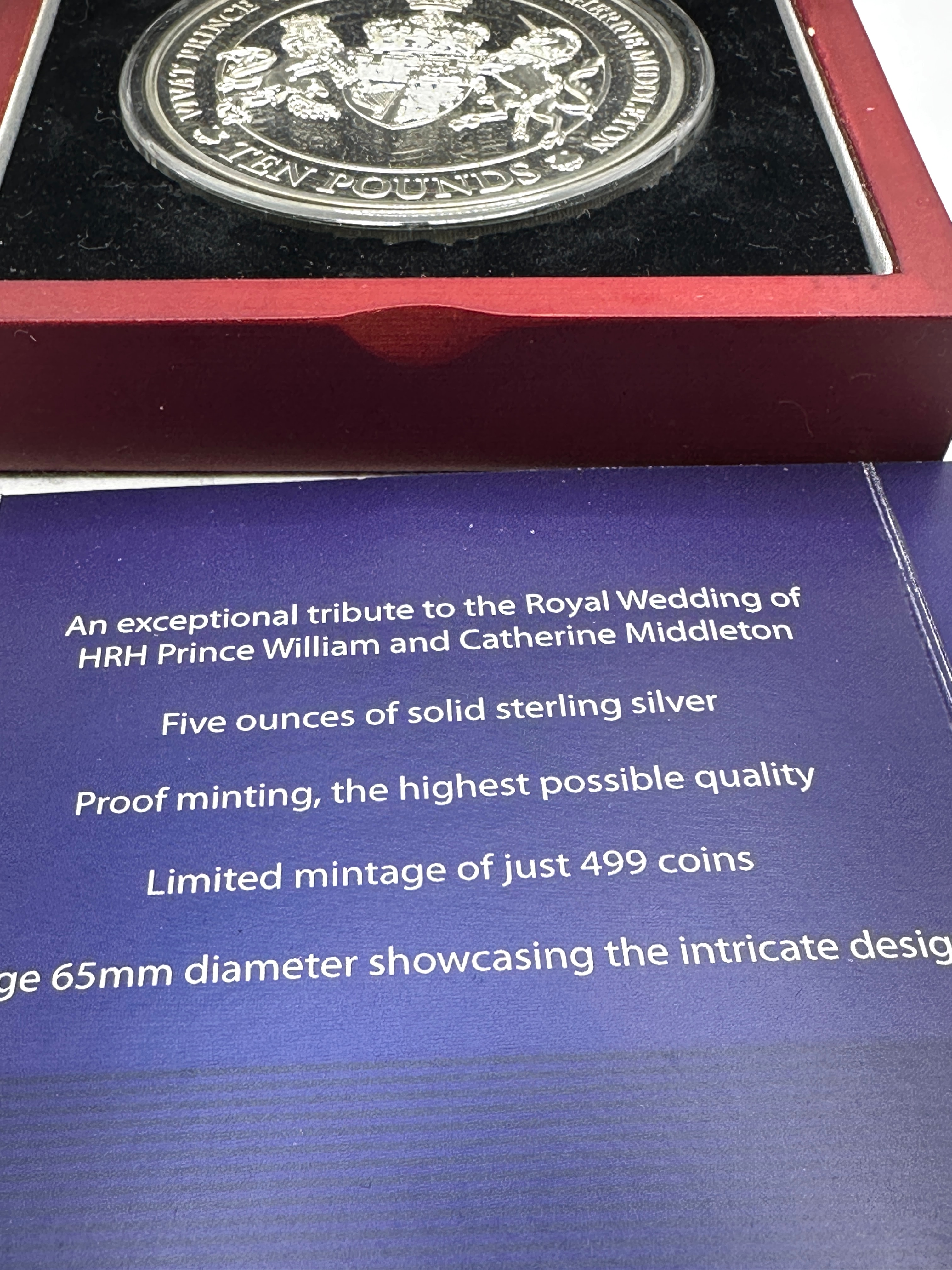 A 2011 Tristan da Cunha Prince William and Catherine Middleton Royal Wedding Commemorative coin, struck in five ounces of solid sterling silver with proof minting and a limited mintage of 499. The large, 65mm diameter coin is housed within a clear protective capsule, presented in a red-stained wooden box with a black velvet interior. It is accompanied by an informational booklet serving as a Certificate of Ownership & Authenticity. The obverse features a royal coat of arms flanked by lions and surmounted by a crown, encircled by the inscription “VIVAT PRINCE WILLIAM & CATHERINE MIDDLETON” and the denomination “TEN POUNDS.” The reverse, partially visible on the accompanying booklet, displays a profile of Queen Elizabeth II with “ELIZABETH II D.G. REG. F.D.” and the year “2011.”