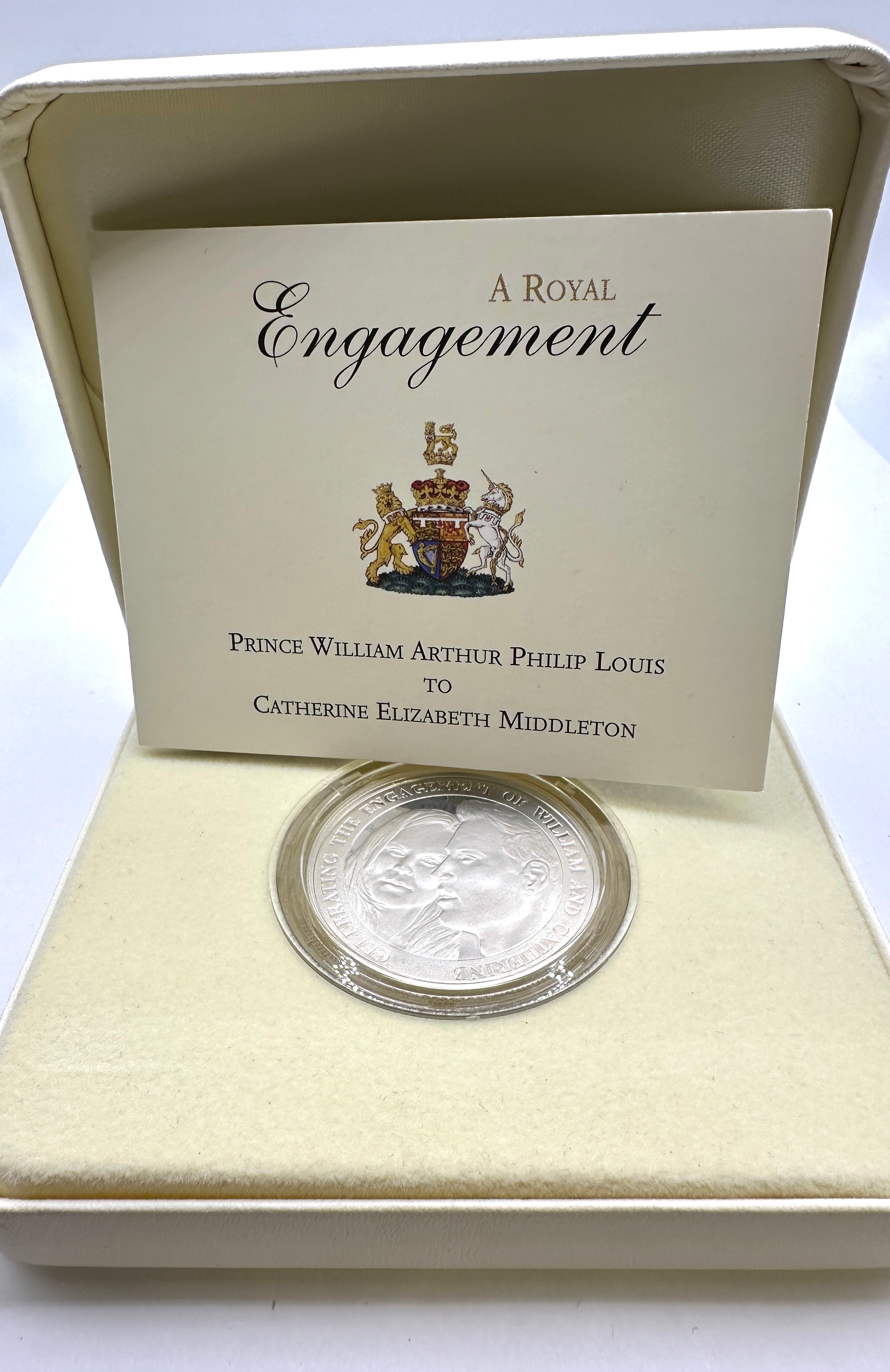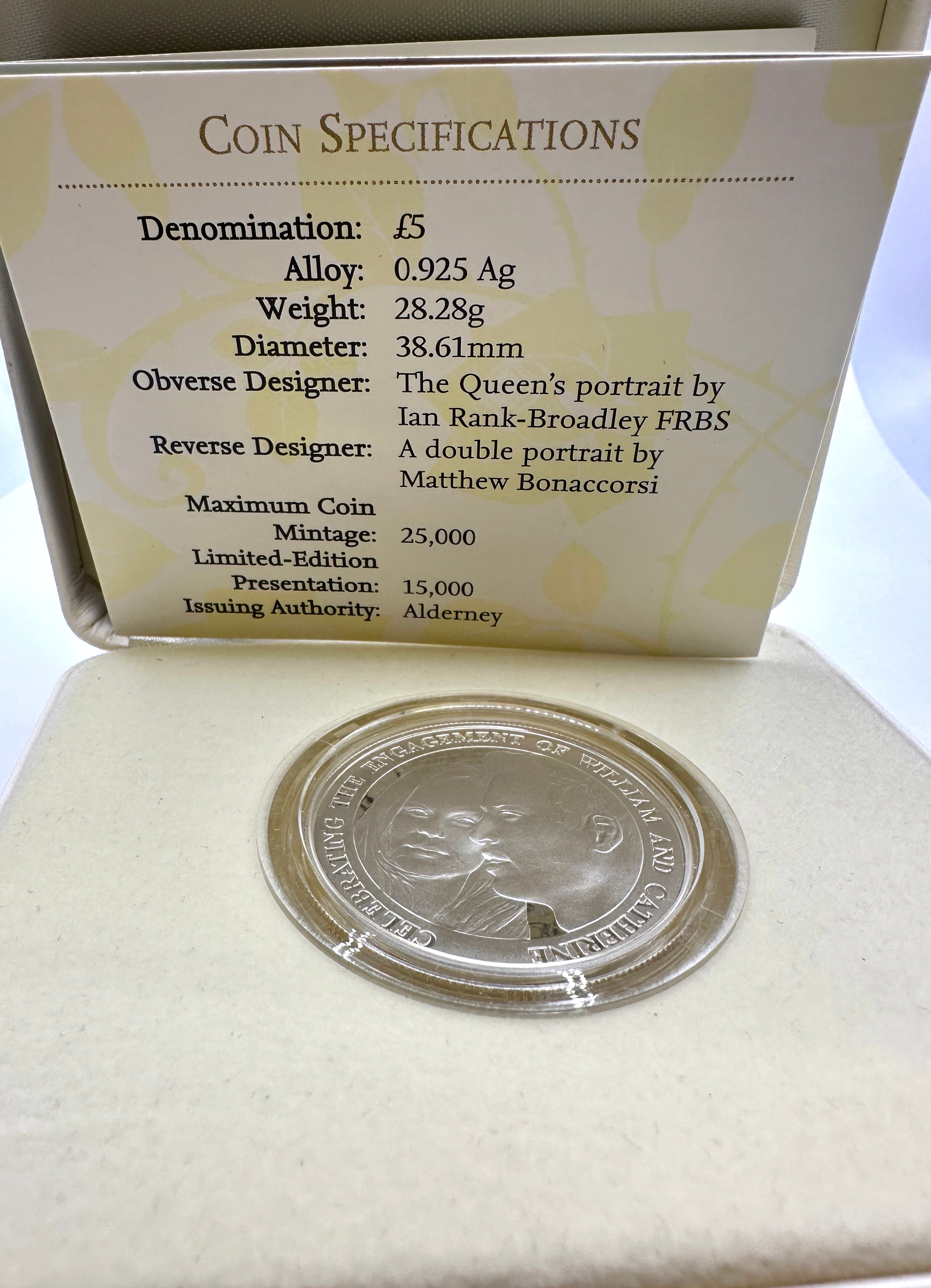 A 2010 Royal Mint Alderney £5 Silver Proof Coin, commemorating the Royal Engagement of Prince William and Catherine Middleton. This modern commemorative sterling silver (£0.925 Ag) coin was issued by Alderney. It is presented in a white hinged box with a cream velvet interior, encased within a clear protective plastic capsule. The visible side of the coin features conjoined portraits of Prince William and Catherine Middleton, encircled by the inscription “CELEBRATING THE ENGAGEMENT OF WILLIAM AND CATHERINE.” An accompanying booklet confirms the event as “A ROYAL Engagement” between “PRINCE WILLIAM ARTHUR PHILIP LOUIS TO CATHERINE ELIZABETH MIDDLETON,” depicted alongside a royal crest. A specifications card details the coin’s characteristics: Denomination: £5, Alloy: 0.925 Ag, Obverse Designer: The Queen’s portrait by Ian Rank-Broadley FRBS, Reverse Designer: A double portrait by Matthew Bonaccorsi. The maximum coin mintage is 25,000, with 15,000 in this specific presentation.